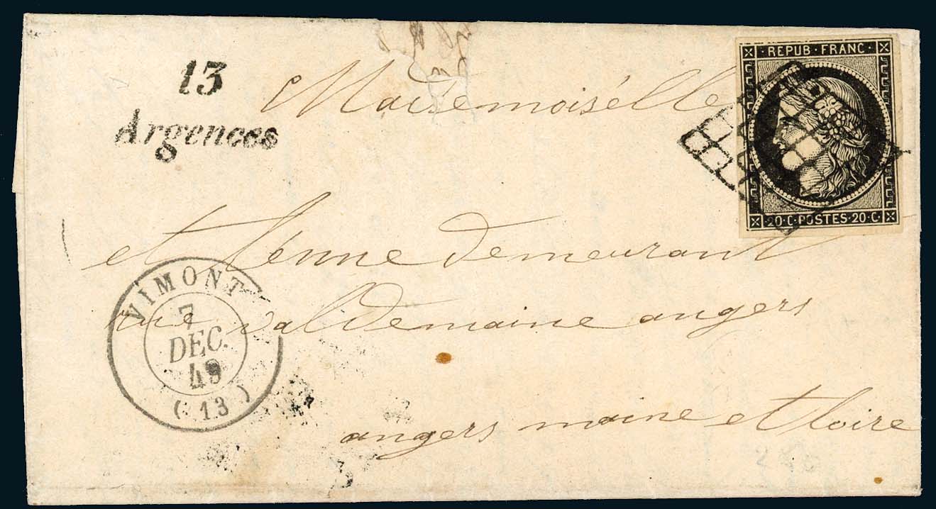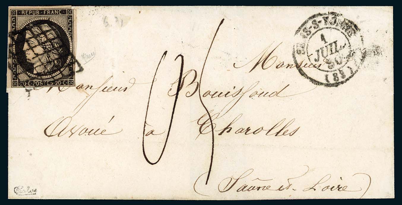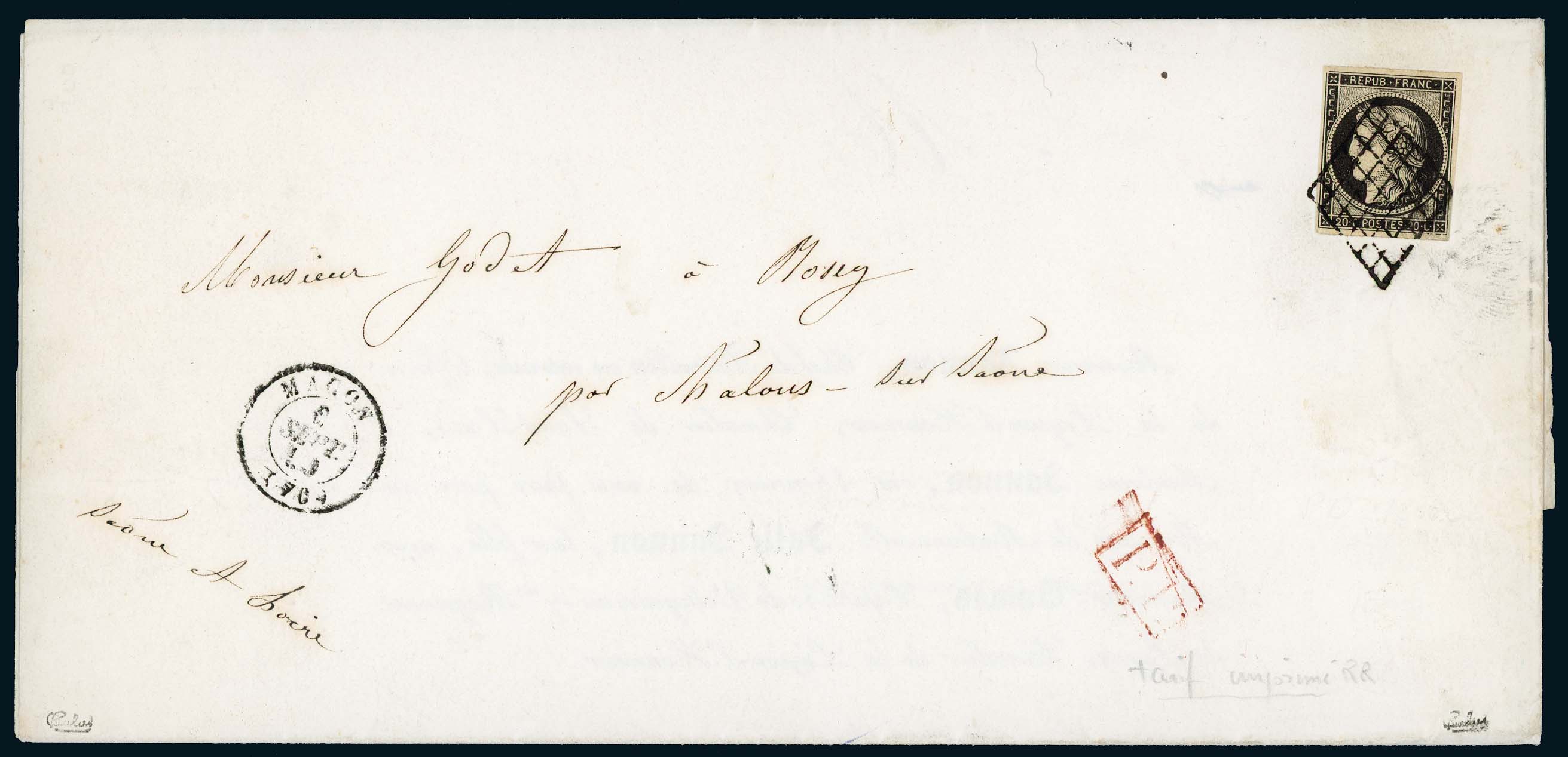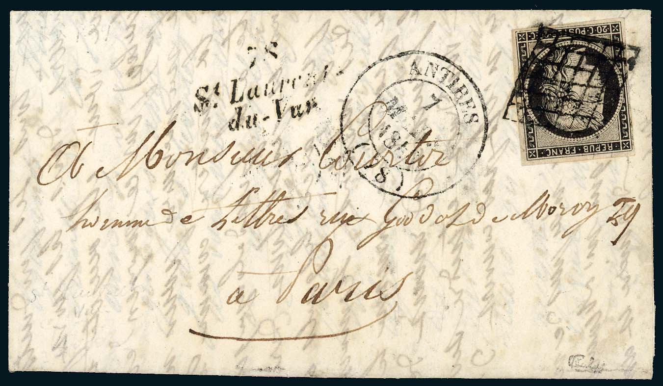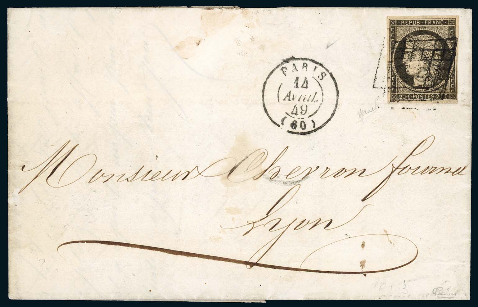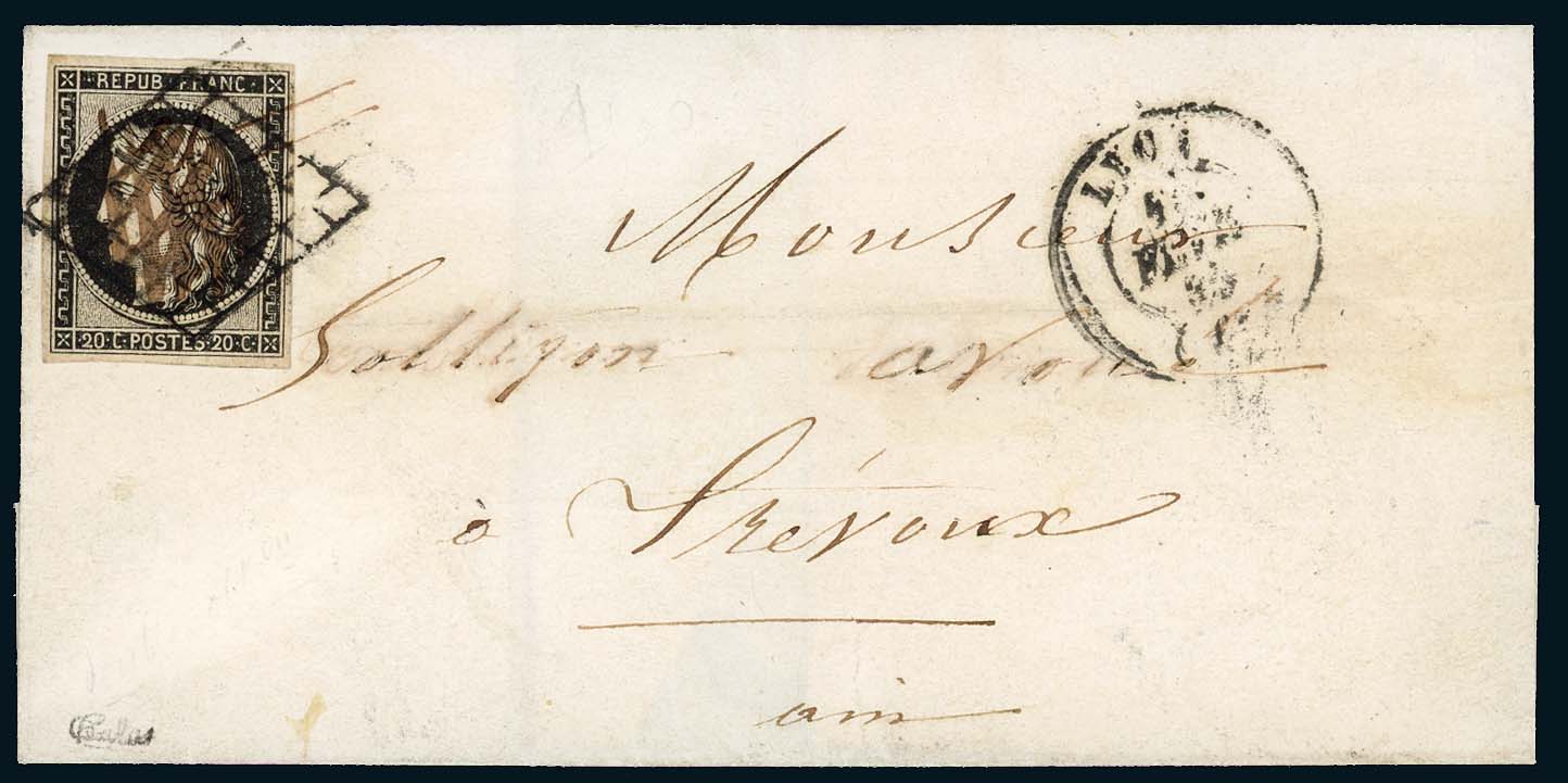 63 | N°3c, gris-noir, OB grille, C. PARIS sur lettre pour Lyon 1849 Signé et certificat Calves TB | 150 | 300 | 150 | enchérir | |