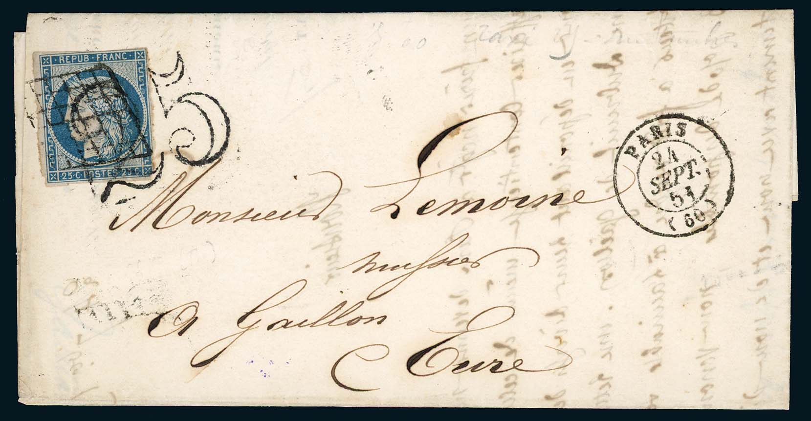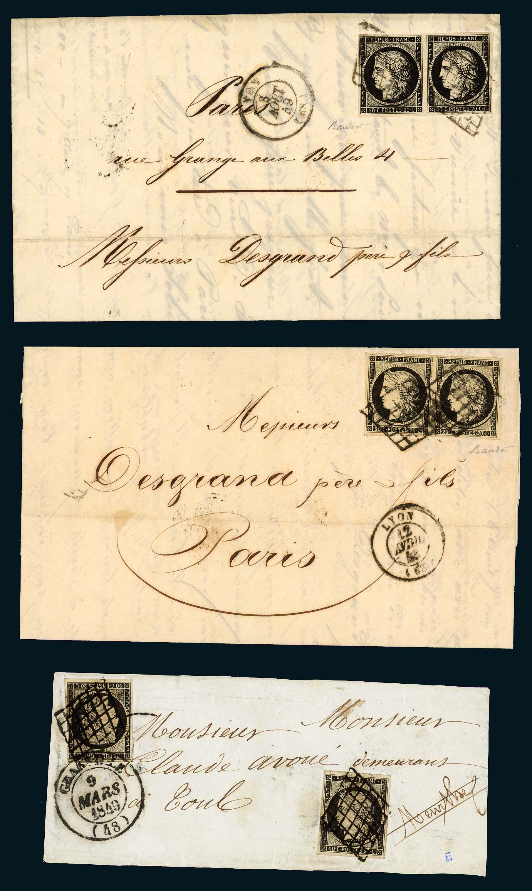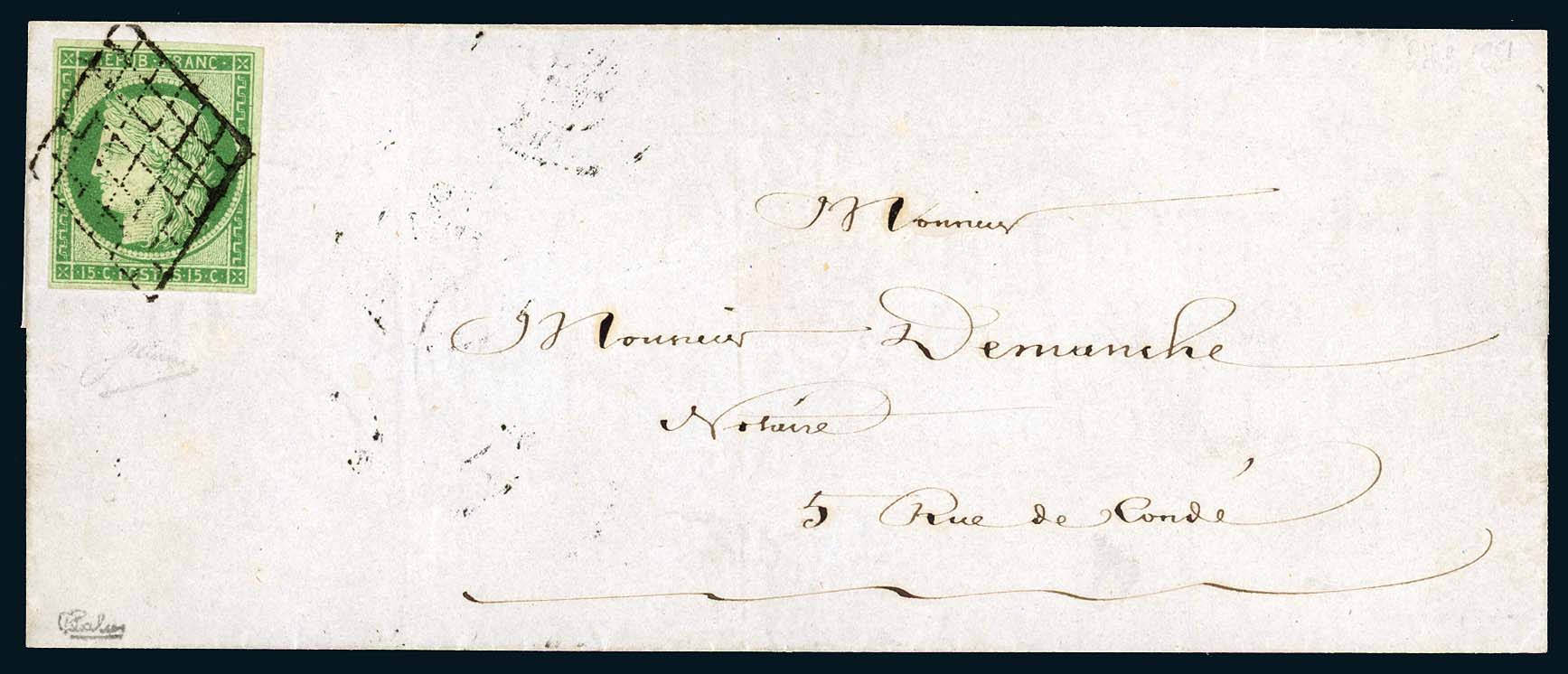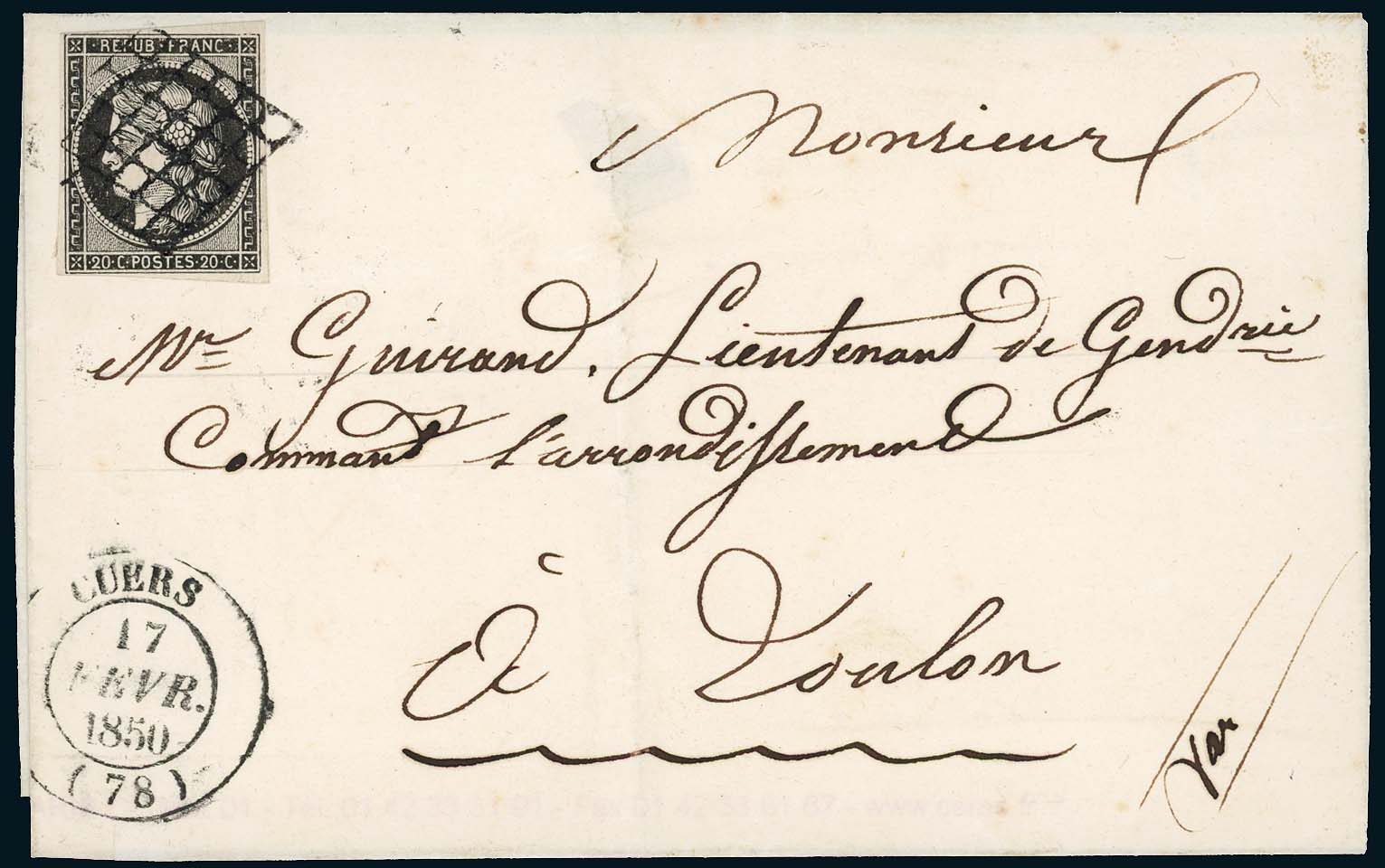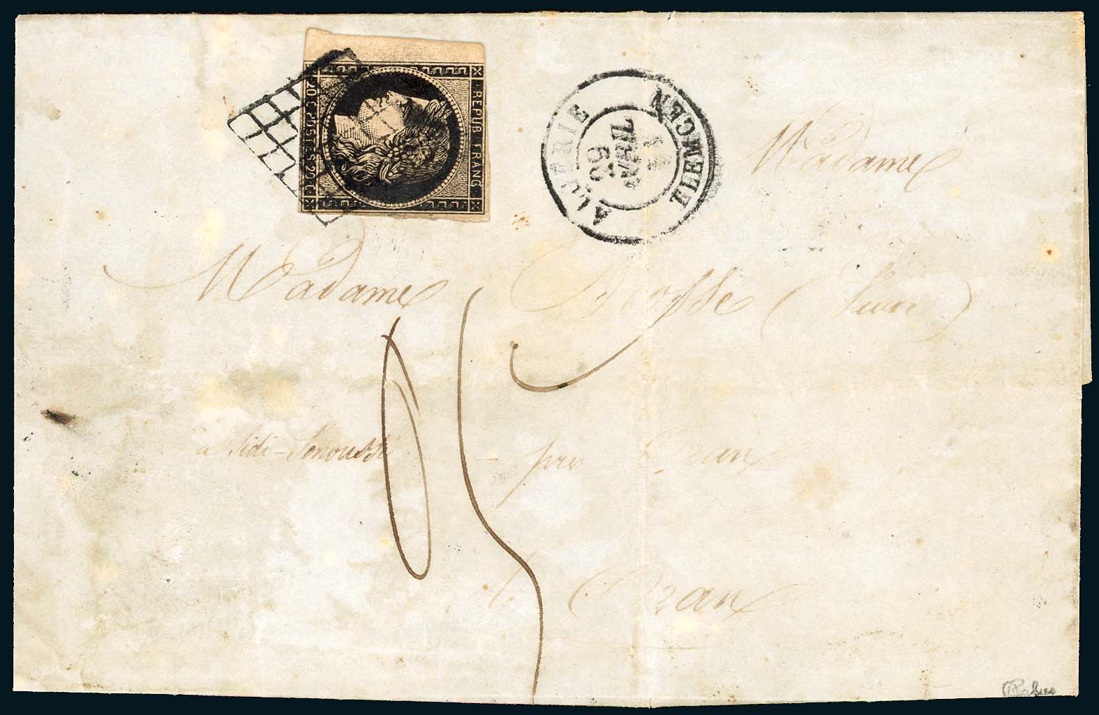 63 | N°3c, gris-noir, OB grille, C. PARIS sur lettre pour Lyon 1849 Signé et certificat Calves TB | 150 | 300 | 150 | enchérir | |