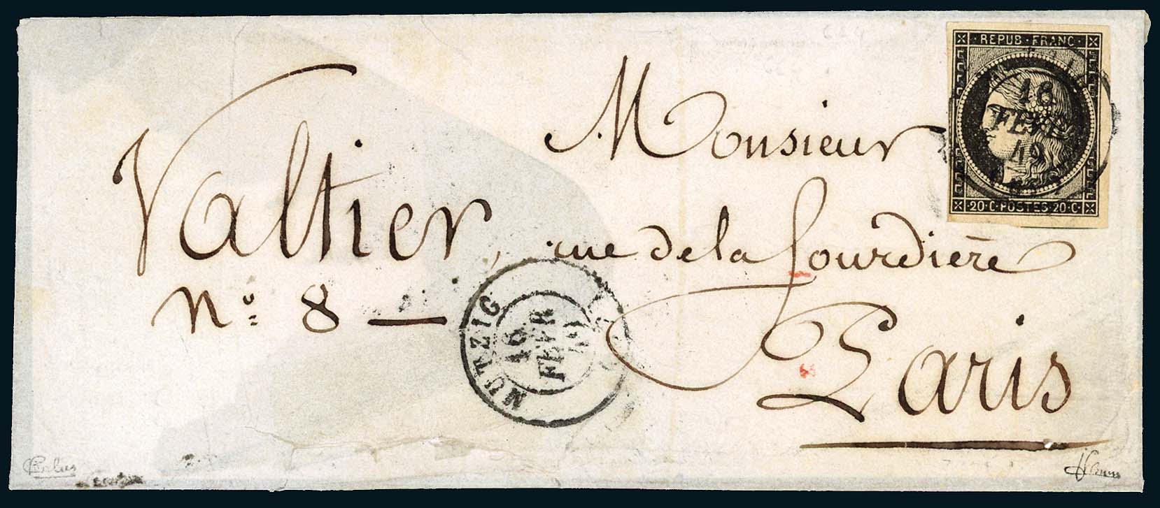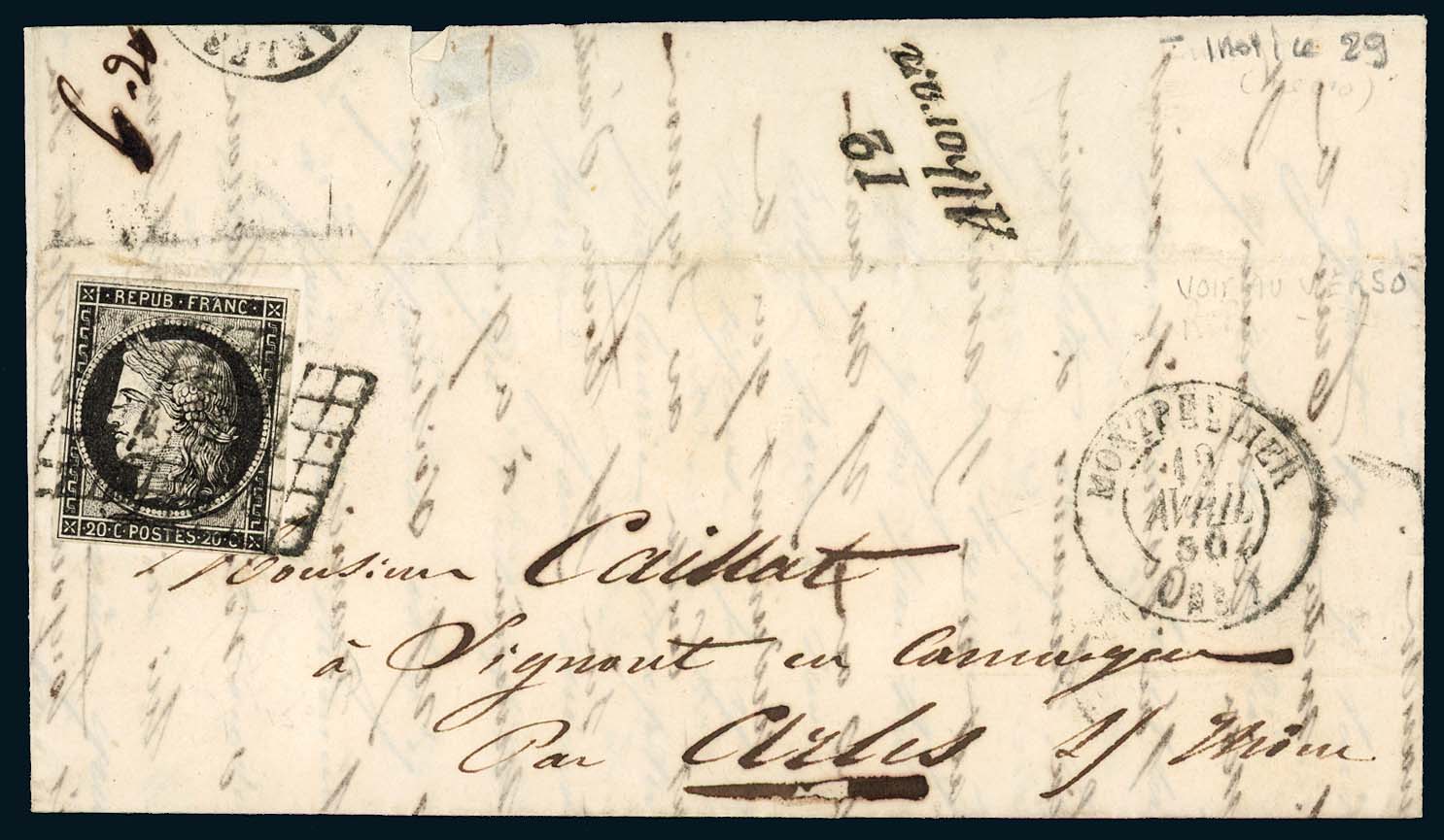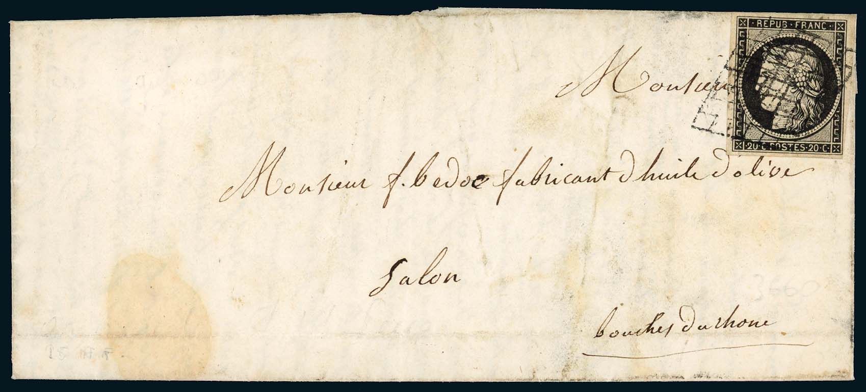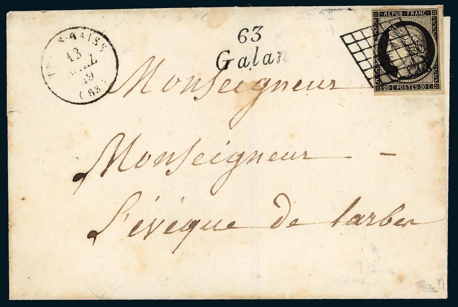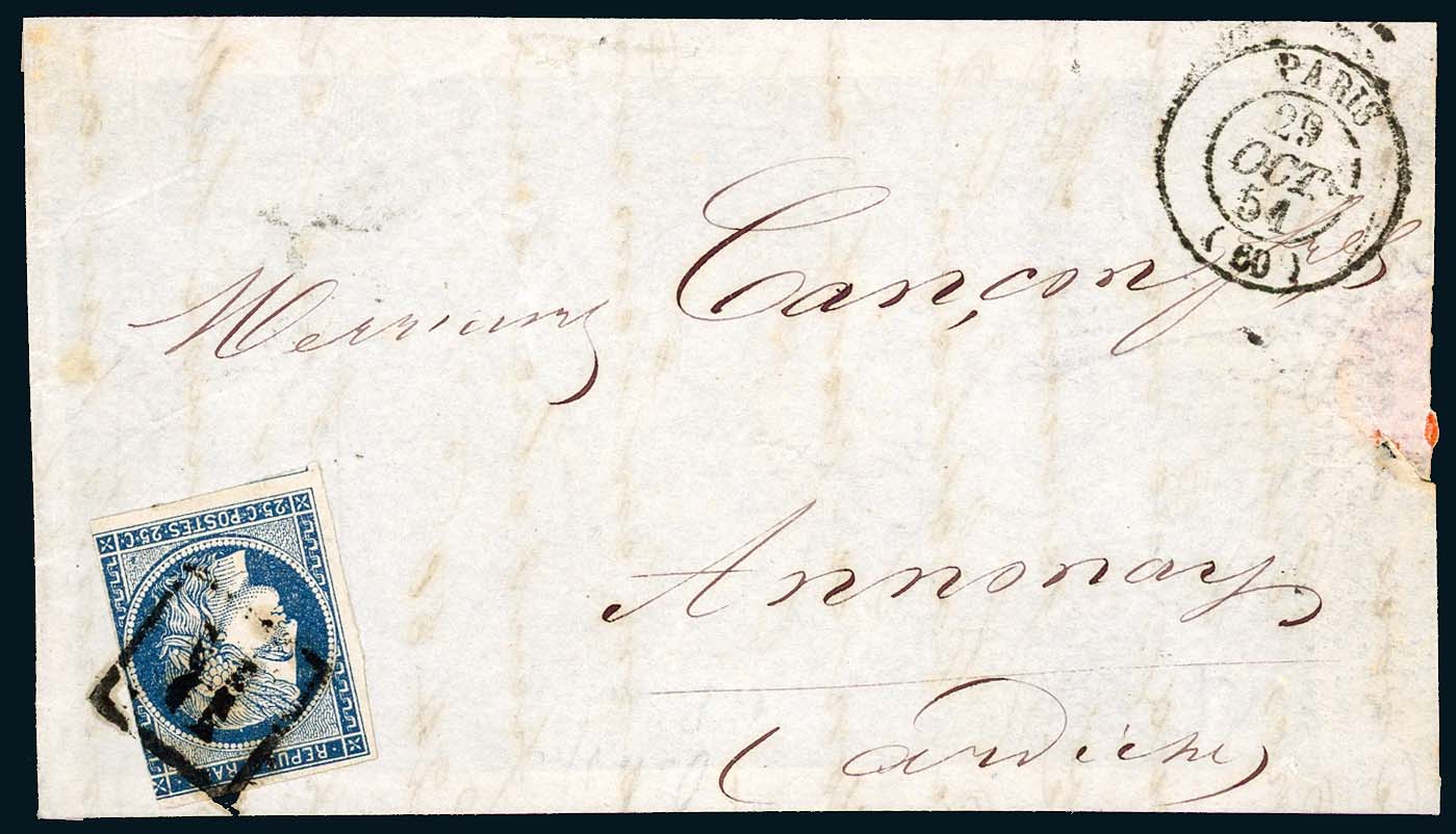 63 | N°3c, gris-noir, OB grille, C. PARIS sur lettre pour Lyon 1849 Signé et certificat Calves TB | 150 | 300 | 150 | enchérir | |