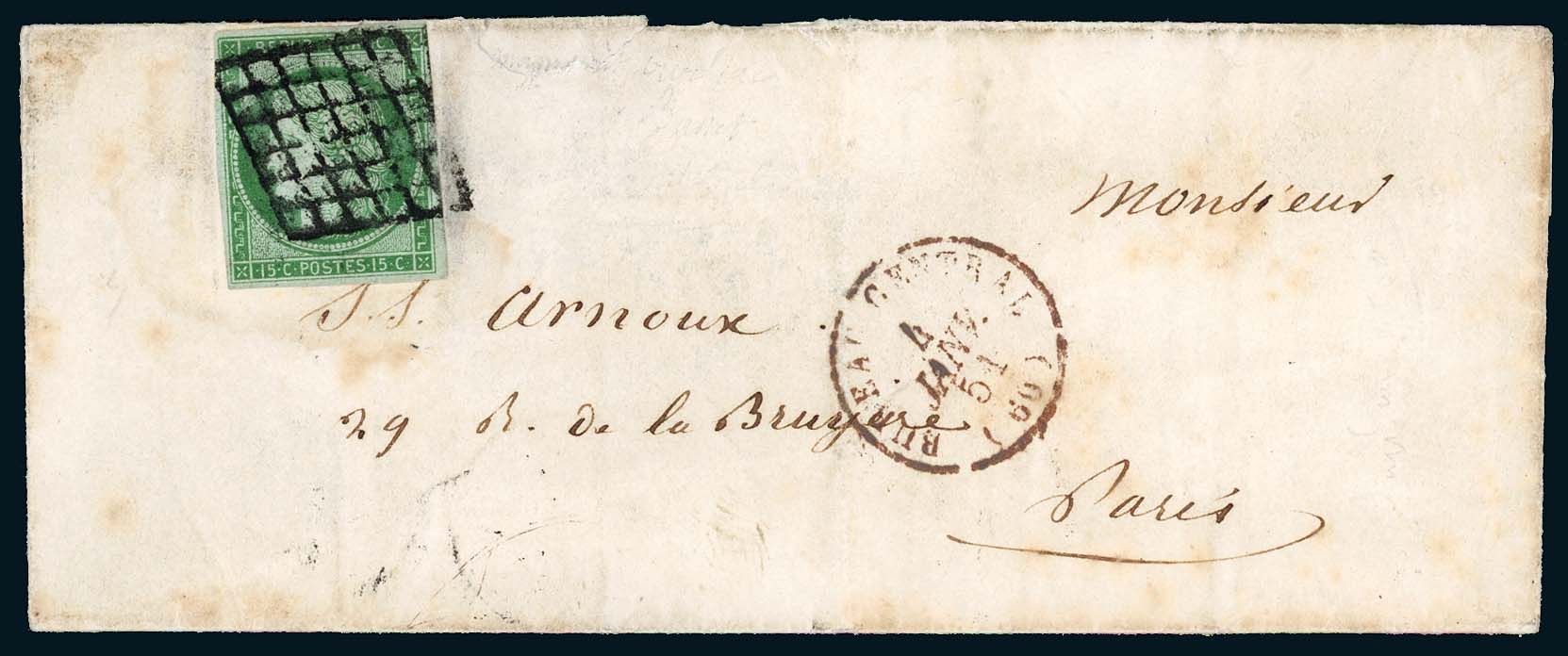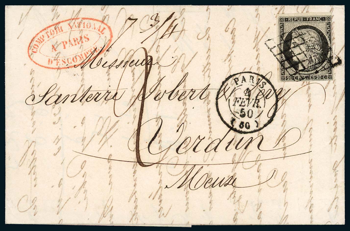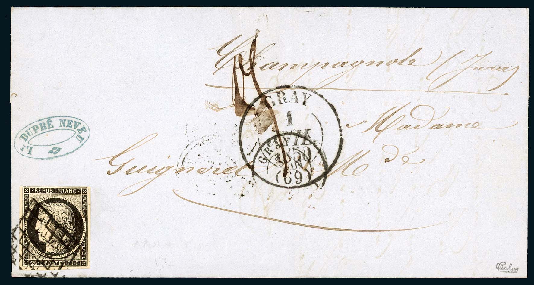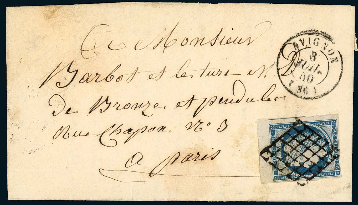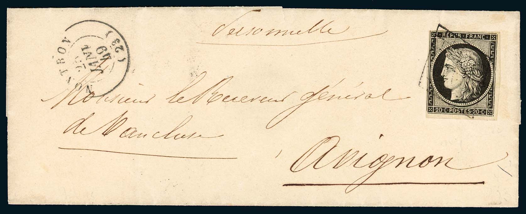 63 | N°3c, gris-noir, OB grille, C. PARIS sur lettre pour Lyon 1849 Signé et certificat Calves TB | 150 | 300 | 150 | enchérir | |