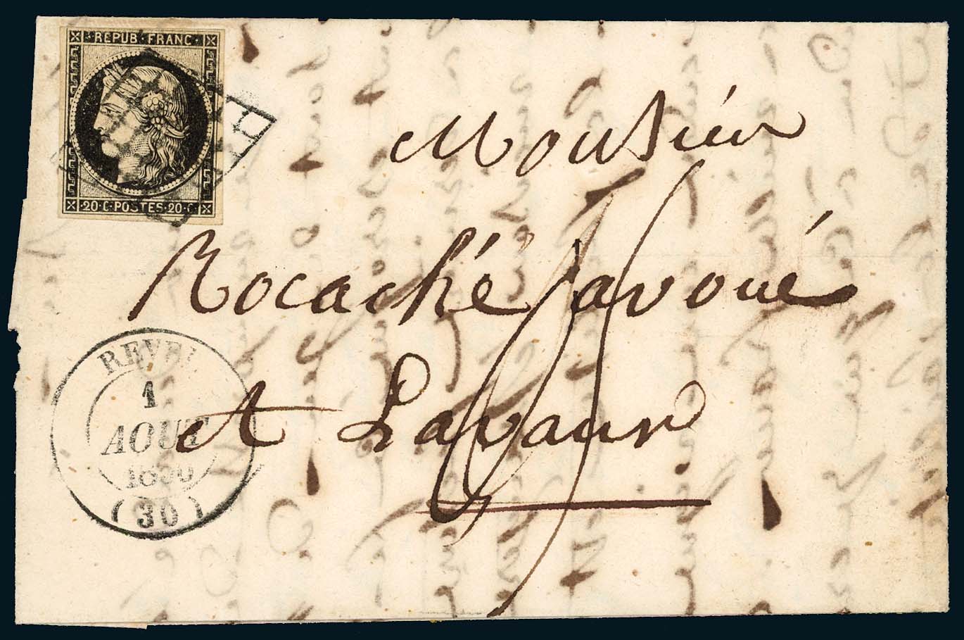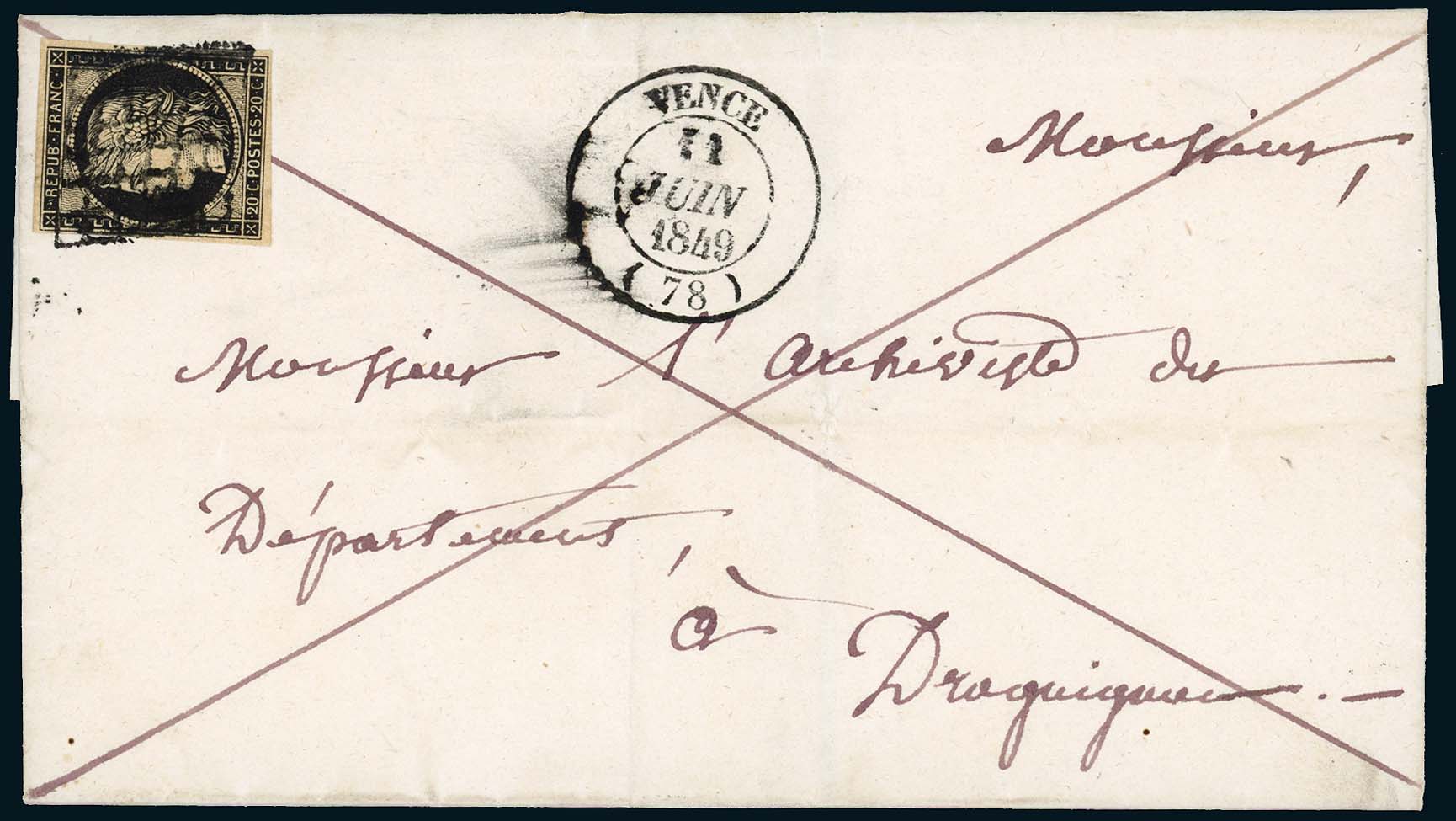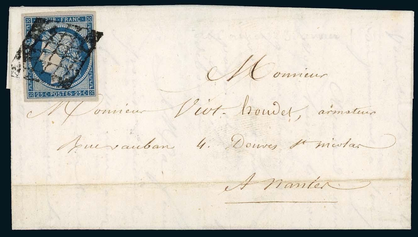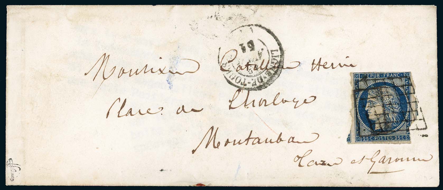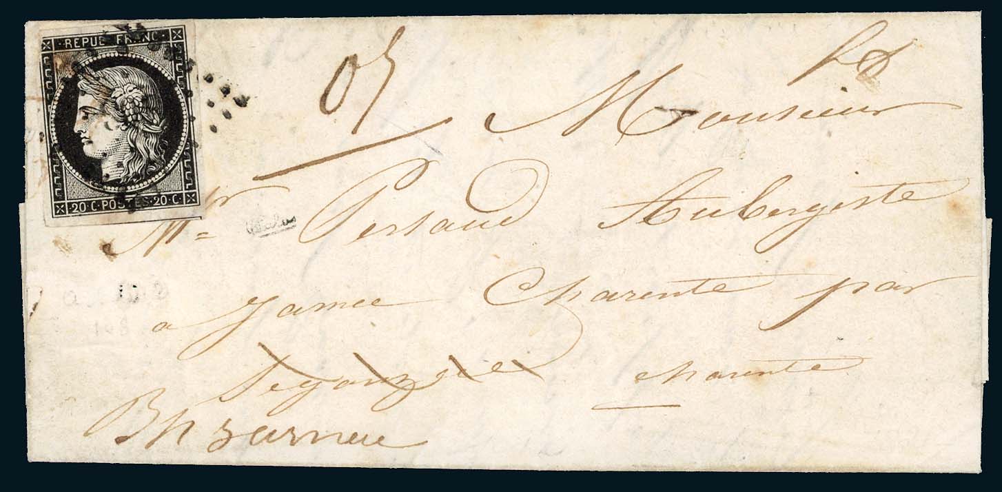 63 | N°3c, gris-noir, OB grille, C. PARIS sur lettre pour Lyon 1849 Signé et certificat Calves TB | 150 | 300 | 150 | enchérir | |