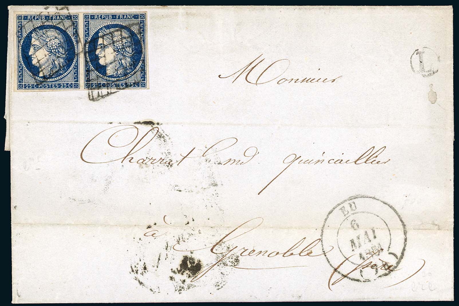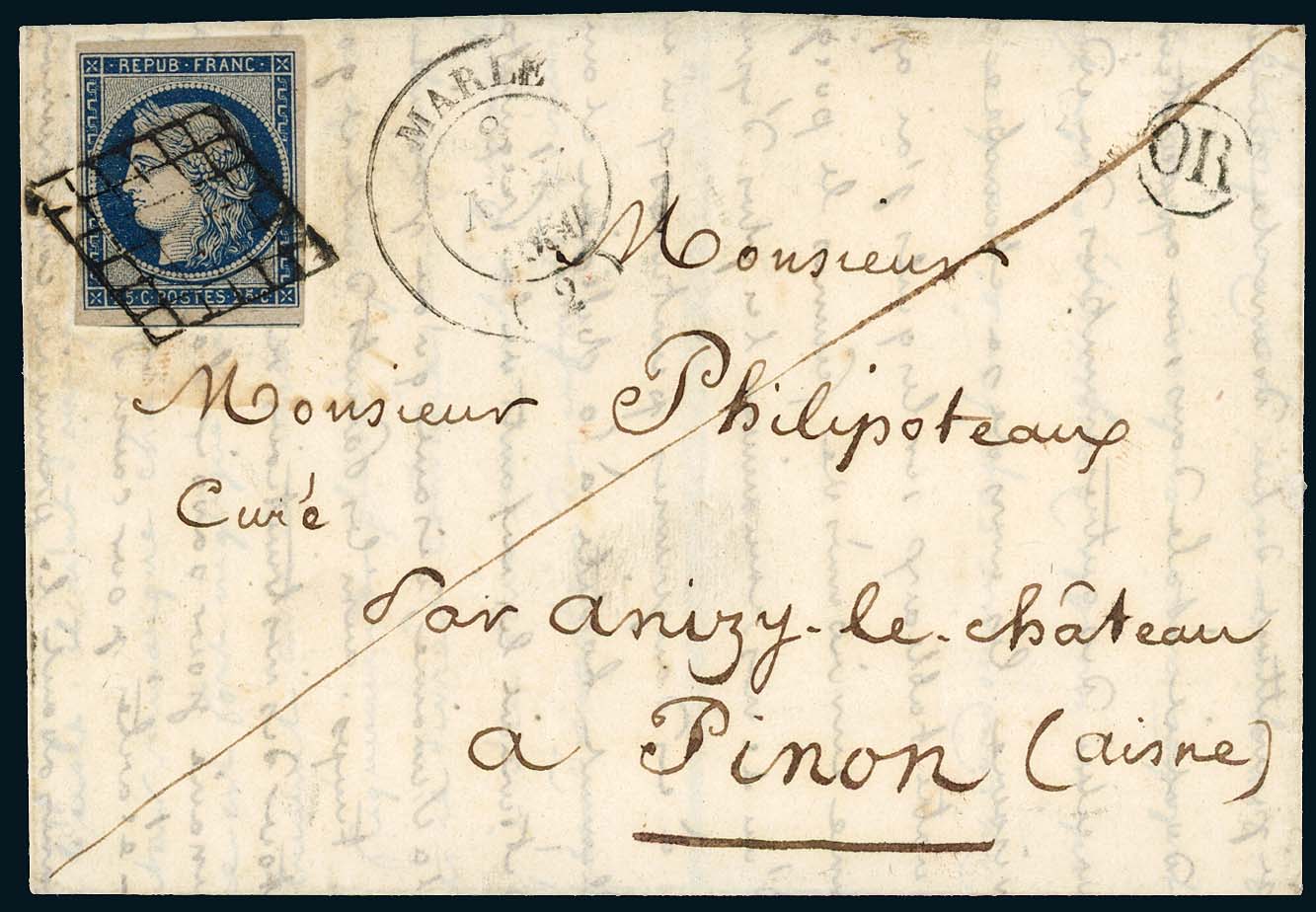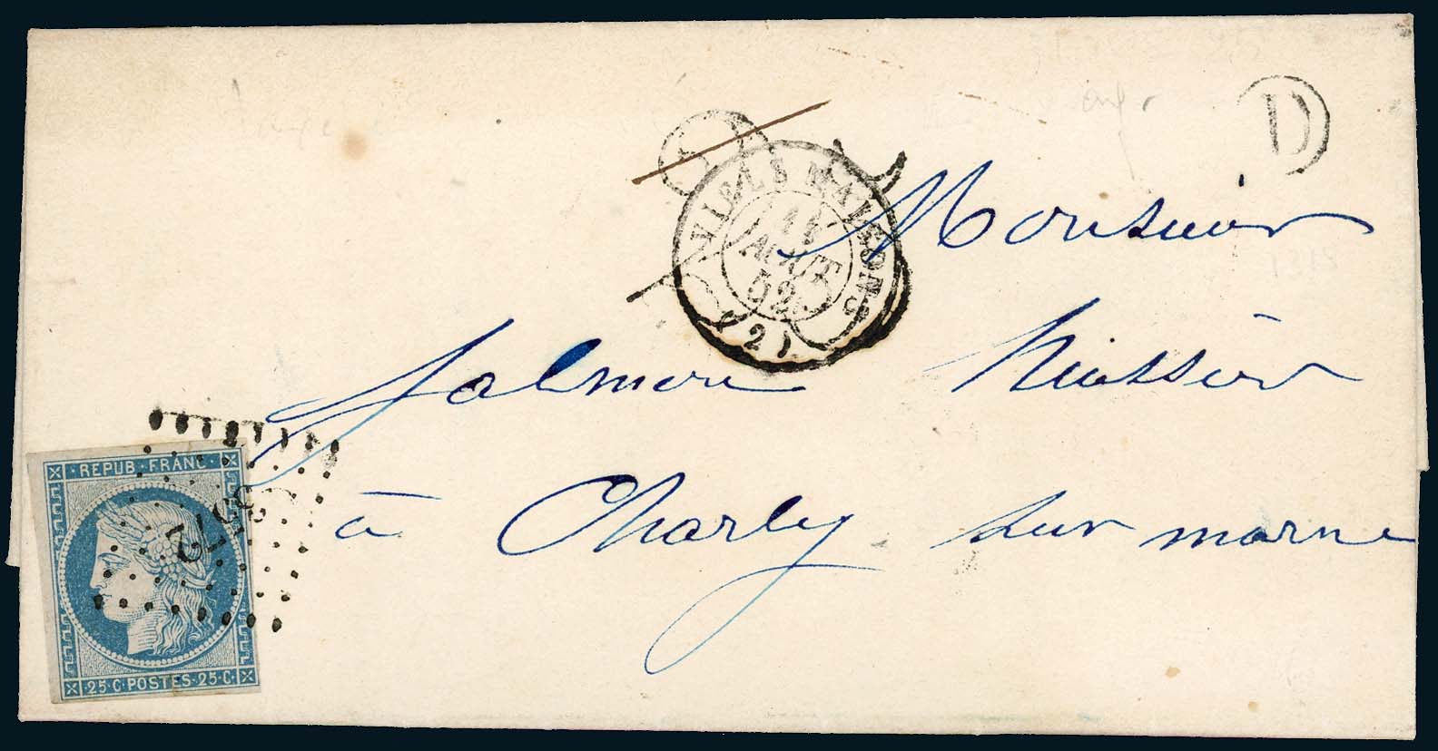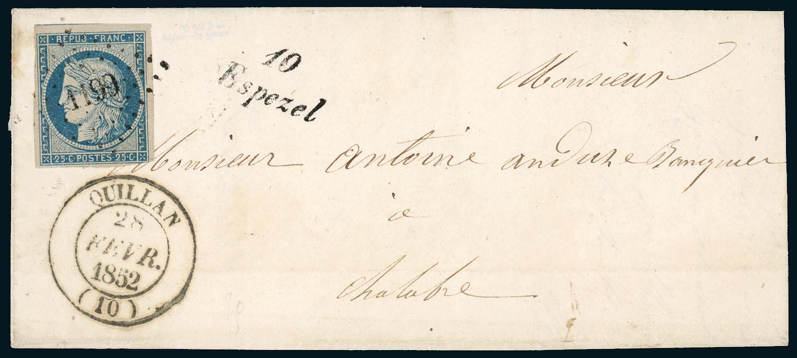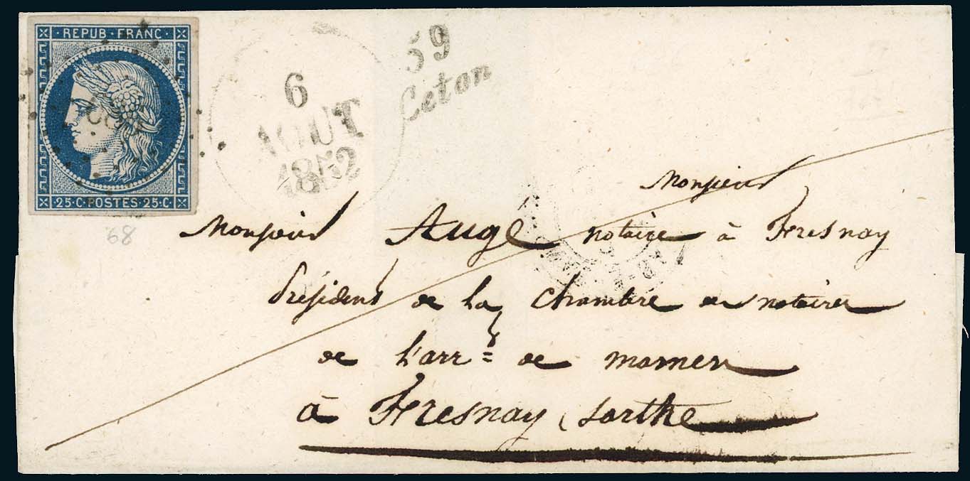 63 | N°3c, gris-noir, OB grille, C. PARIS sur lettre pour Lyon 1849 Signé et certificat Calves TB | 150 | 300 | 150 | enchérir | |