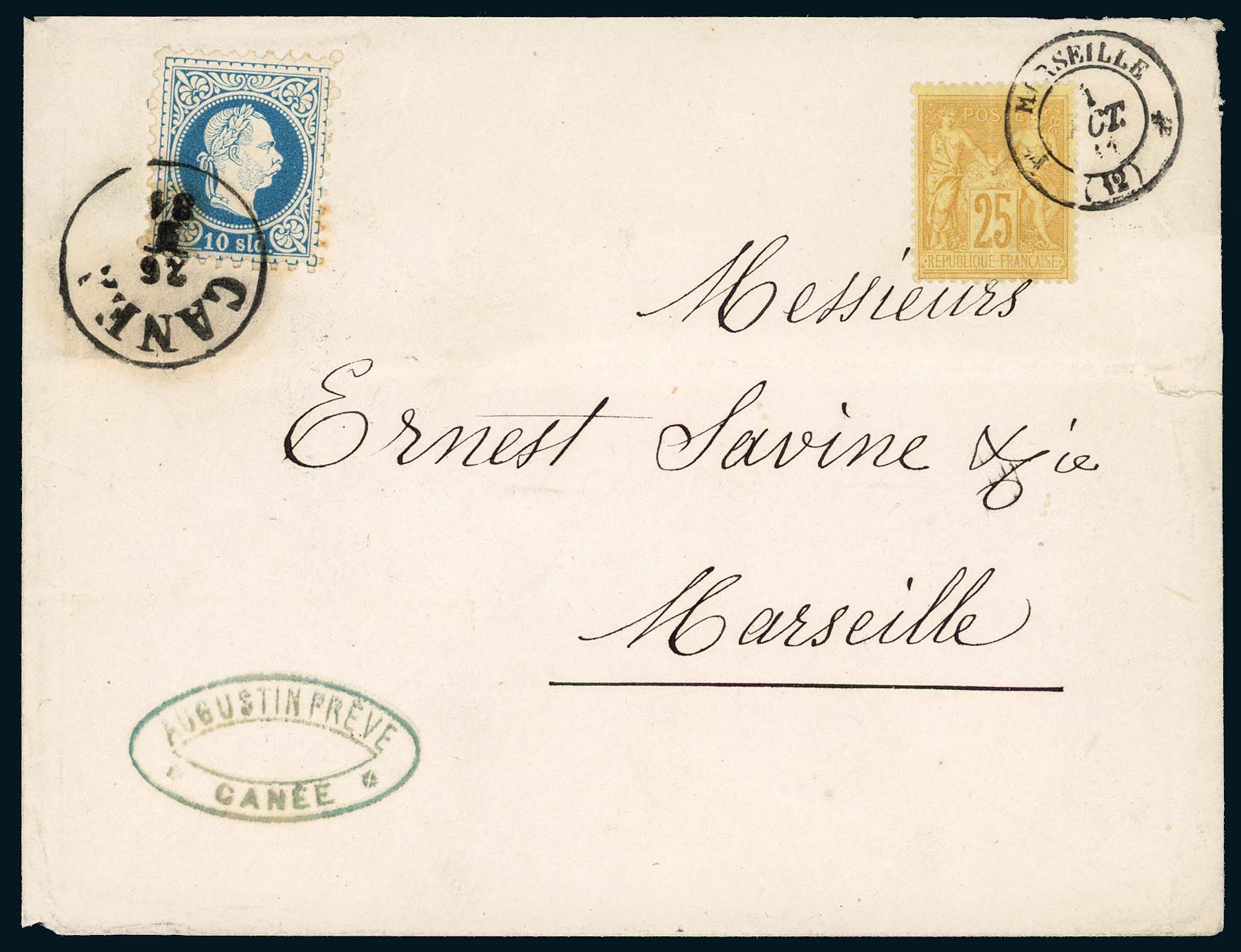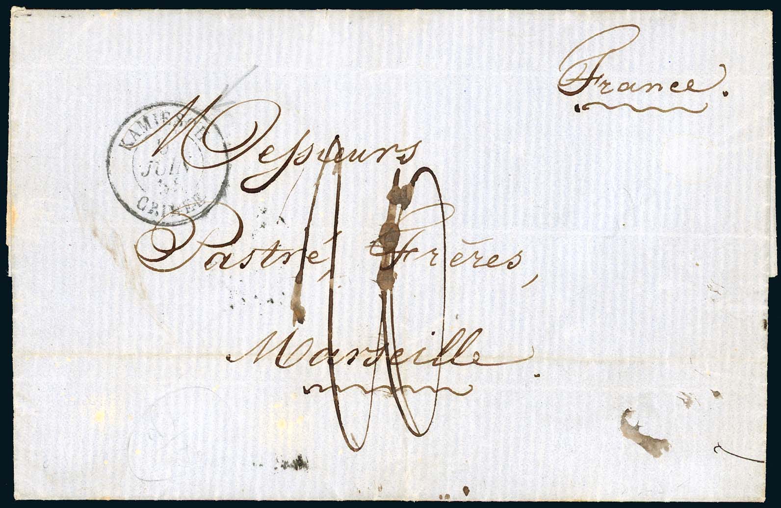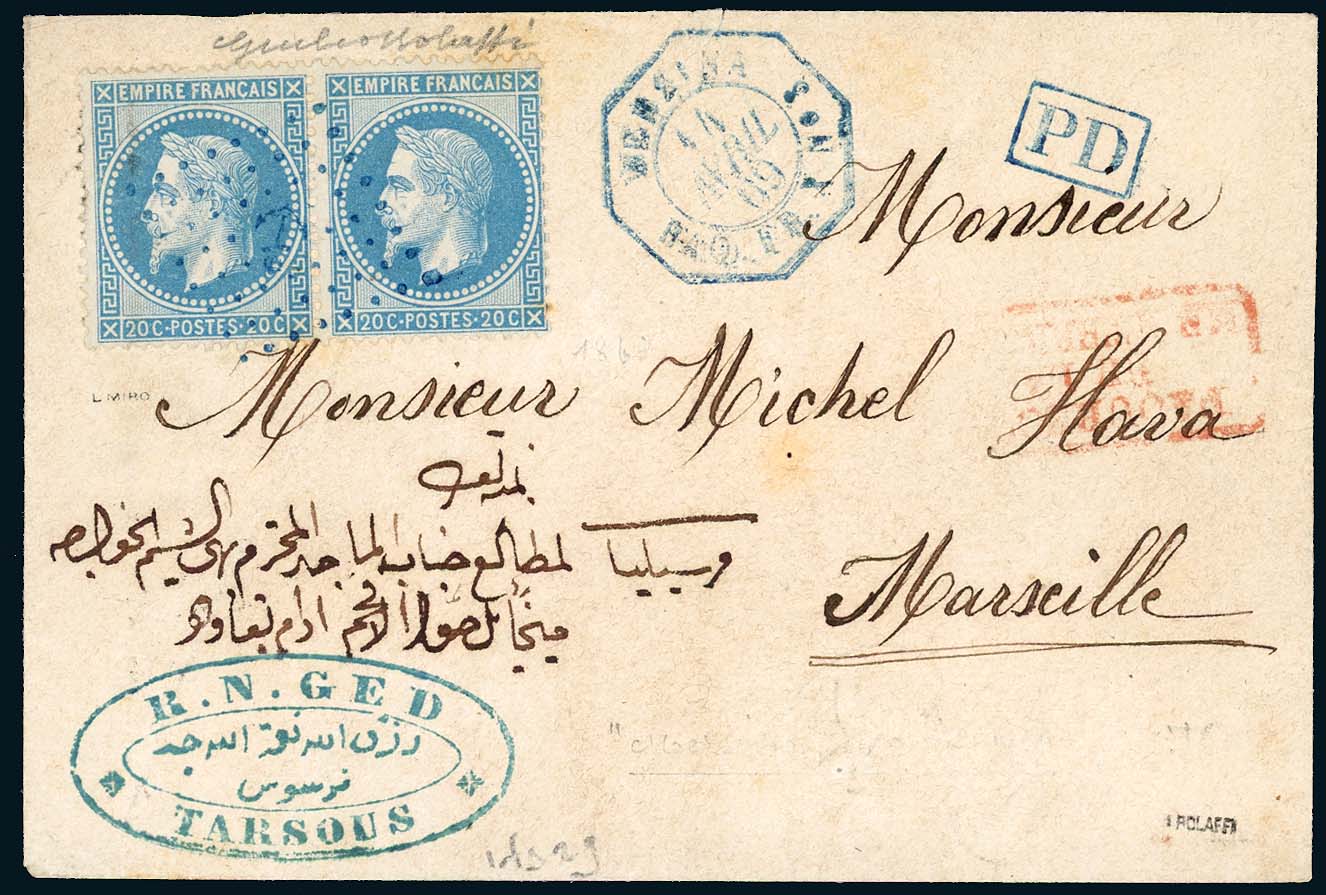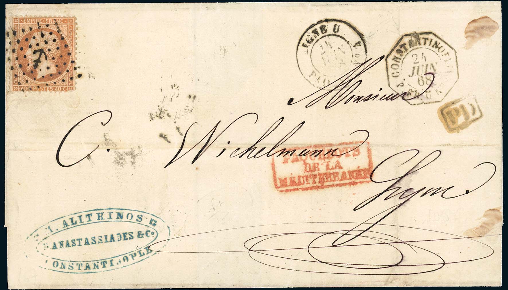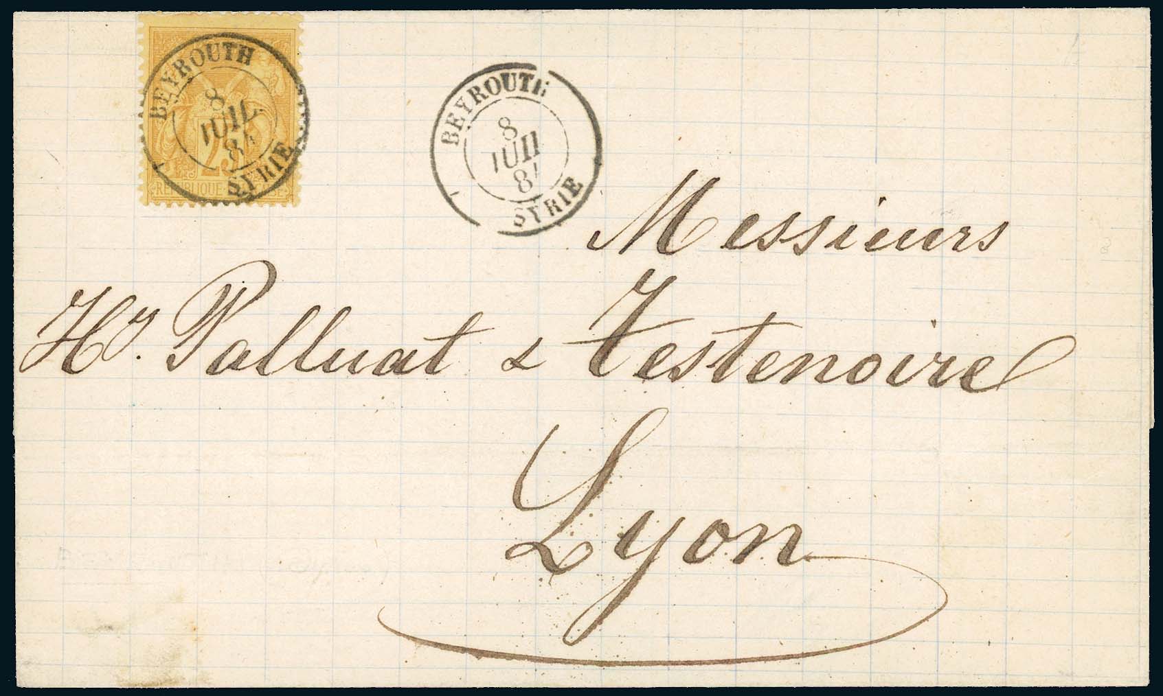 2483 | Lot de 7 lettres oblitérées dans les bureaux du Levant en majorité (Alexandrie, Beyrouth (2), Salonique, Smyrne, constantinople, Alger) de 1857 à 1884, bonne qualité générale, à étudier | 150 | 300 | 150 | enchérir | |