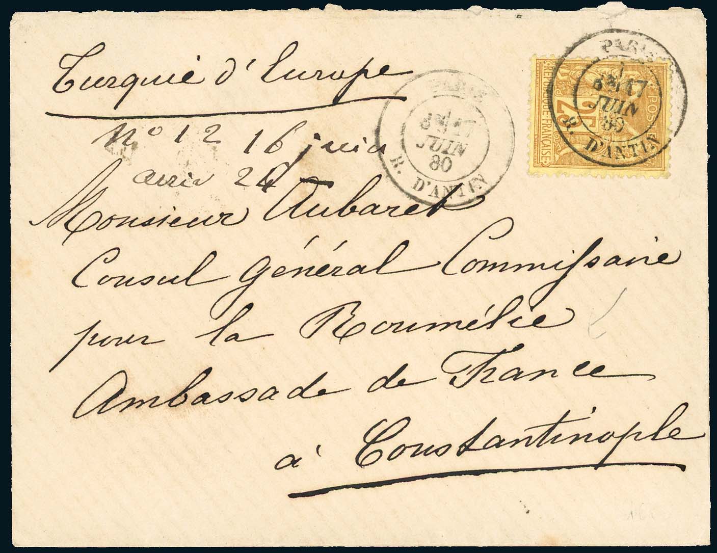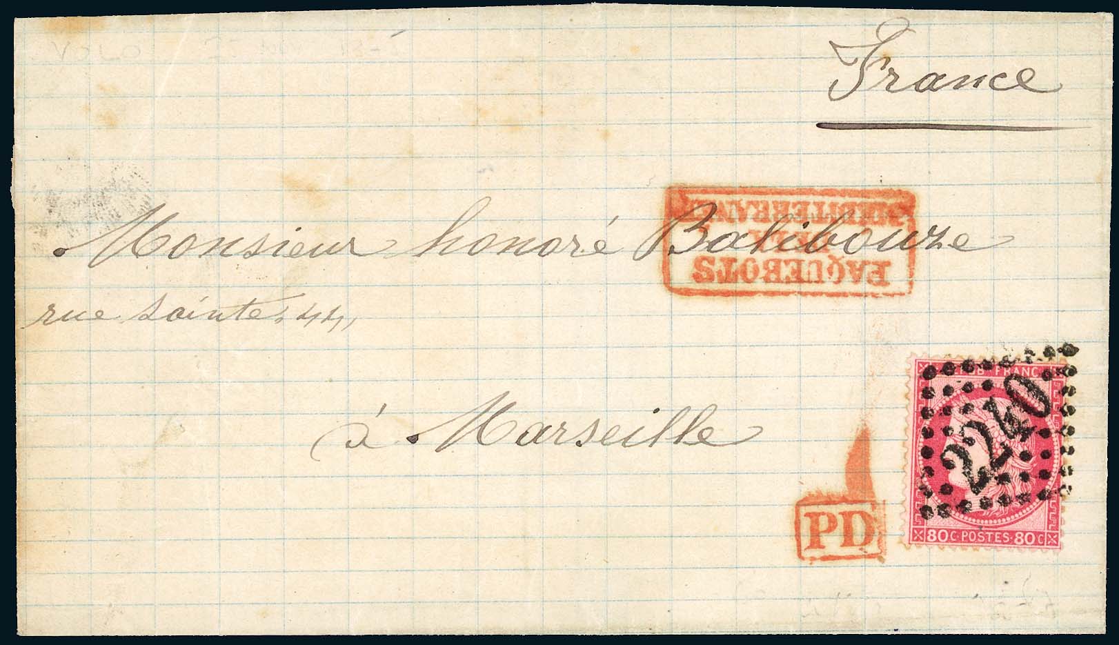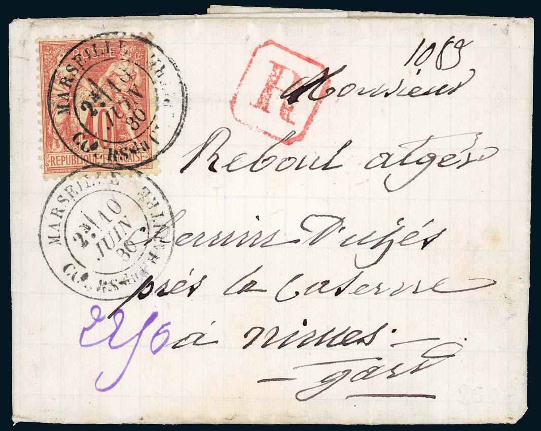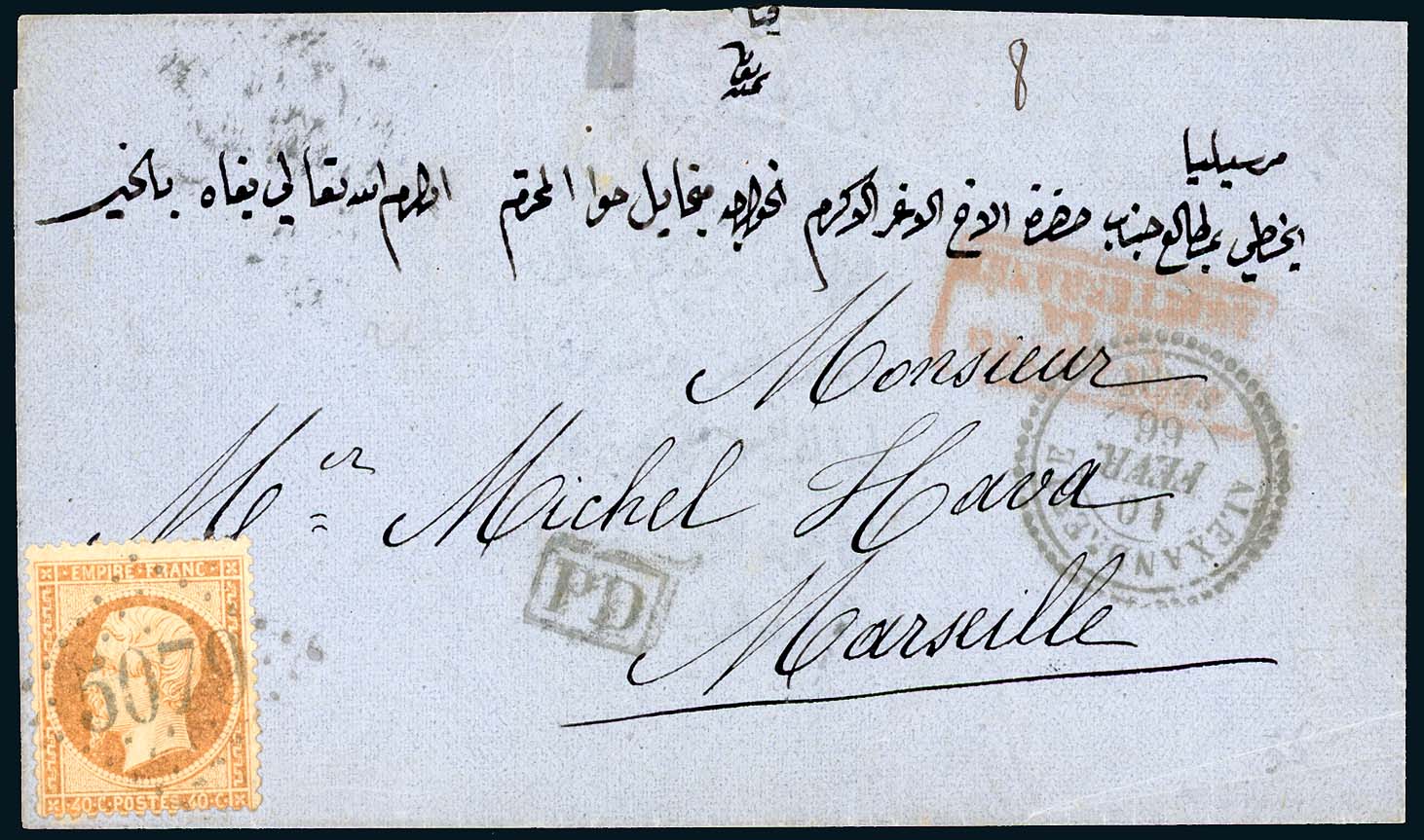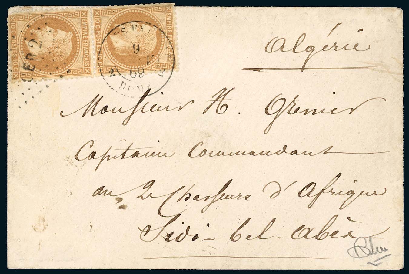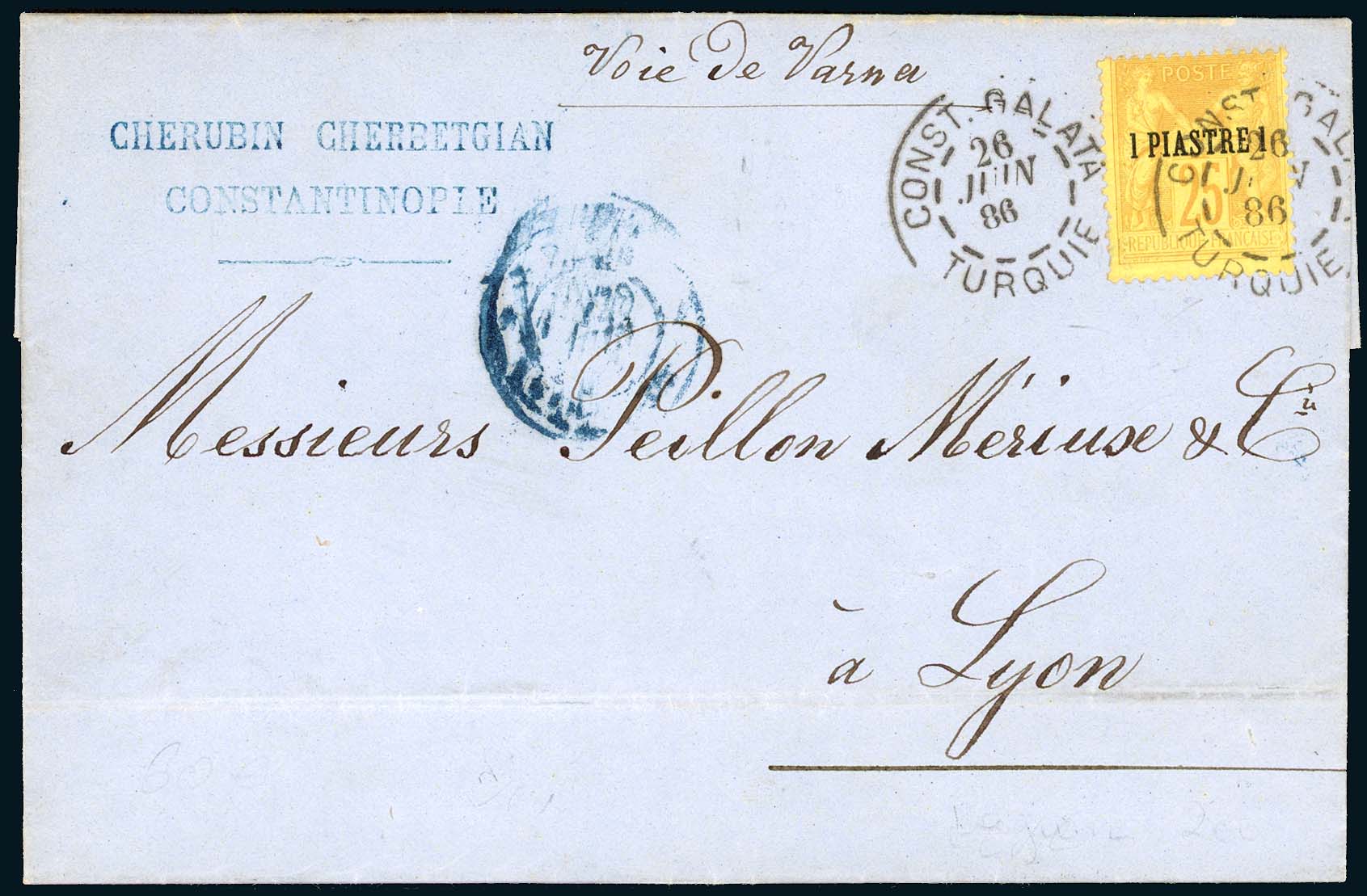 2483 | Lot de 7 lettres oblitérées dans les bureaux du Levant en majorité (Alexandrie, Beyrouth (2), Salonique, Smyrne, constantinople, Alger) de 1857 à 1884, bonne qualité générale, à étudier | 150 | 300 | 150 | enchérir | |