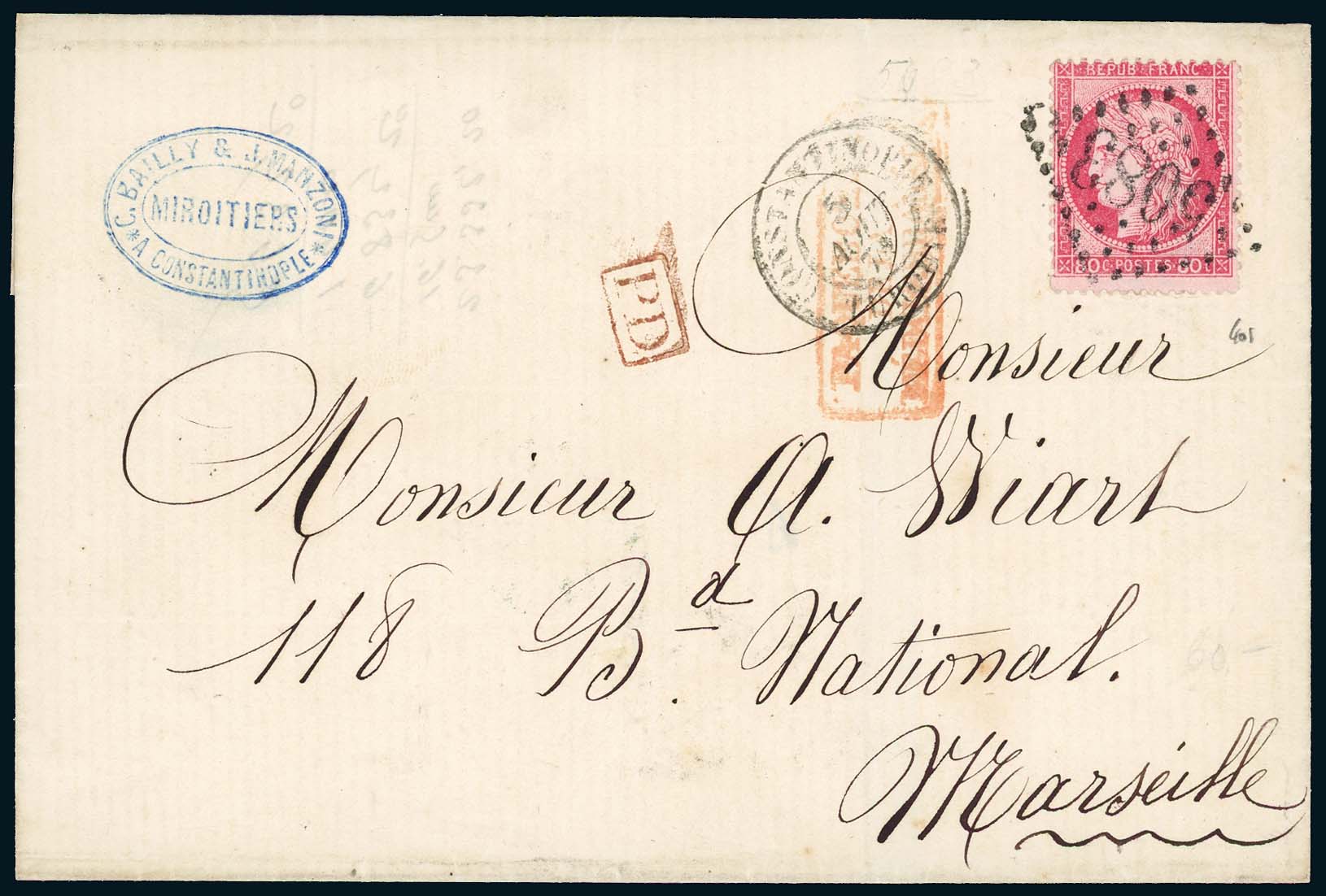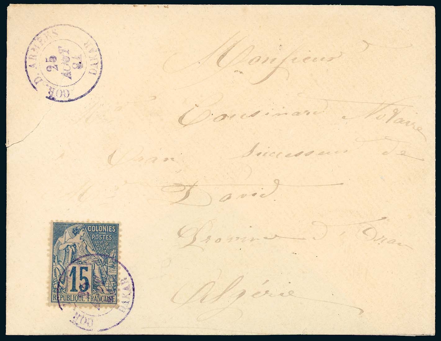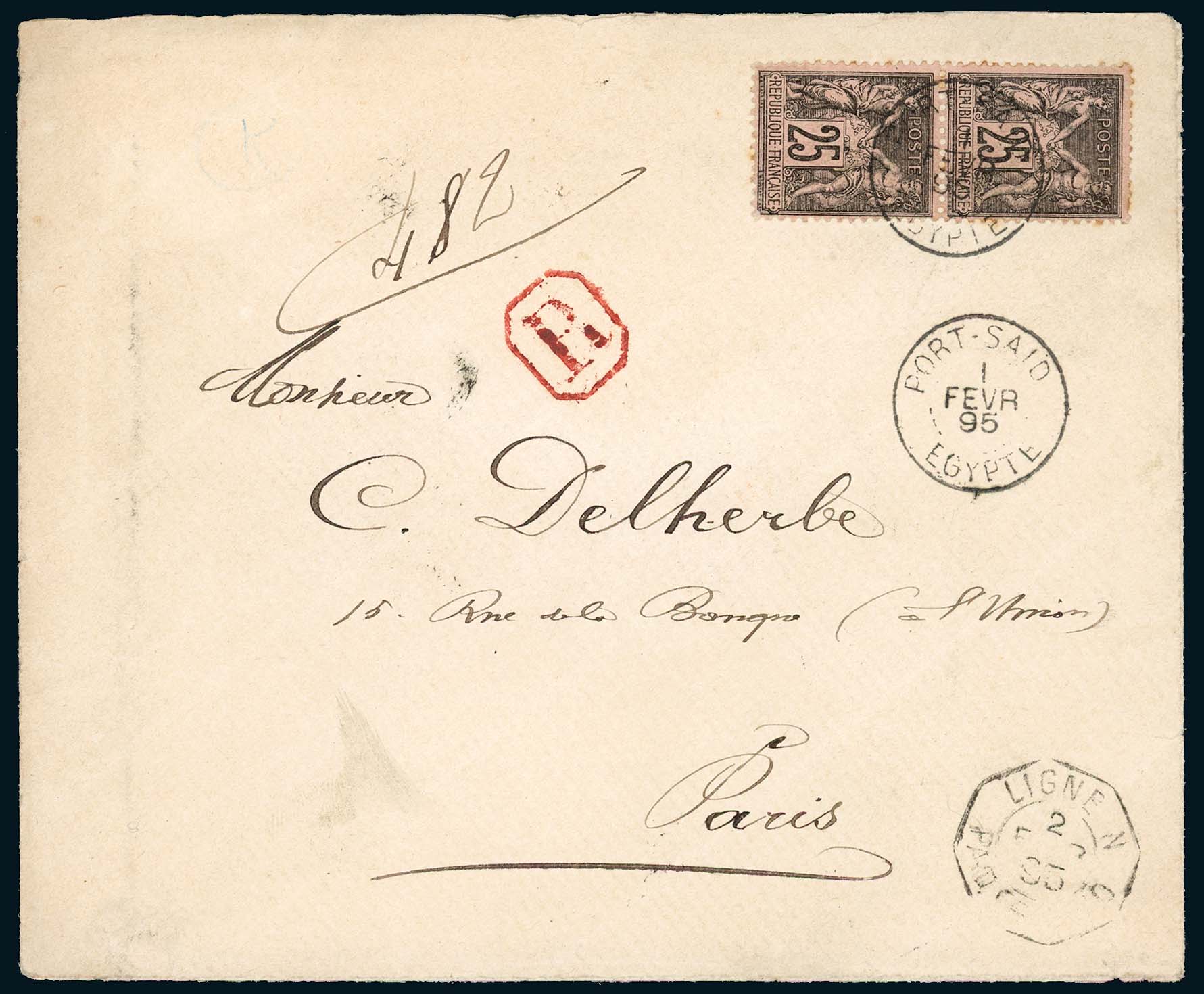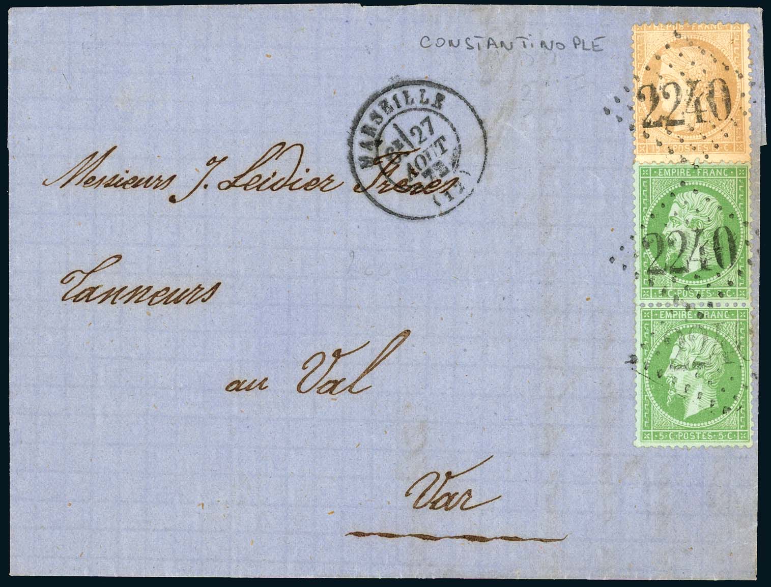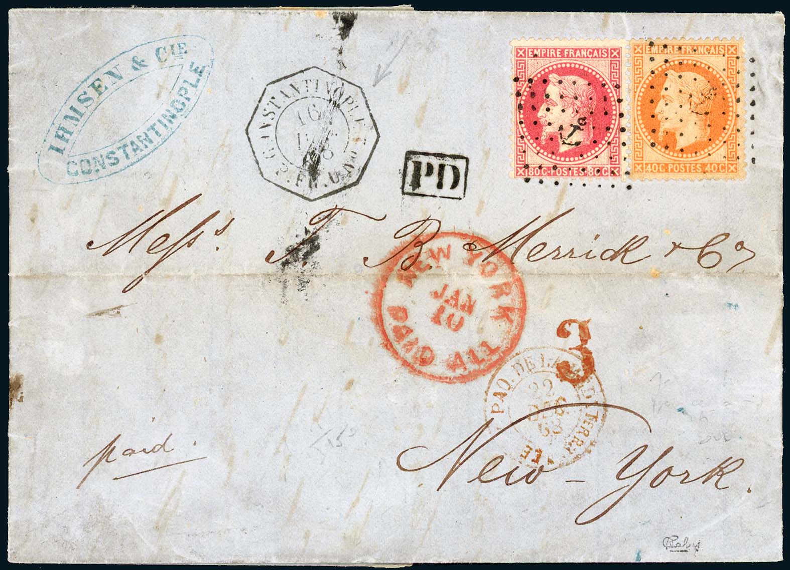2483 | Lot de 7 lettres oblitérées dans les bureaux du Levant en majorité (Alexandrie, Beyrouth (2), Salonique, Smyrne, constantinople, Alger) de 1857 à 1884, bonne qualité générale, à étudier | 150 | 300 | 150 | enchérir | |