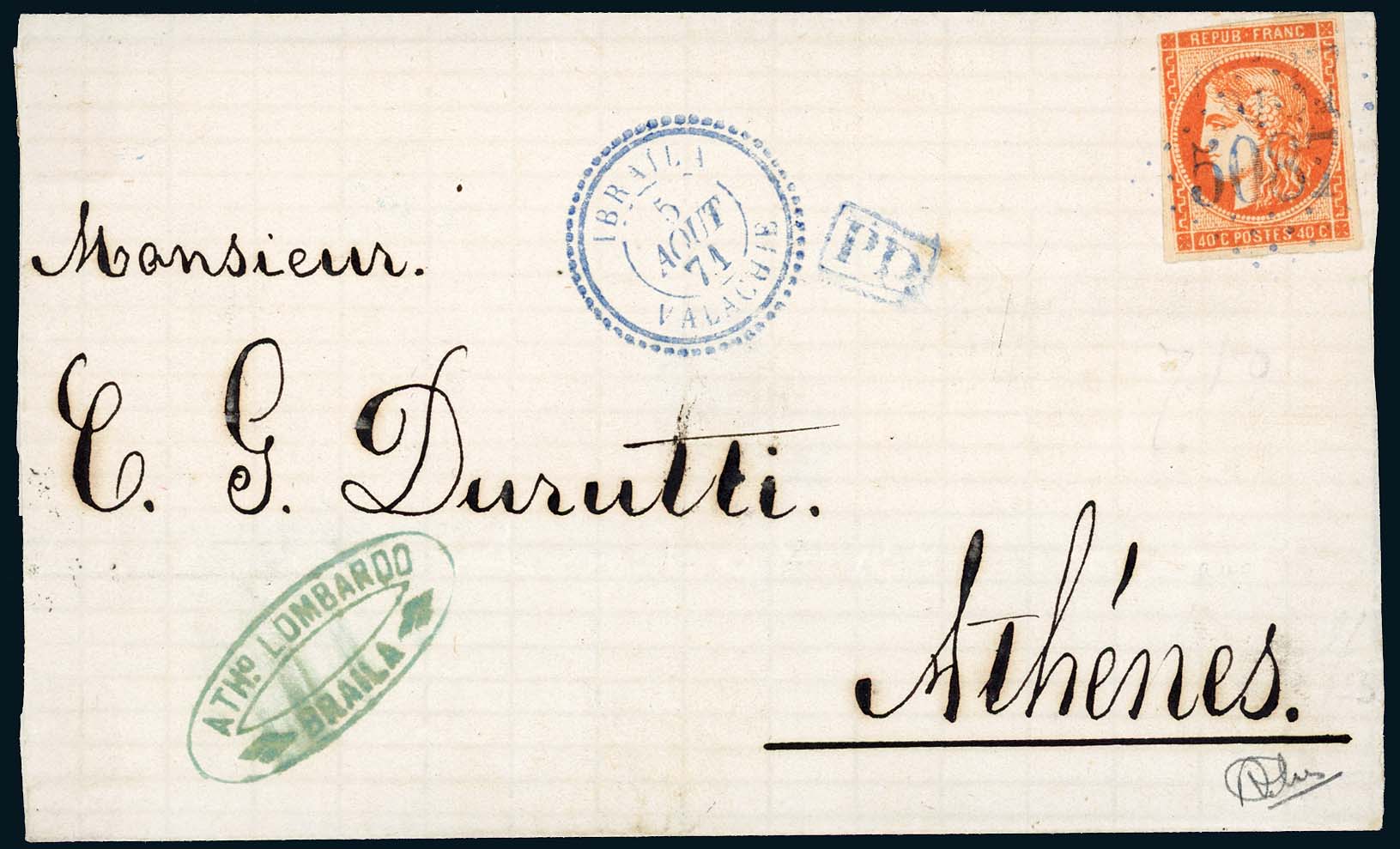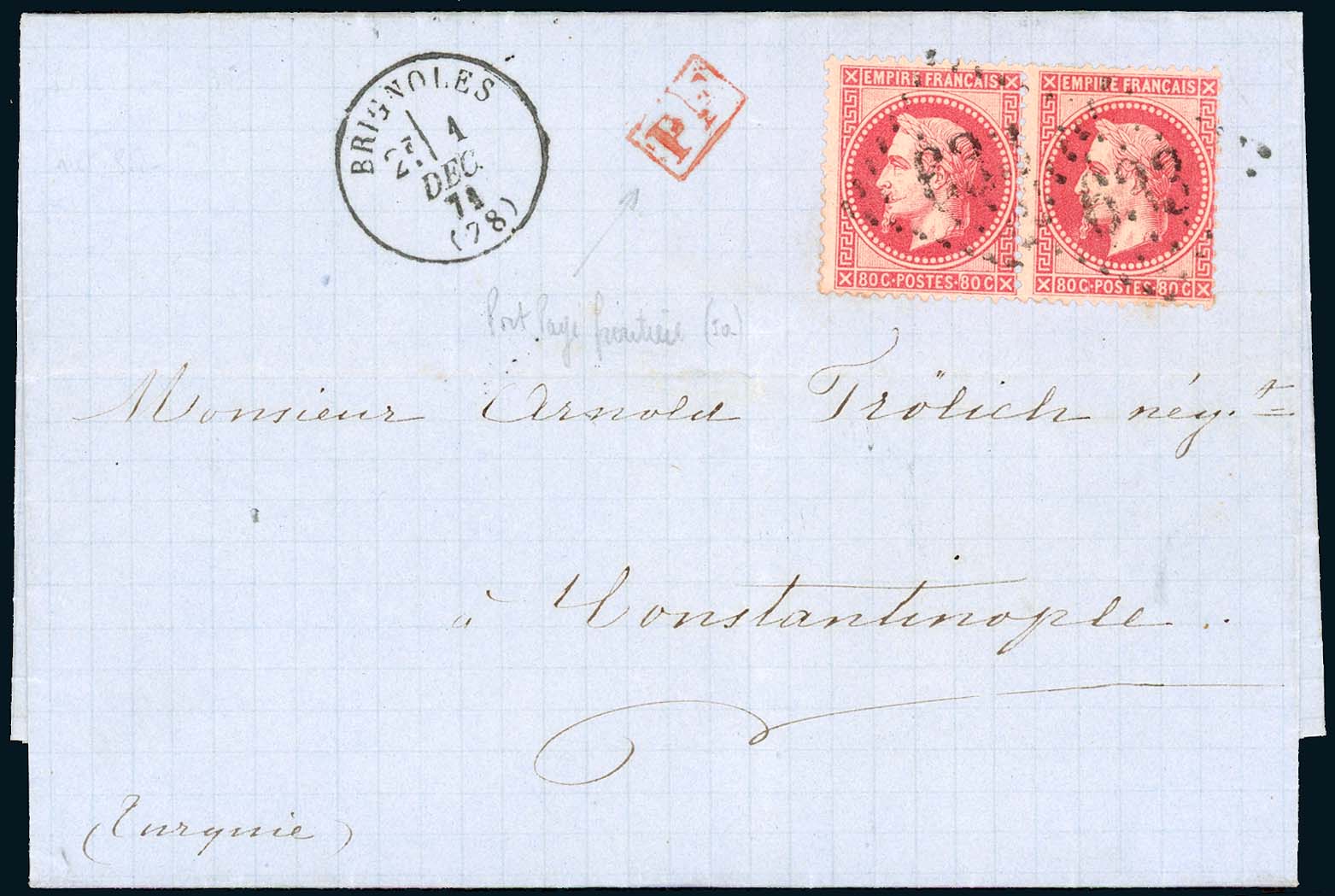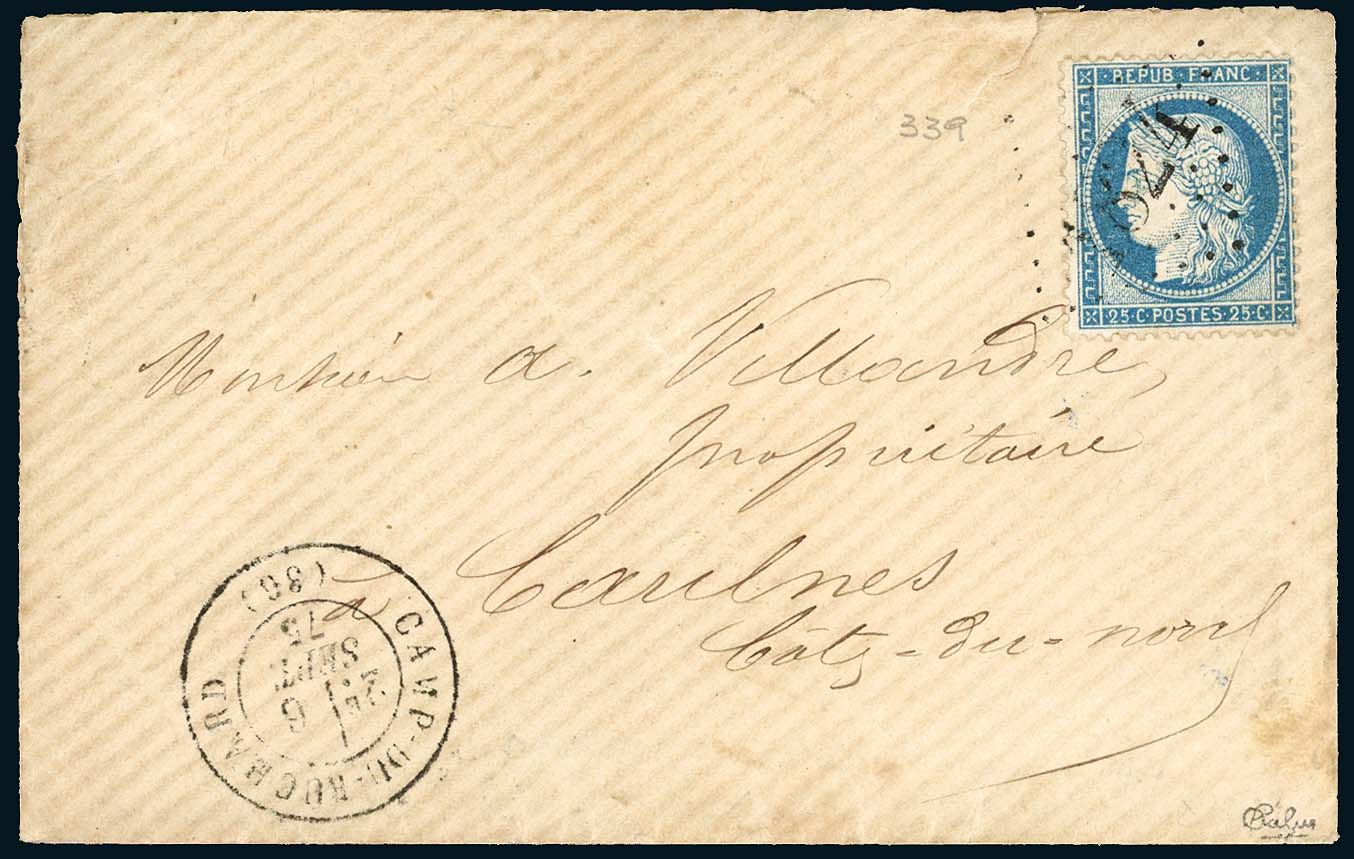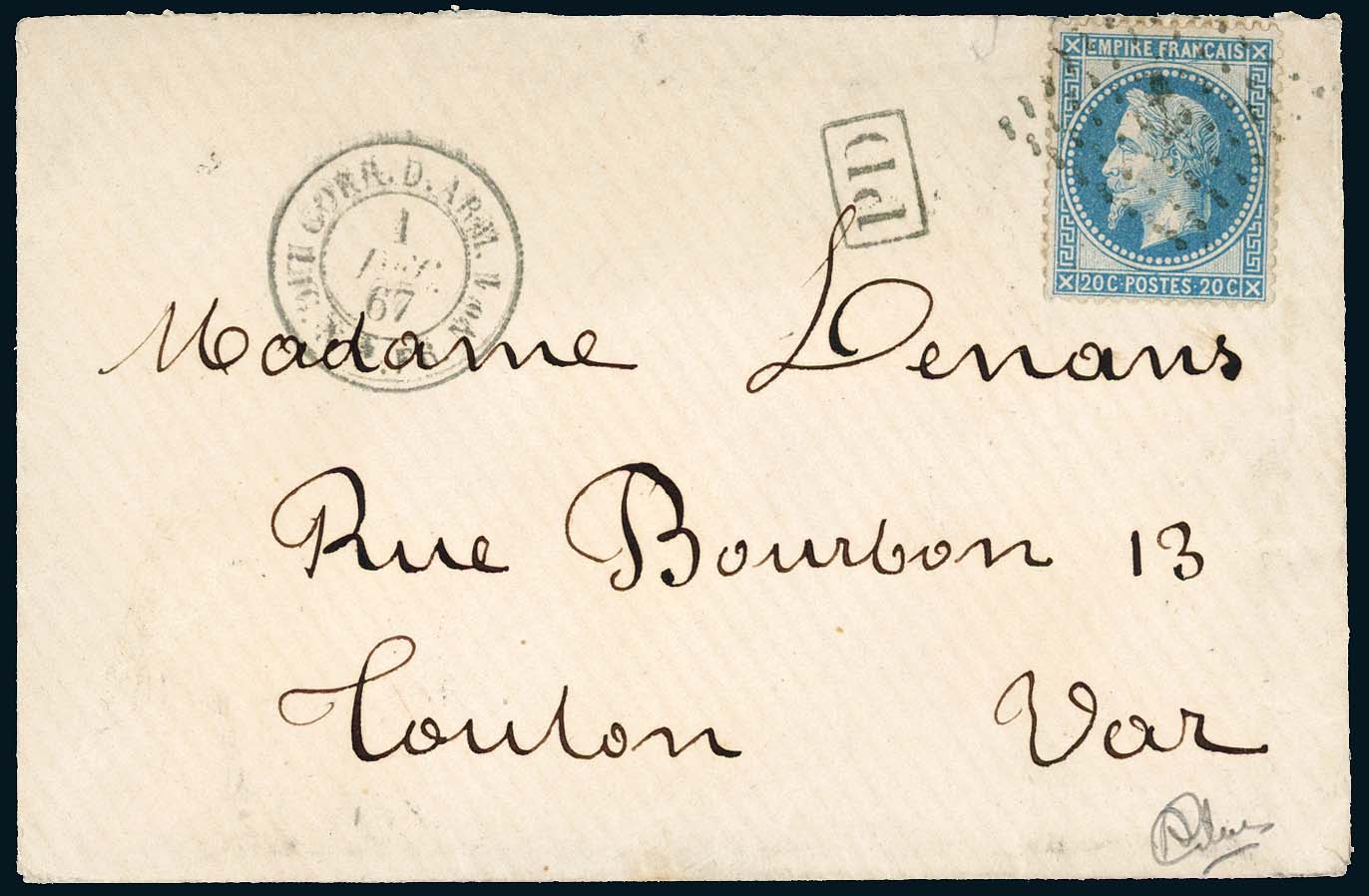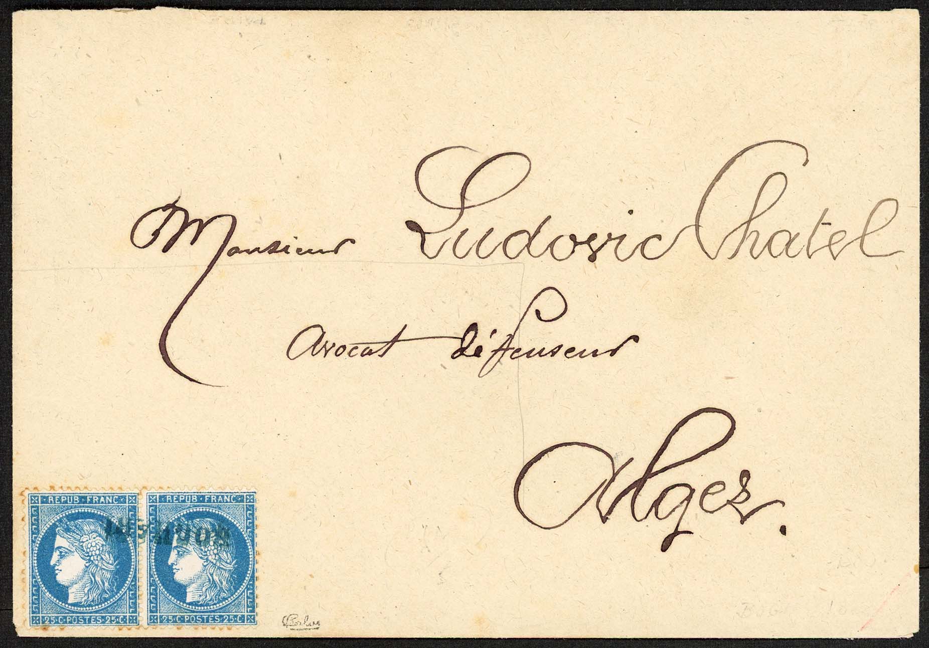 2483 | Lot de 7 lettres oblitérées dans les bureaux du Levant en majorité (Alexandrie, Beyrouth (2), Salonique, Smyrne, constantinople, Alger) de 1857 à 1884, bonne qualité générale, à étudier | 150 | 300 | 150 | enchérir | |