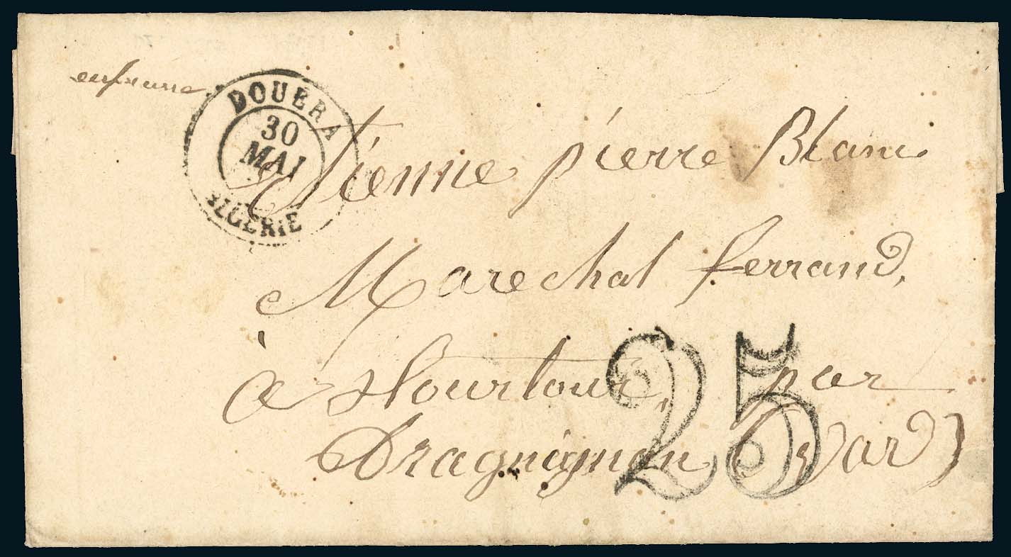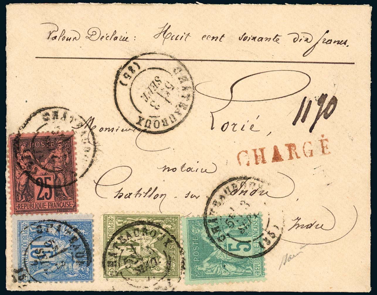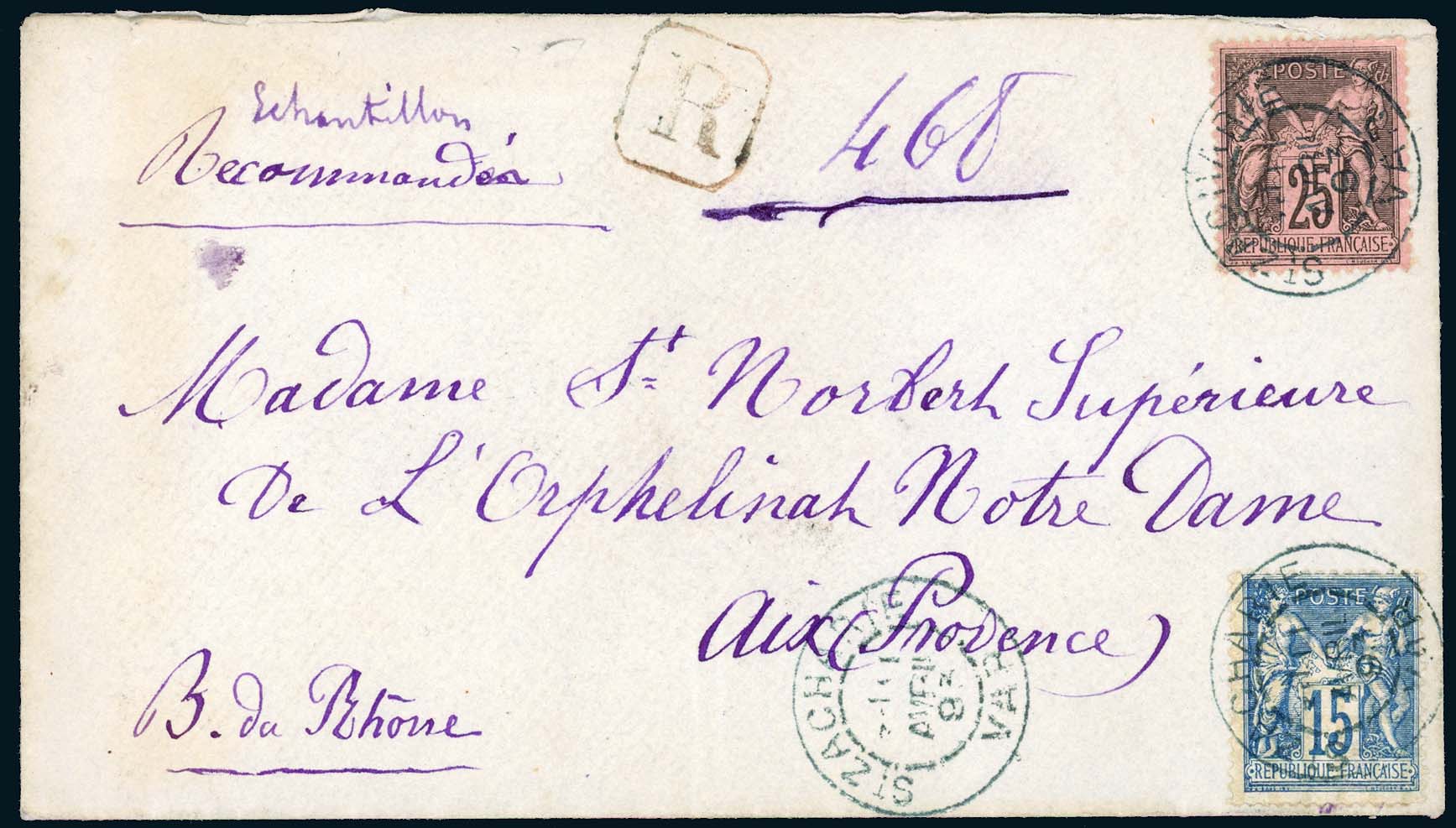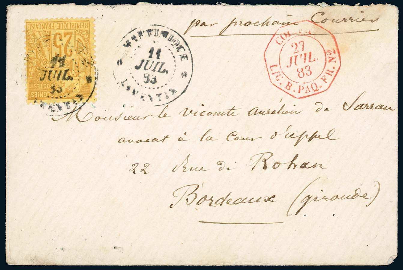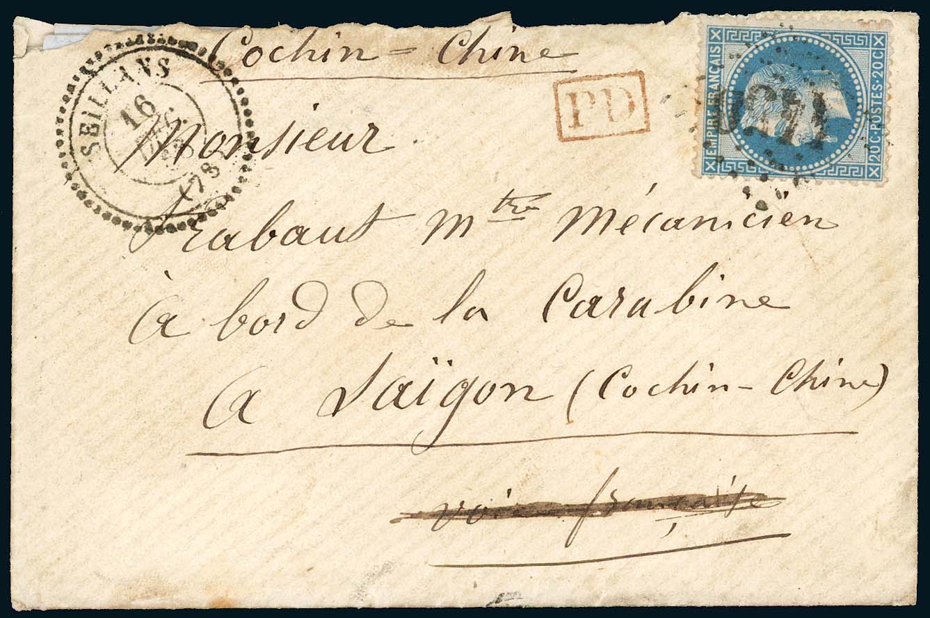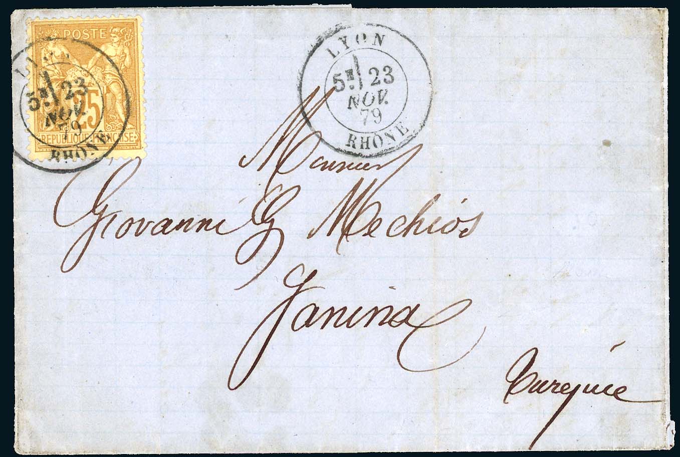 2483 | Lot de 7 lettres oblitérées dans les bureaux du Levant en majorité (Alexandrie, Beyrouth (2), Salonique, Smyrne, constantinople, Alger) de 1857 à 1884, bonne qualité générale, à étudier | 150 | 300 | 150 | enchérir | |