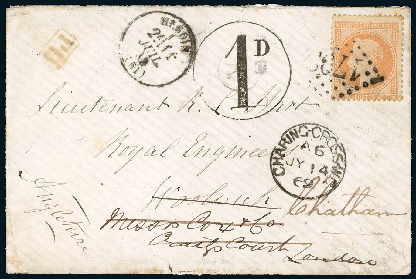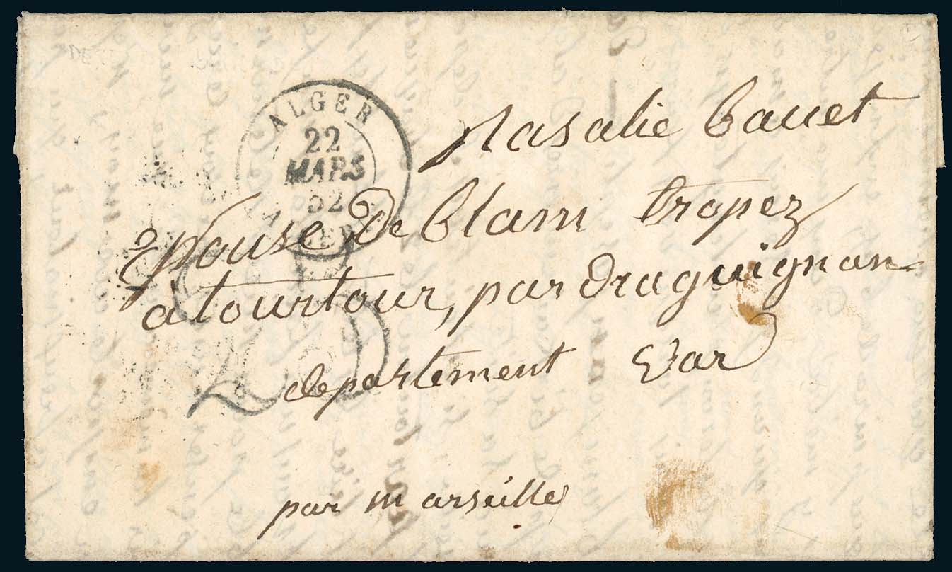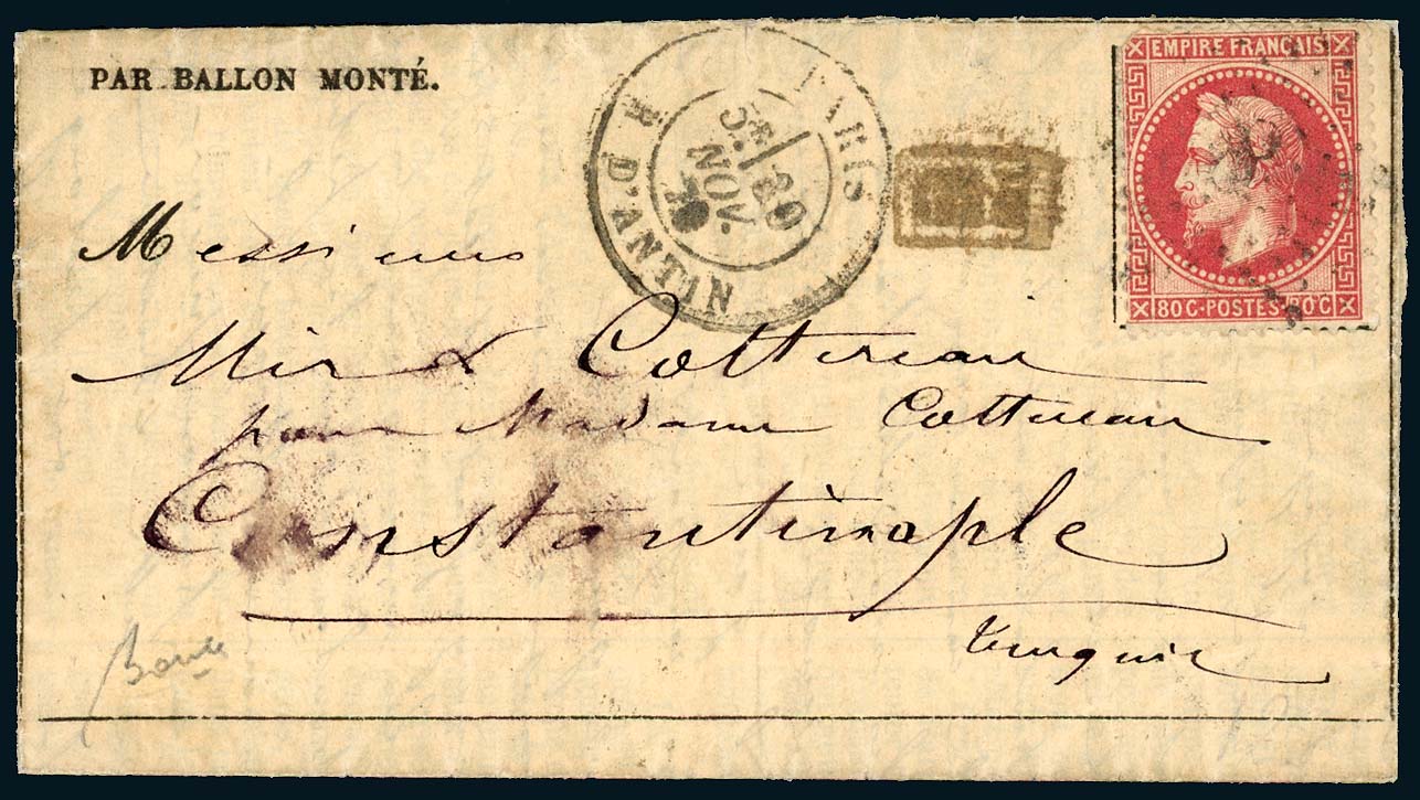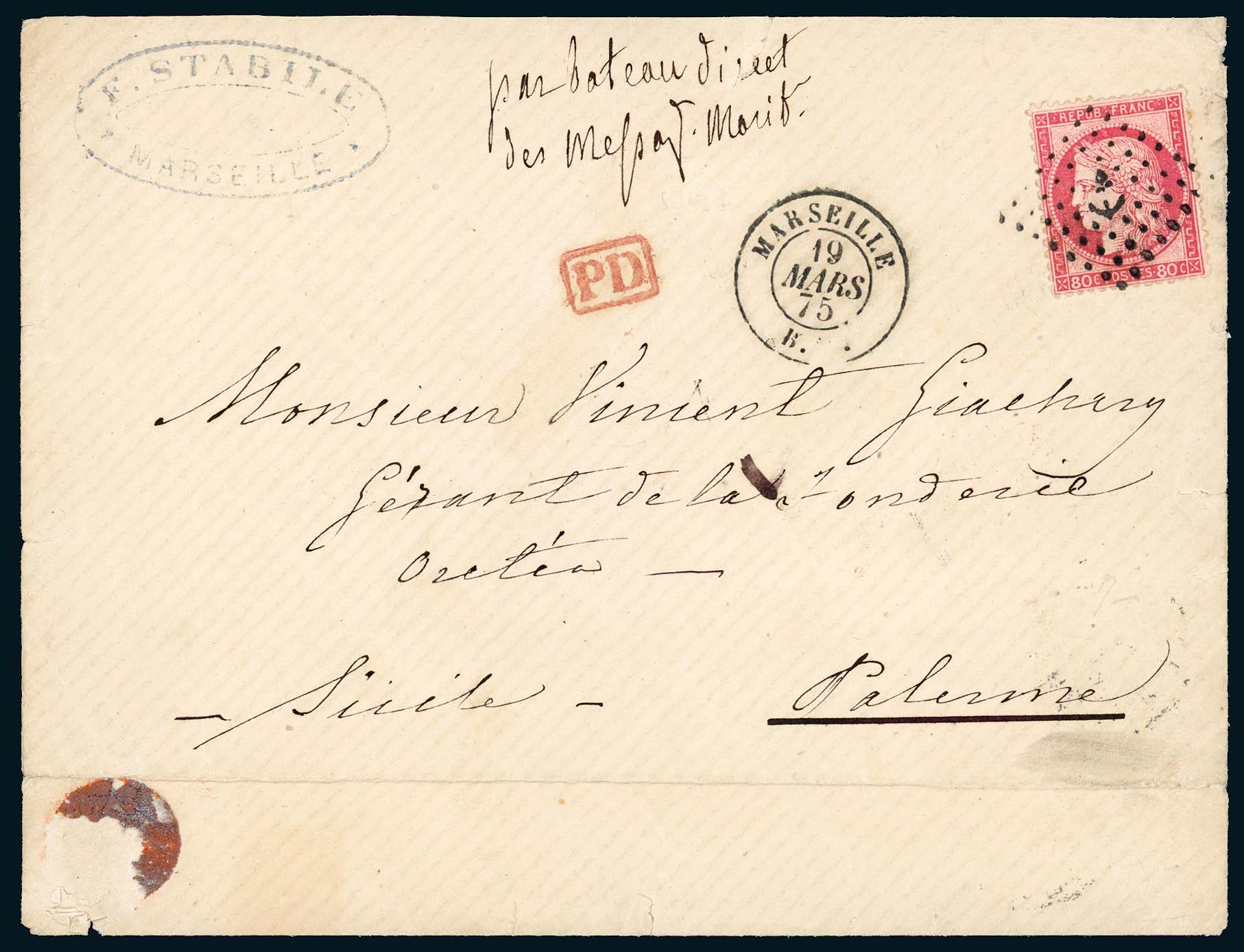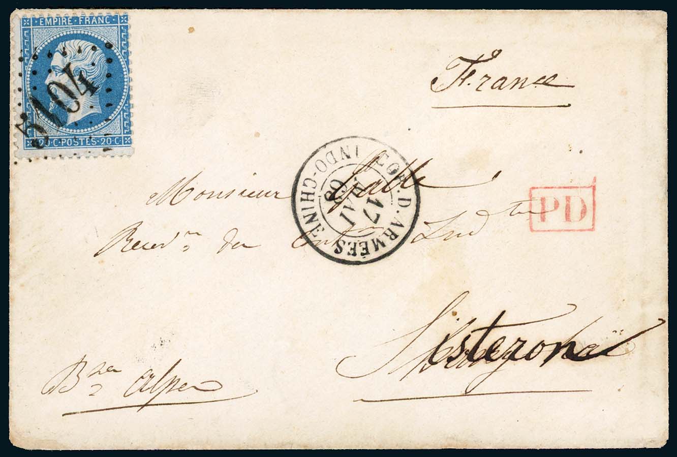 2483 | Lot de 7 lettres oblitérées dans les bureaux du Levant en majorité (Alexandrie, Beyrouth (2), Salonique, Smyrne, constantinople, Alger) de 1857 à 1884, bonne qualité générale, à étudier | 150 | 300 | 150 | enchérir | |