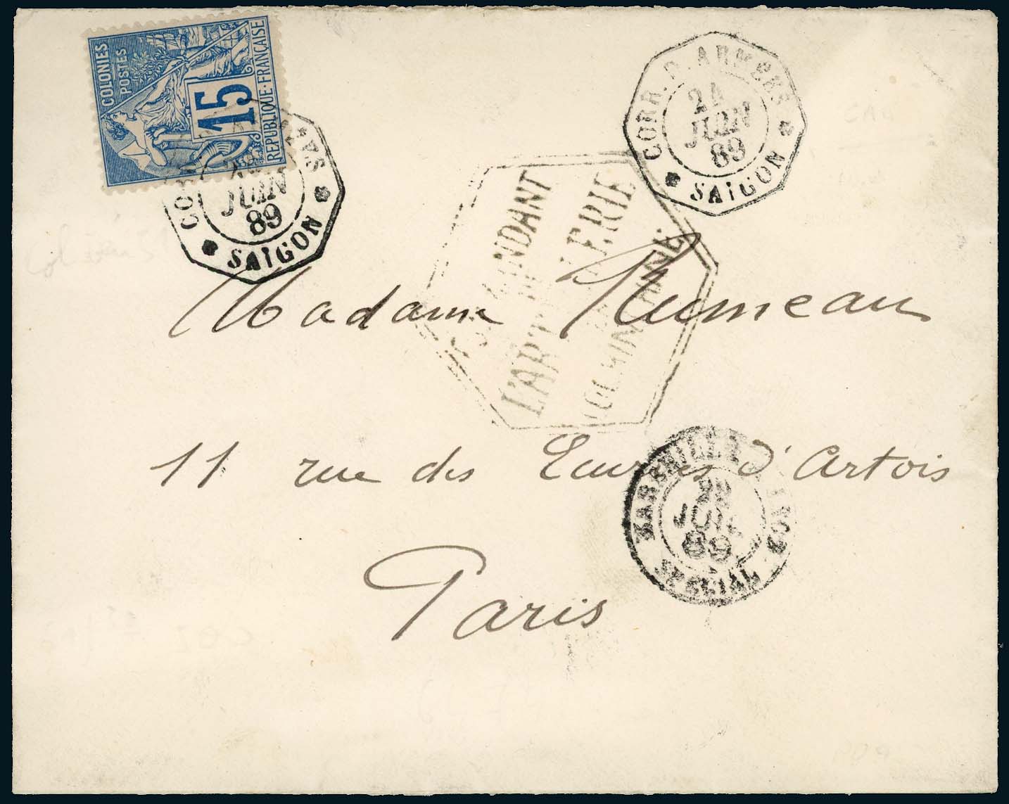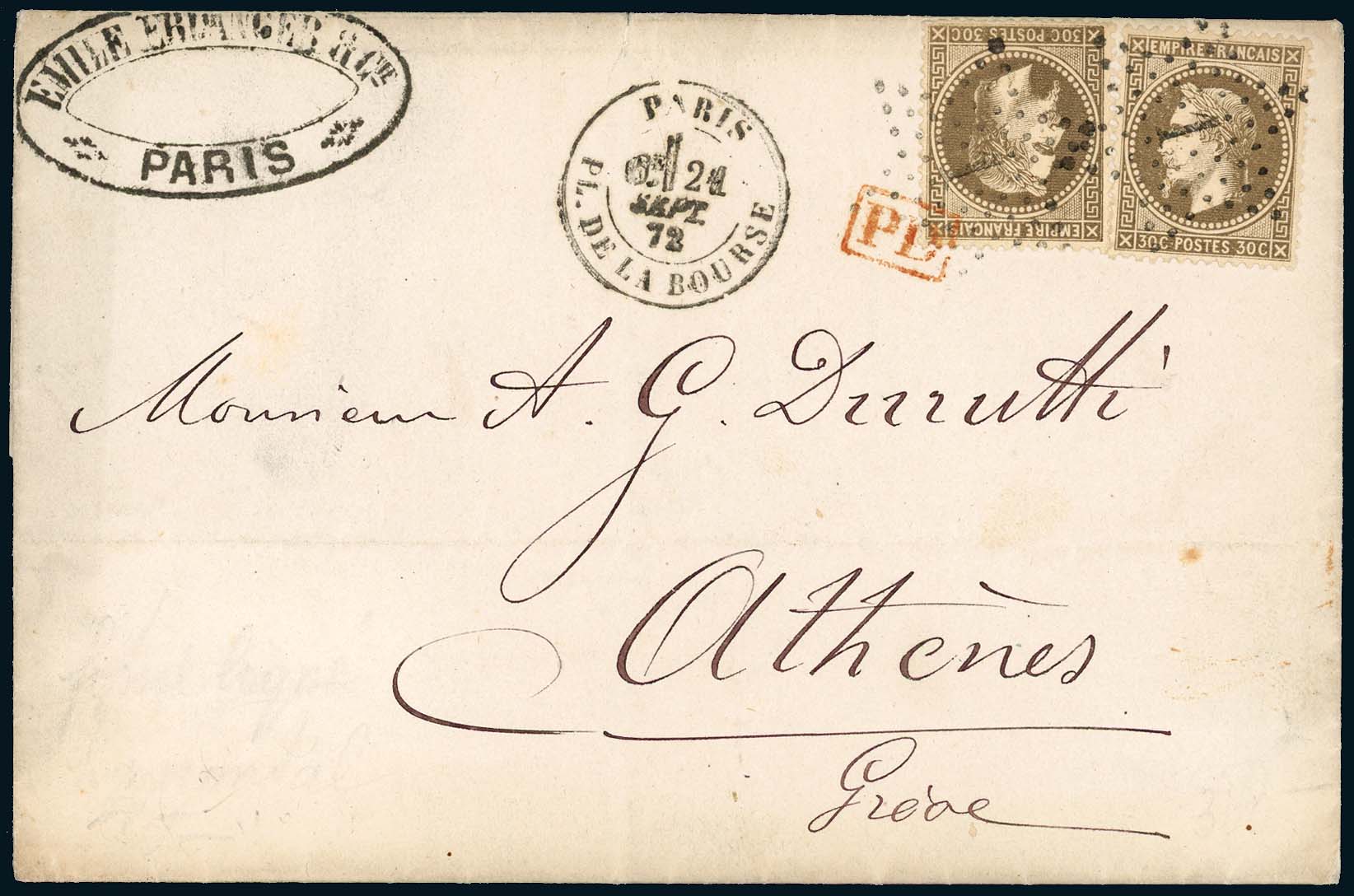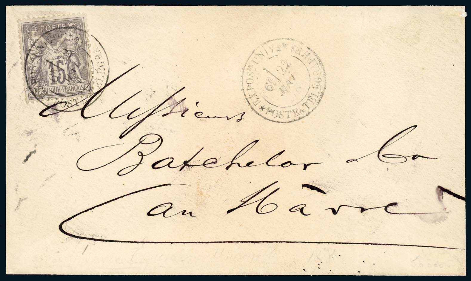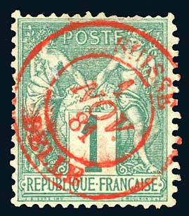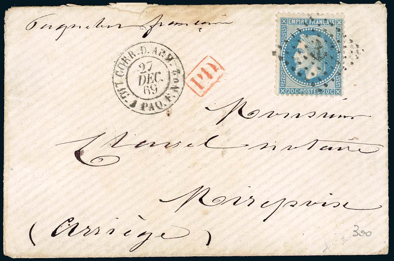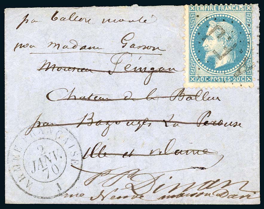 2483 | Lot de 7 lettres oblitérées dans les bureaux du Levant en majorité (Alexandrie, Beyrouth (2), Salonique, Smyrne, constantinople, Alger) de 1857 à 1884, bonne qualité générale, à étudier | 150 | 300 | 150 | enchérir | |