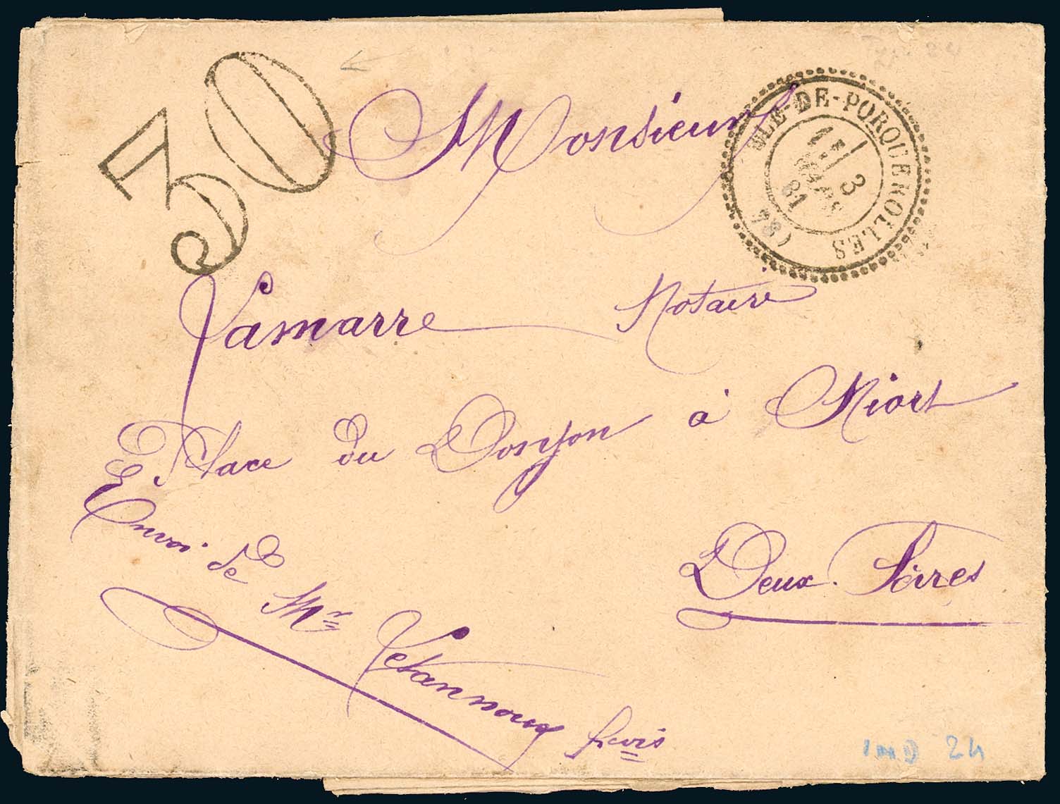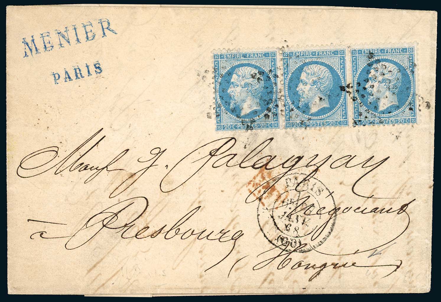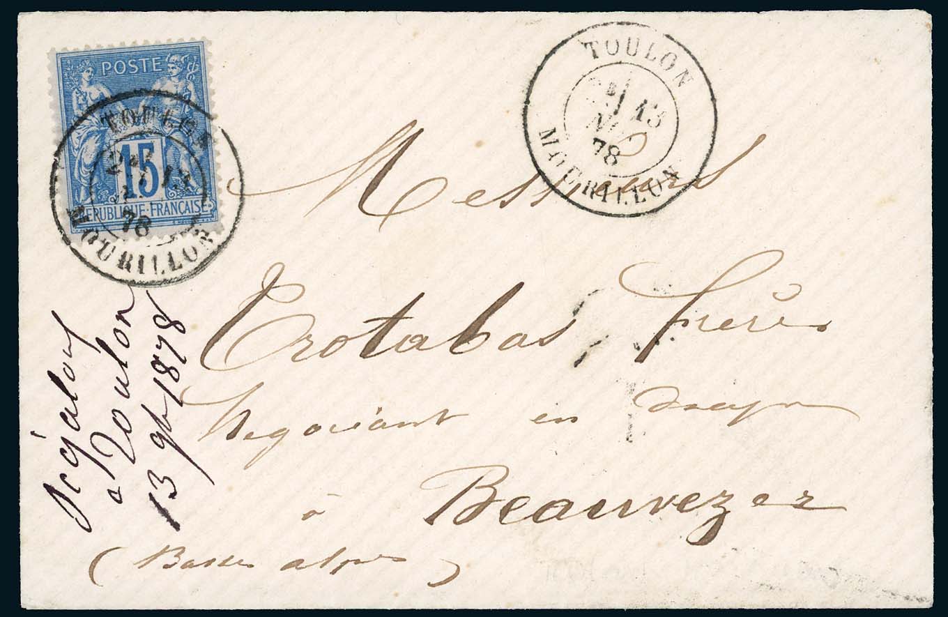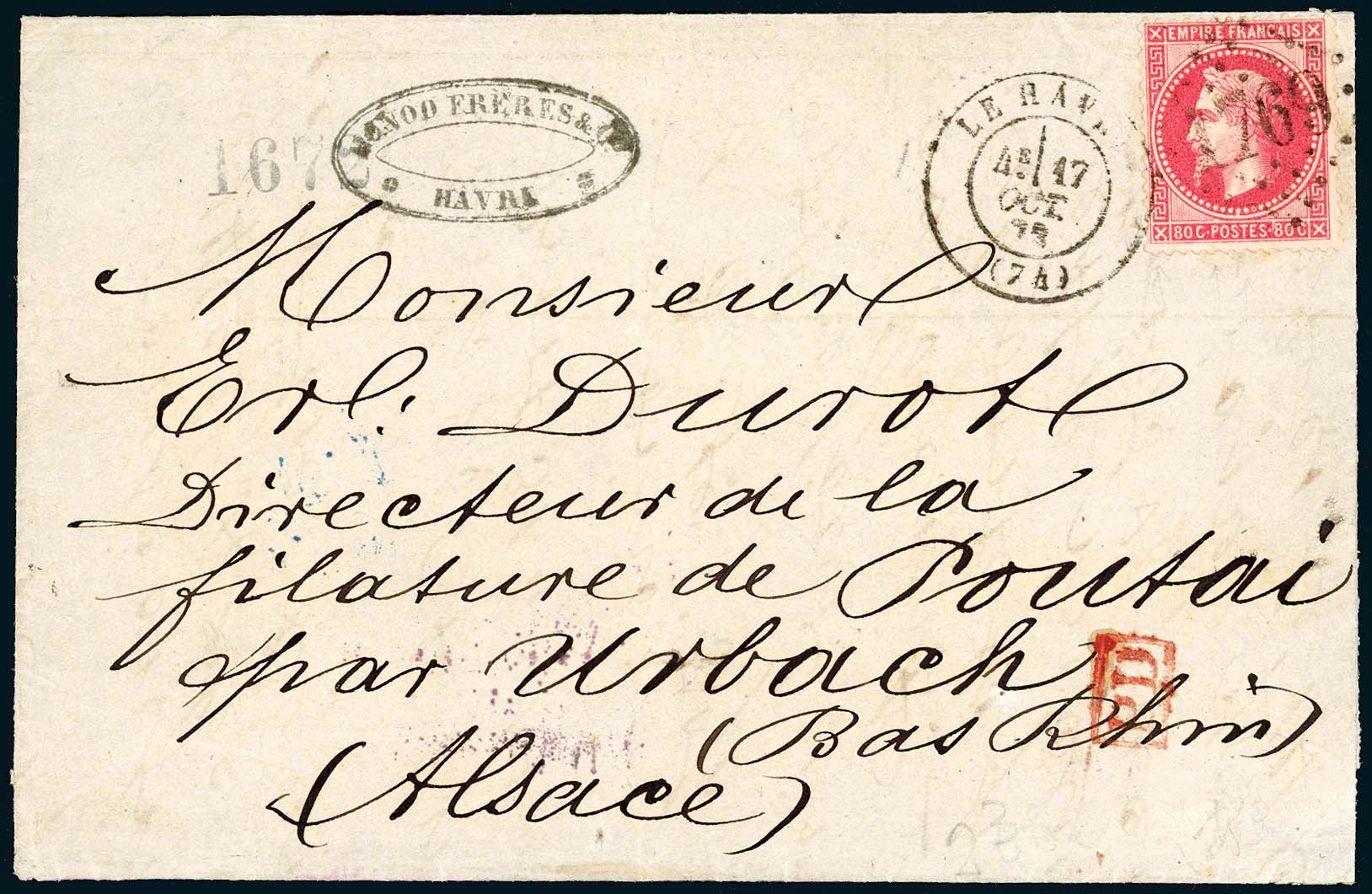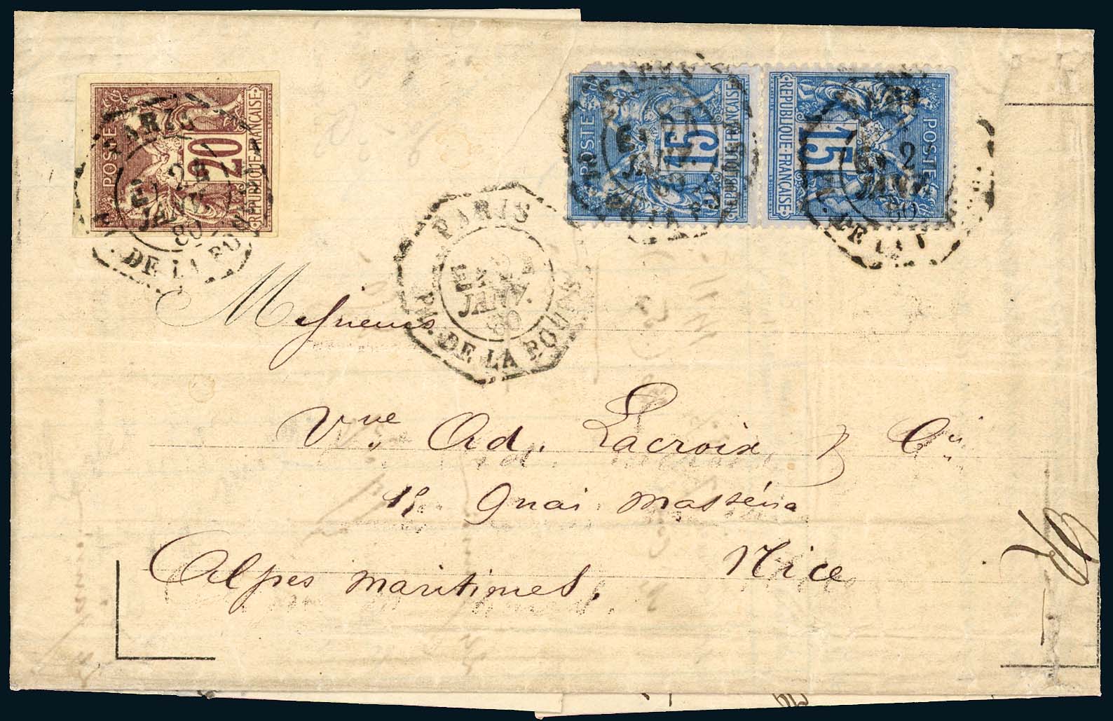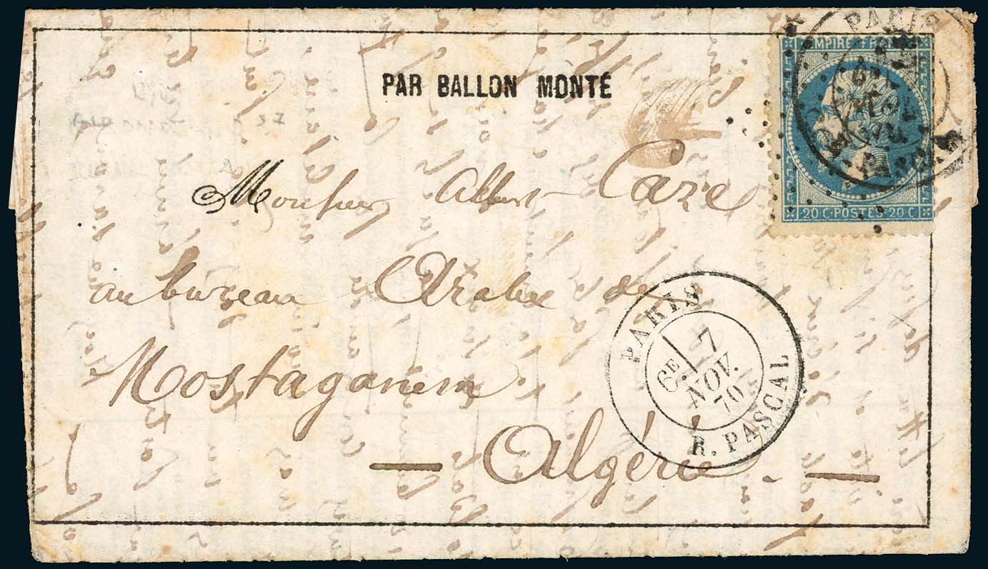 2483 | Lot de 7 lettres oblitérées dans les bureaux du Levant en majorité (Alexandrie, Beyrouth (2), Salonique, Smyrne, constantinople, Alger) de 1857 à 1884, bonne qualité générale, à étudier | 150 | 300 | 150 | enchérir | |