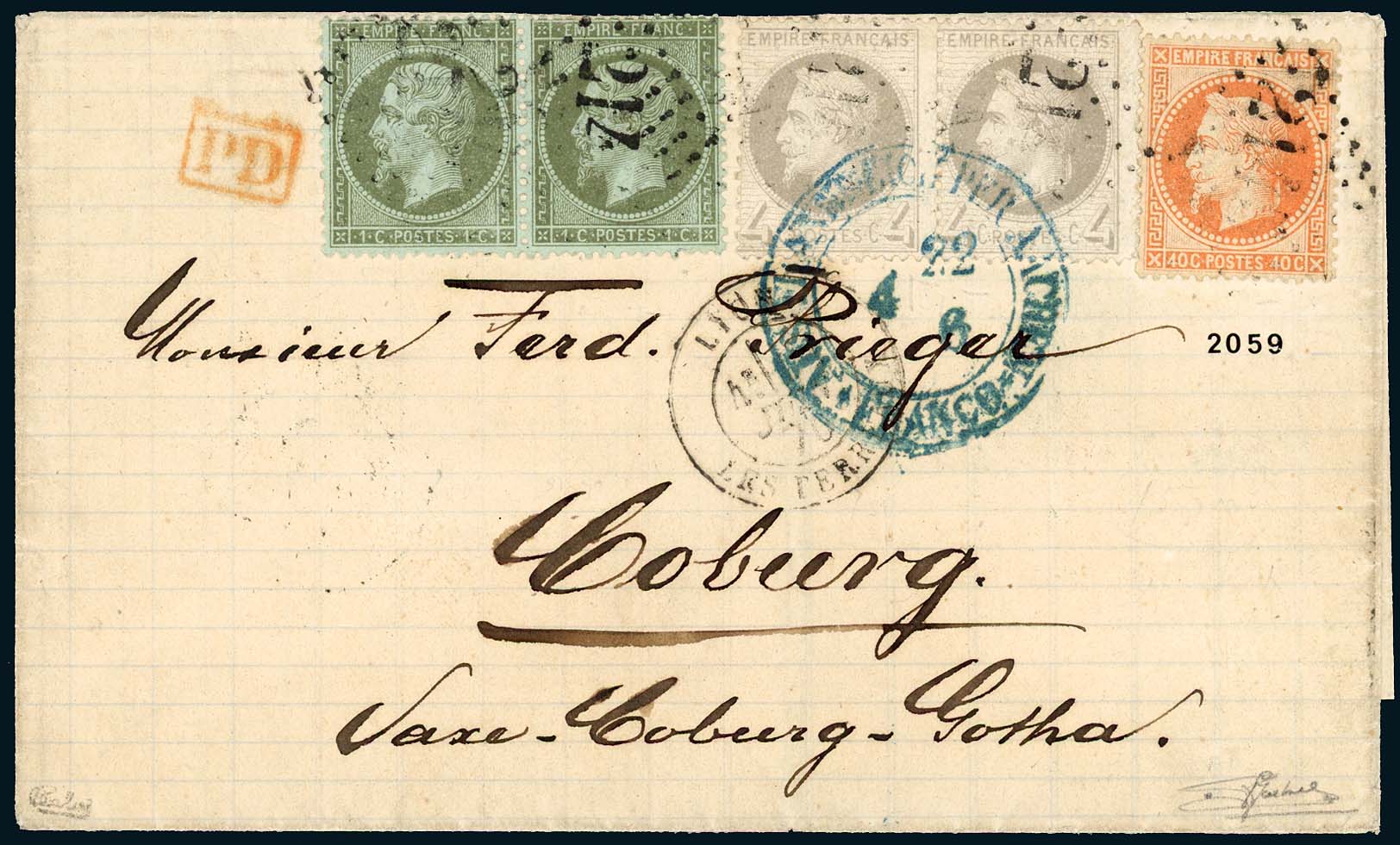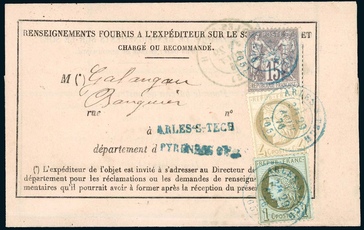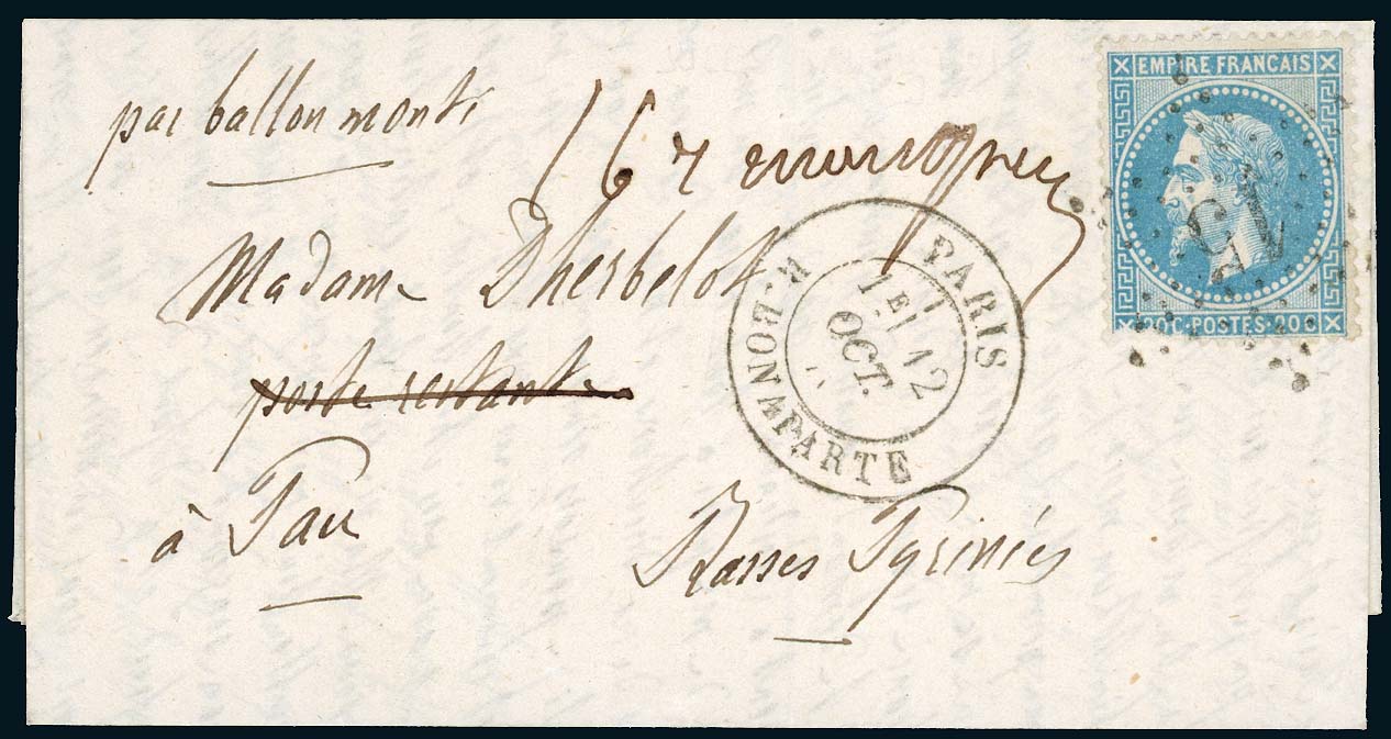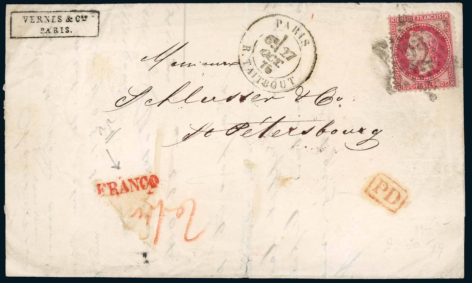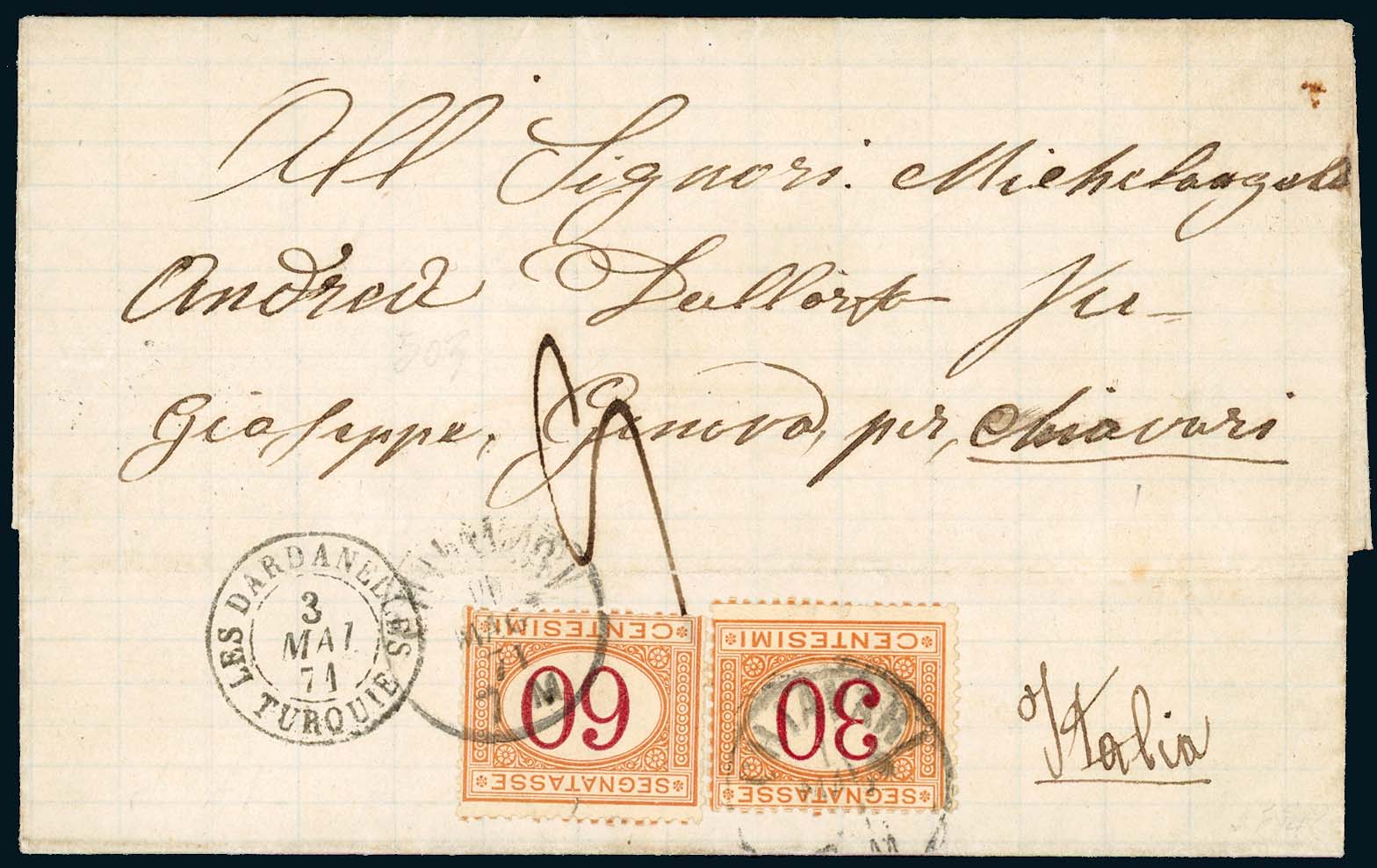 2483 | Lot de 7 lettres oblitérées dans les bureaux du Levant en majorité (Alexandrie, Beyrouth (2), Salonique, Smyrne, constantinople, Alger) de 1857 à 1884, bonne qualité générale, à étudier | 150 | 300 | 150 | enchérir | |