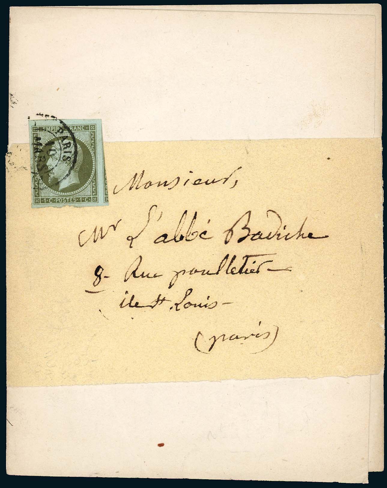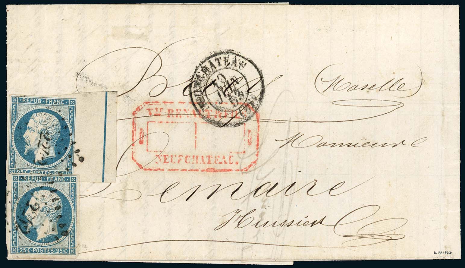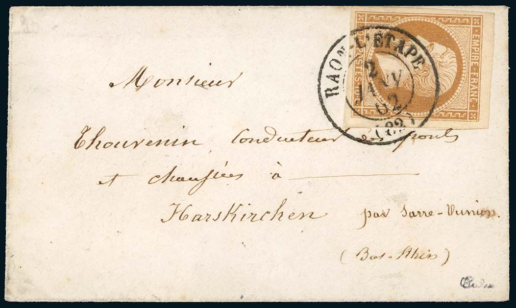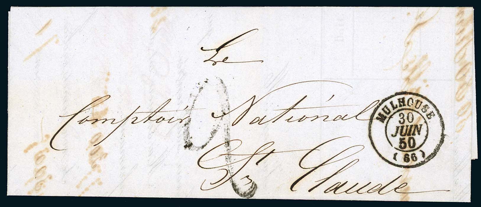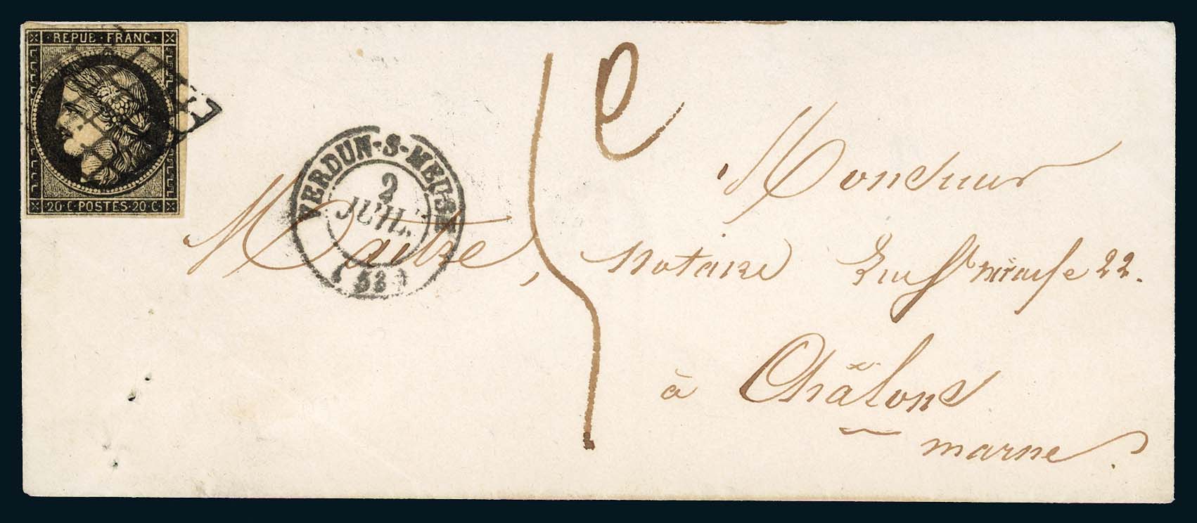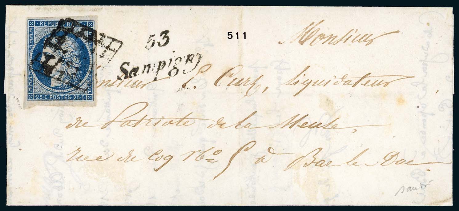 53 | N°3 OB C. MUTZIG sur enveloppe (légèrement consolidée) à destination de Paris avec C. PARIS au verso 1849 Utilisation très tardive du cachet à date pour oblitérer les timbres, signé Calves et Brun TB | 180 | 250 | 180 | enchérir | |