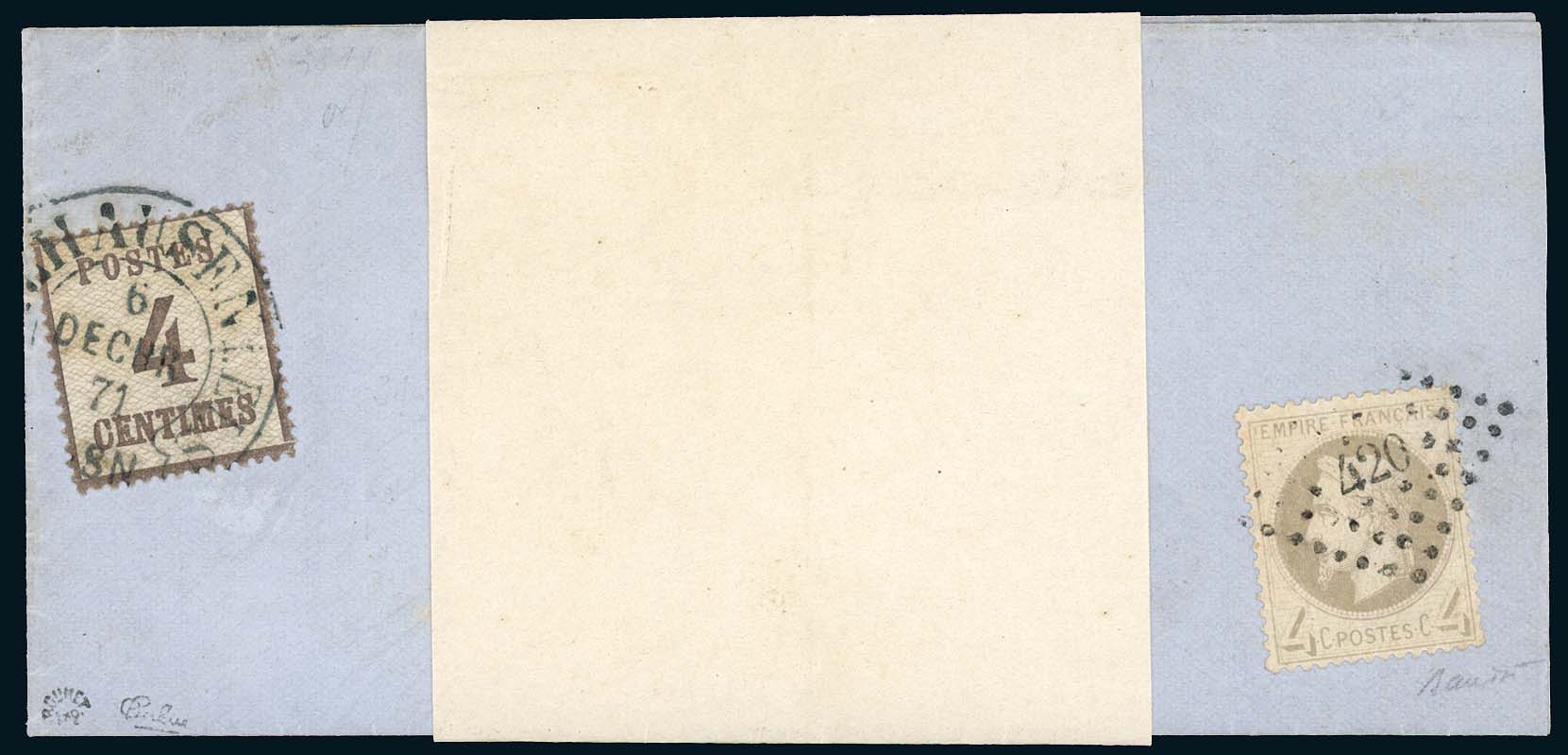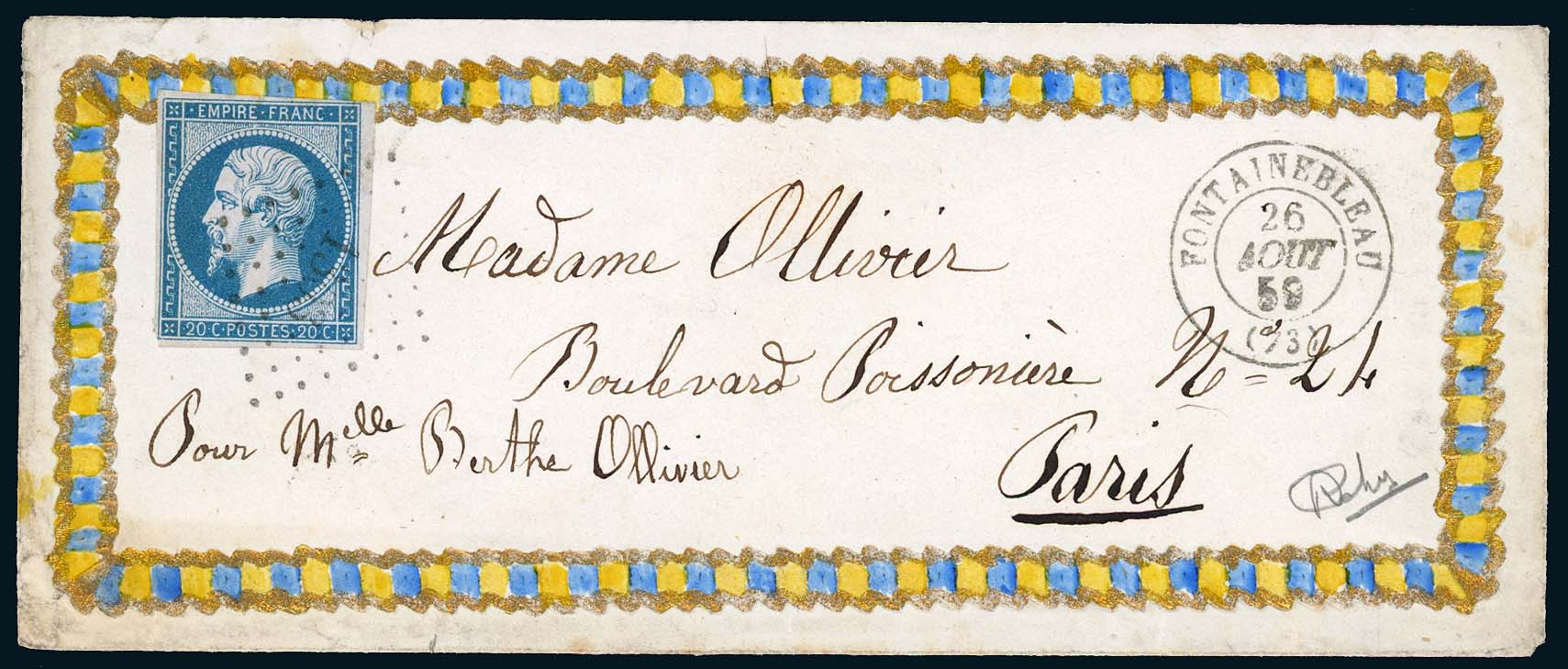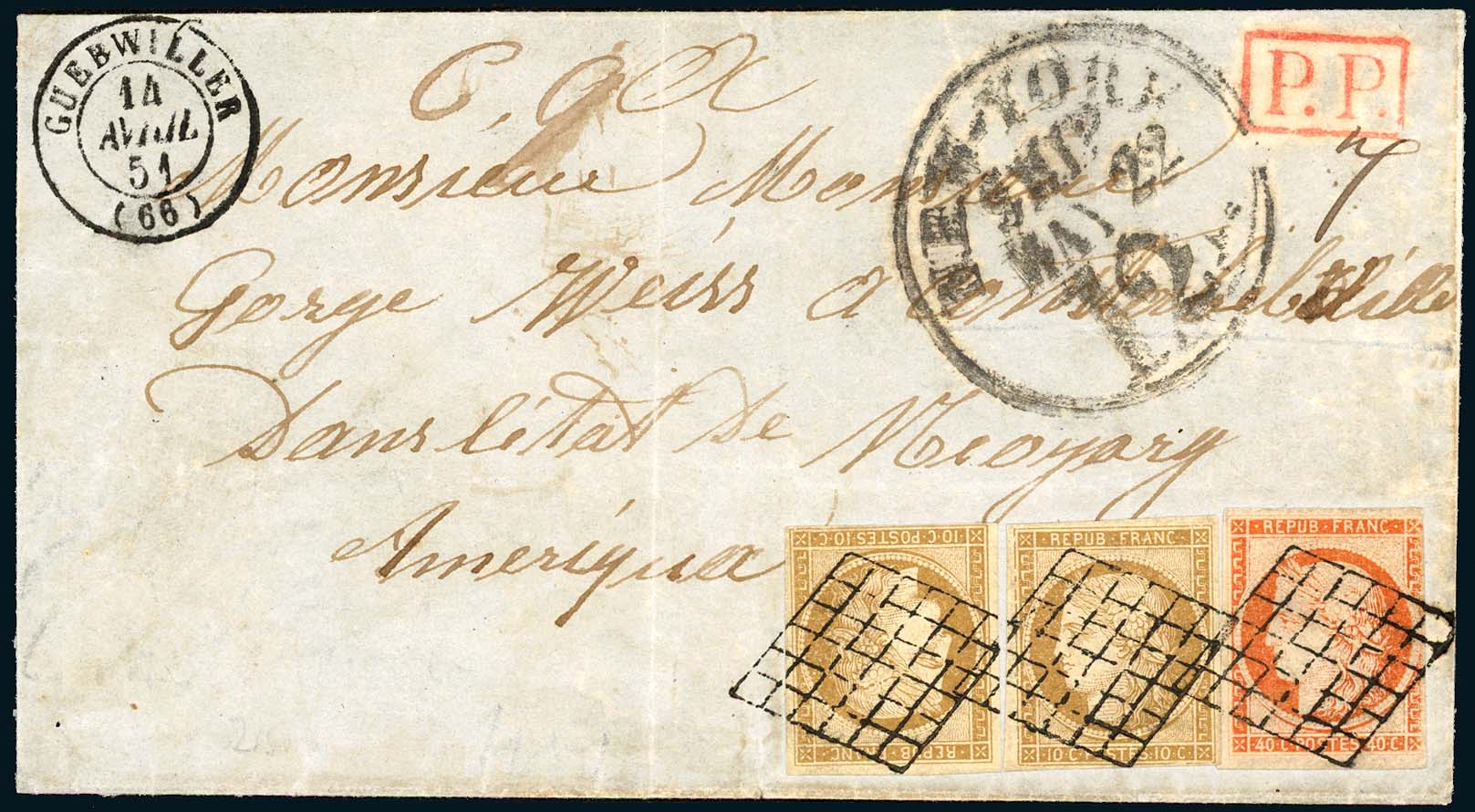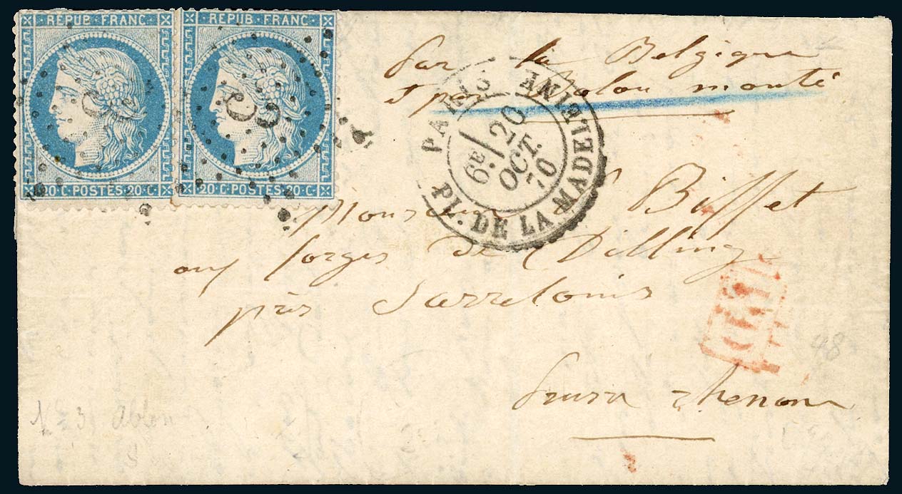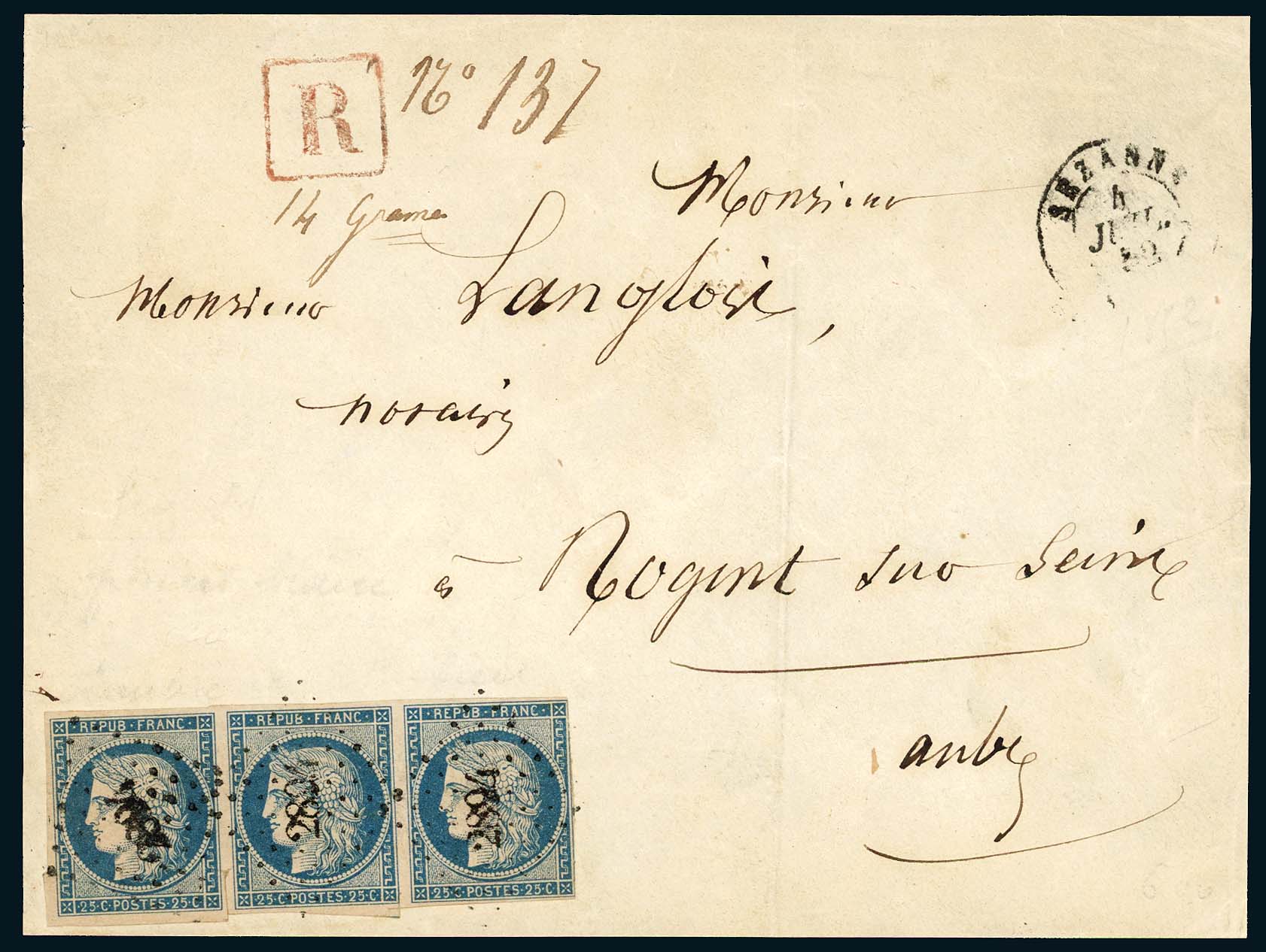53 | N°3 OB C. MUTZIG sur enveloppe (légèrement consolidée) à destination de Paris avec C. PARIS au verso 1849 Utilisation très tardive du cachet à date pour oblitérer les timbres, signé Calves et Brun TB | 180 | 250 | 180 | enchérir | |