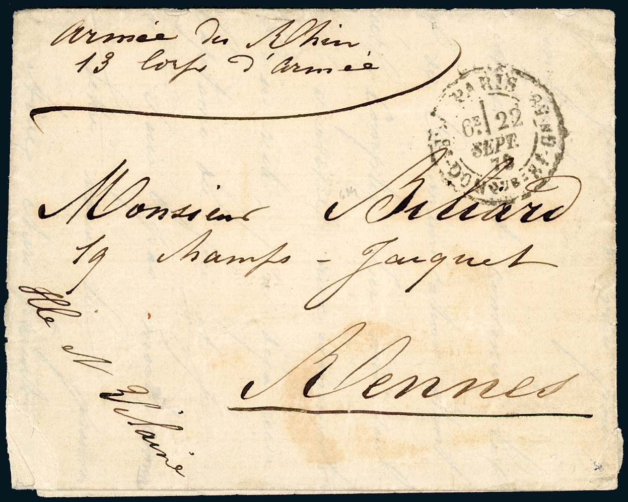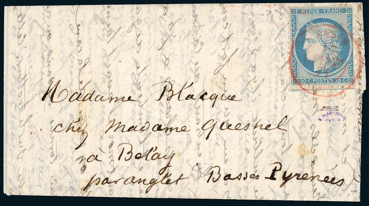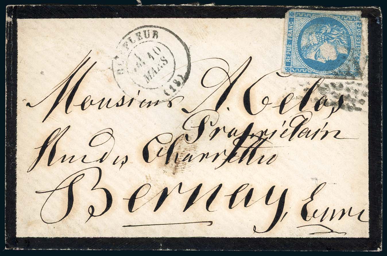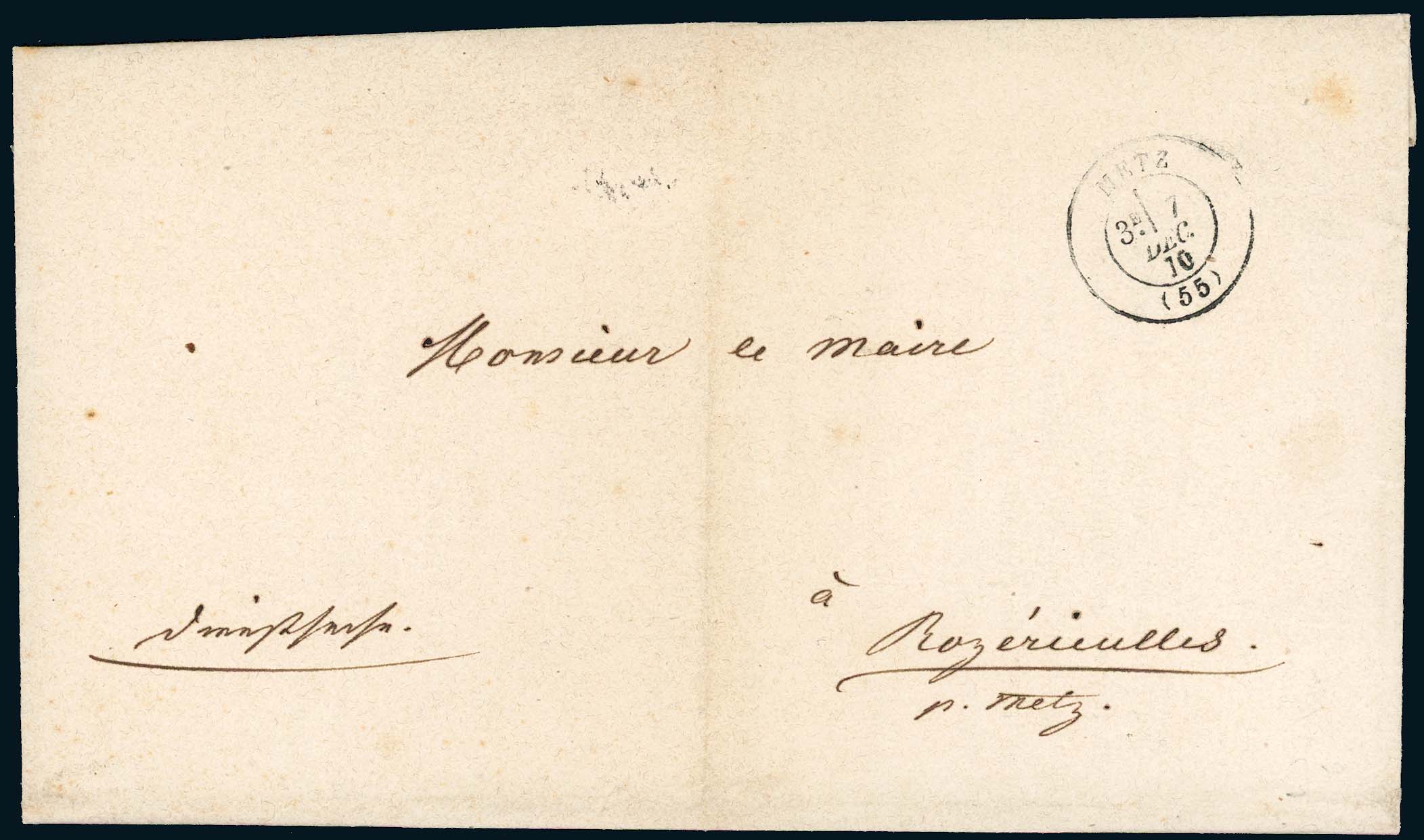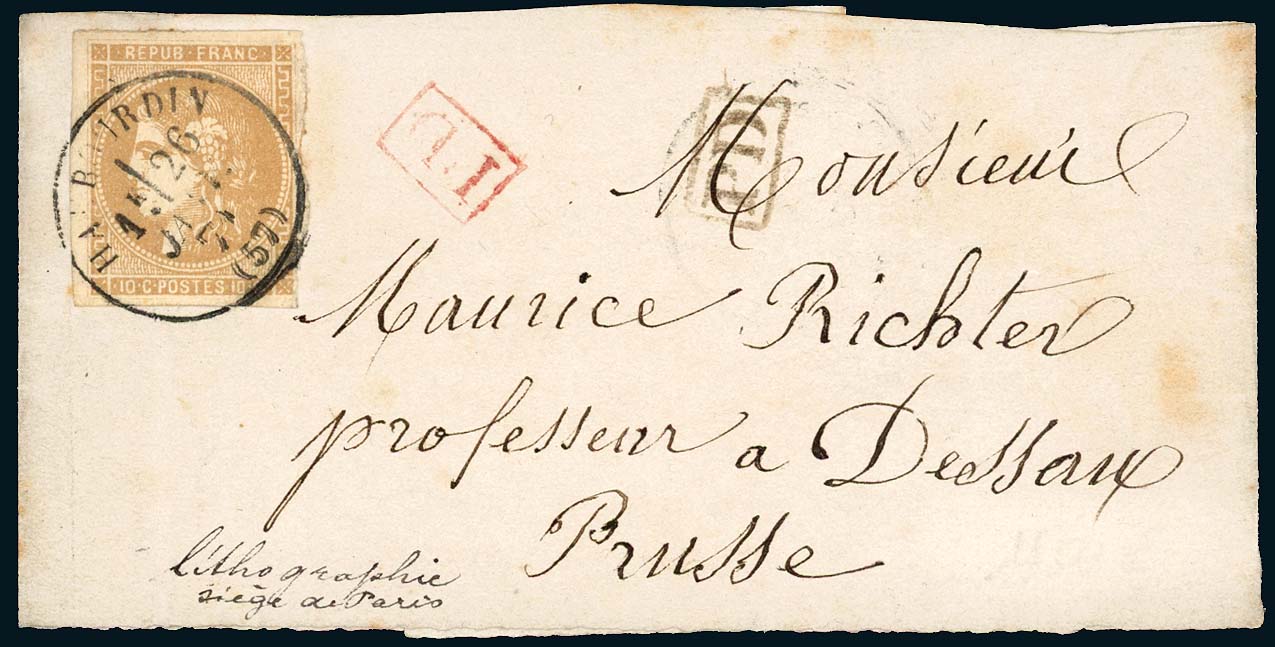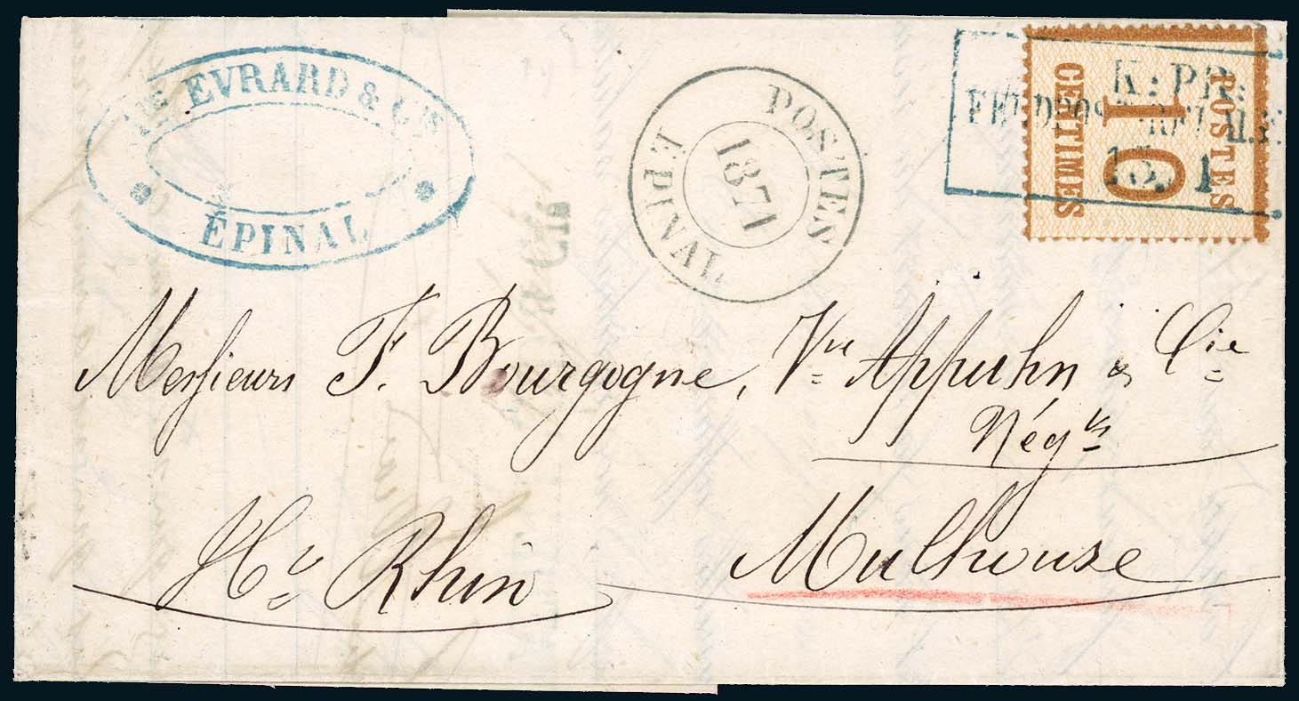 53 | N°3 OB C. MUTZIG sur enveloppe (légèrement consolidée) à destination de Paris avec C. PARIS au verso 1849 Utilisation très tardive du cachet à date pour oblitérer les timbres, signé Calves et Brun TB | 180 | 250 | 180 | enchérir | |