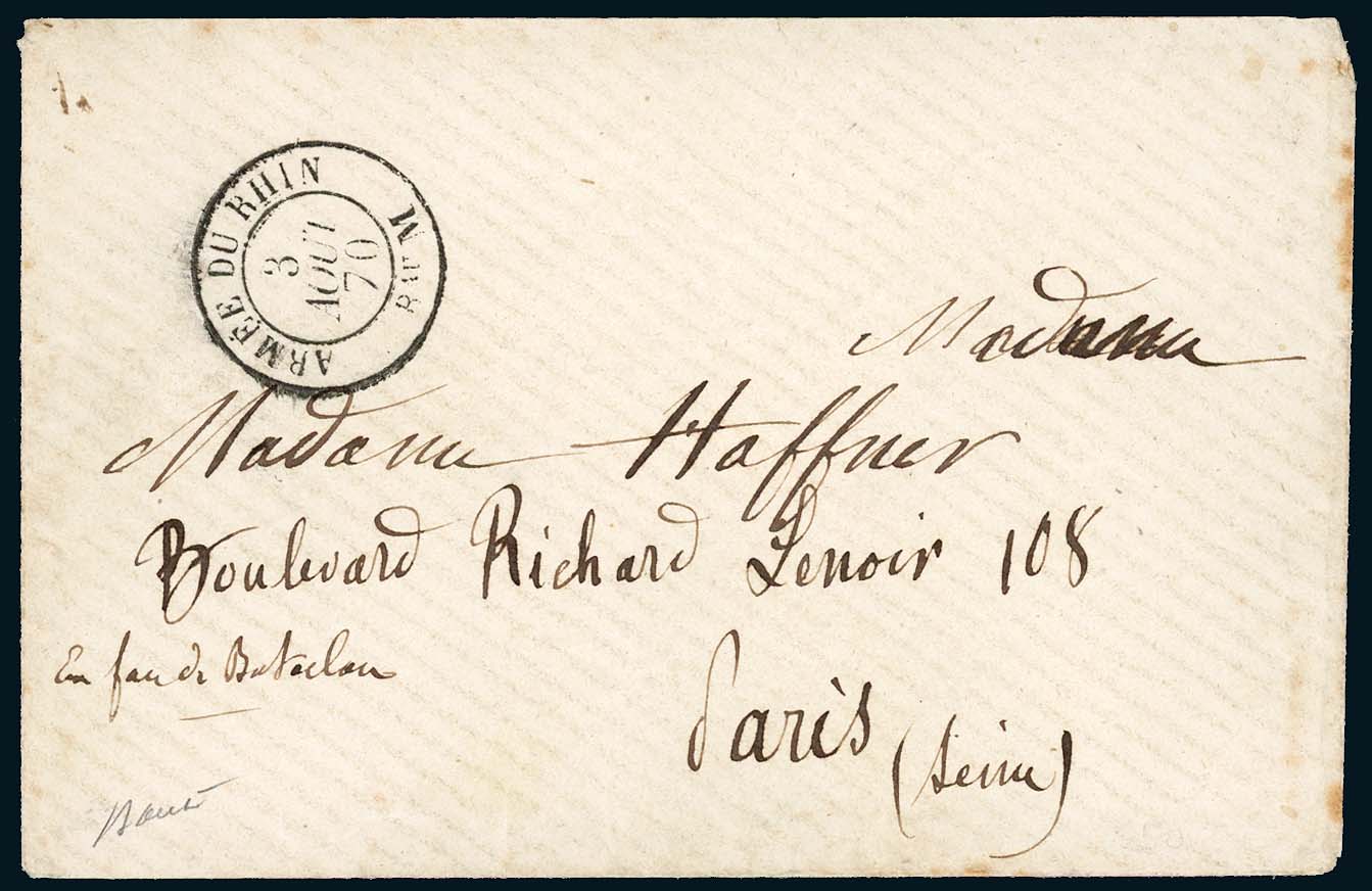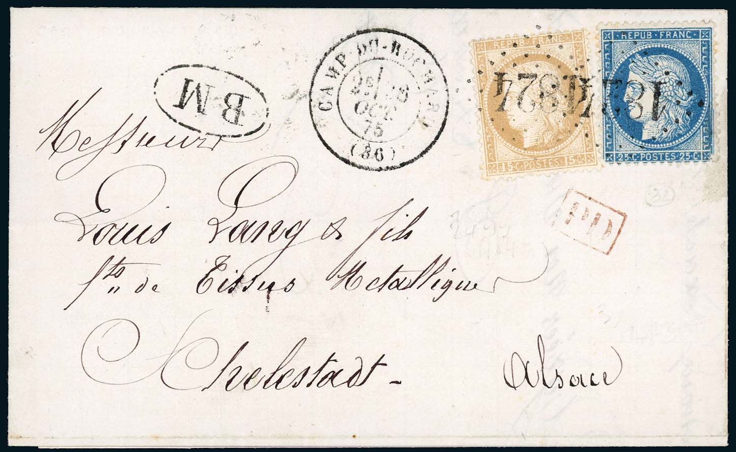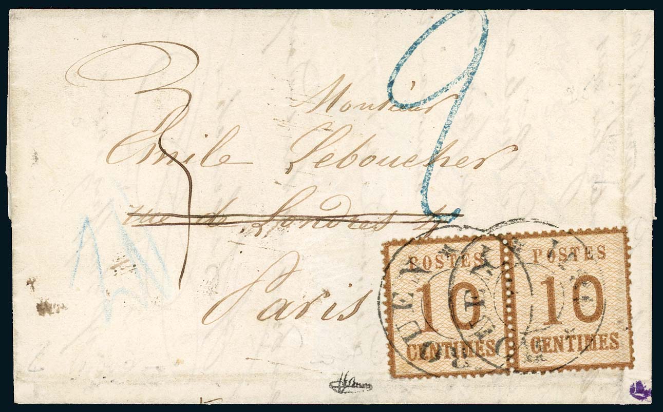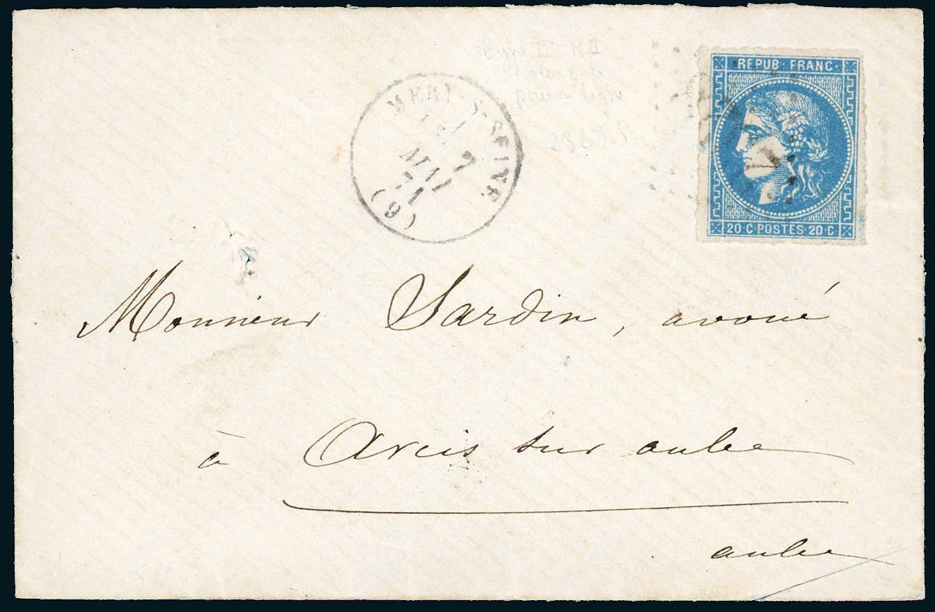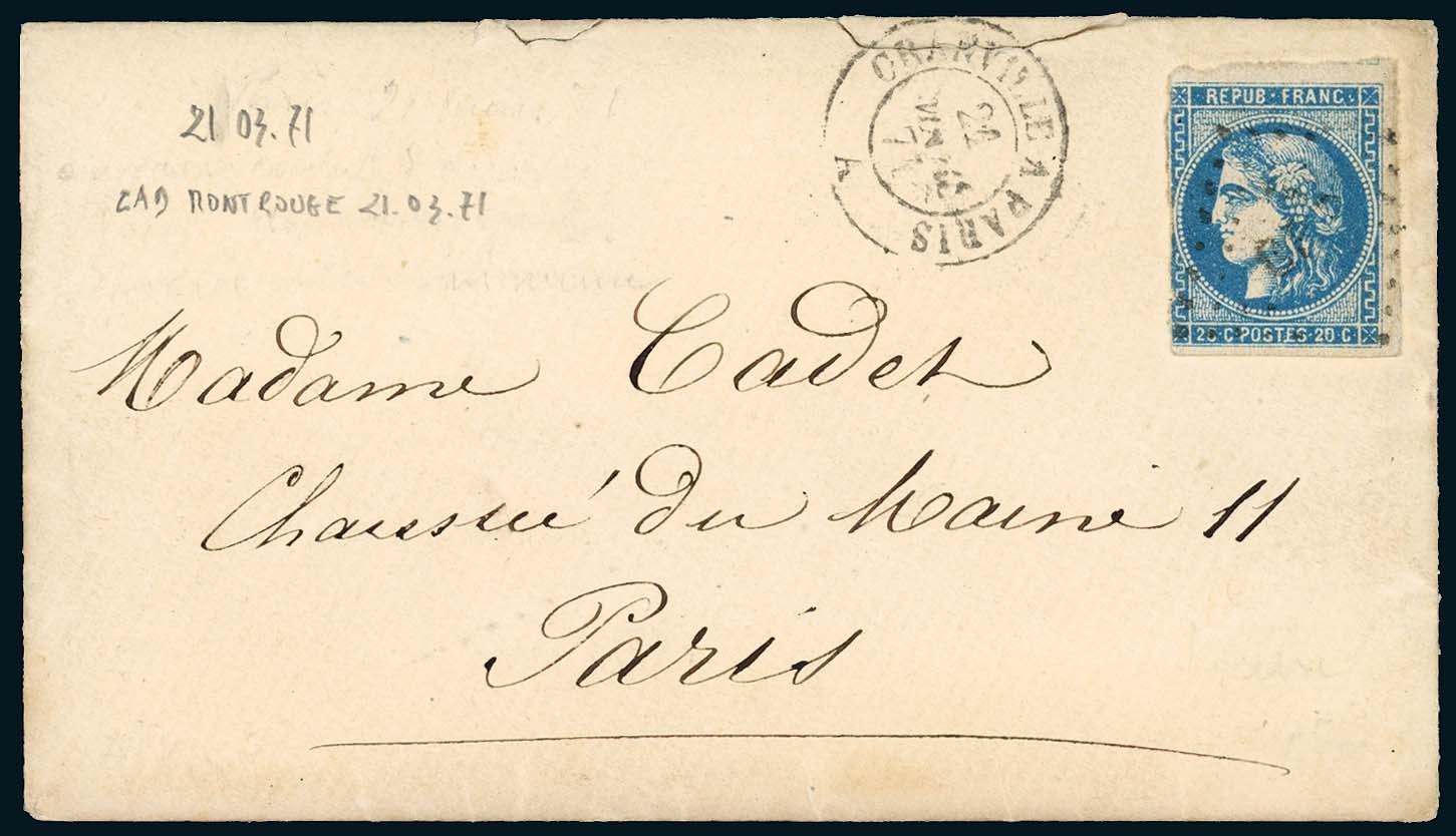 53 | N°3 OB C. MUTZIG sur enveloppe (légèrement consolidée) à destination de Paris avec C. PARIS au verso 1849 Utilisation très tardive du cachet à date pour oblitérer les timbres, signé Calves et Brun TB | 180 | 250 | 180 | enchérir | |