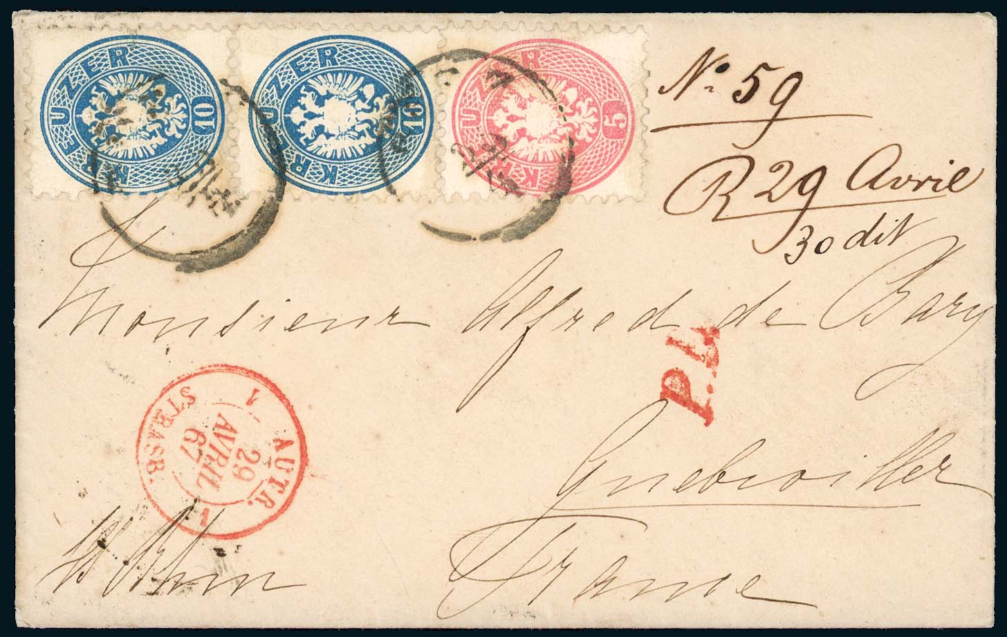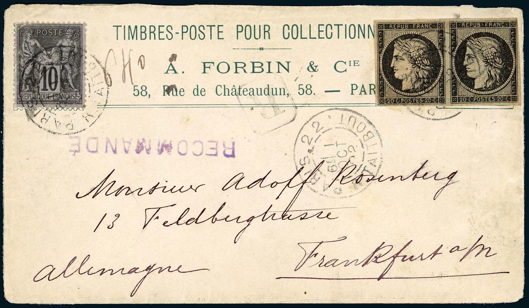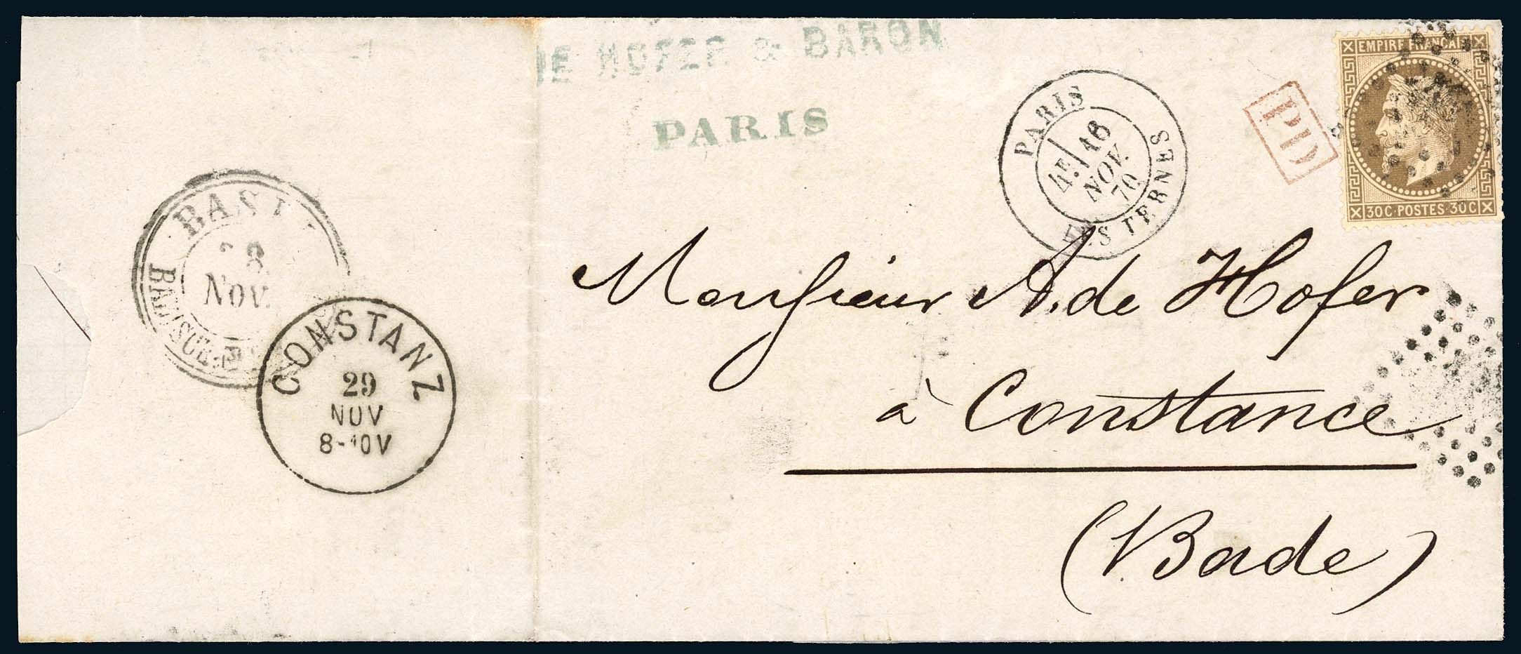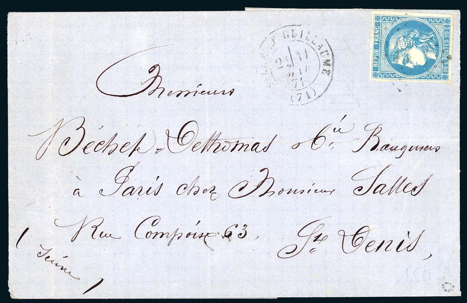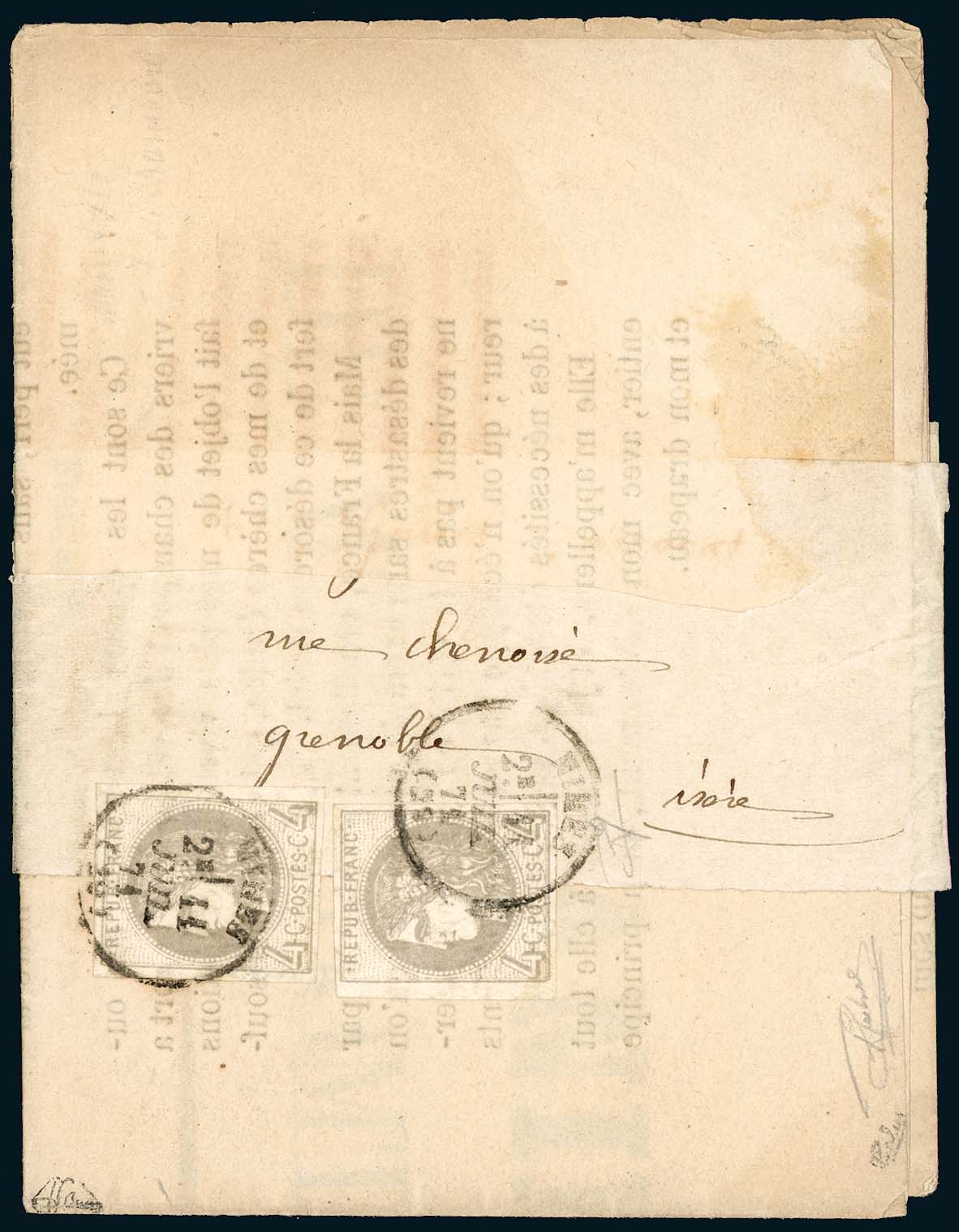 53 | N°3 OB C. MUTZIG sur enveloppe (légèrement consolidée) à destination de Paris avec C. PARIS au verso 1849 Utilisation très tardive du cachet à date pour oblitérer les timbres, signé Calves et Brun TB | 180 | 250 | 180 | enchérir | |