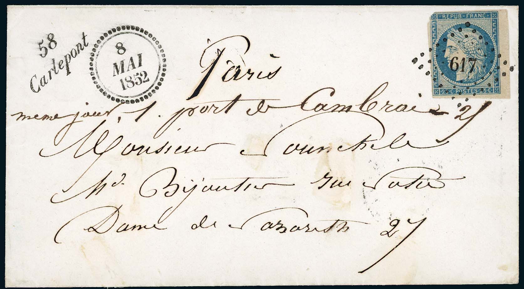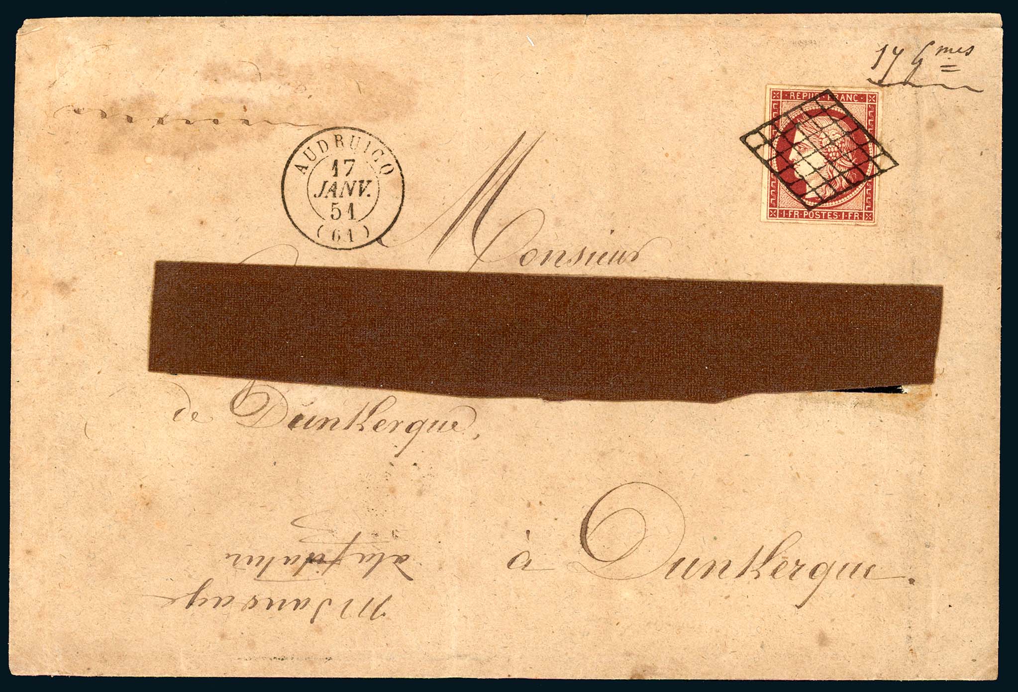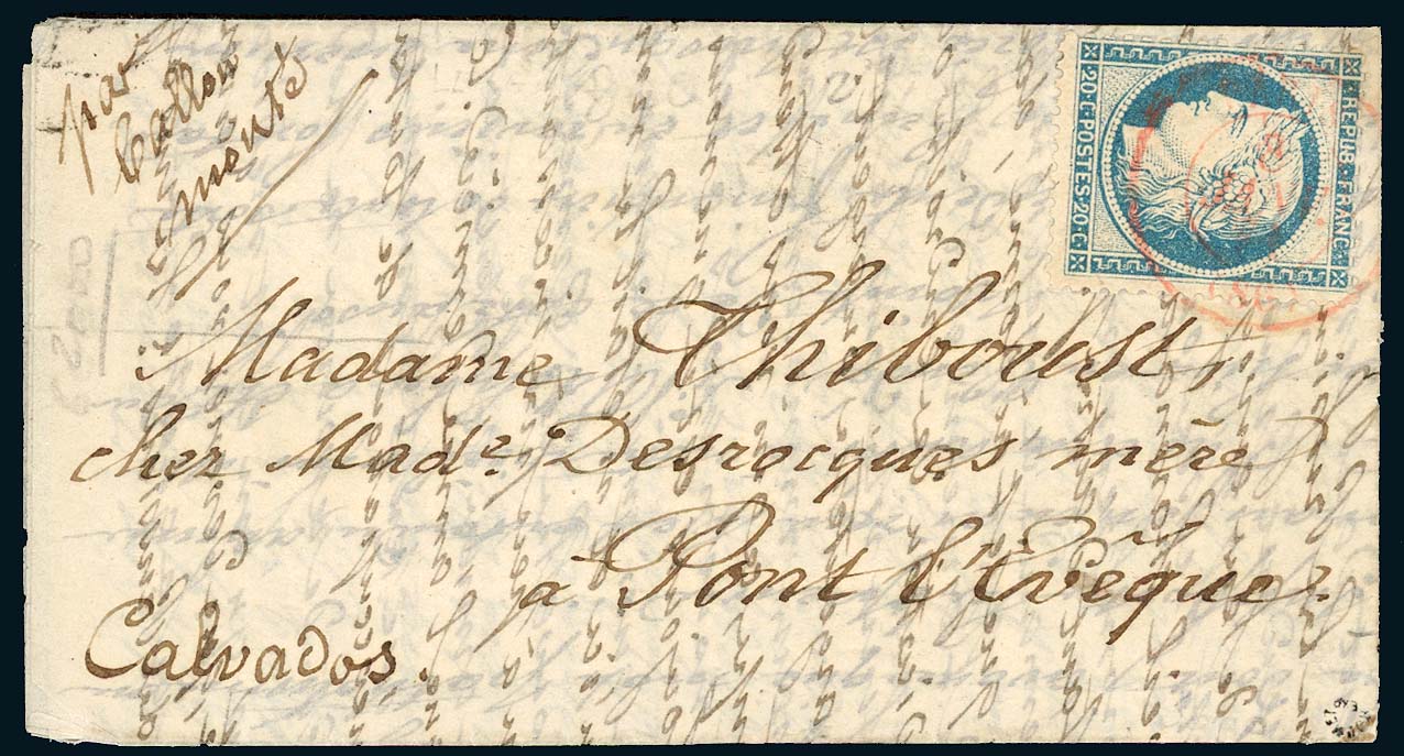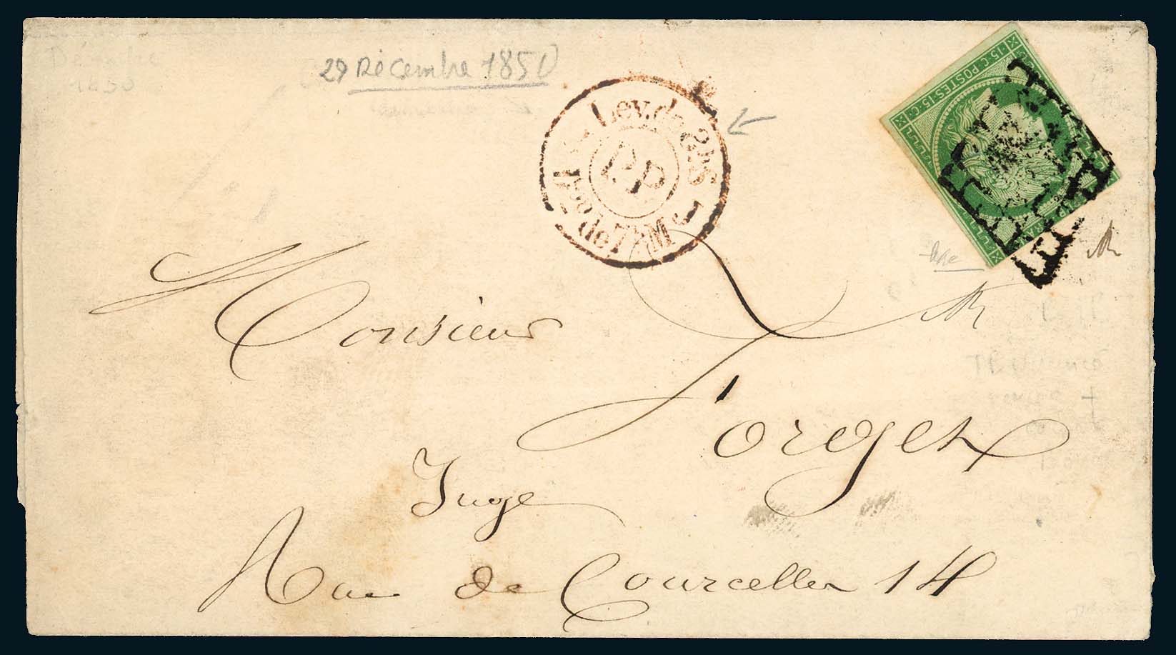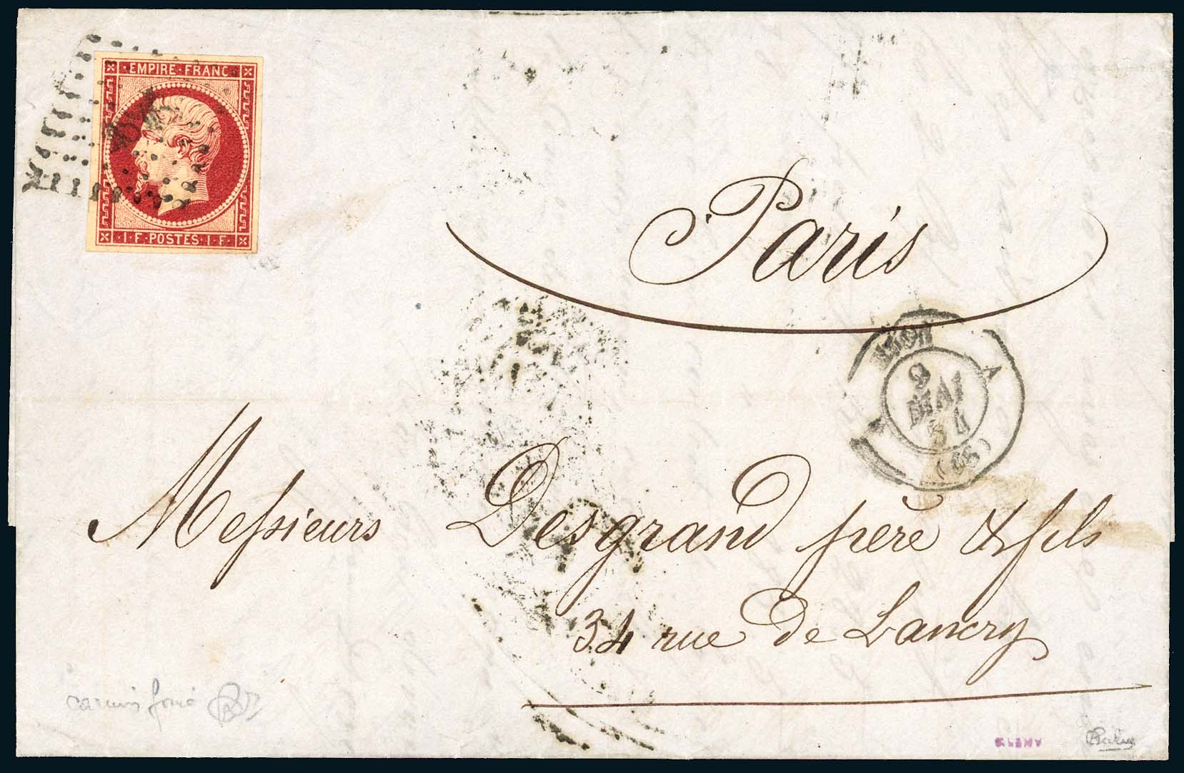32 | N°2 OB grille, C. BUREAU CENTRAL en rouge sur lettre locale avec C. PARIS et C. 2° LEVEE/11h/PARIS au verso 1851 Combinaison peu courante b:tb | 100 | 200 | 100 | enchérir | |