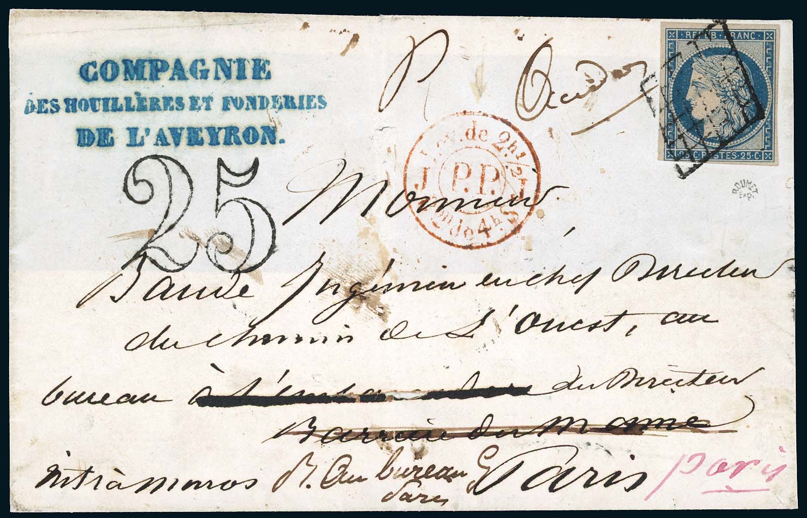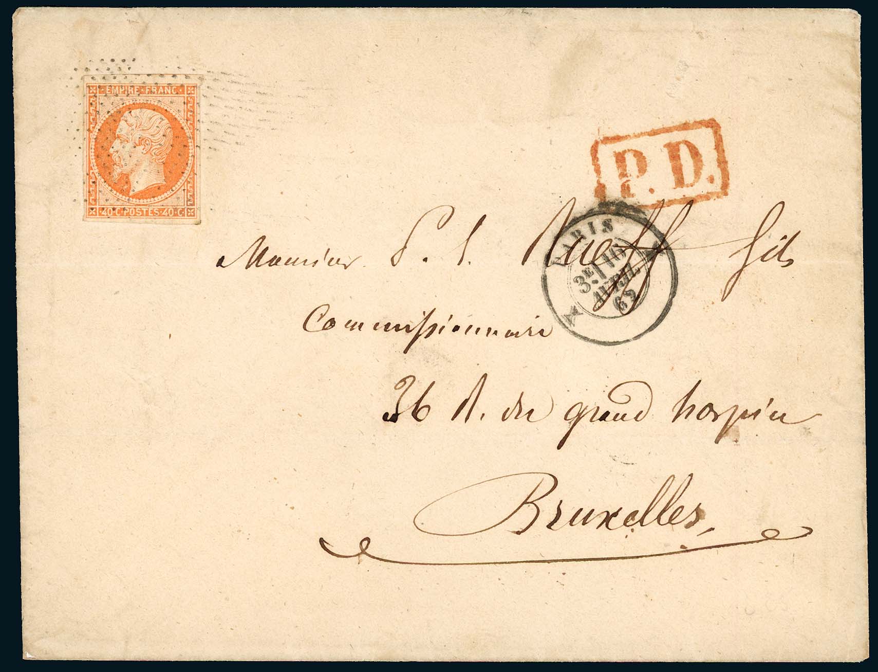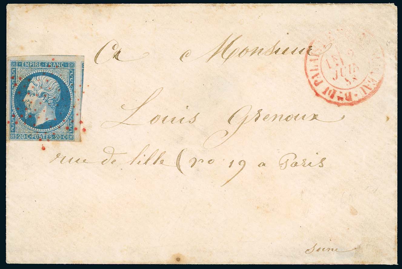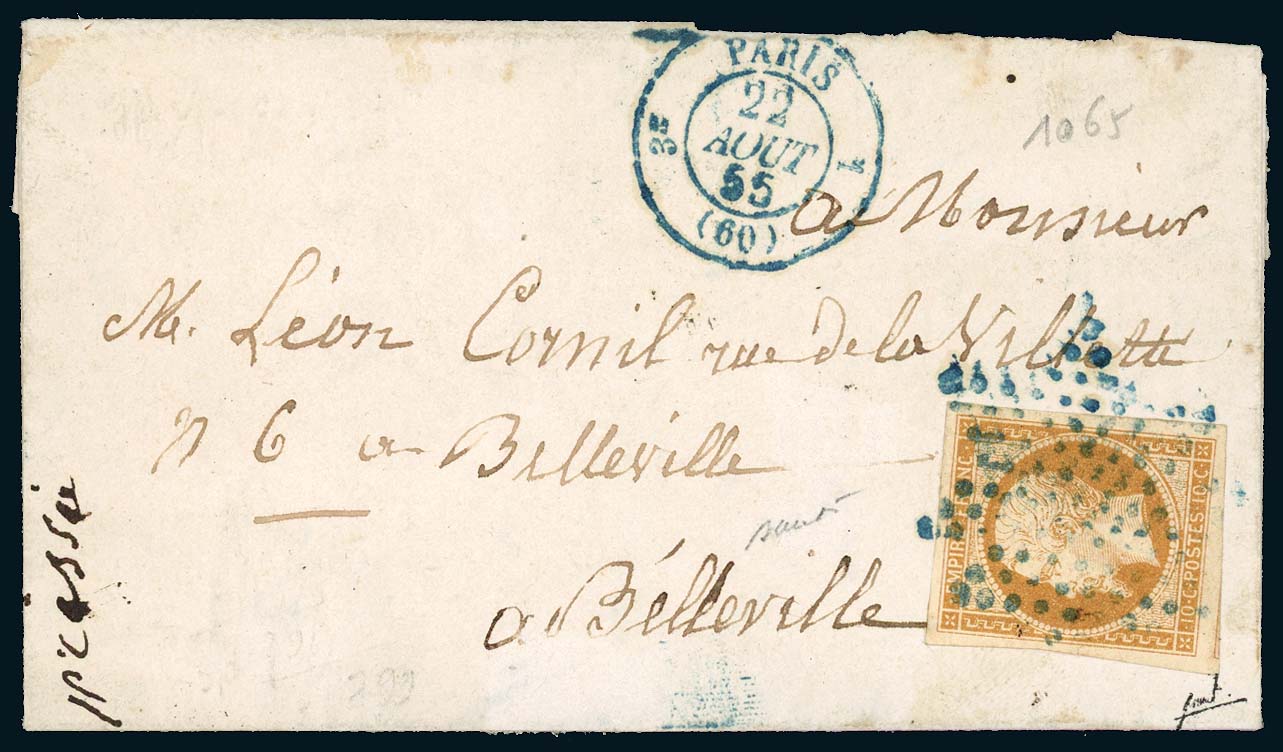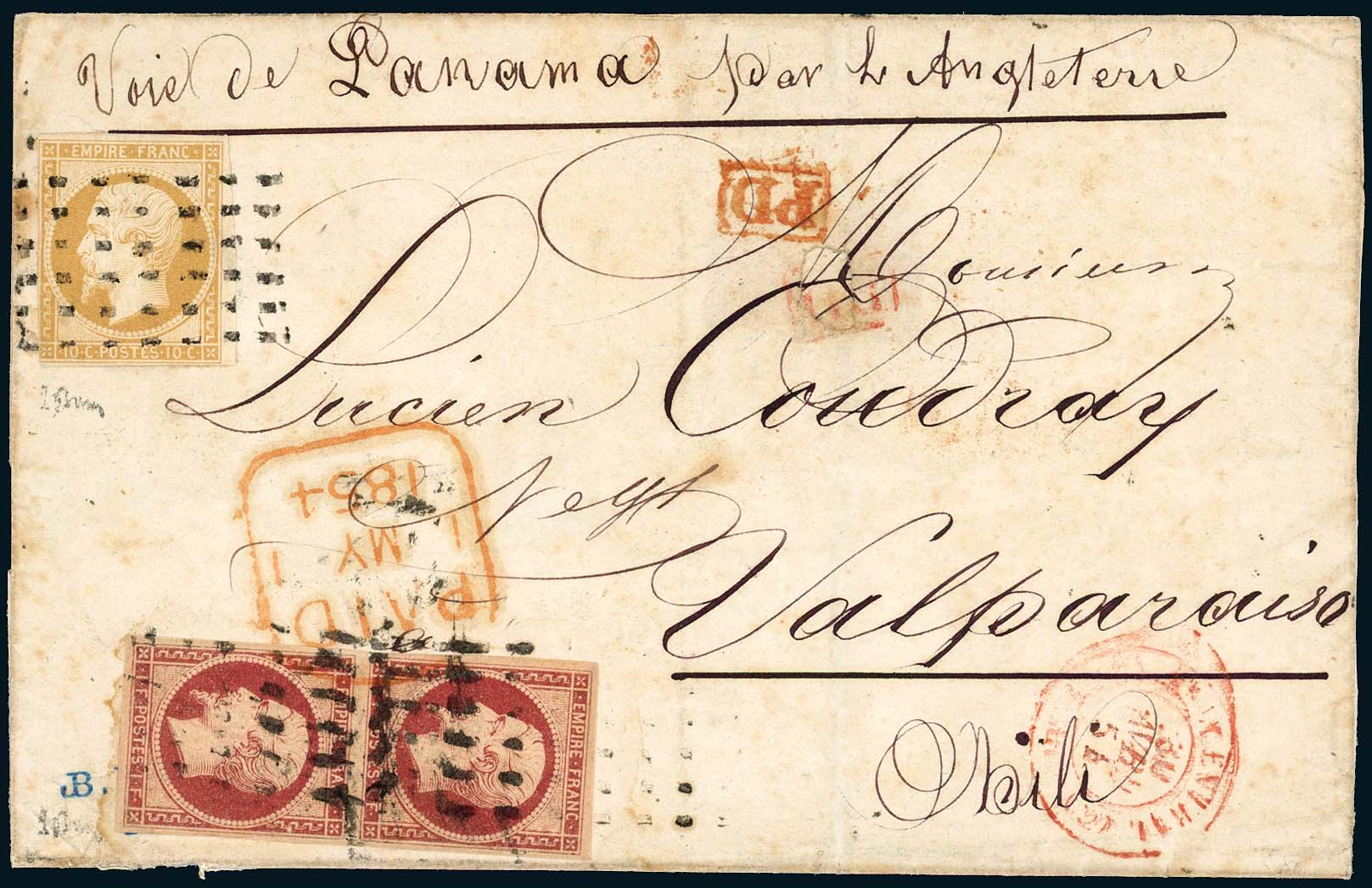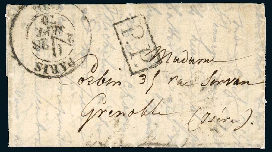 32 | N°2 OB grille, C. BUREAU CENTRAL en rouge sur lettre locale avec C. PARIS et C. 2° LEVEE/11h/PARIS au verso 1851 Combinaison peu courante b:tb | 100 | 200 | 100 | enchérir | |