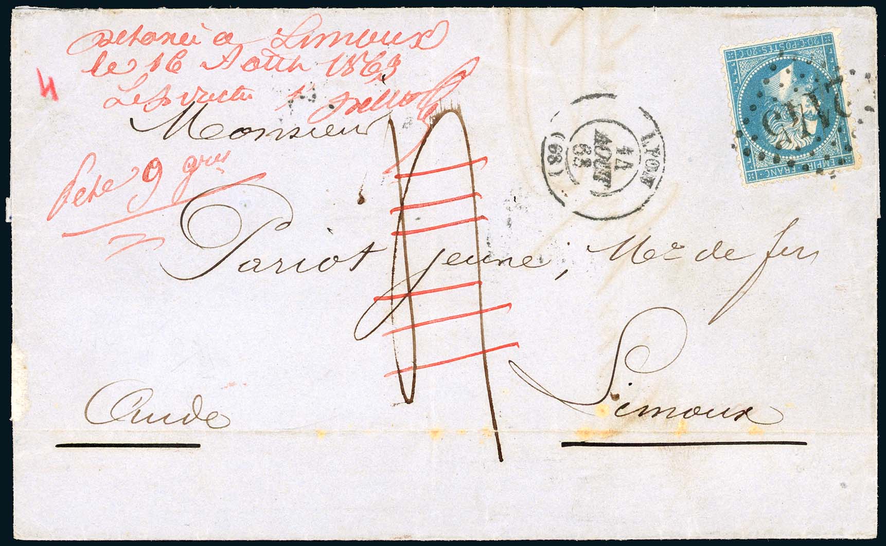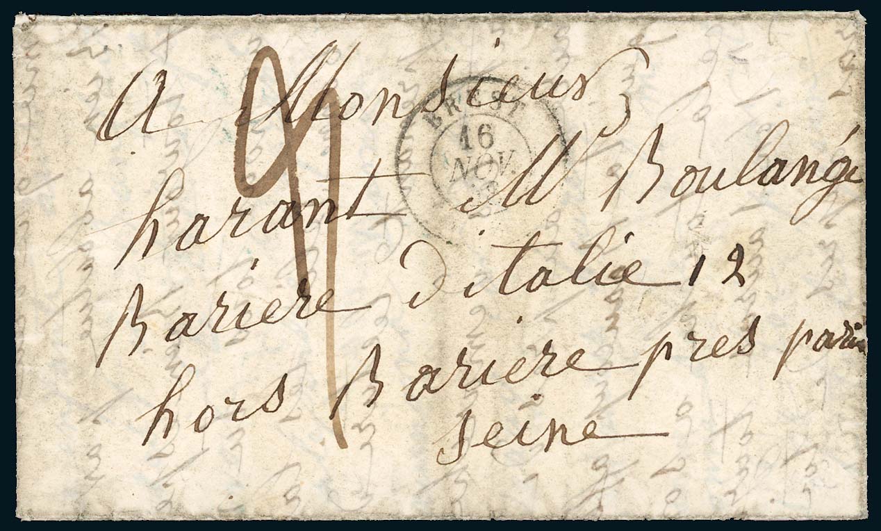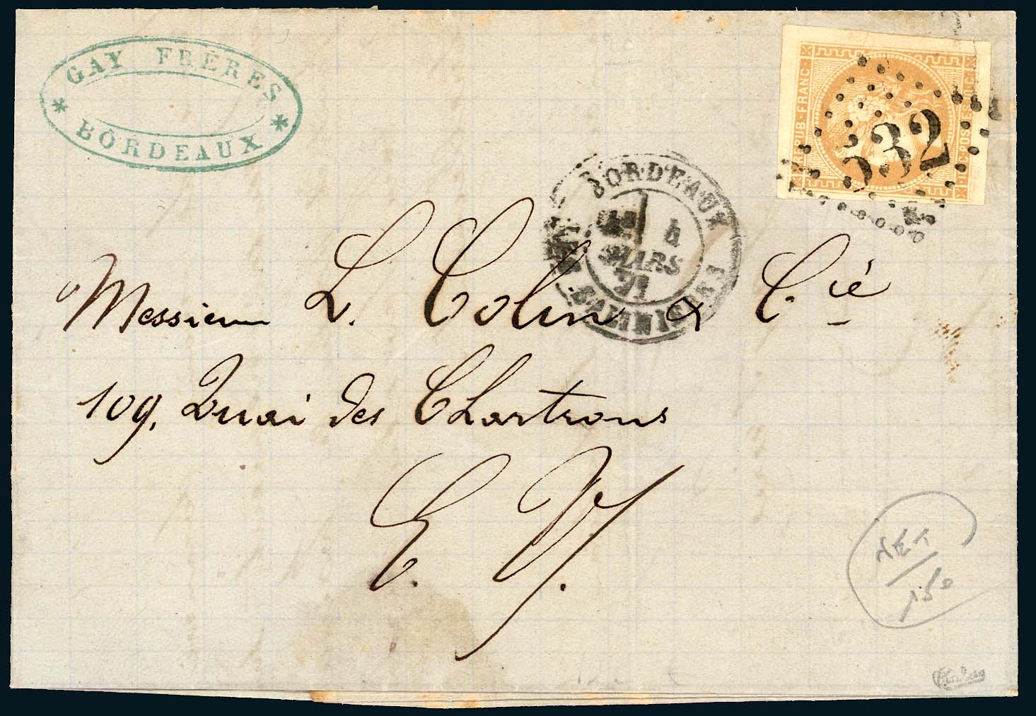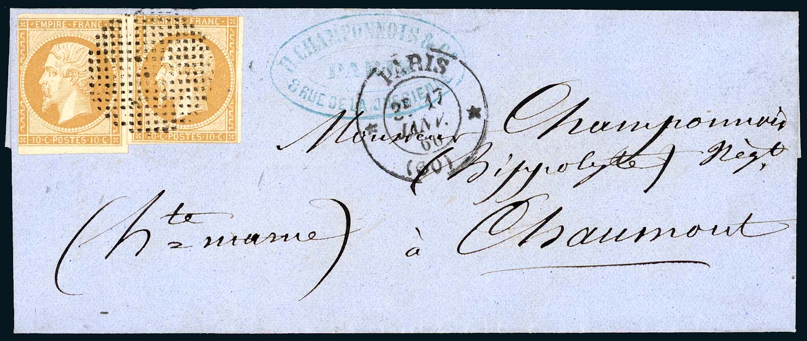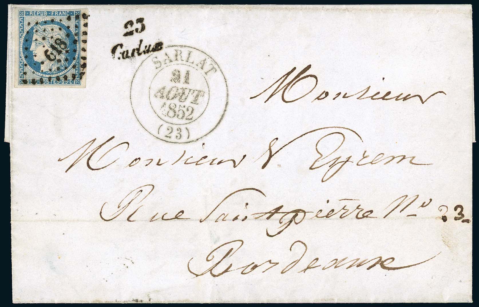 32 | N°2 OB grille, C. BUREAU CENTRAL en rouge sur lettre locale avec C. PARIS et C. 2° LEVEE/11h/PARIS au verso 1851 Combinaison peu courante b:tb | 100 | 200 | 100 | enchérir | |
