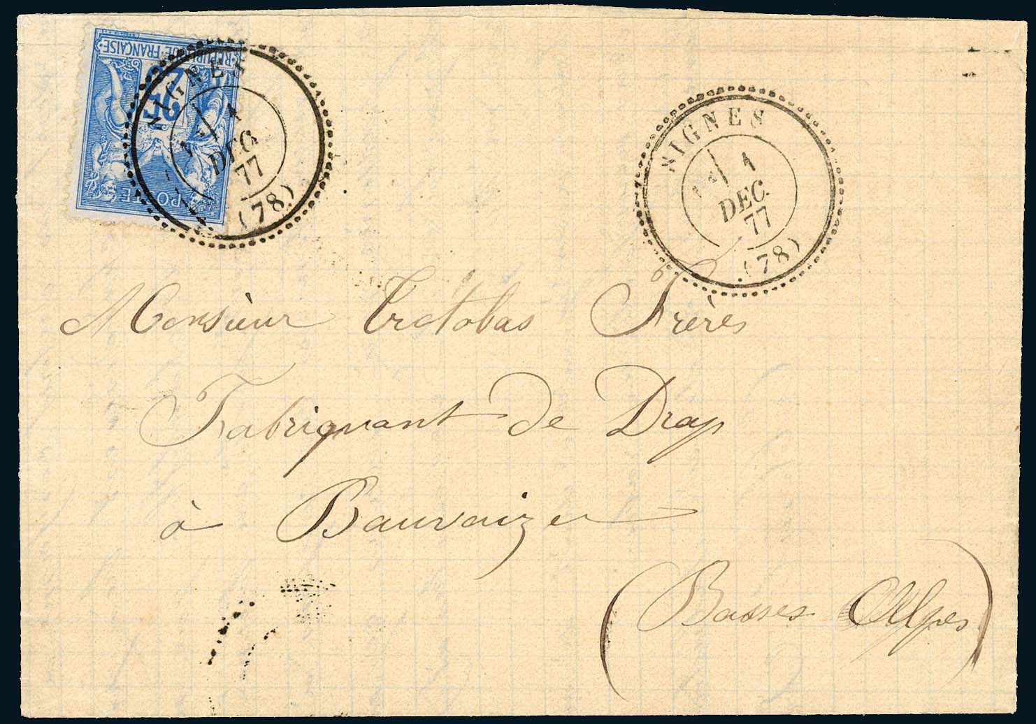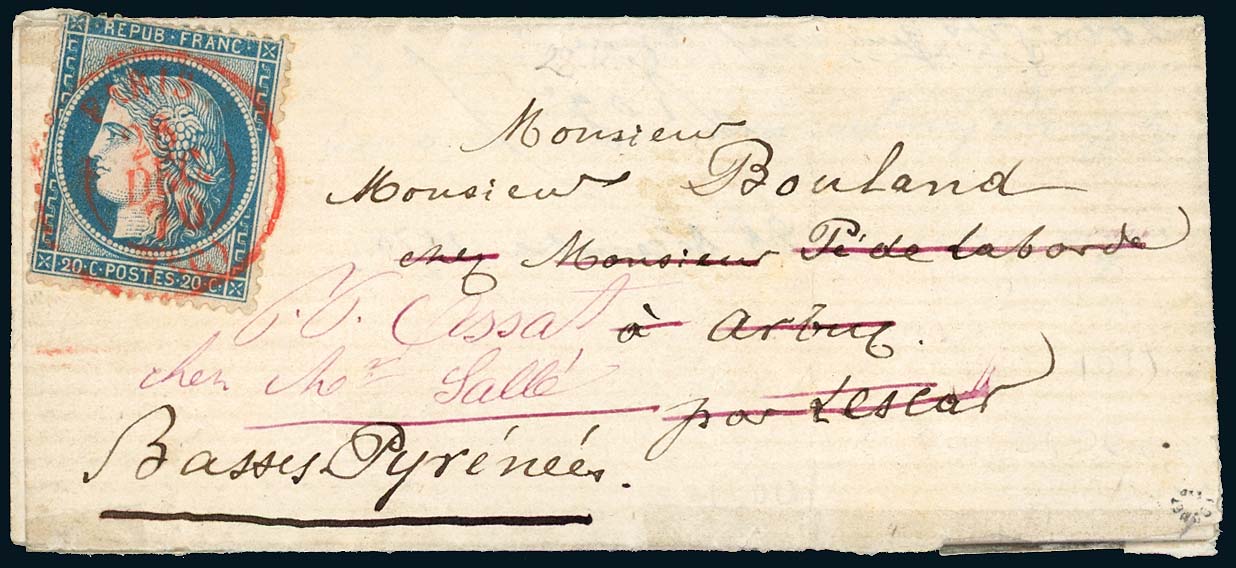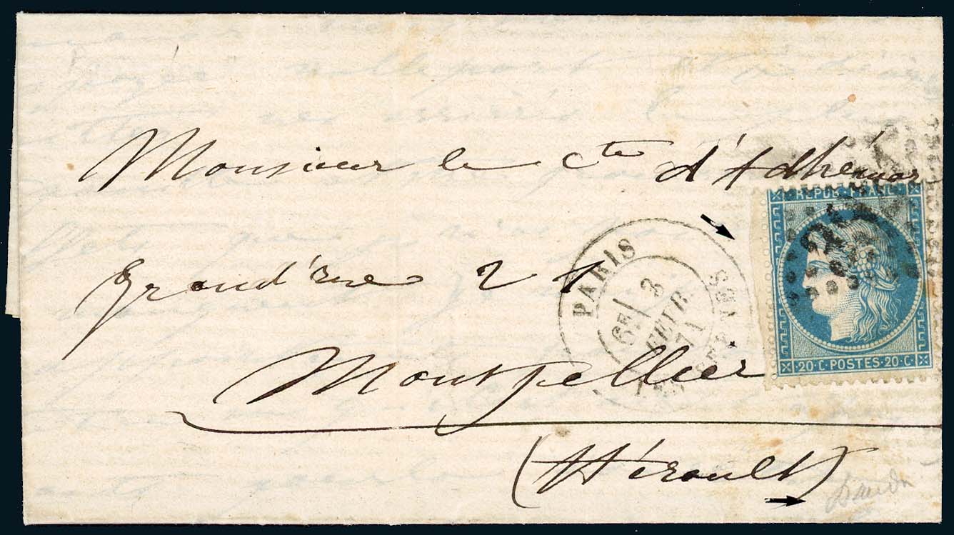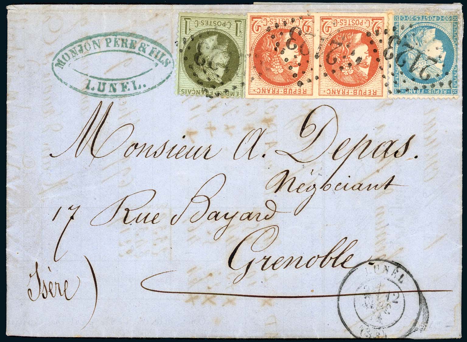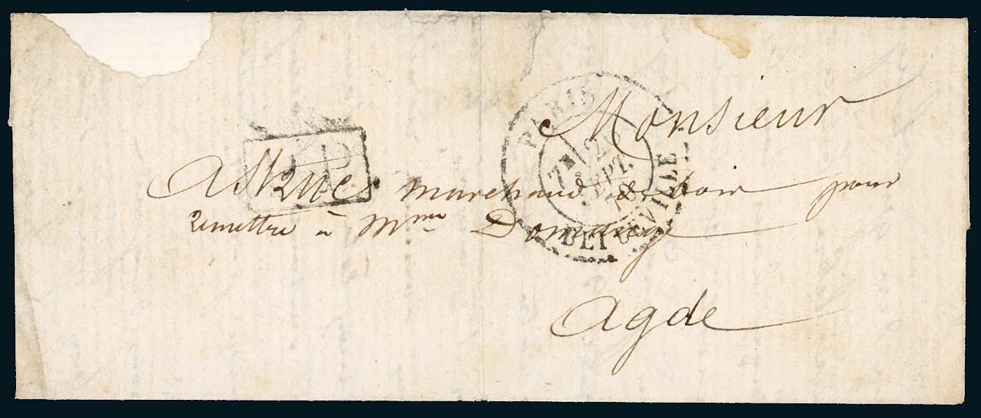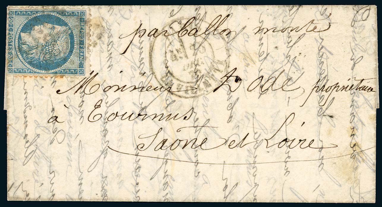 73 | N°3 OB grille sur lettre de Montpellier pour Signant en Camargue avec cursive 12/Albaron (superbe) au verso 1850 TB | 150 | 300 | 150 | enchérir | |