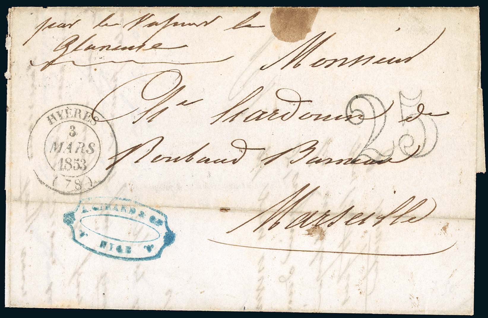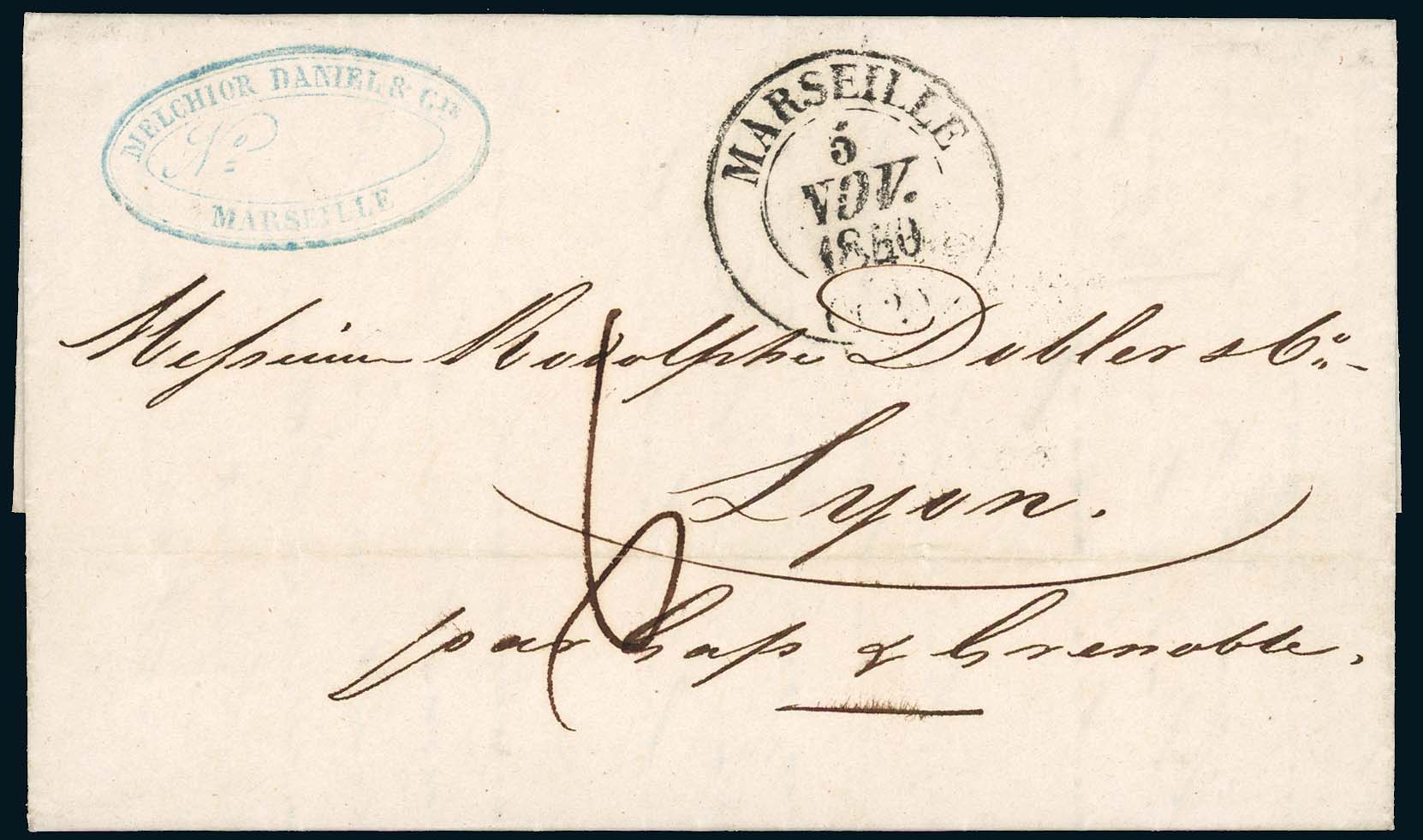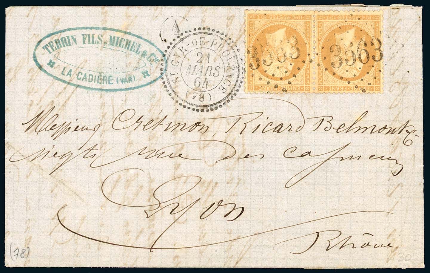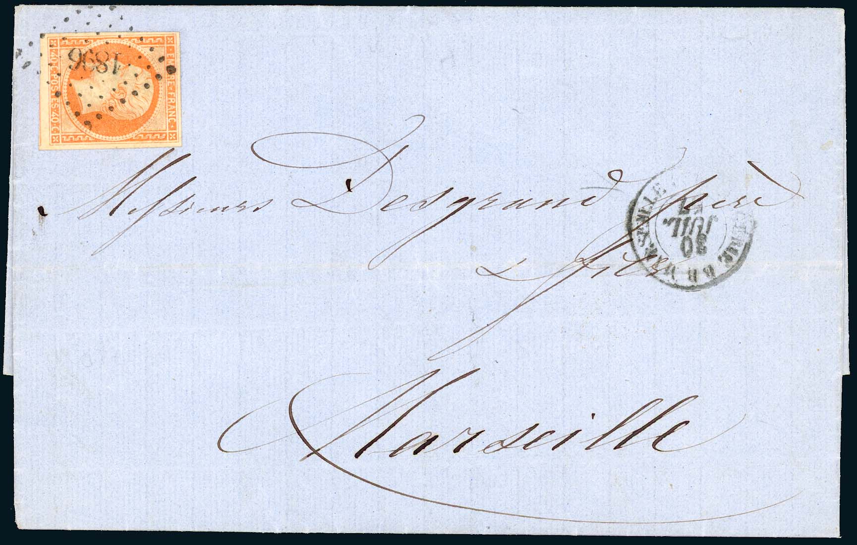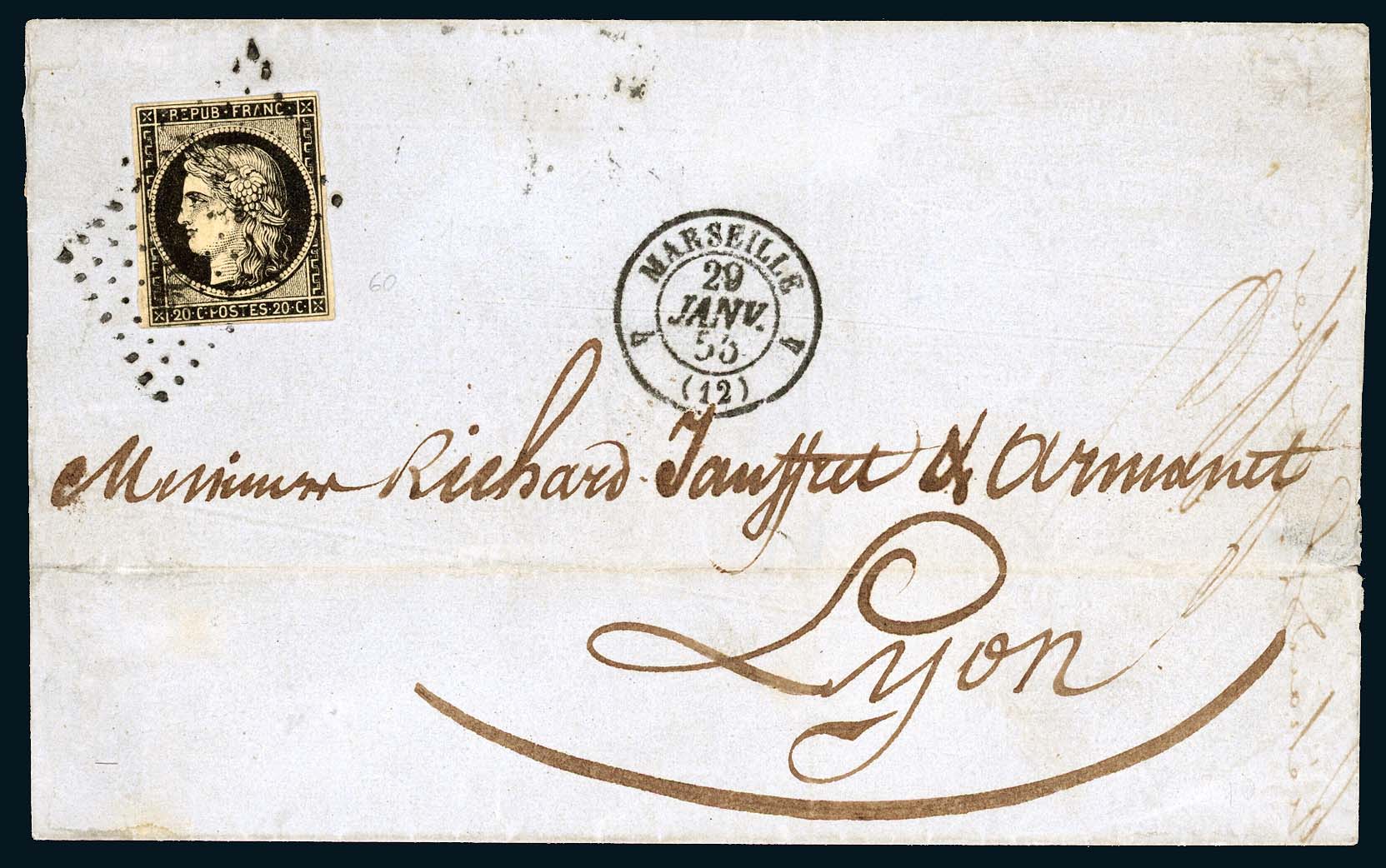 54 | N°3 OB PC 1896 sur lettre de Marseille pour Lyon (ex. Dubus) 29 janvier 1855 TB | 1250 | 1750 | 1250 | enchérir | |