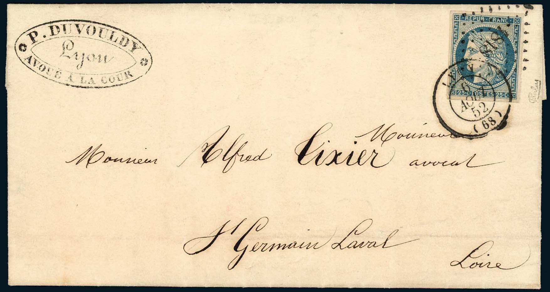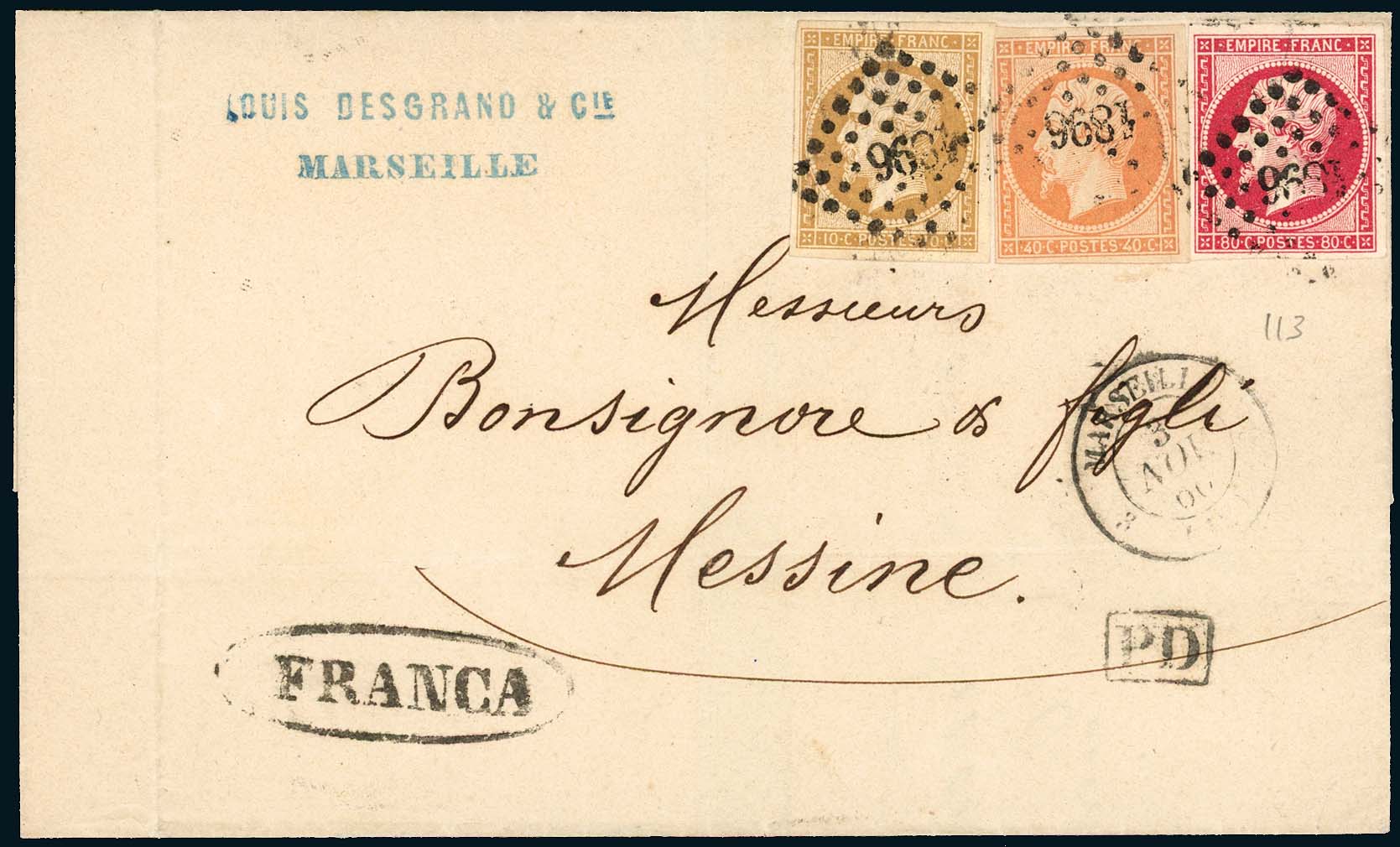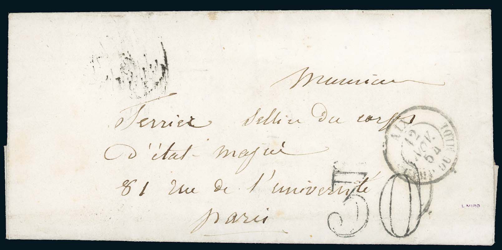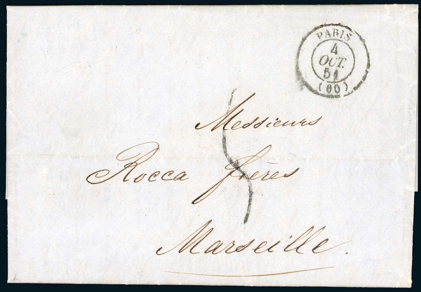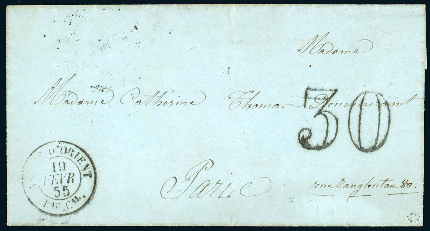 54 | N°3 OB PC 1896 sur lettre de Marseille pour Lyon (ex. Dubus) 29 janvier 1855 TB | 1250 | 1750 | 1250 | enchérir | |