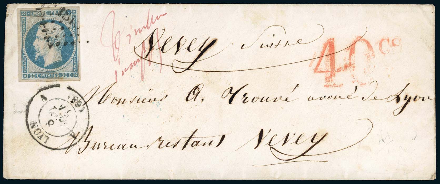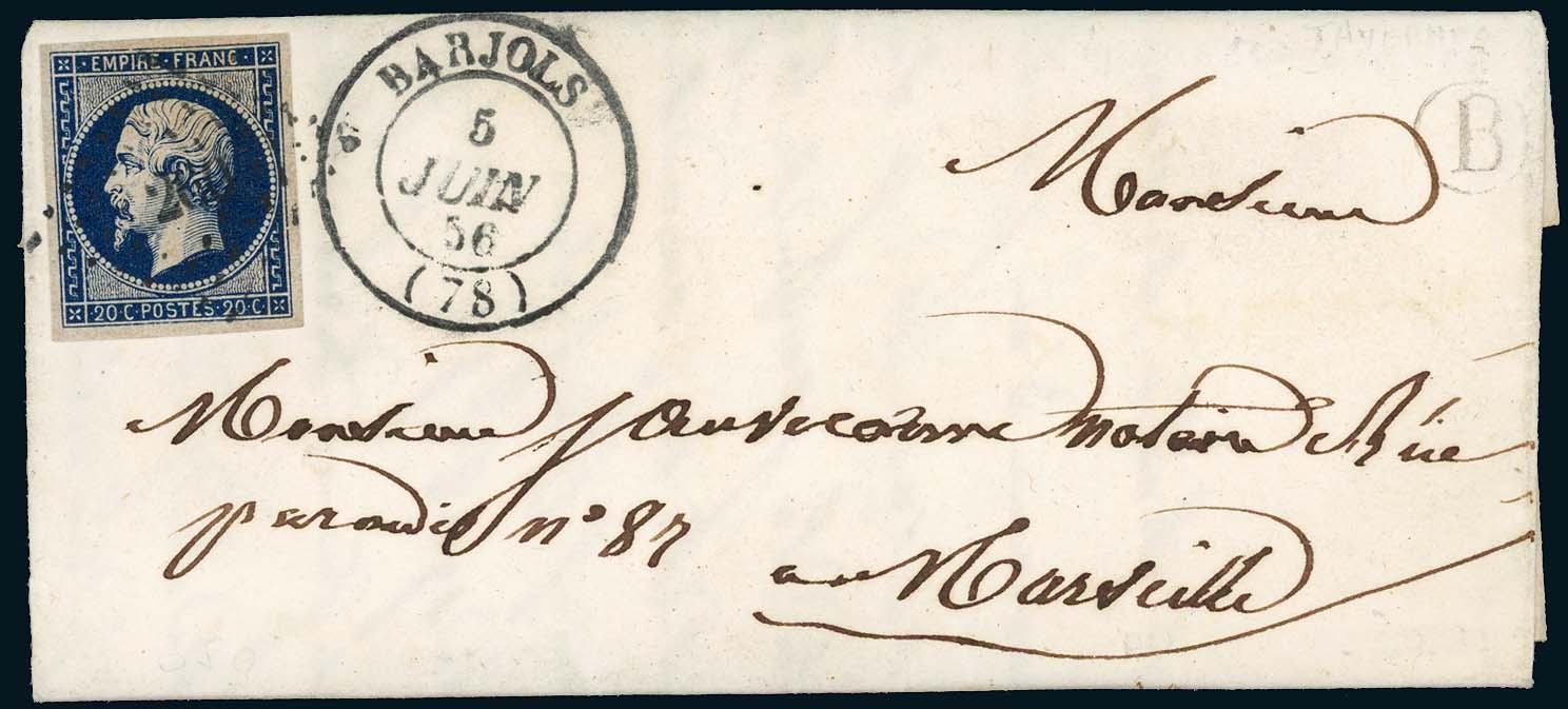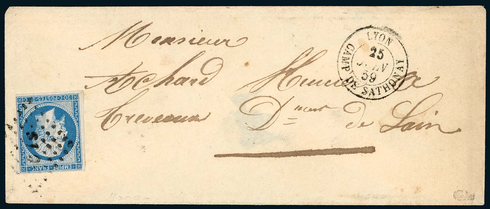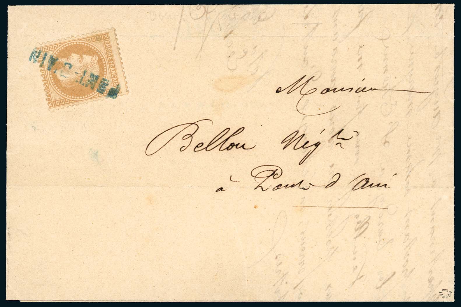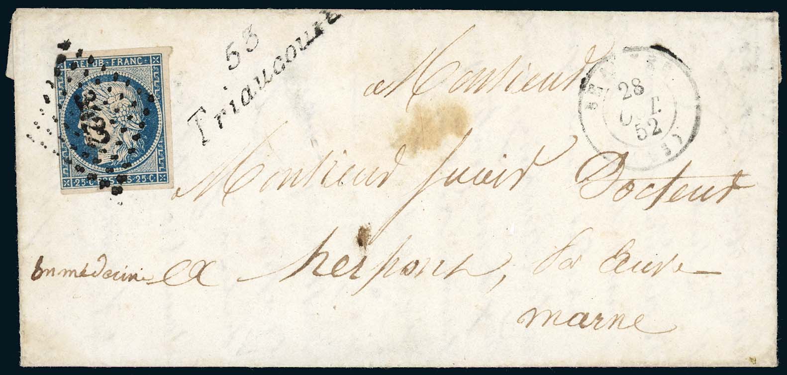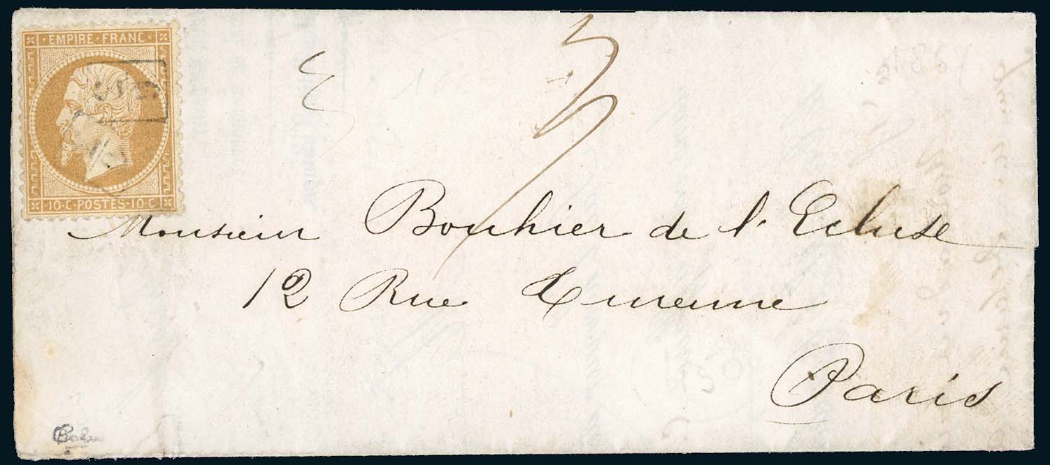 54 | N°3 OB PC 1896 sur lettre de Marseille pour Lyon (ex. Dubus) 29 janvier 1855 TB | 1250 | 1750 | 1250 | enchérir | |