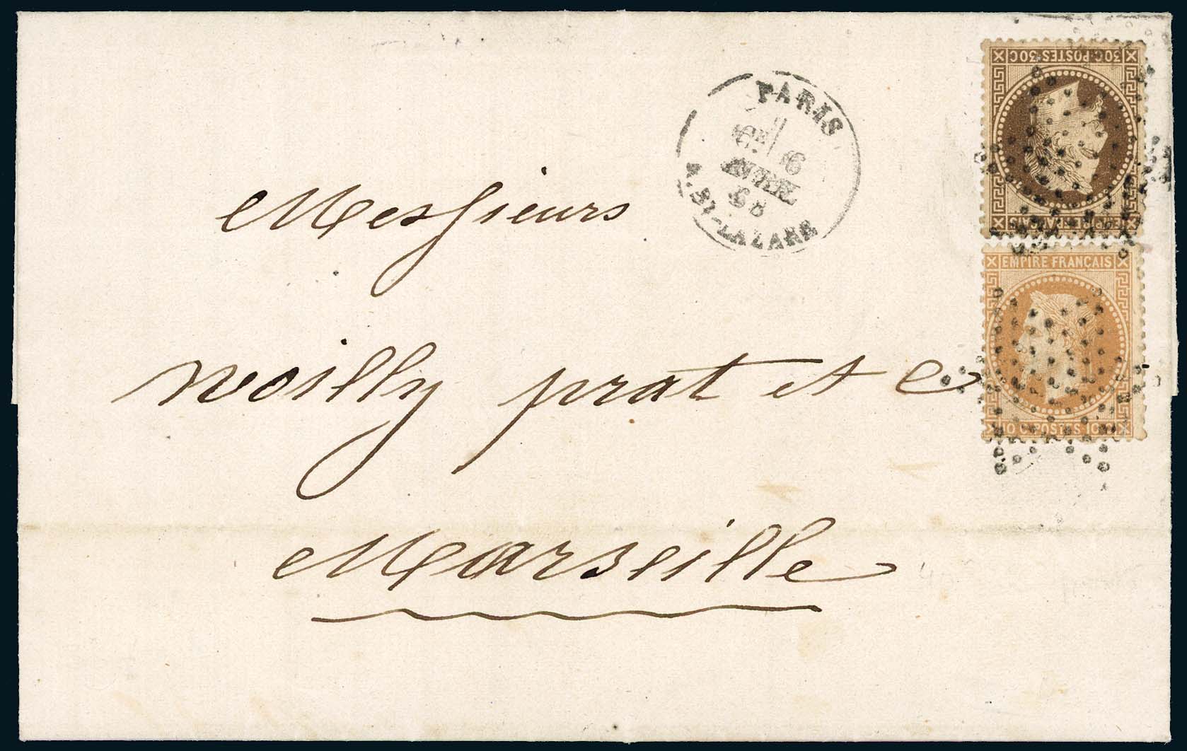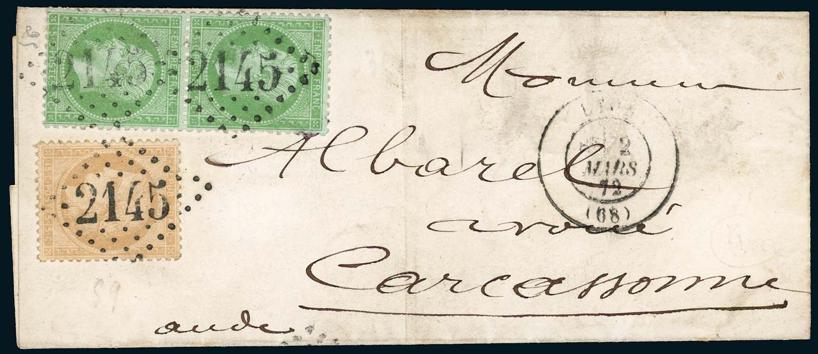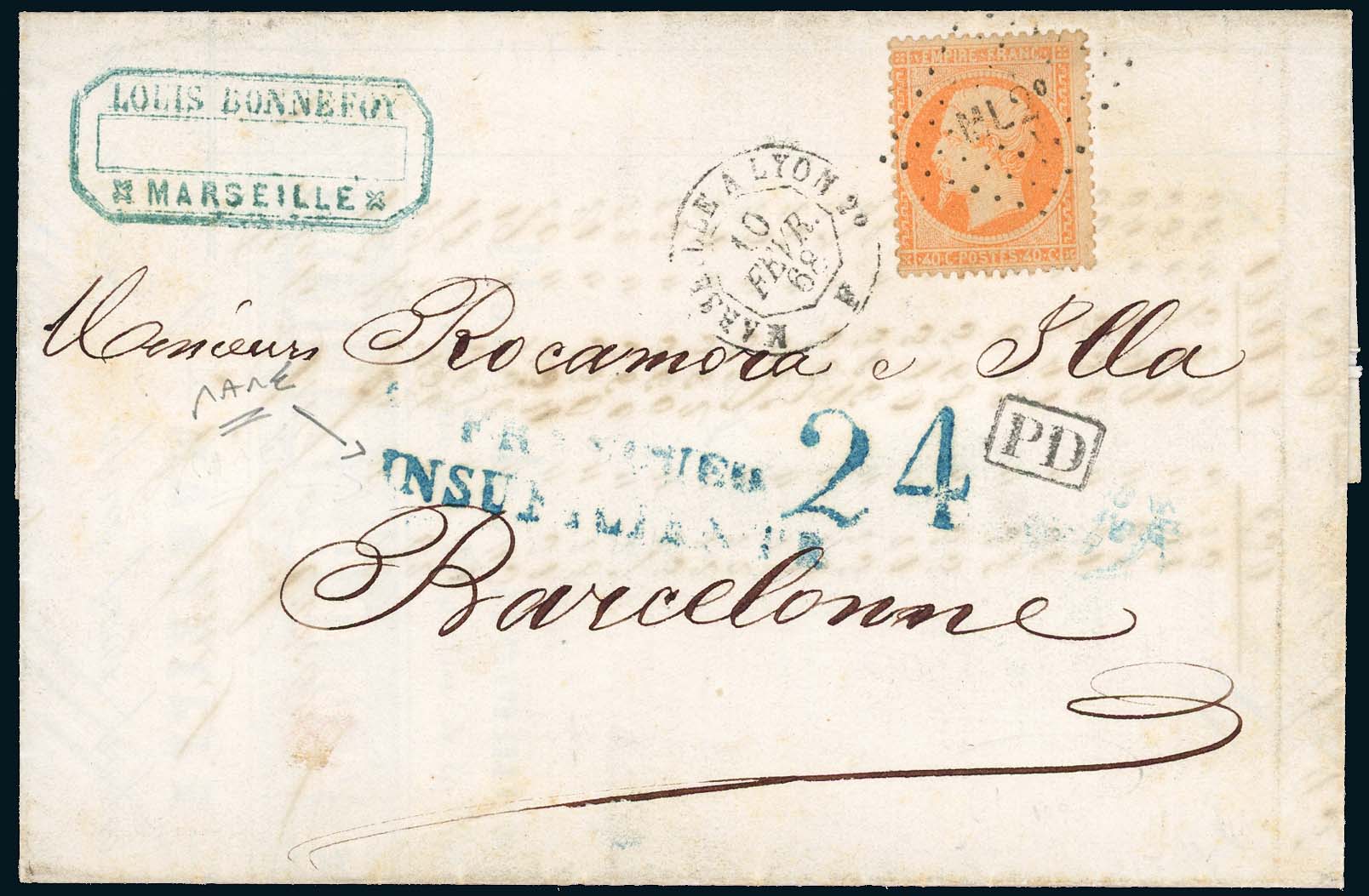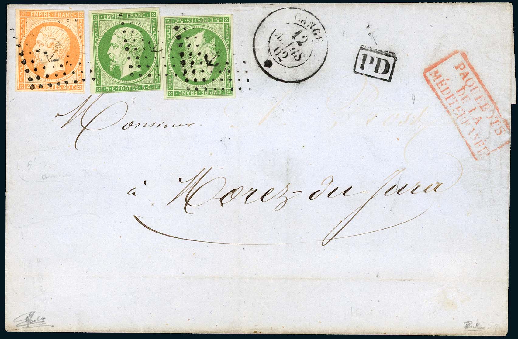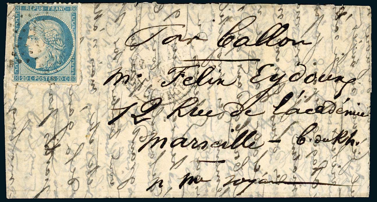 54 | N°3 OB PC 1896 sur lettre de Marseille pour Lyon (ex. Dubus) 29 janvier 1855 TB | 1250 | 1750 | 1250 | enchérir | |