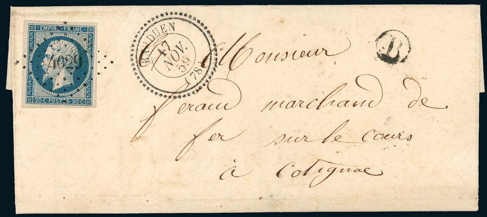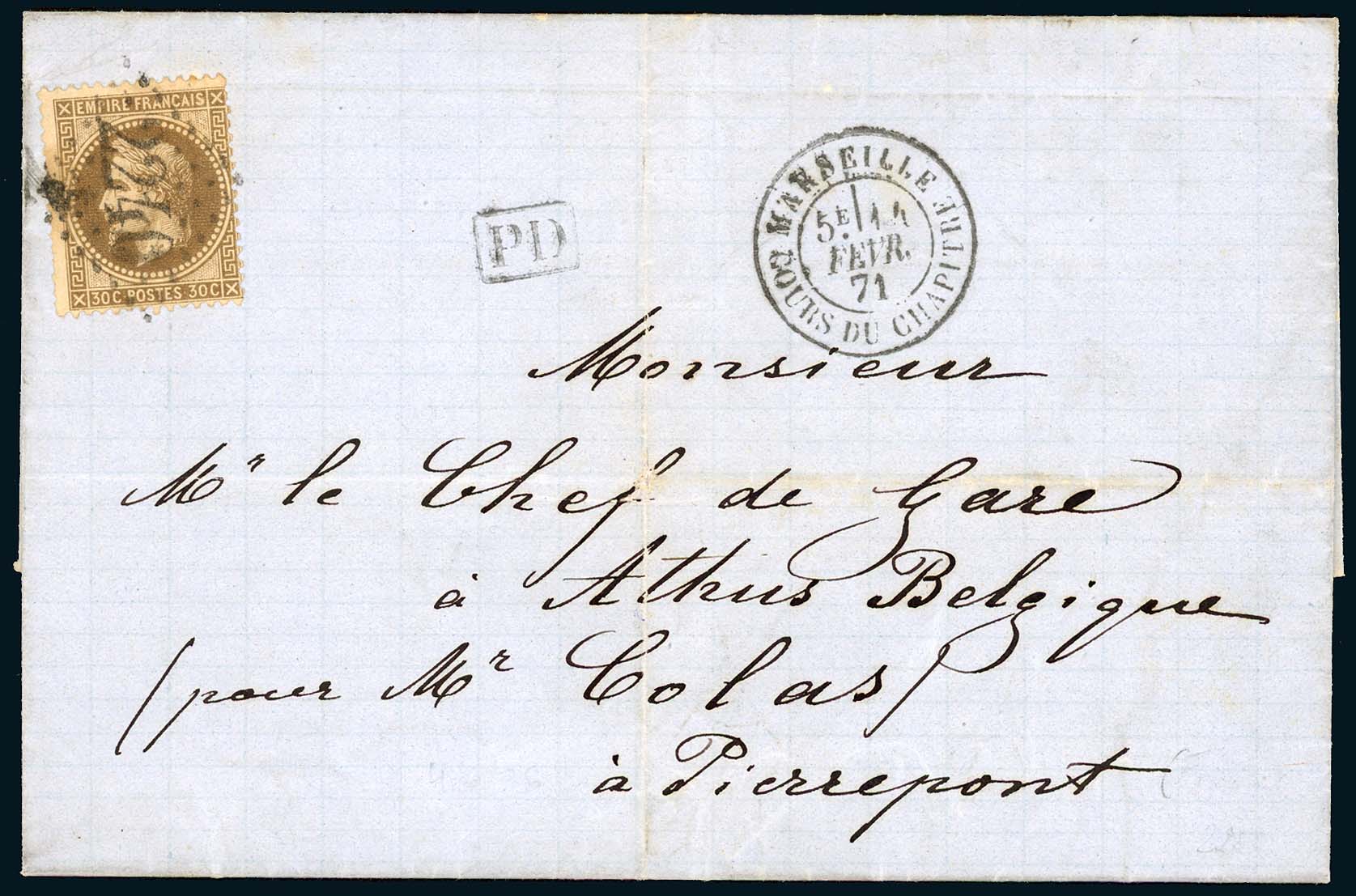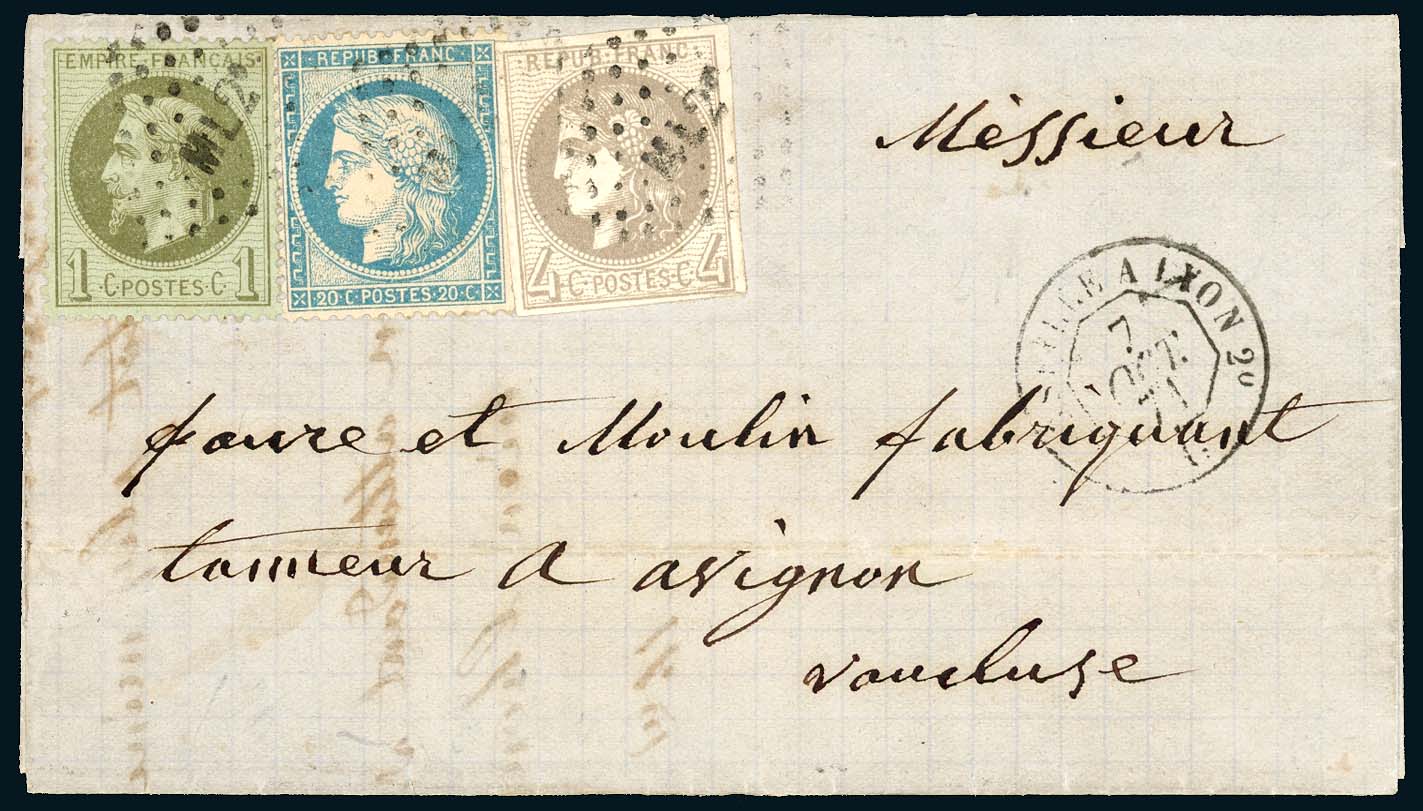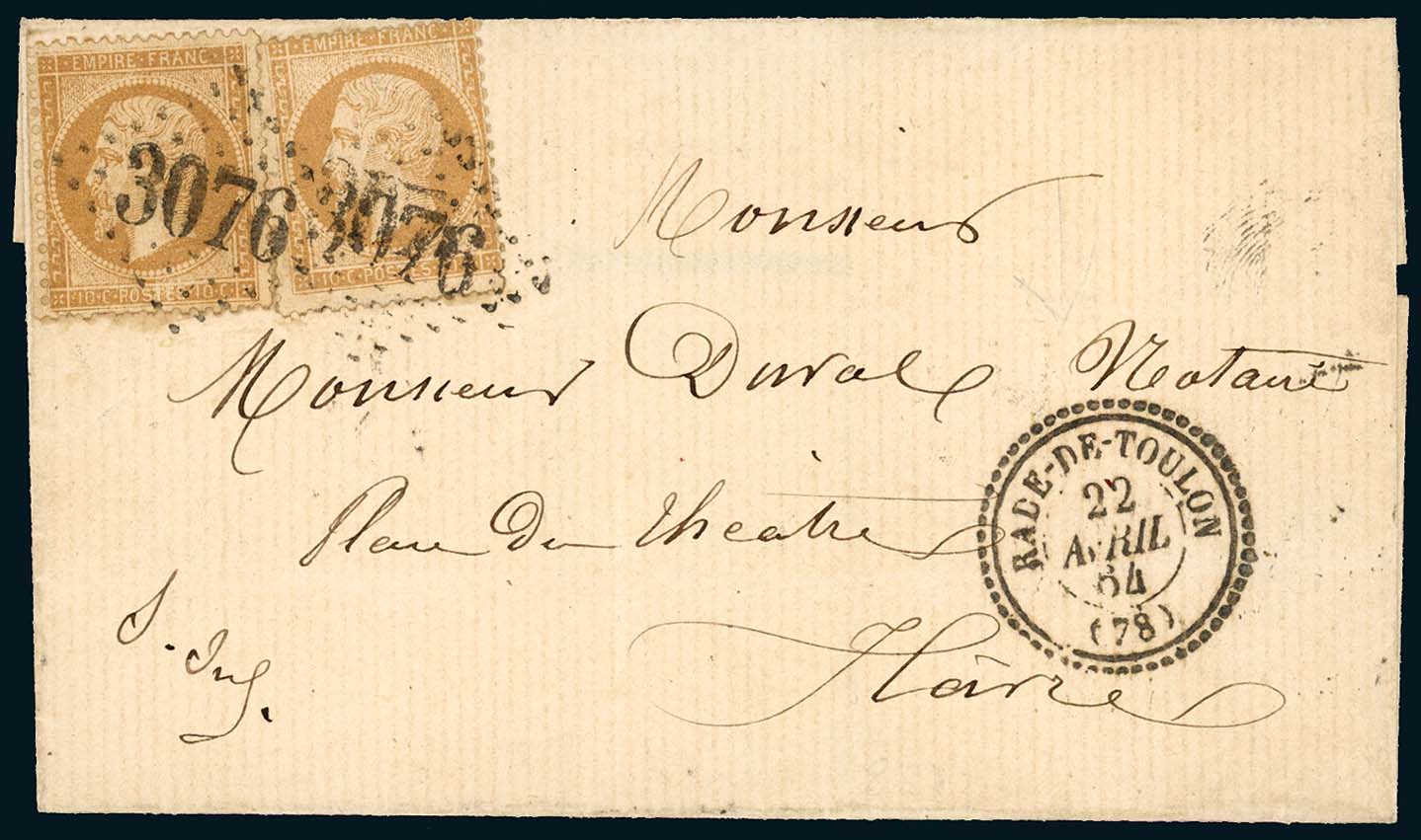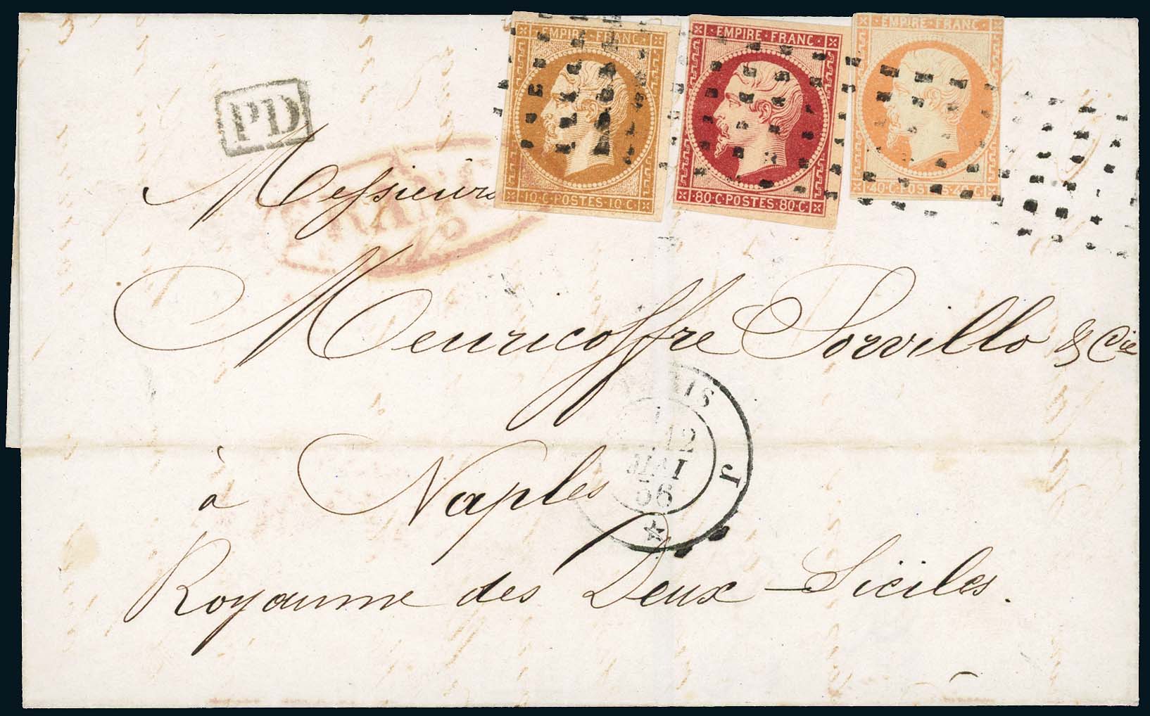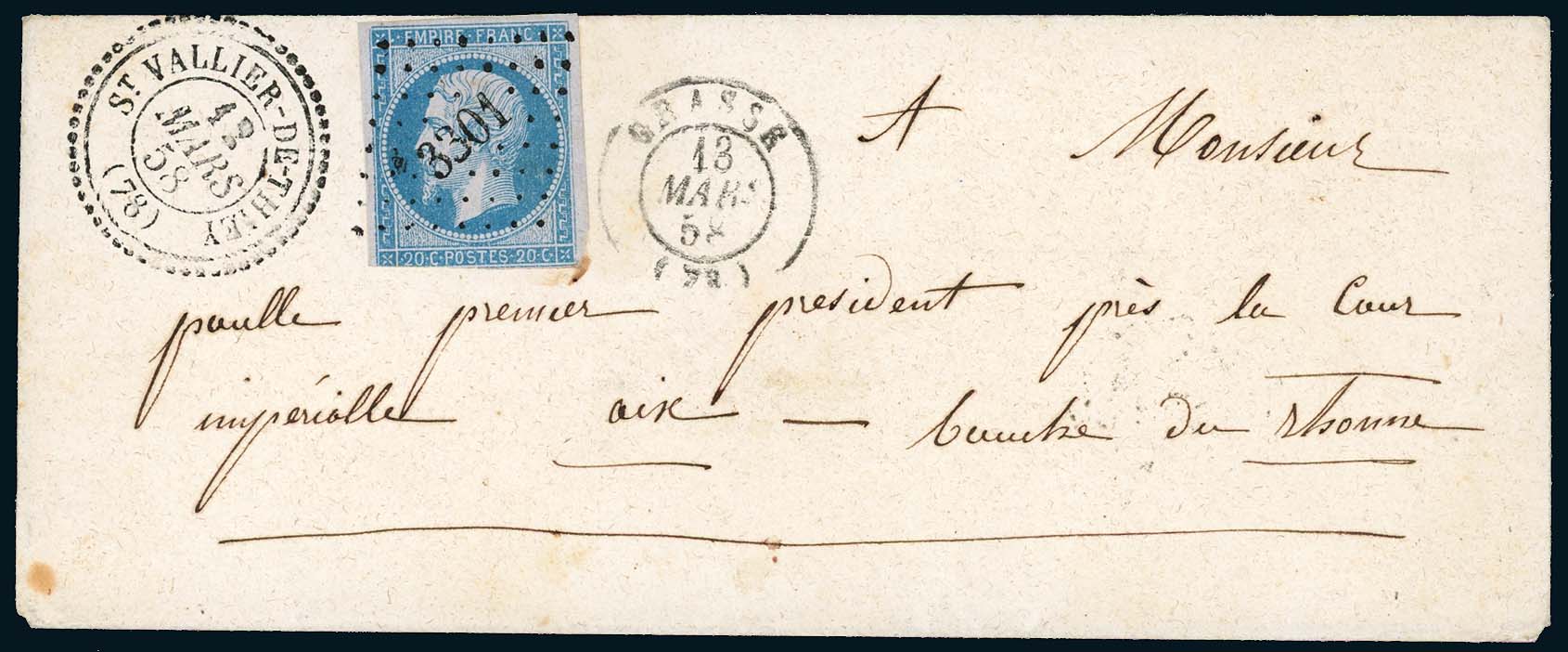 54 | N°3 OB PC 1896 sur lettre de Marseille pour Lyon (ex. Dubus) 29 janvier 1855 TB | 1250 | 1750 | 1250 | enchérir | |