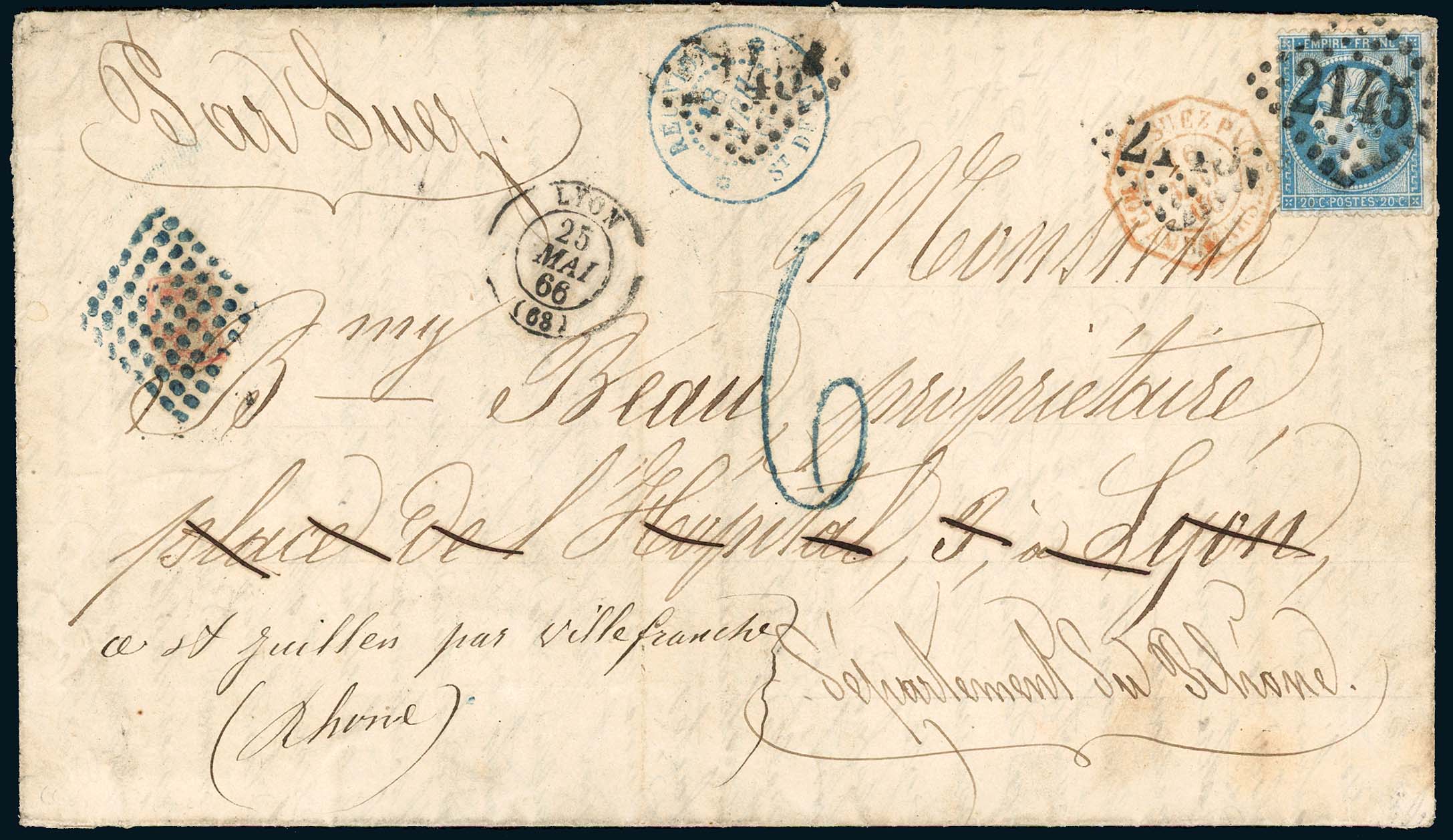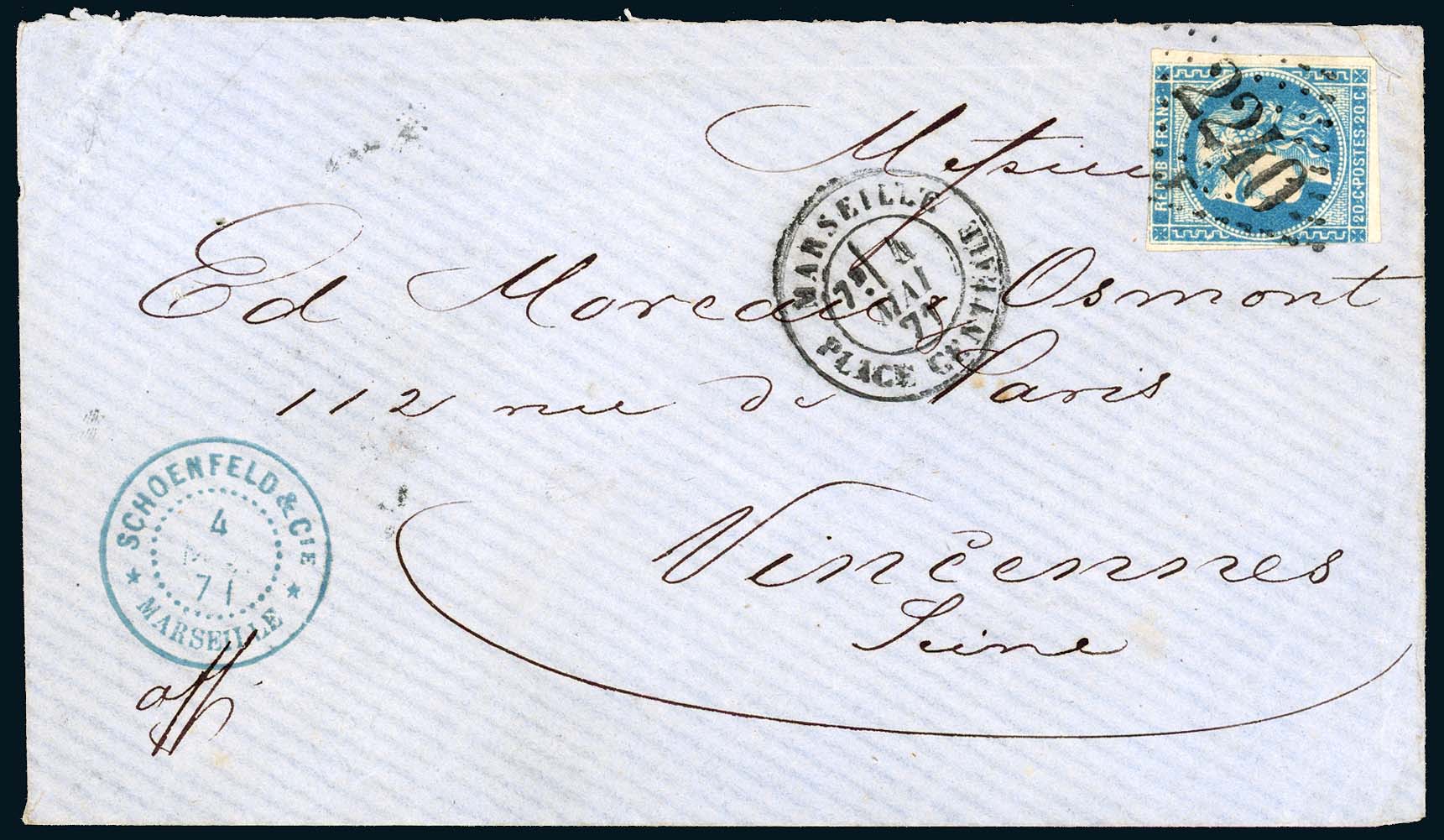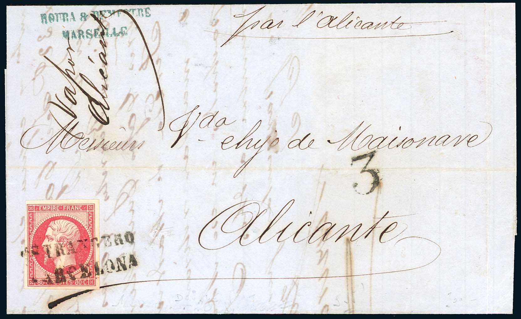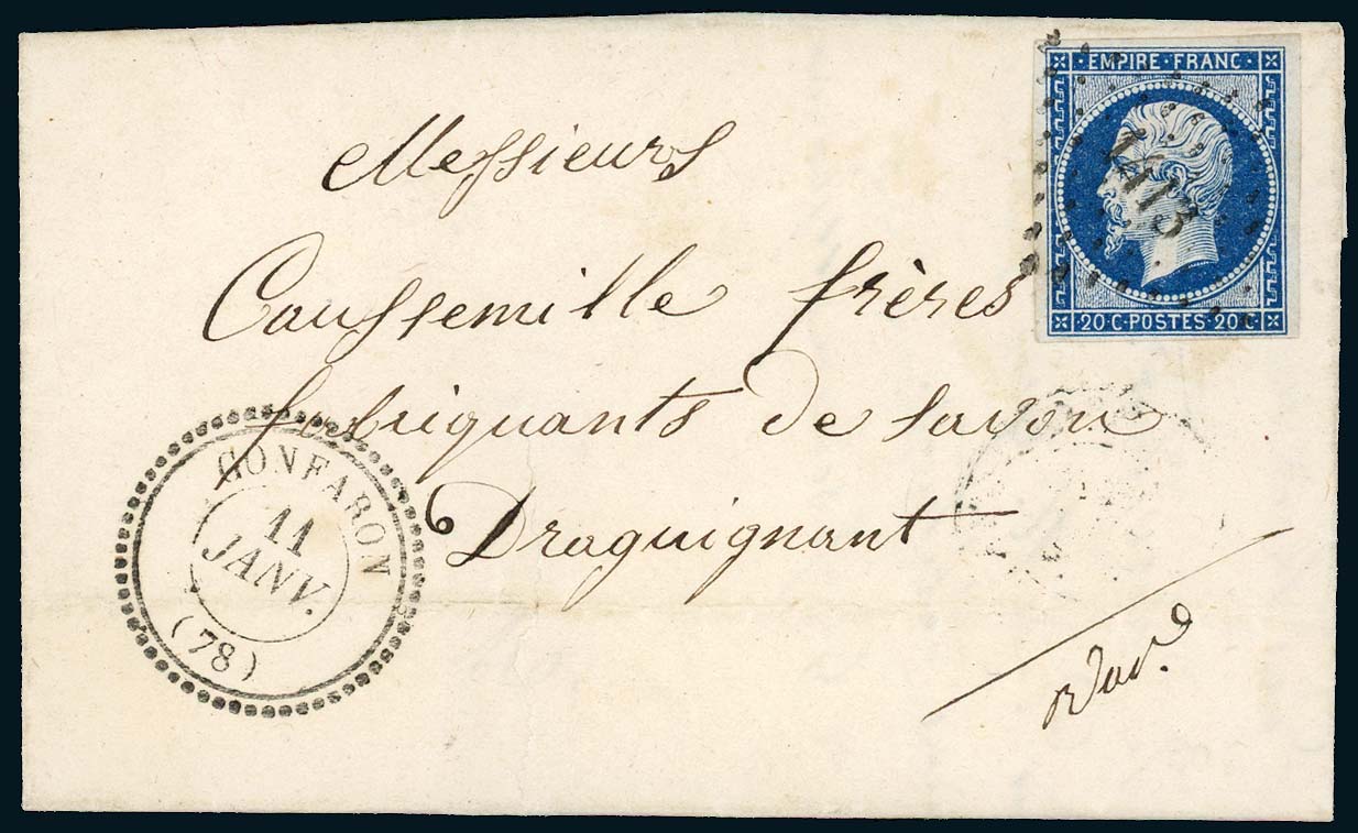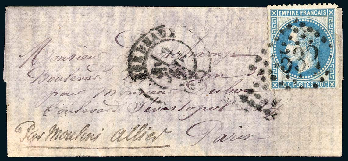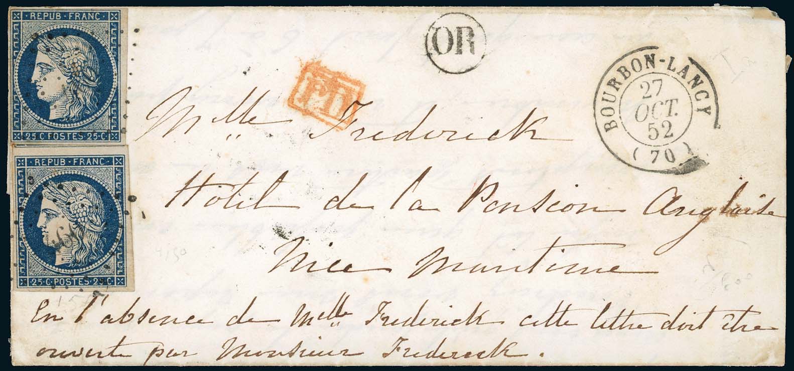 54 | N°3 OB PC 1896 sur lettre de Marseille pour Lyon (ex. Dubus) 29 janvier 1855 TB | 1250 | 1750 | 1250 | enchérir | |