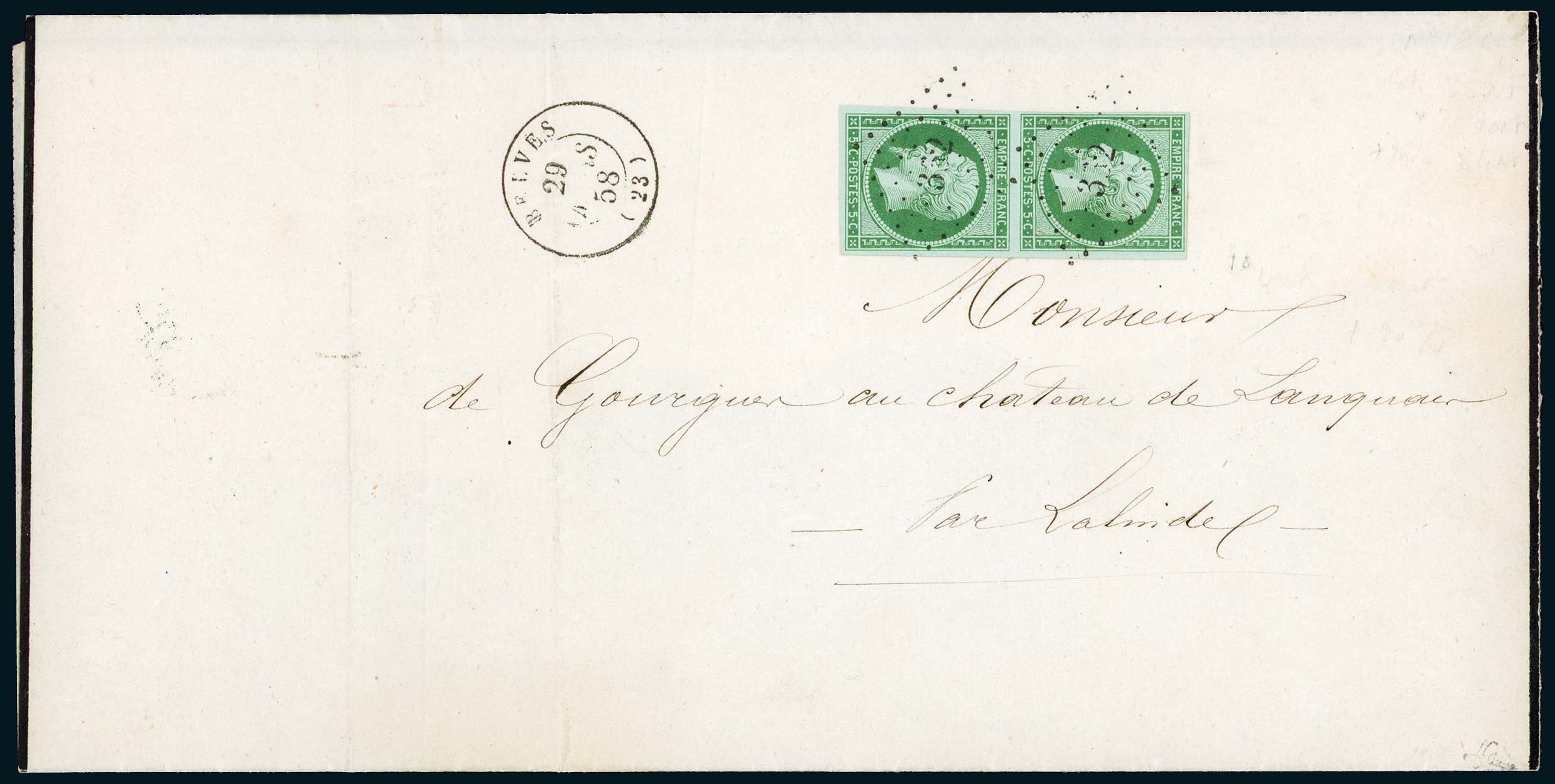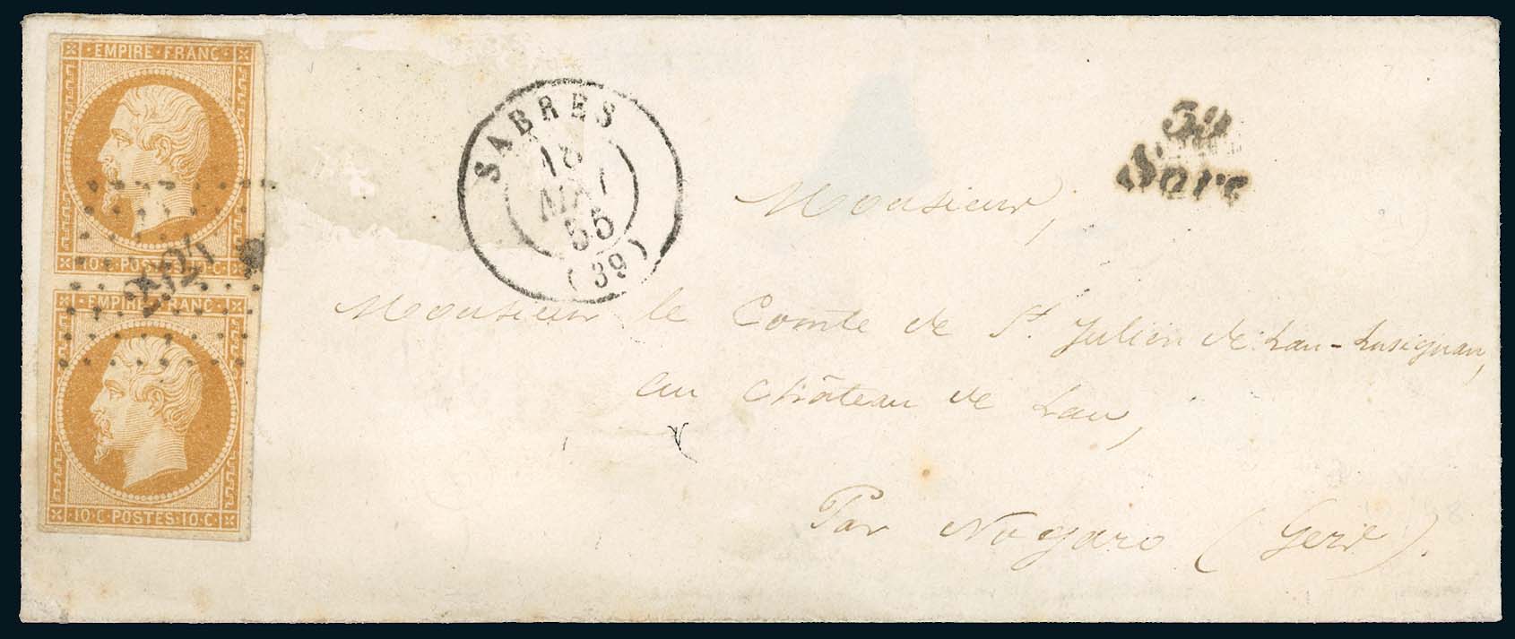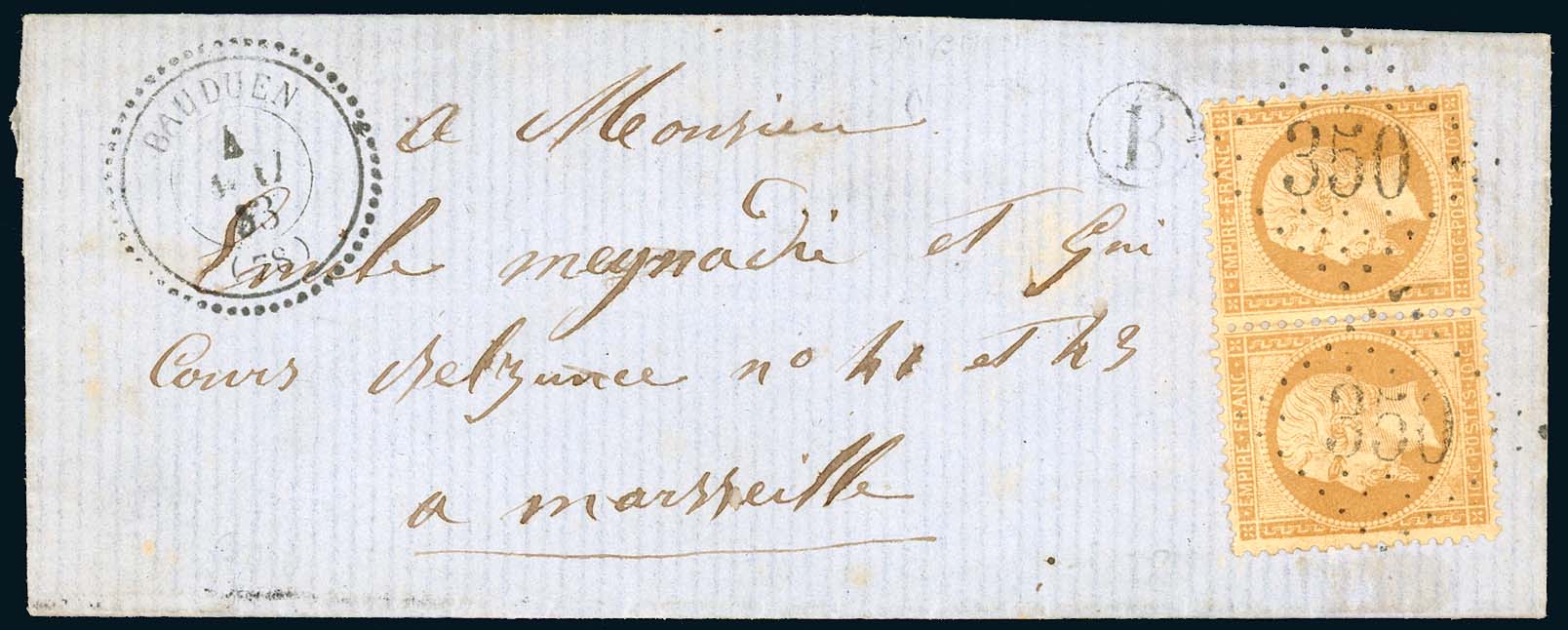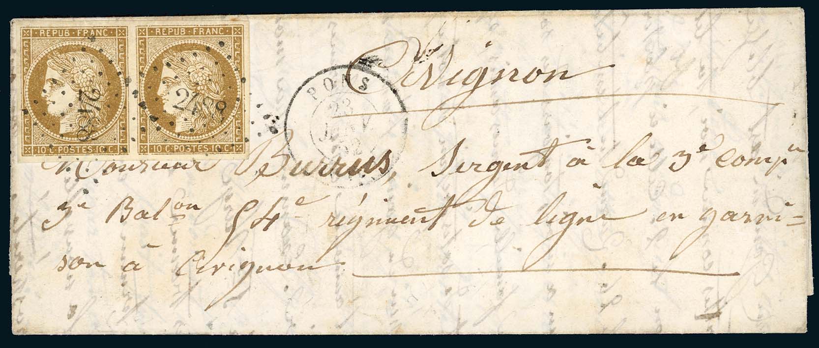 19 | N°1b (bistre verdâtre) en paire OB PC 2488 sur lettre de Pons (Charente-Inférieure) pour Avignon Tarif militaire 1852 TB | 500 | 800 | 500 | enchérir | |