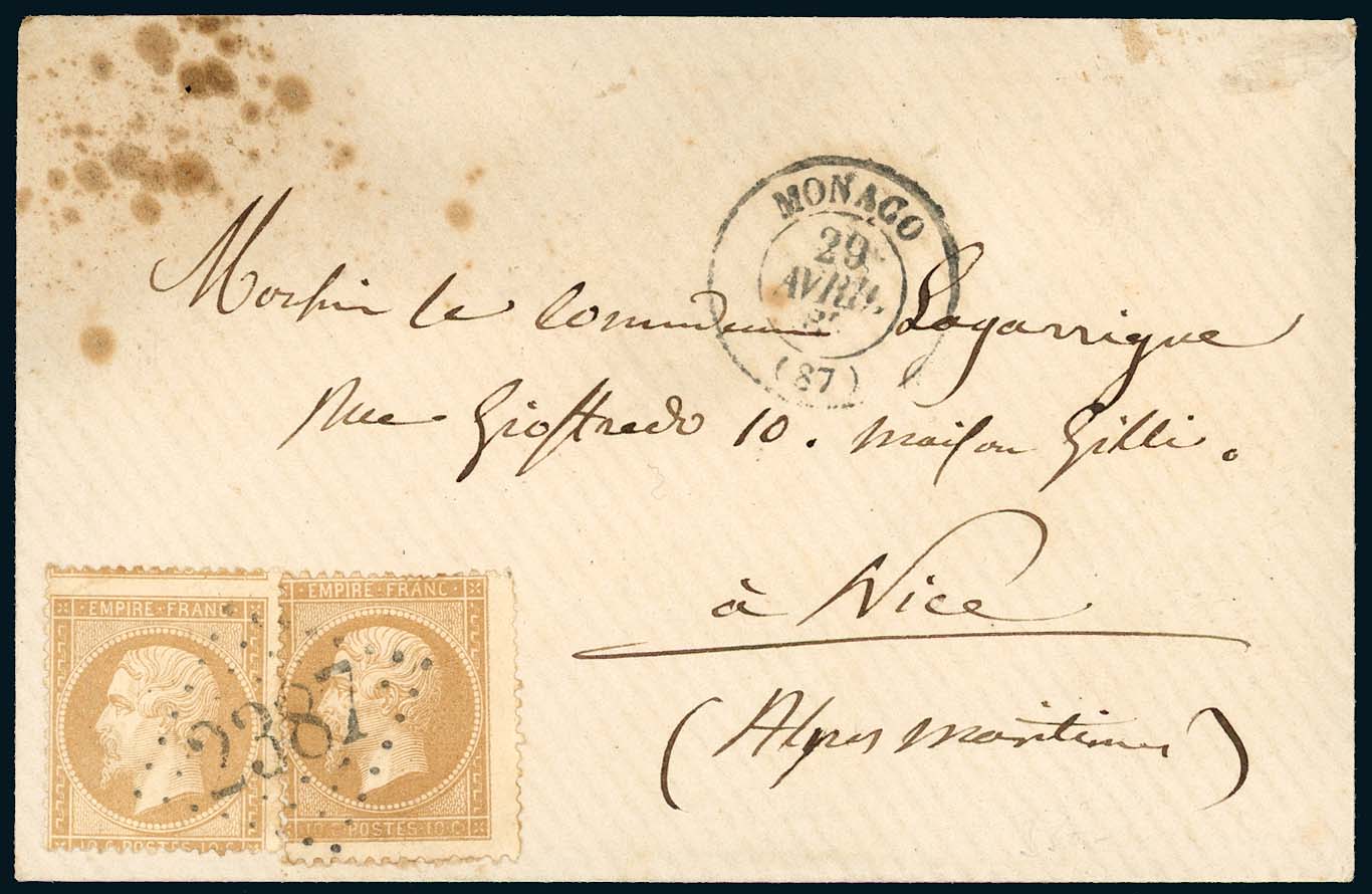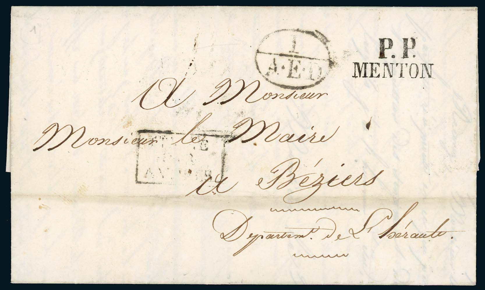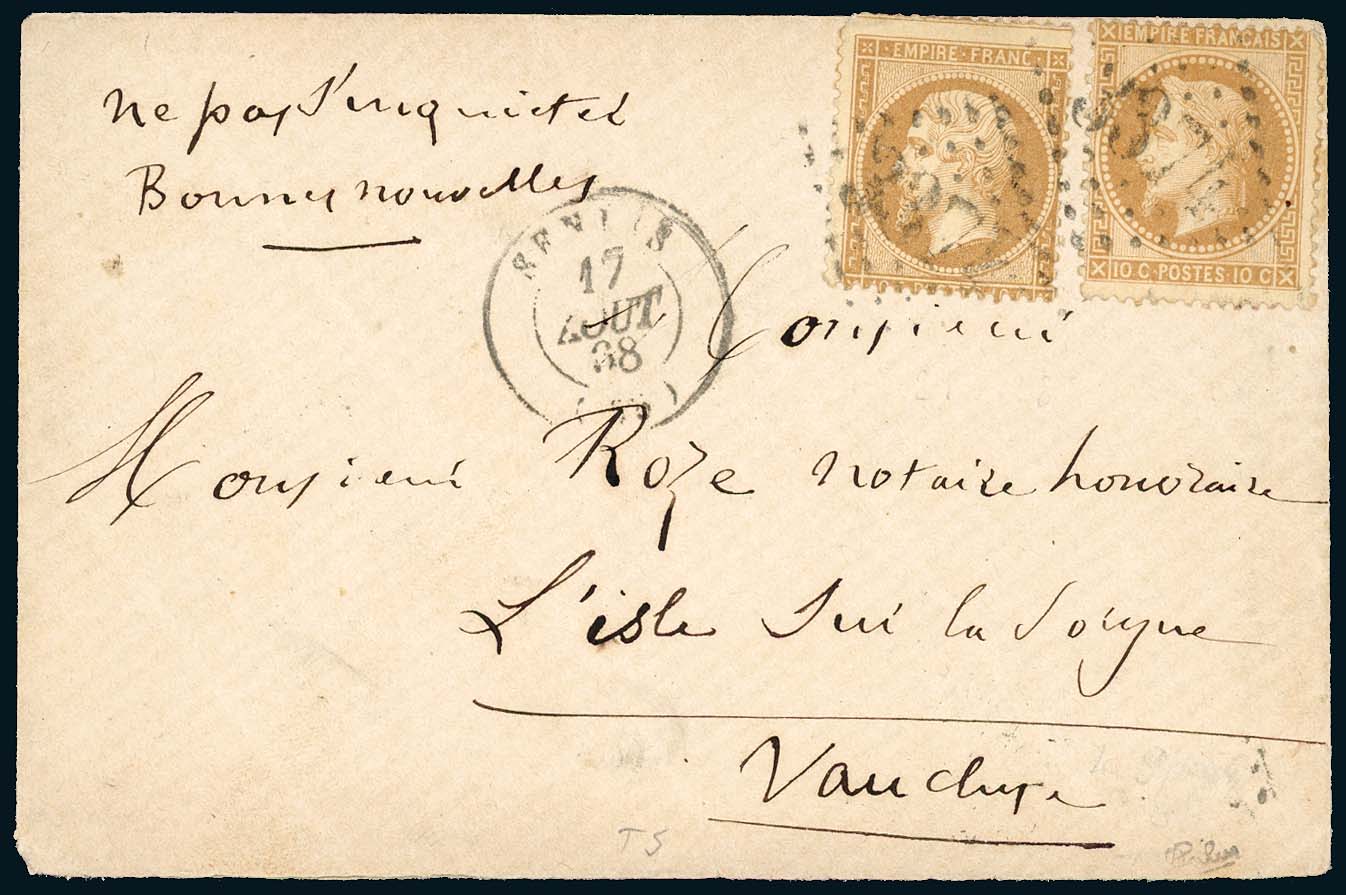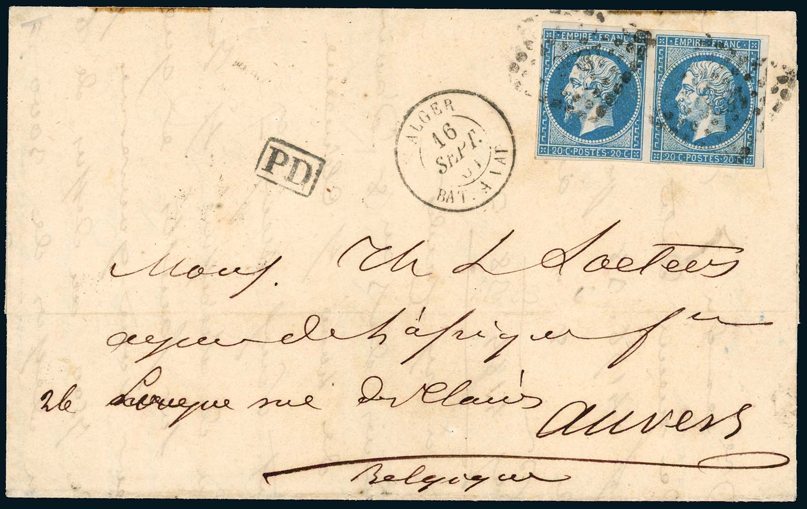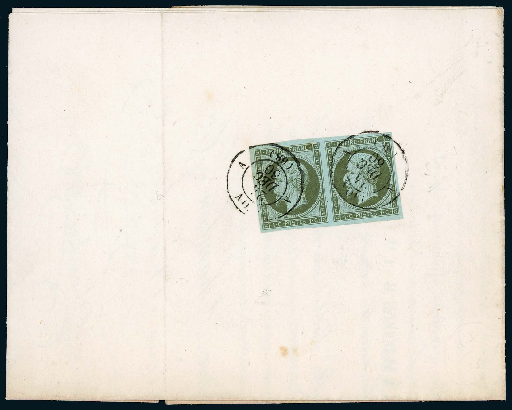19 | N°1b (bistre verdâtre) en paire OB PC 2488 sur lettre de Pons (Charente-Inférieure) pour Avignon Tarif militaire 1852 TB | 500 | 800 | 500 | enchérir | |