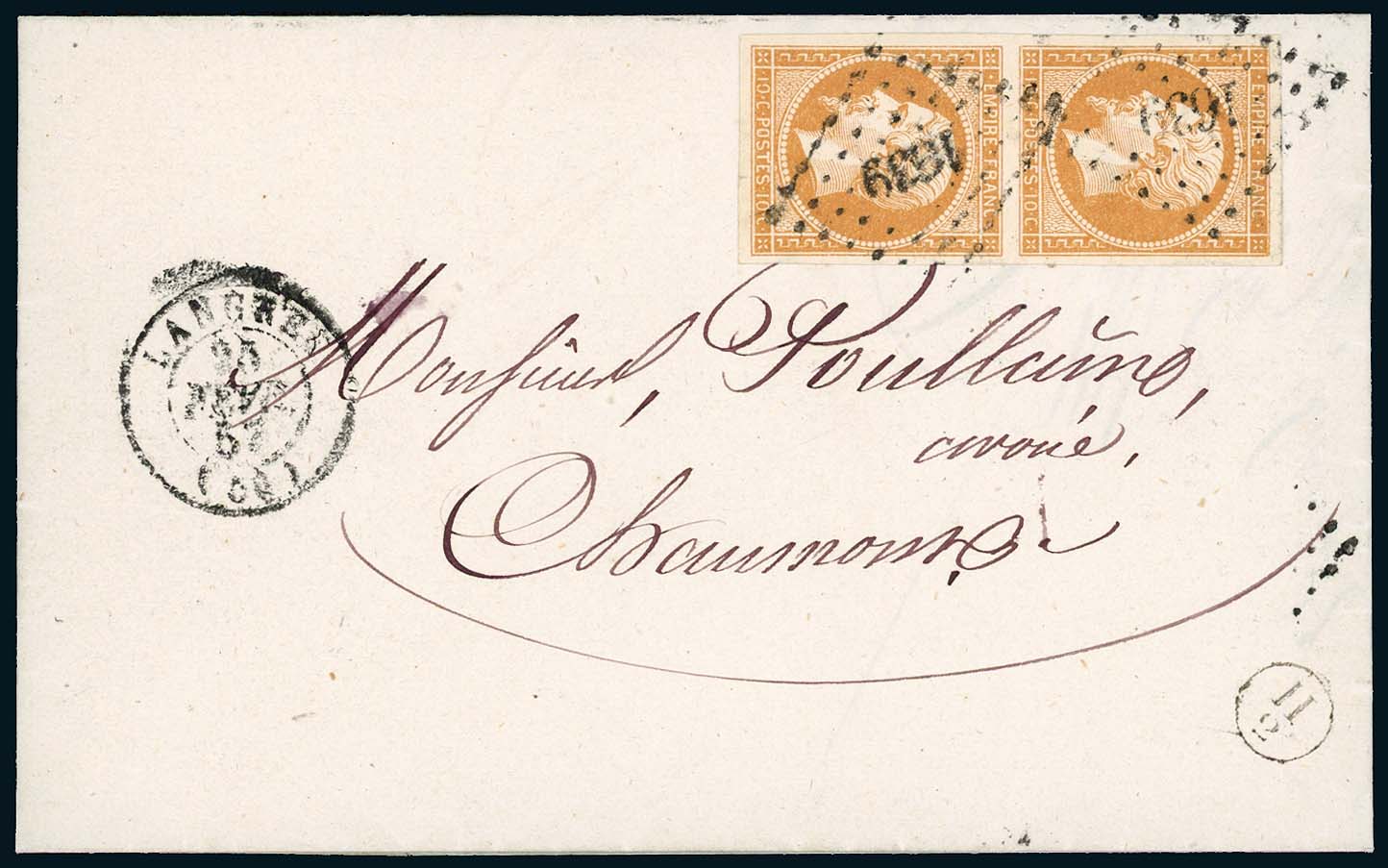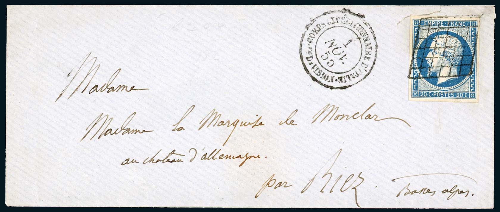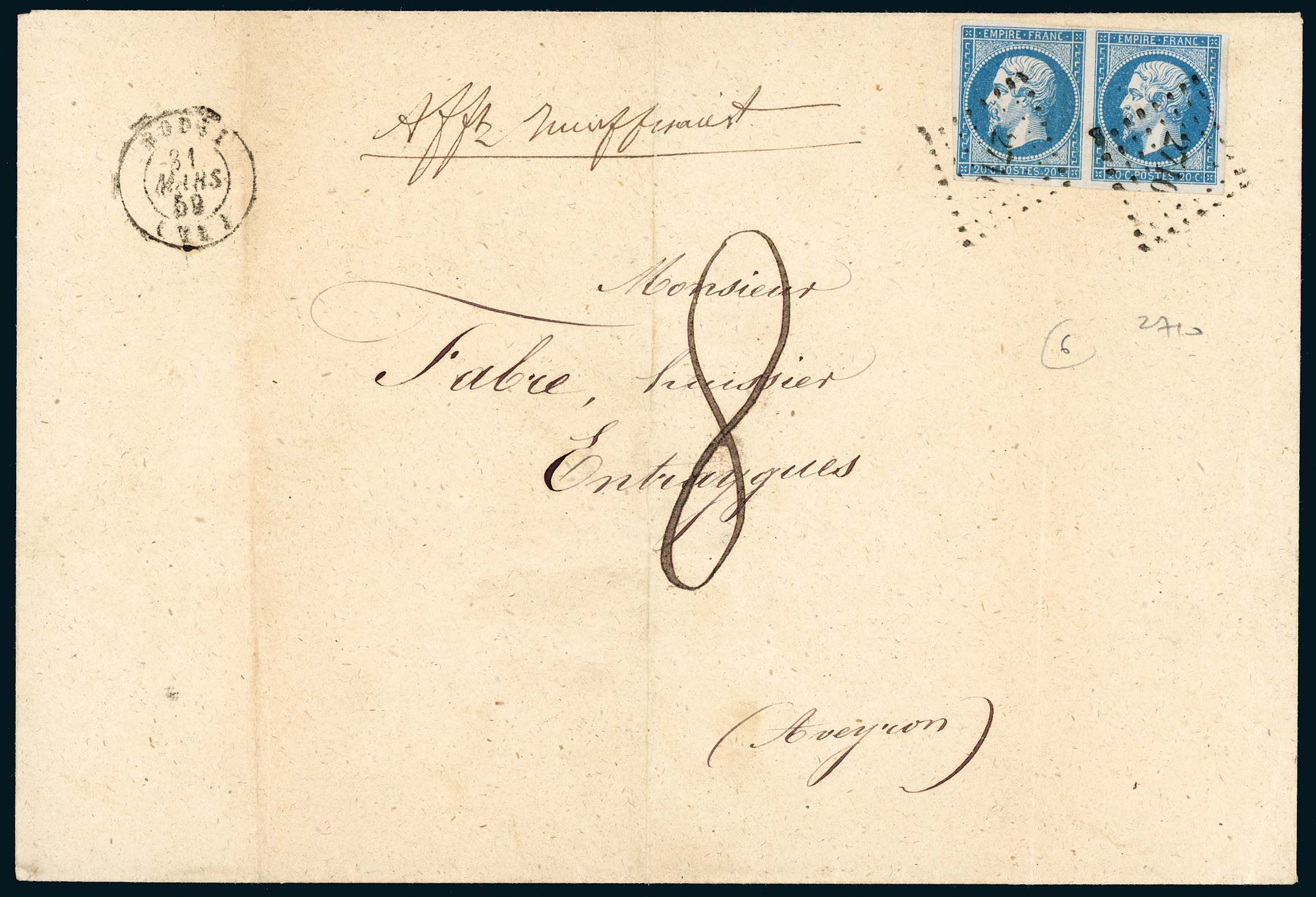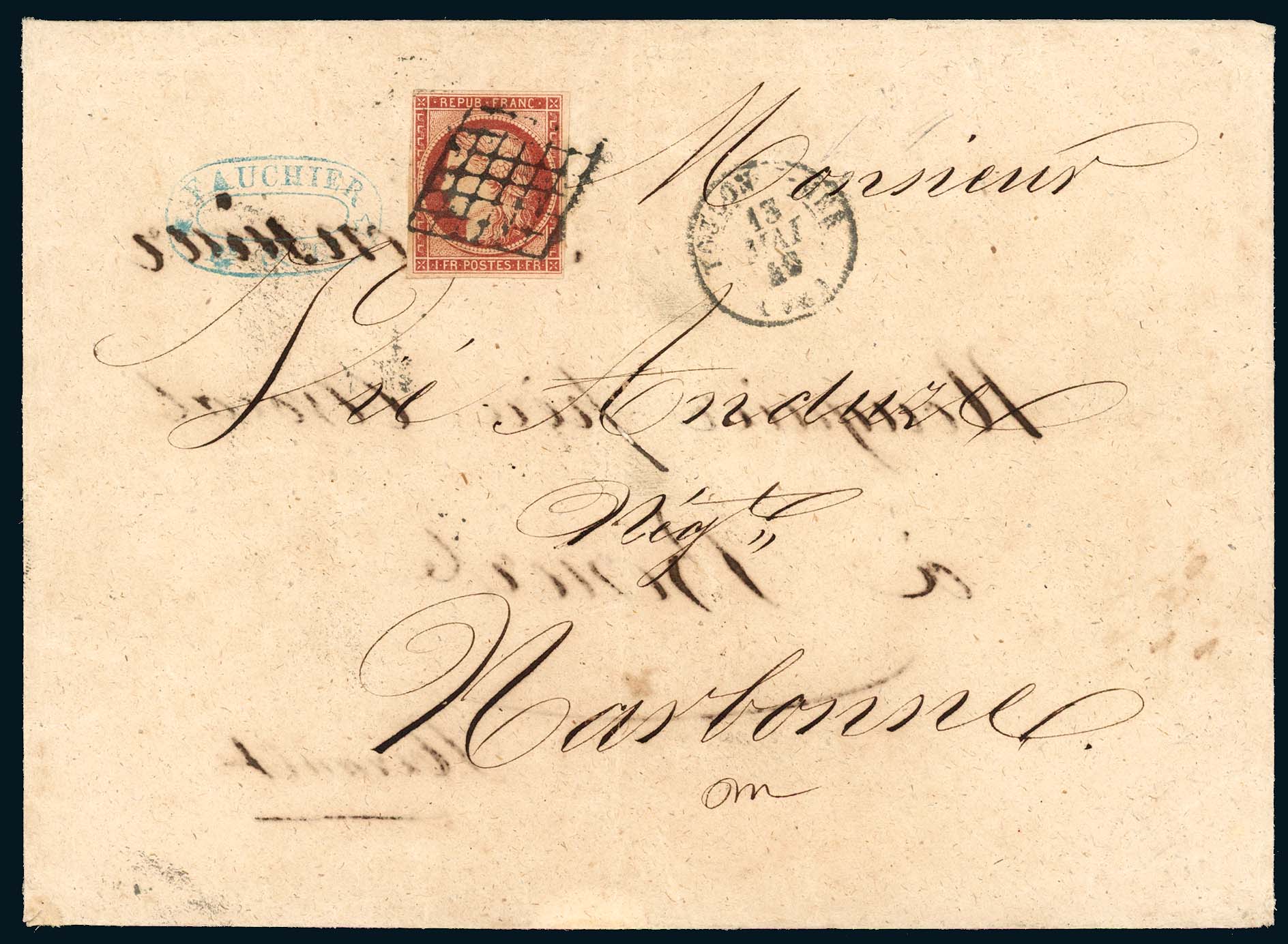 15 | N°1 en paire (tarif militaire) OB grille sur lettre de Montpellier pour Vesoul 5 février 1851 TB | 500 | 800 | 500 | enchérir | |
