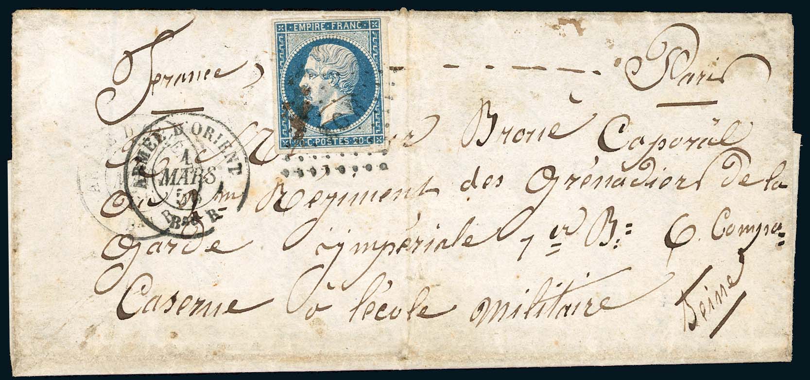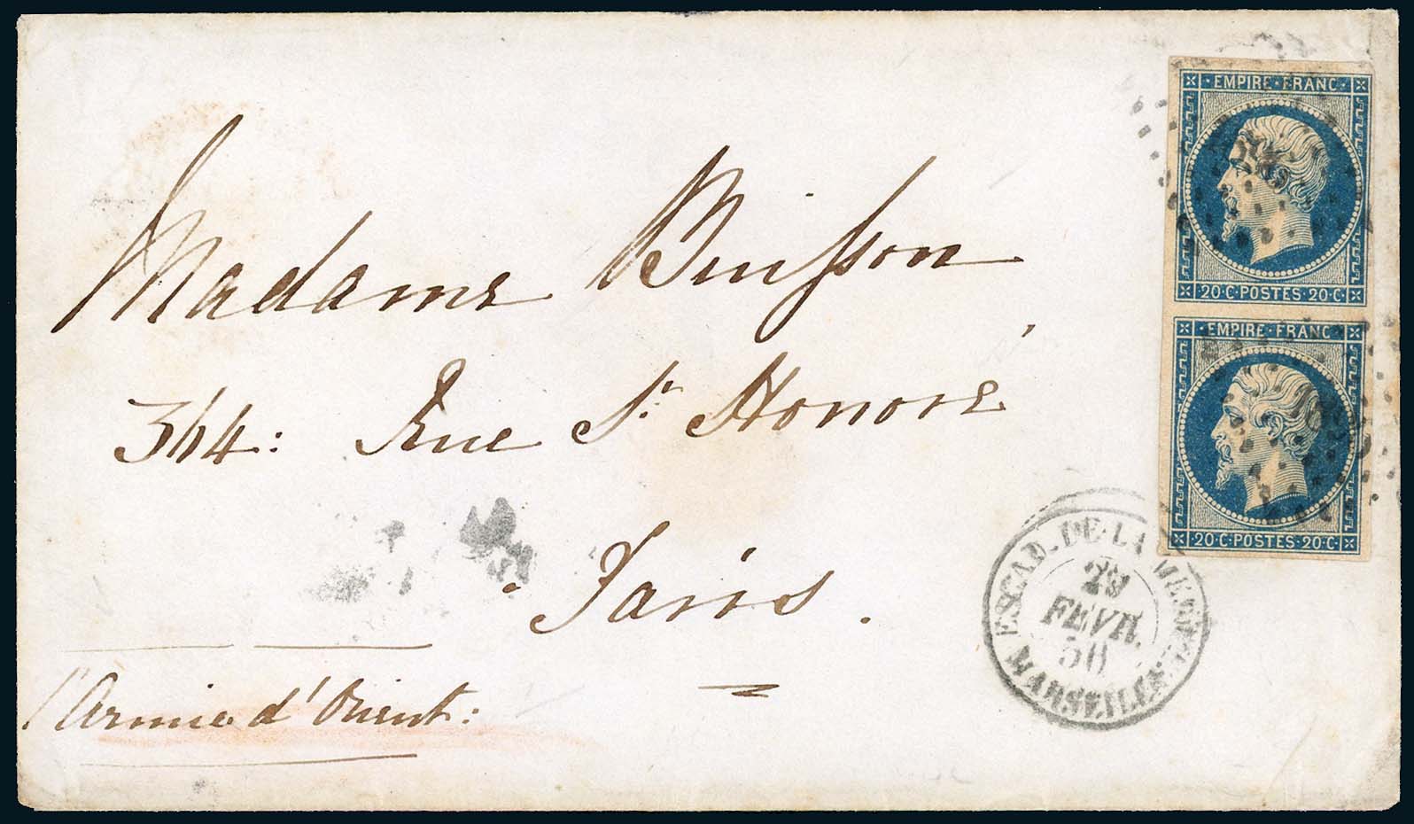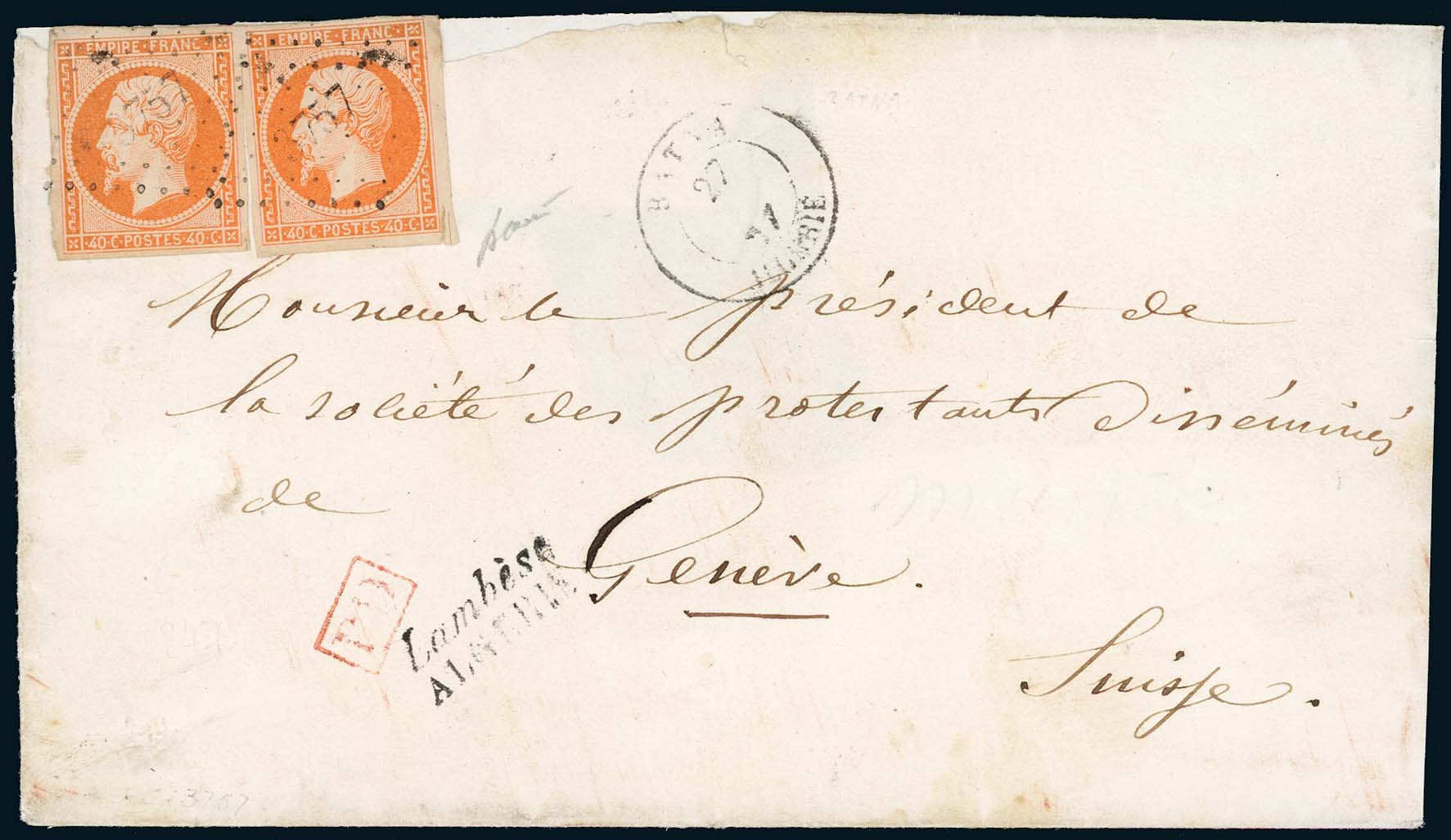 15 | N°1 en paire (tarif militaire) OB grille sur lettre de Montpellier pour Vesoul 5 février 1851 TB | 500 | 800 | 500 | enchérir | |