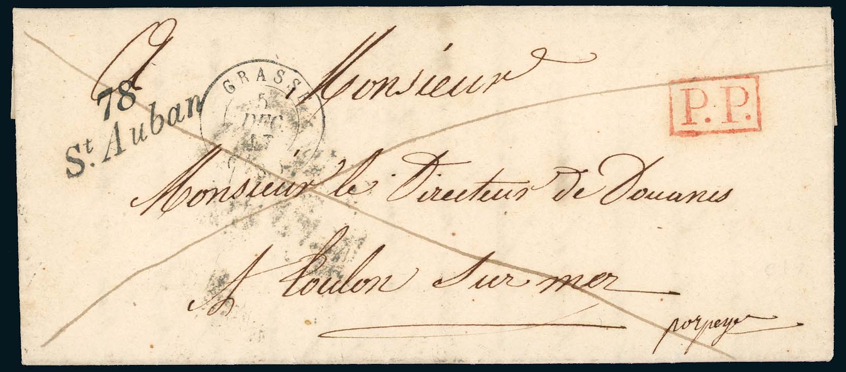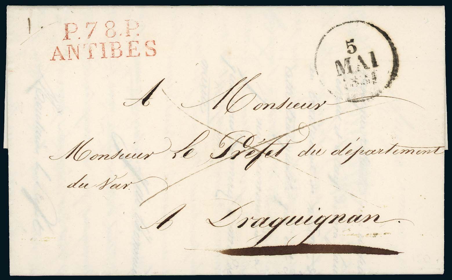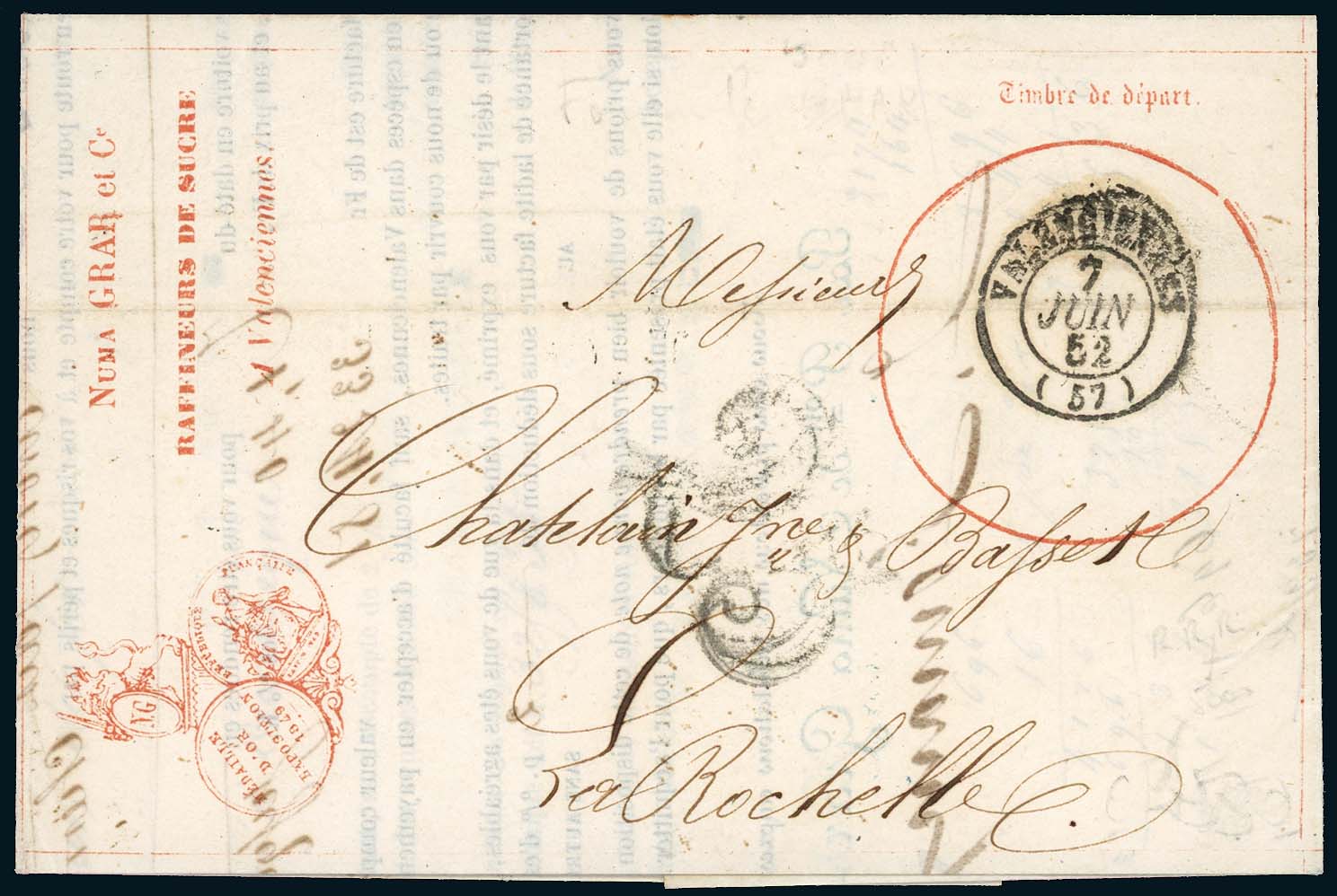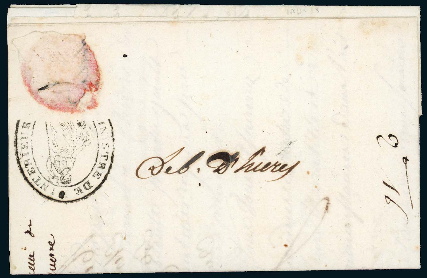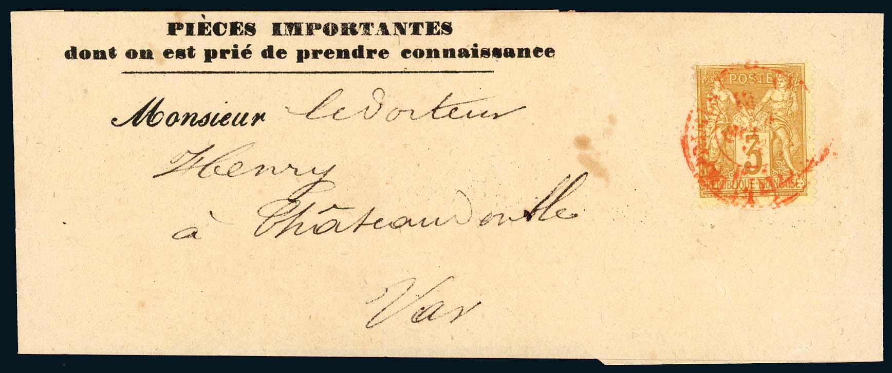 65 | N°3 OB grille, C. MACON et PP en rouge sur faire-part de mariage, tarif au double port des imprimés pour dimension supérieure à 11 dm2, signé Calves 1849 TB | 100 | 200 | 100 | enchérir | |