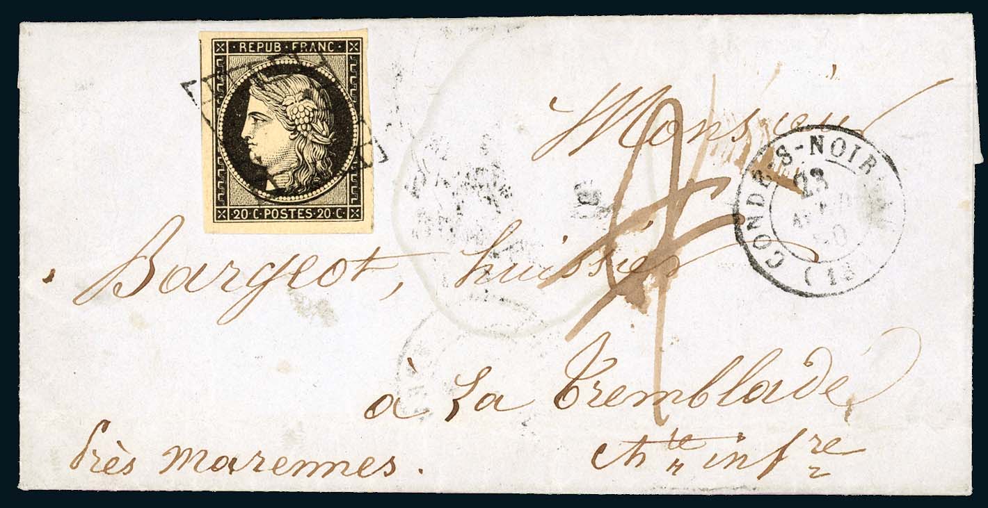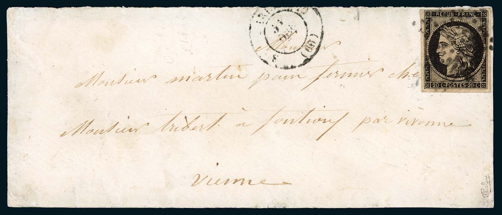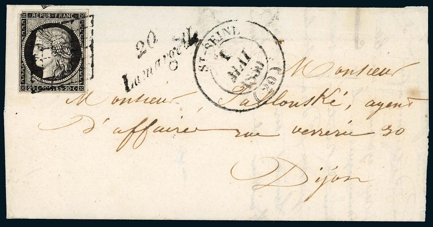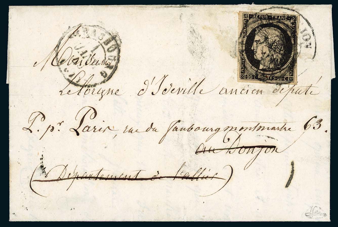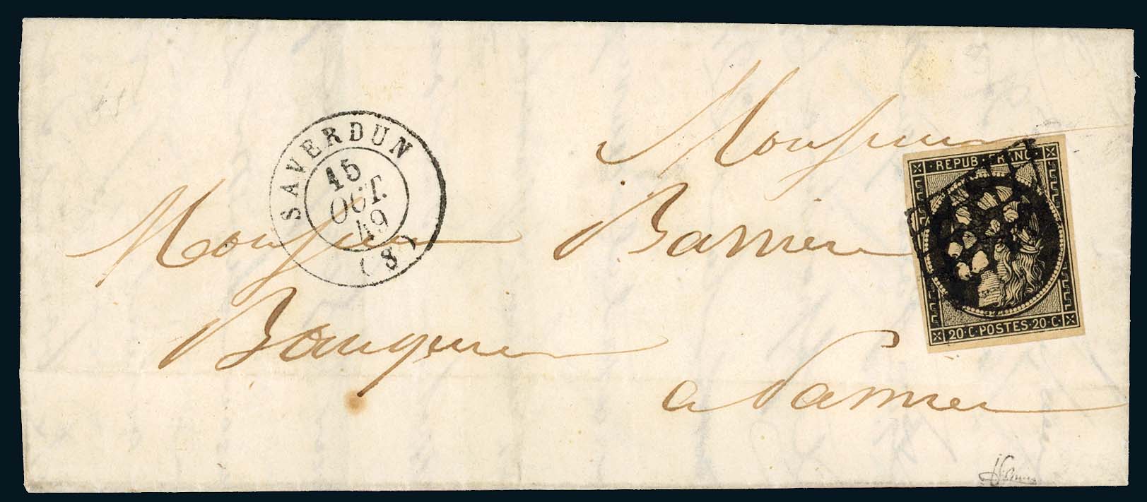 45 | N°3 OB C. STRASBOURG du 1er janvier 1849 sur lettre pour Le Donjon avec réexpédition à son expéditeur avec C. LE DONJON sur le timbre, avec au verso C. STRASBOURG A PARIS (1/1), C. LE DONJON (4/1) et C. PARIS (8/1) 1er janvier 1849 Combinaison rare, certificat Brun TB | 1500 | 2500 | 1500 | enchérir | |