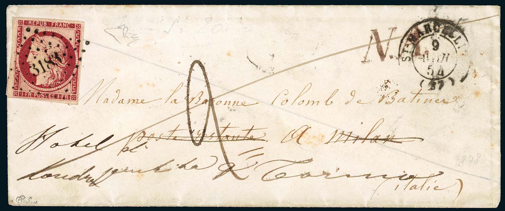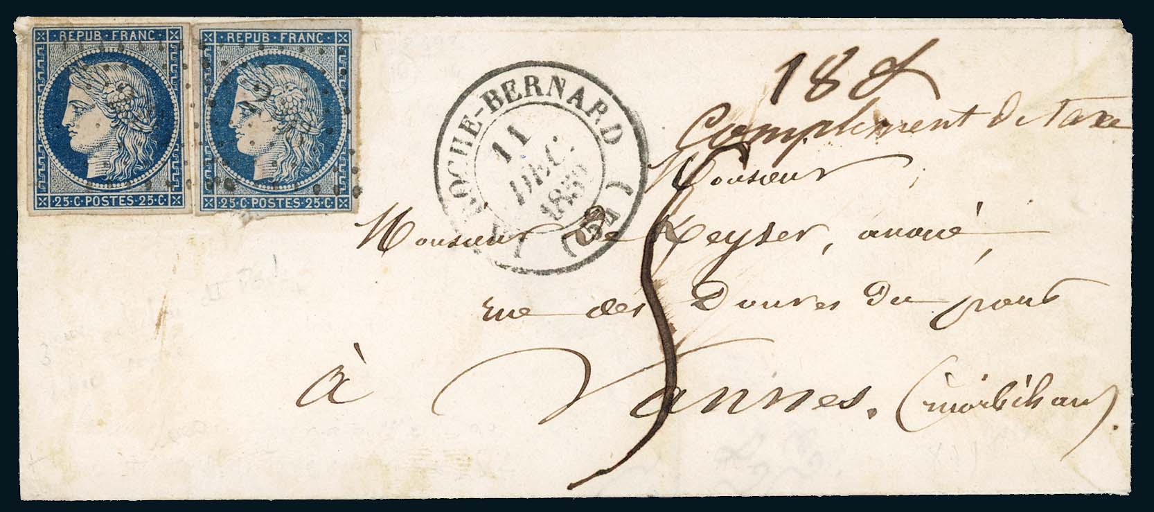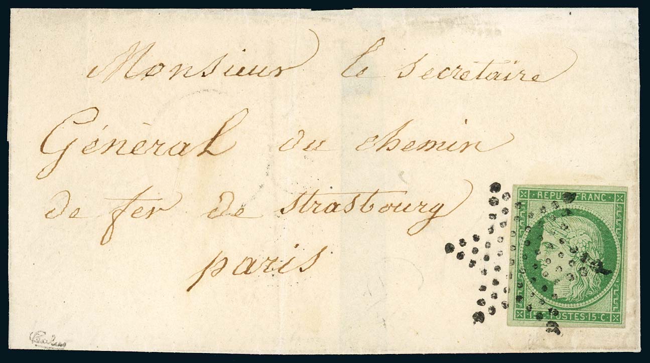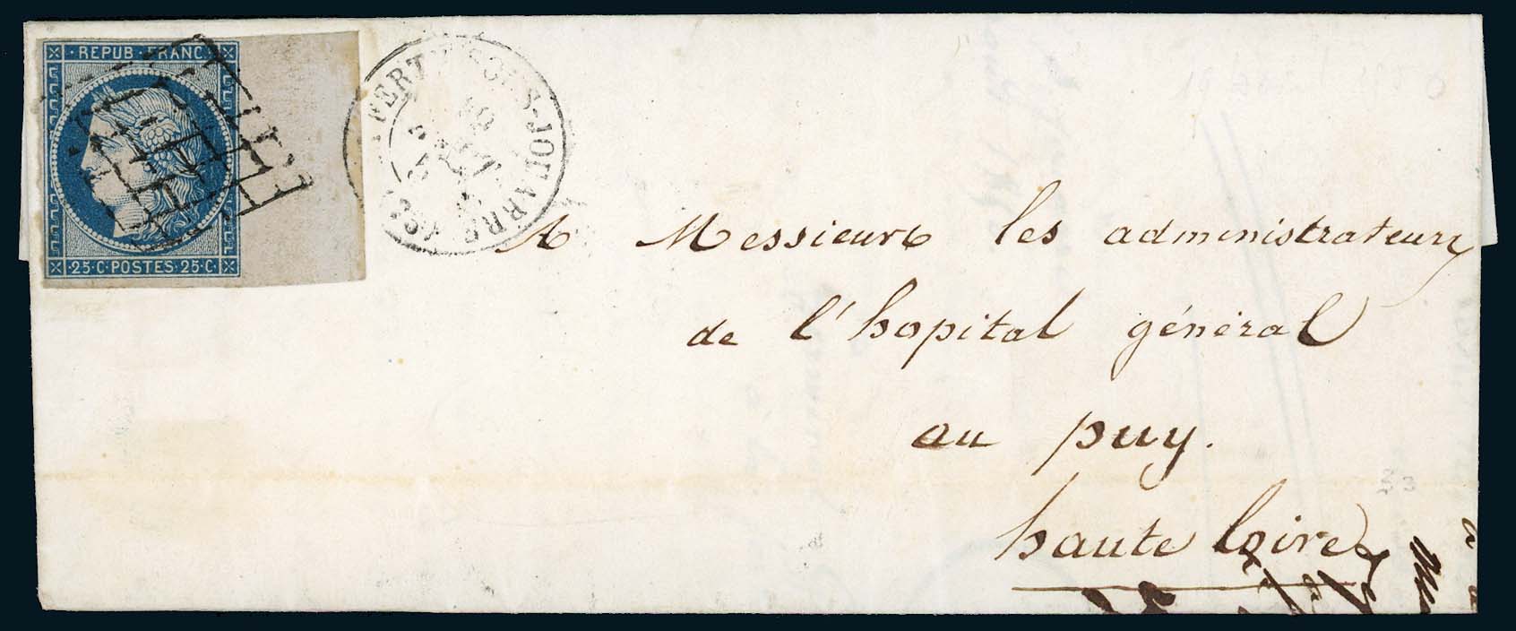 45 | N°3 OB C. STRASBOURG du 1er janvier 1849 sur lettre pour Le Donjon avec réexpédition à son expéditeur avec C. LE DONJON sur le timbre, avec au verso C. STRASBOURG A PARIS (1/1), C. LE DONJON (4/1) et C. PARIS (8/1) 1er janvier 1849 Combinaison rare, certificat Brun TB | 1500 | 2500 | 1500 | enchérir | |