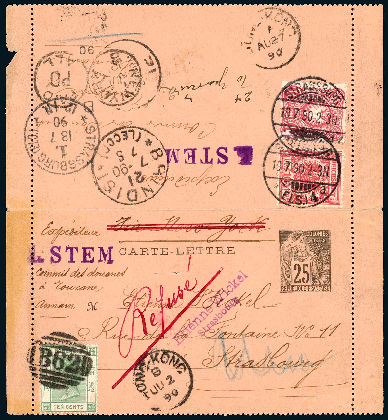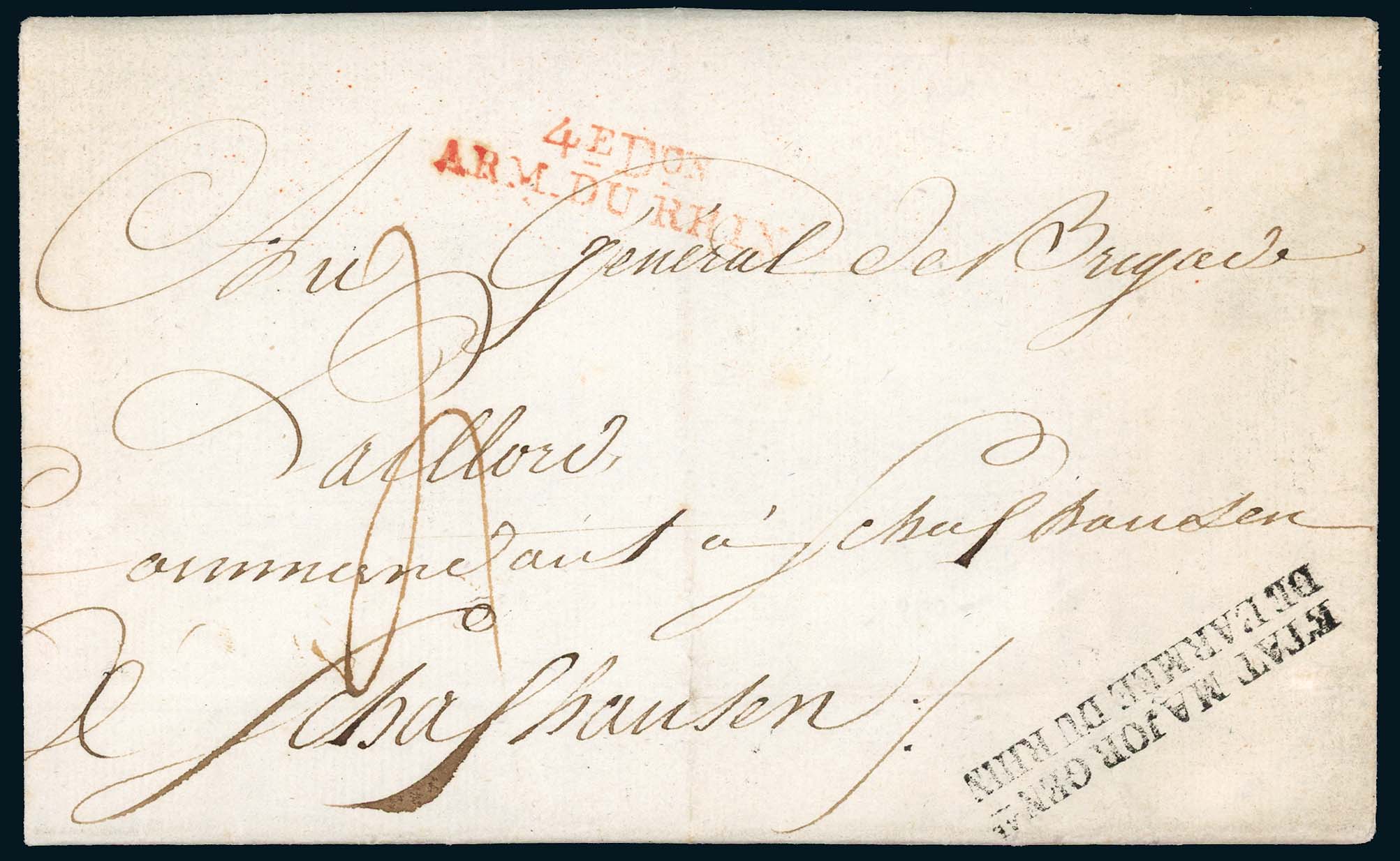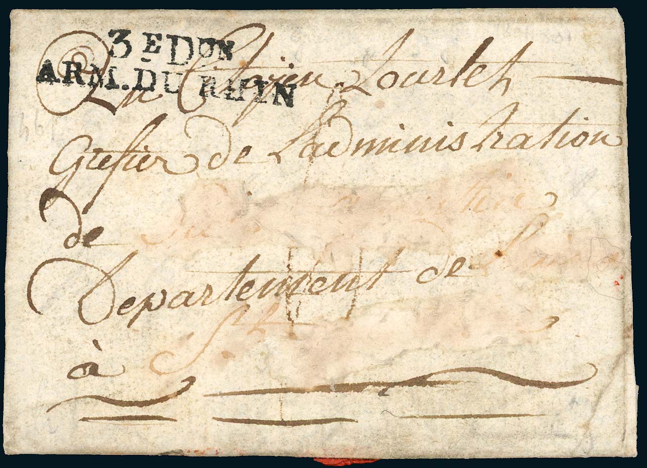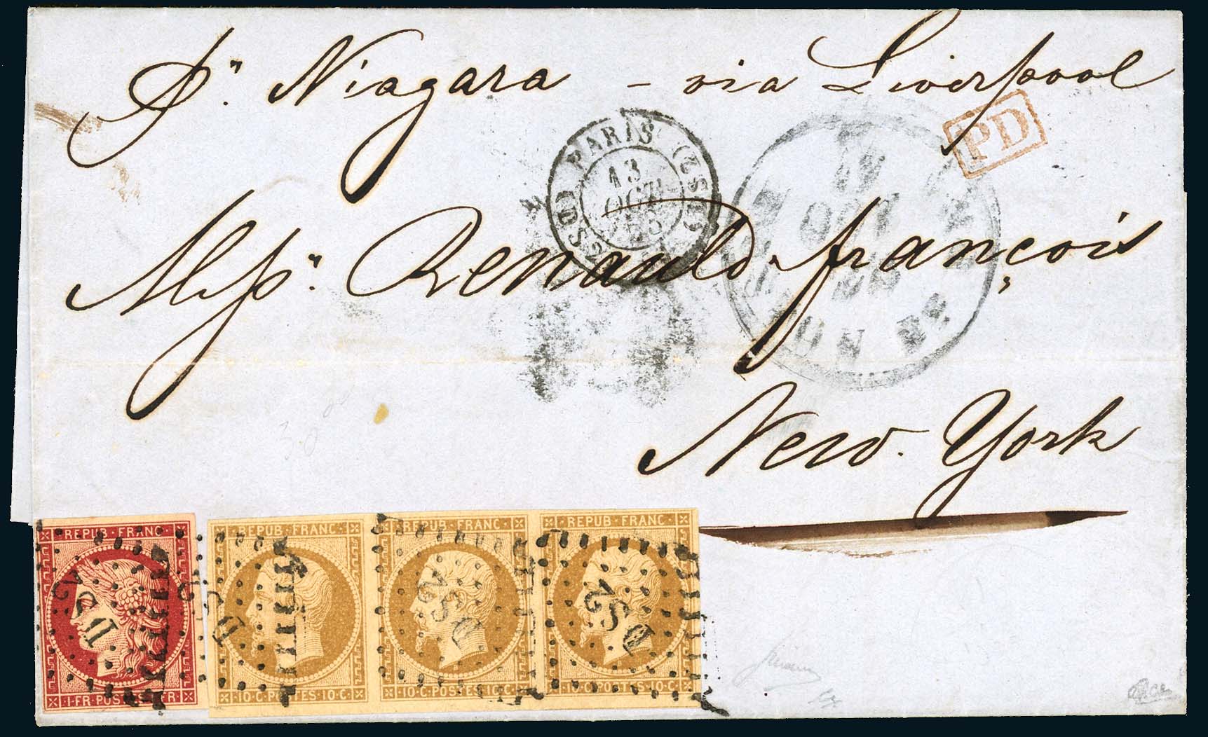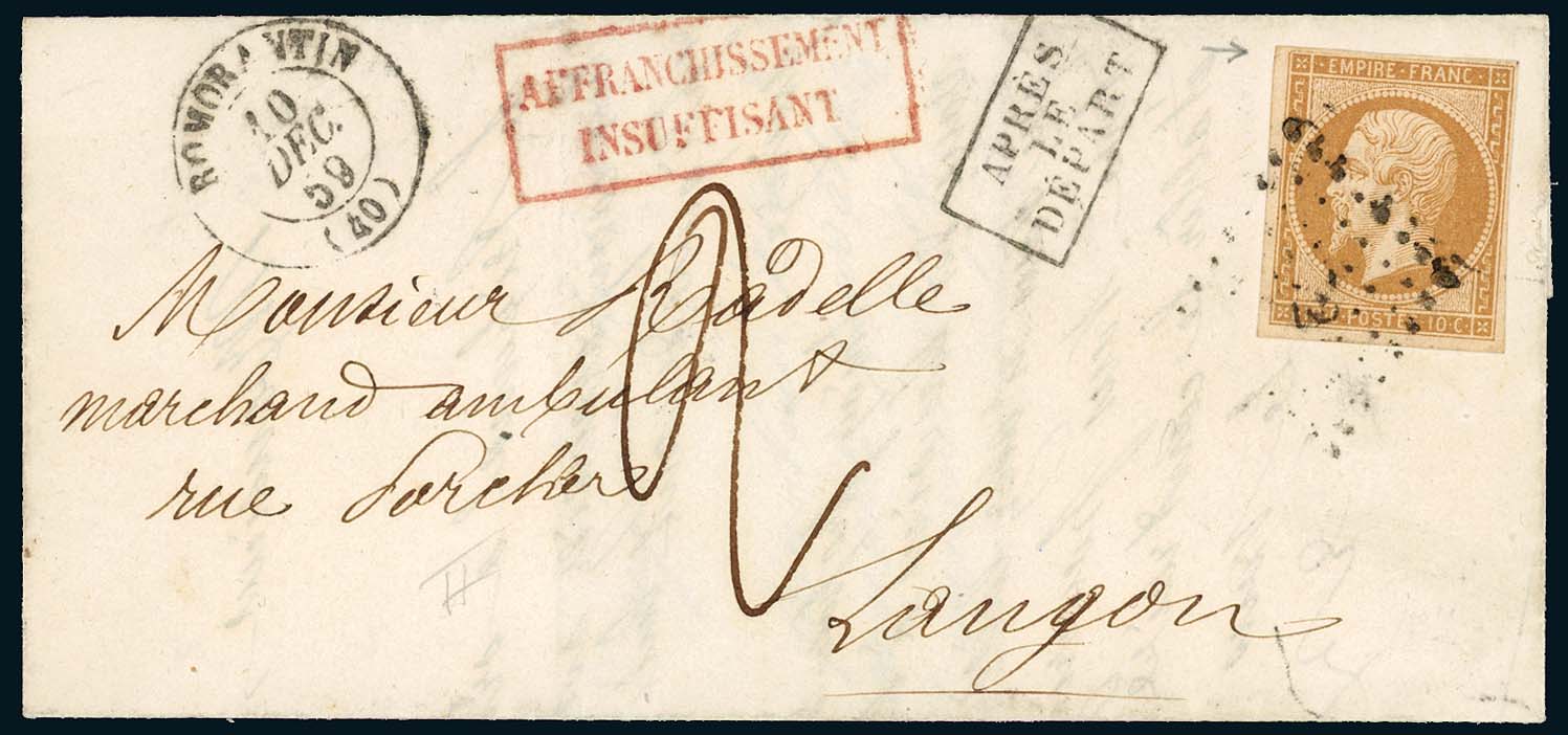 45 | N°3 OB C. STRASBOURG du 1er janvier 1849 sur lettre pour Le Donjon avec réexpédition à son expéditeur avec C. LE DONJON sur le timbre, avec au verso C. STRASBOURG A PARIS (1/1), C. LE DONJON (4/1) et C. PARIS (8/1) 1er janvier 1849 Combinaison rare, certificat Brun TB | 1500 | 2500 | 1500 | enchérir | |