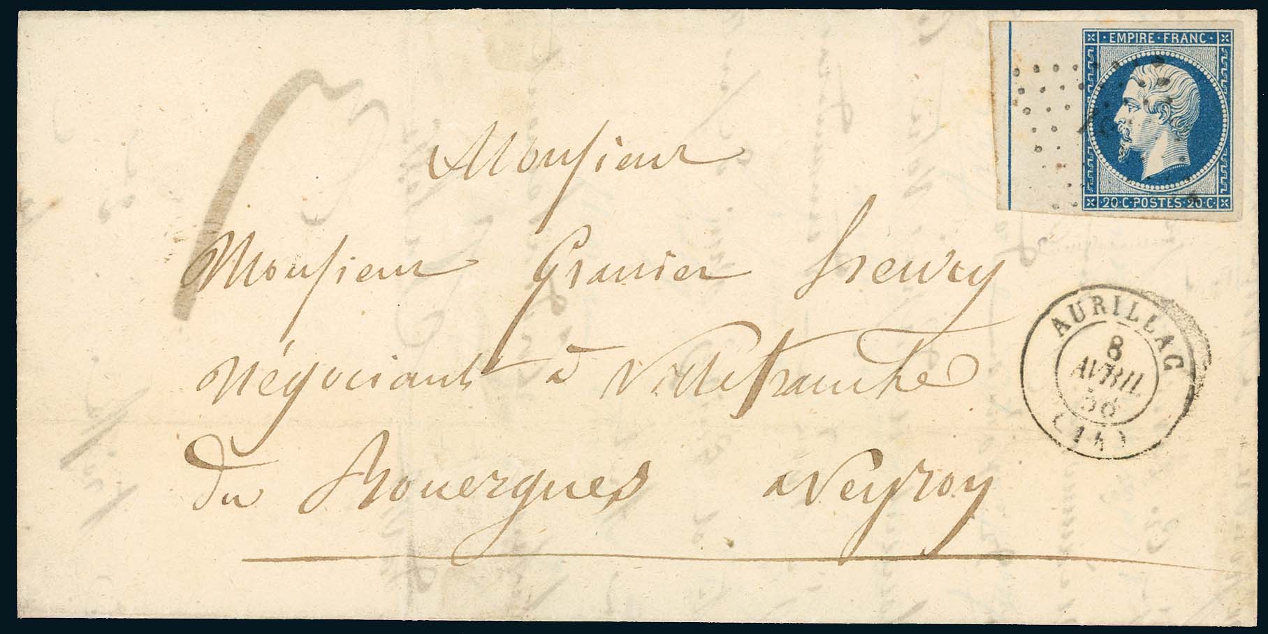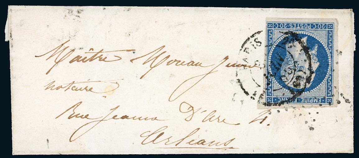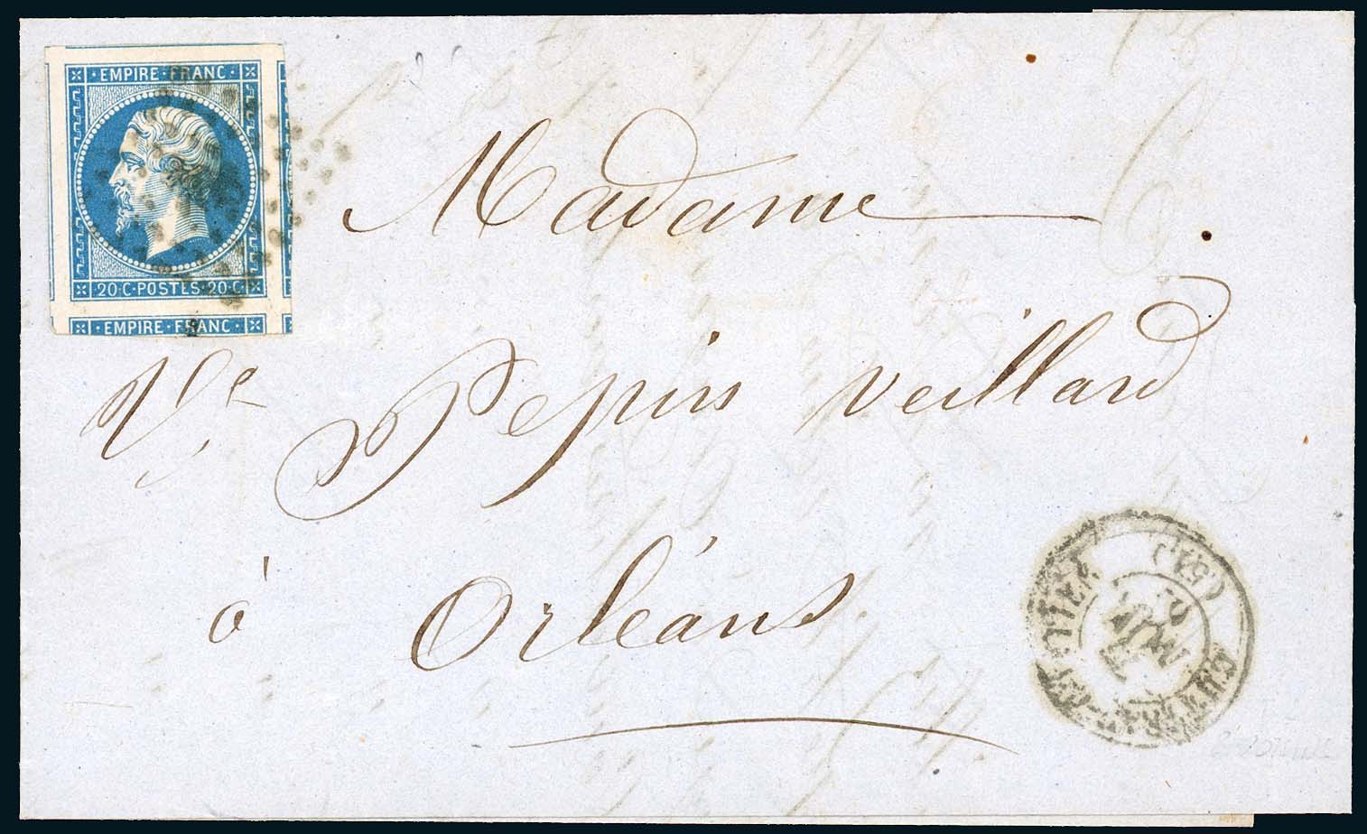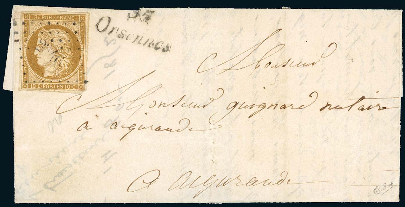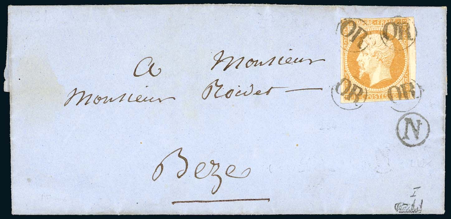 16 | N°1 OB PC 2346 avec cursive 35/Orsennes (Indre) sur lettre locale pour Aigurande 23 mars 1853 TB | 150 | 300 | 150 | enchérir | |