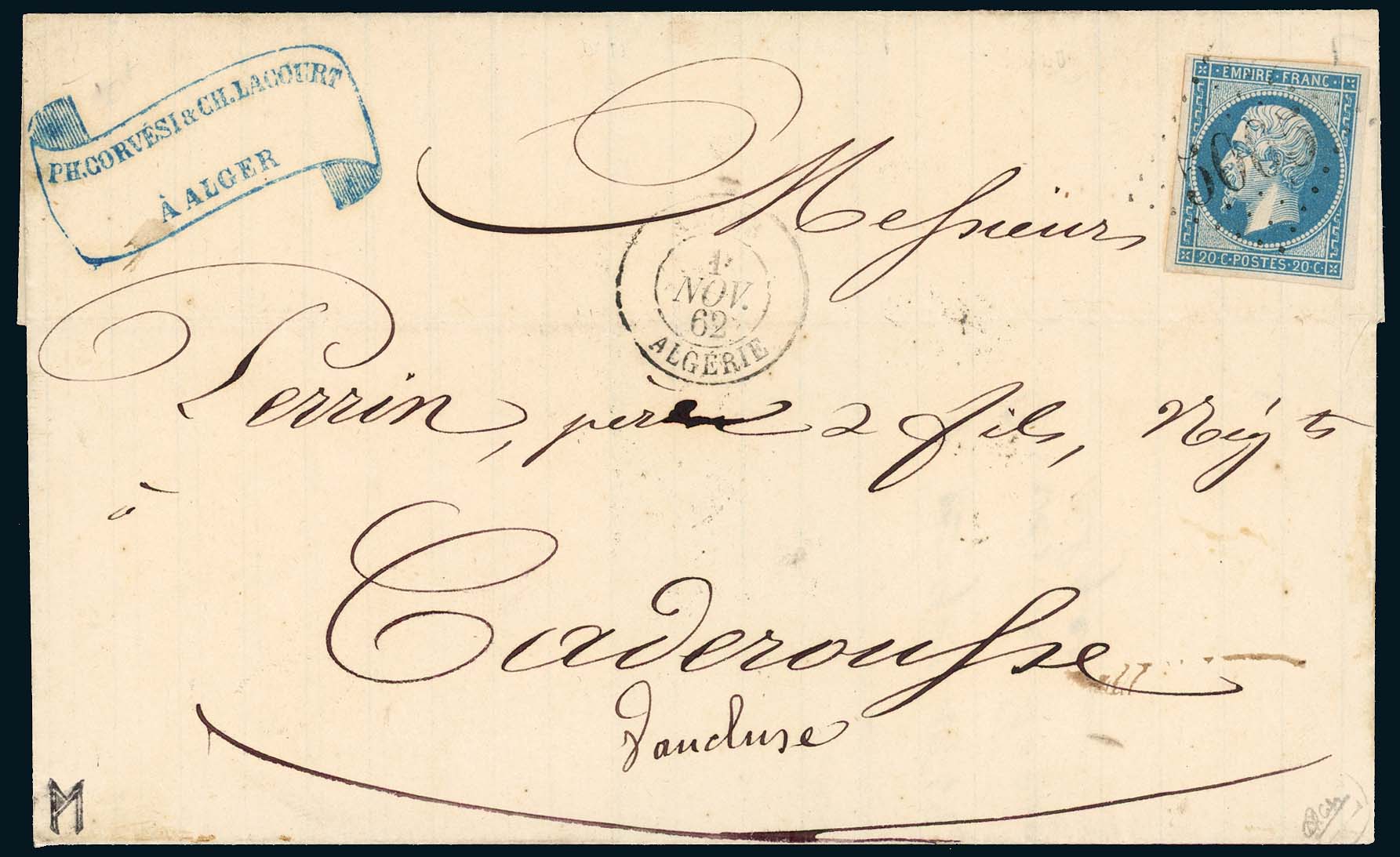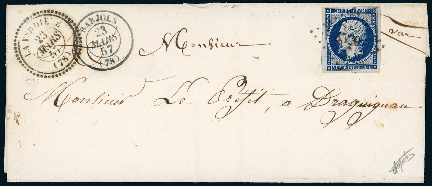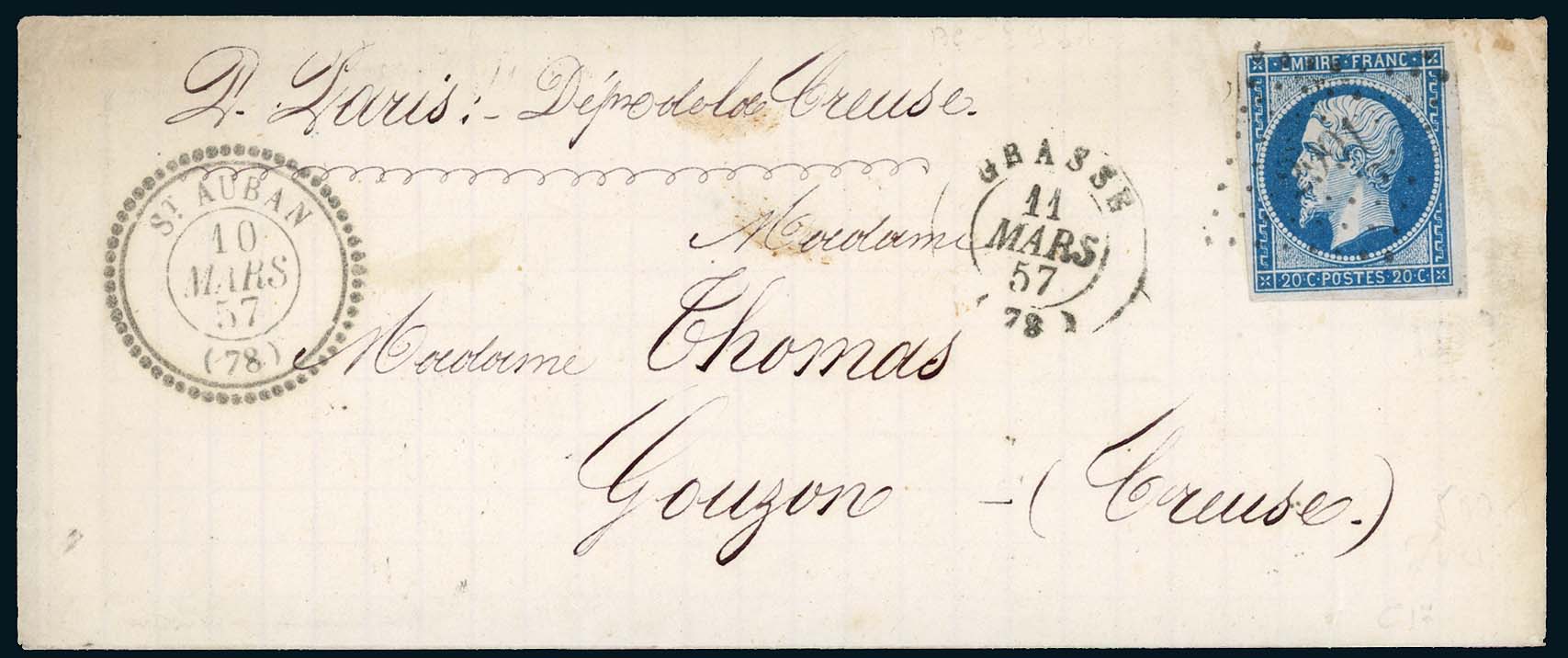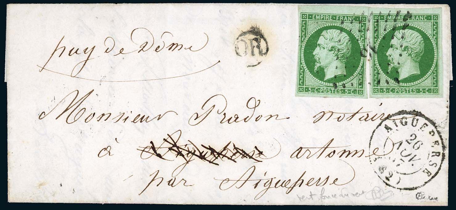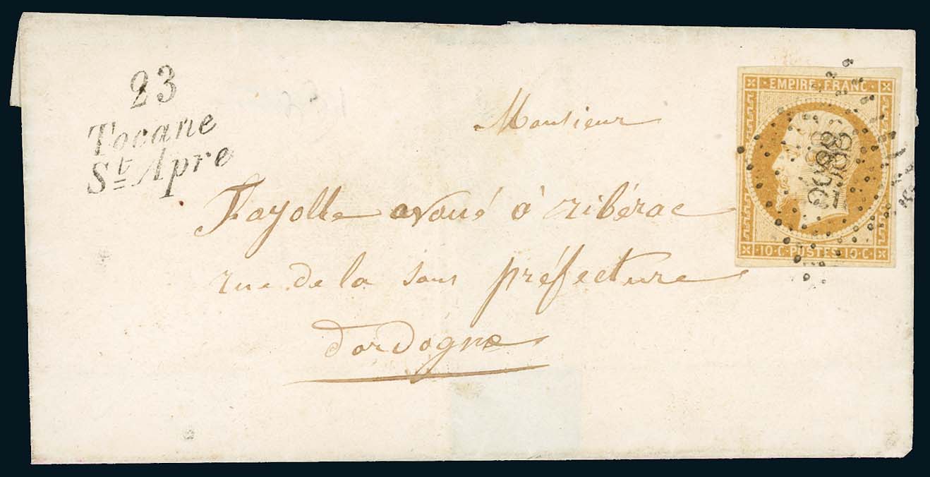 16 | N°1 OB PC 2346 avec cursive 35/Orsennes (Indre) sur lettre locale pour Aigurande 23 mars 1853 TB | 150 | 300 | 150 | enchérir | |