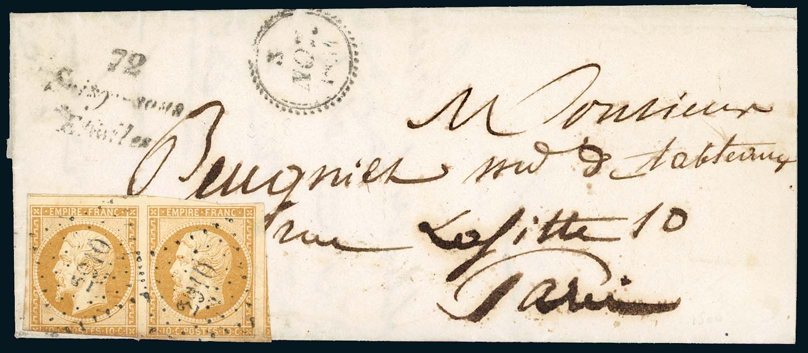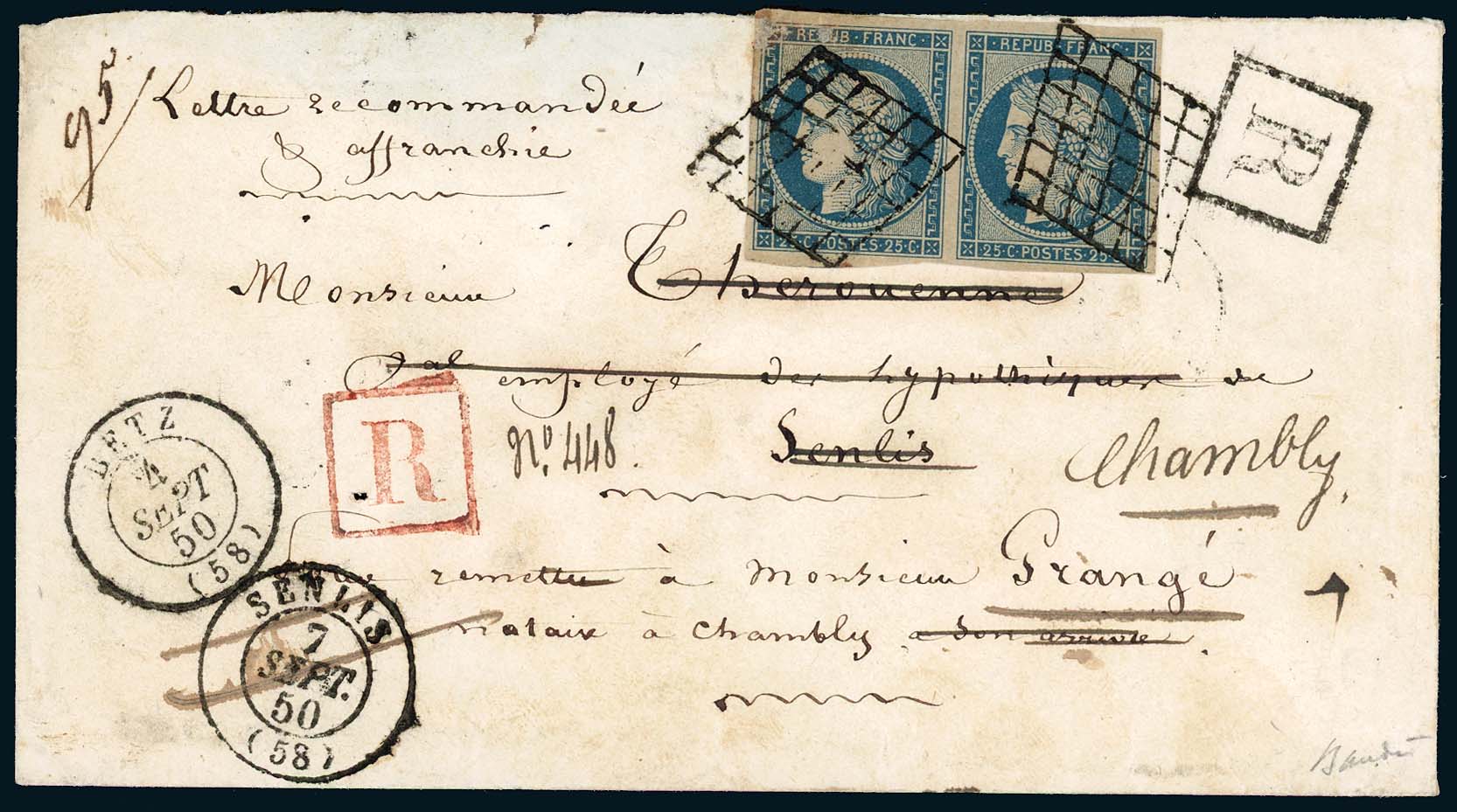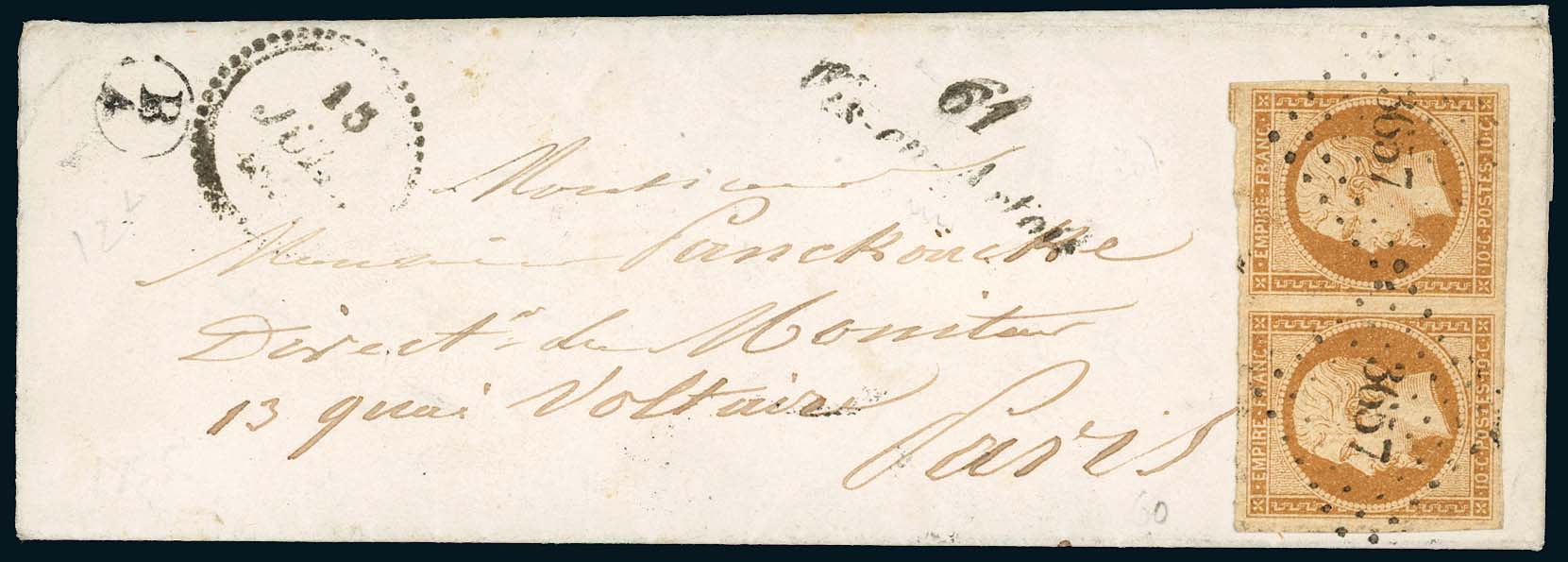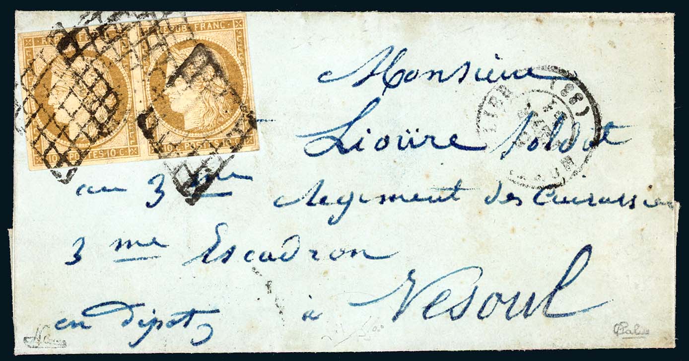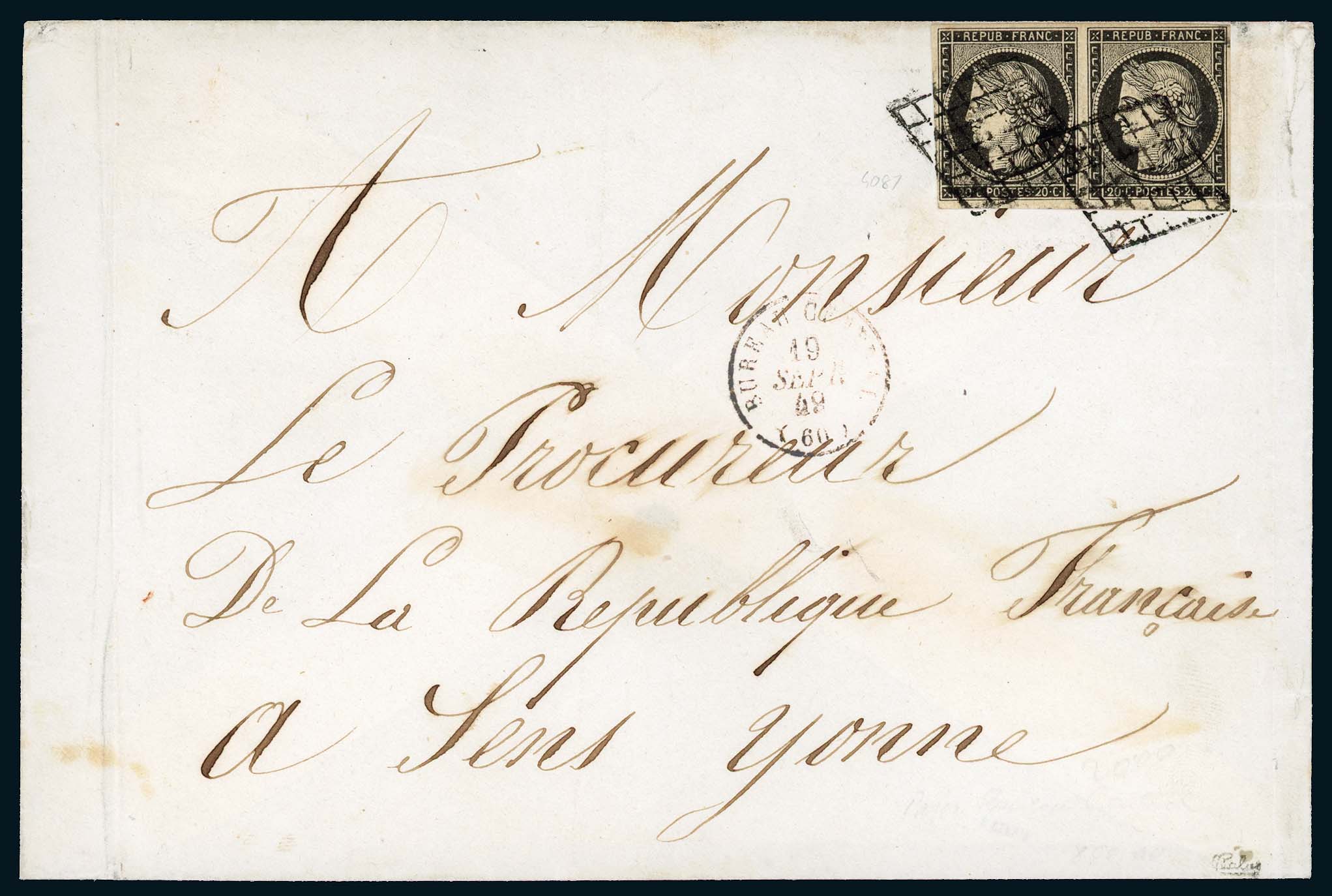 64 | N°3 en paire OB grille, C. BUREAU CENTRAL en noir sur enveloppe au double port port pour Sens 1849 TB | 150 | 300 | 150 | enchérir | |