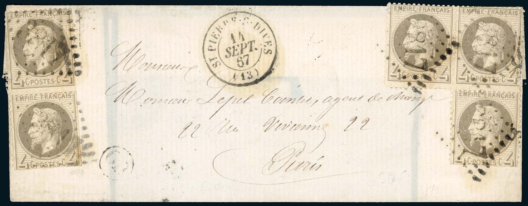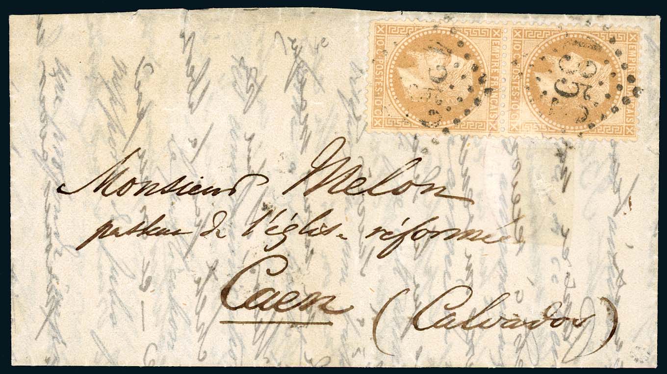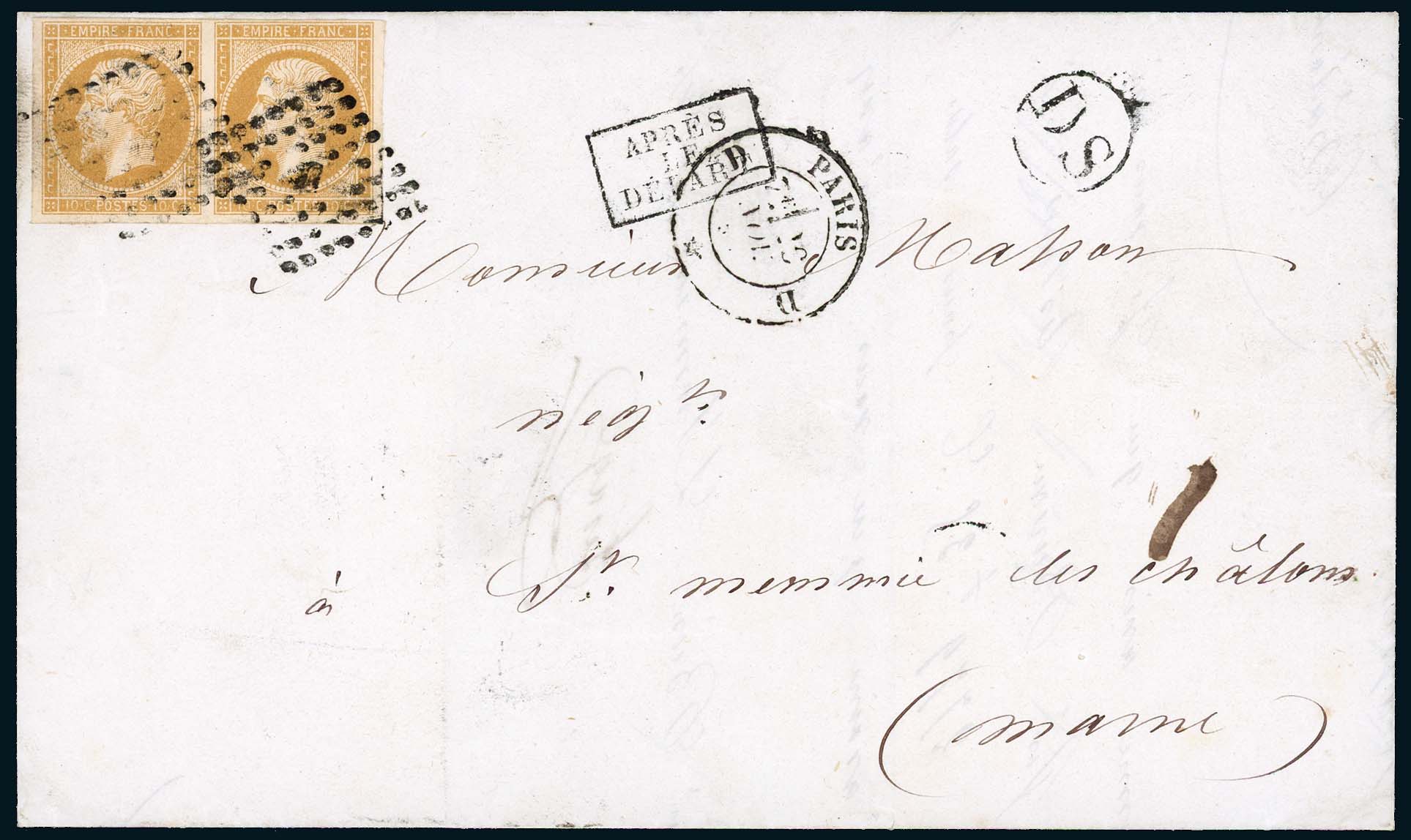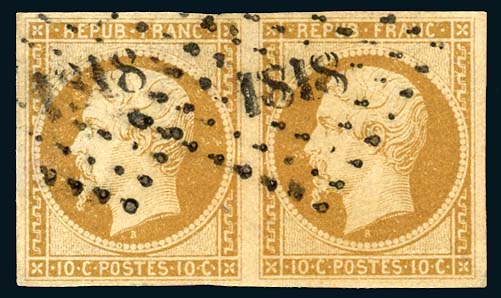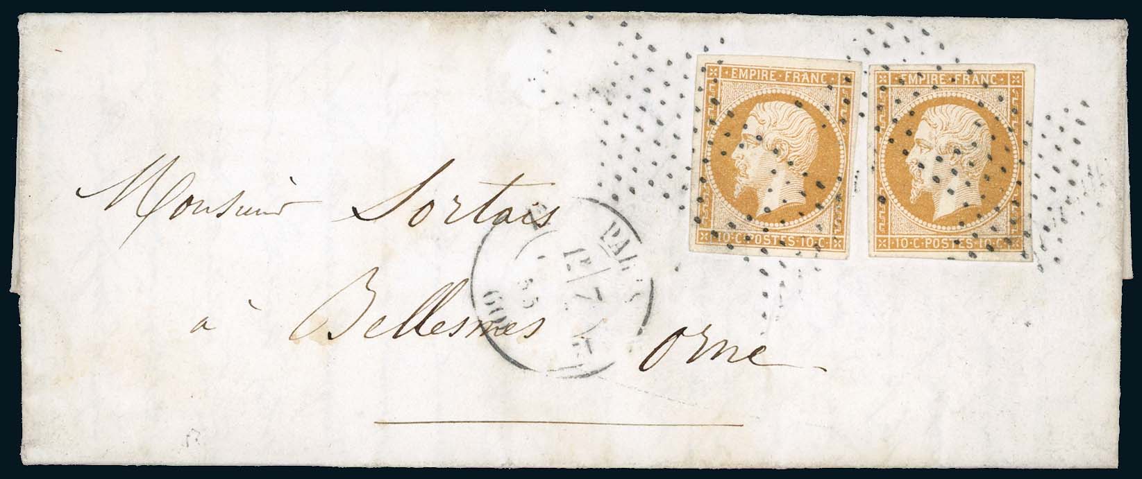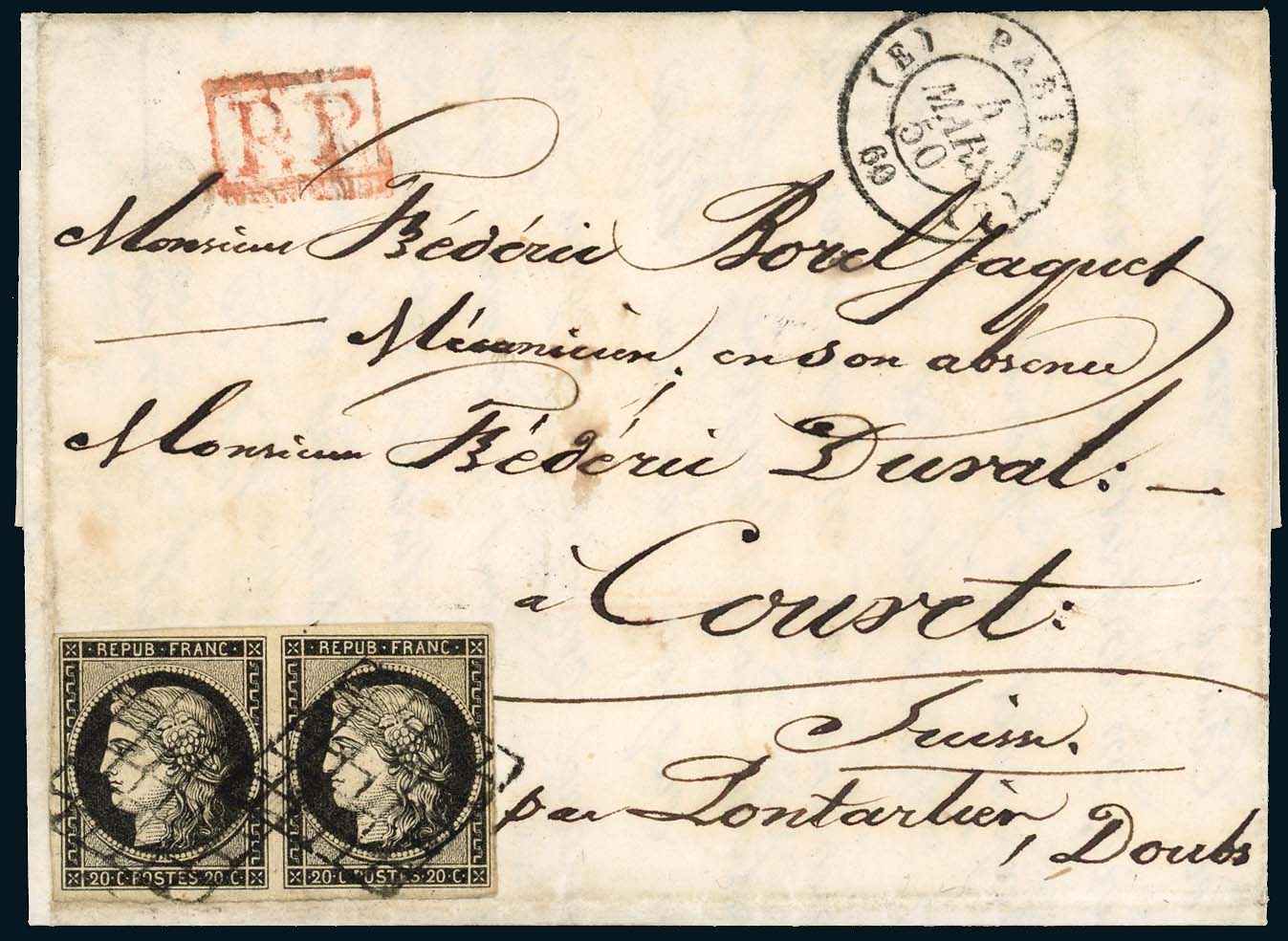 64 | N°3 en paire OB grille, C. BUREAU CENTRAL en noir sur enveloppe au double port port pour Sens 1849 TB | 150 | 300 | 150 | enchérir | |