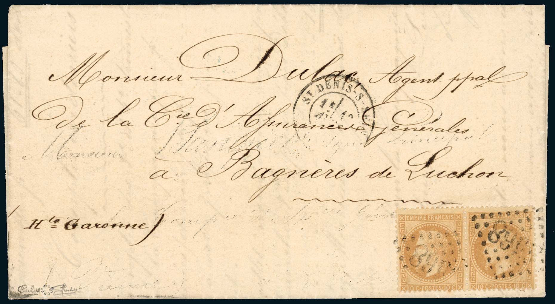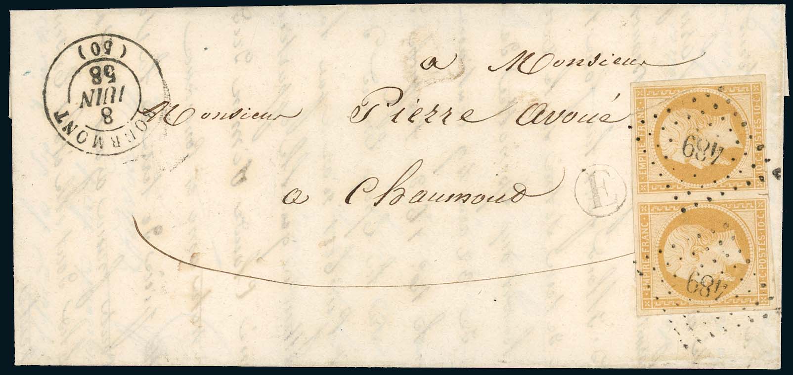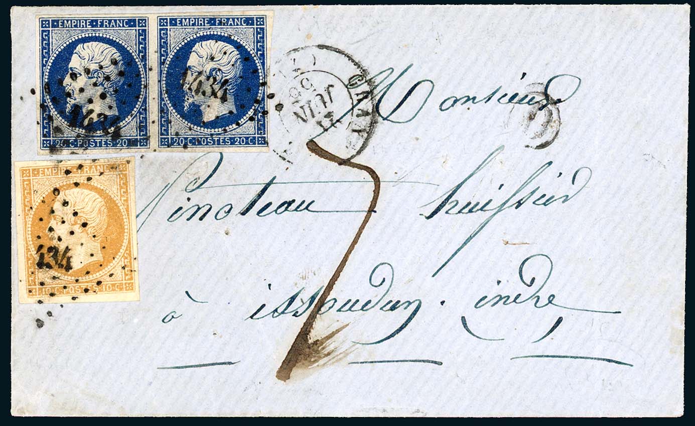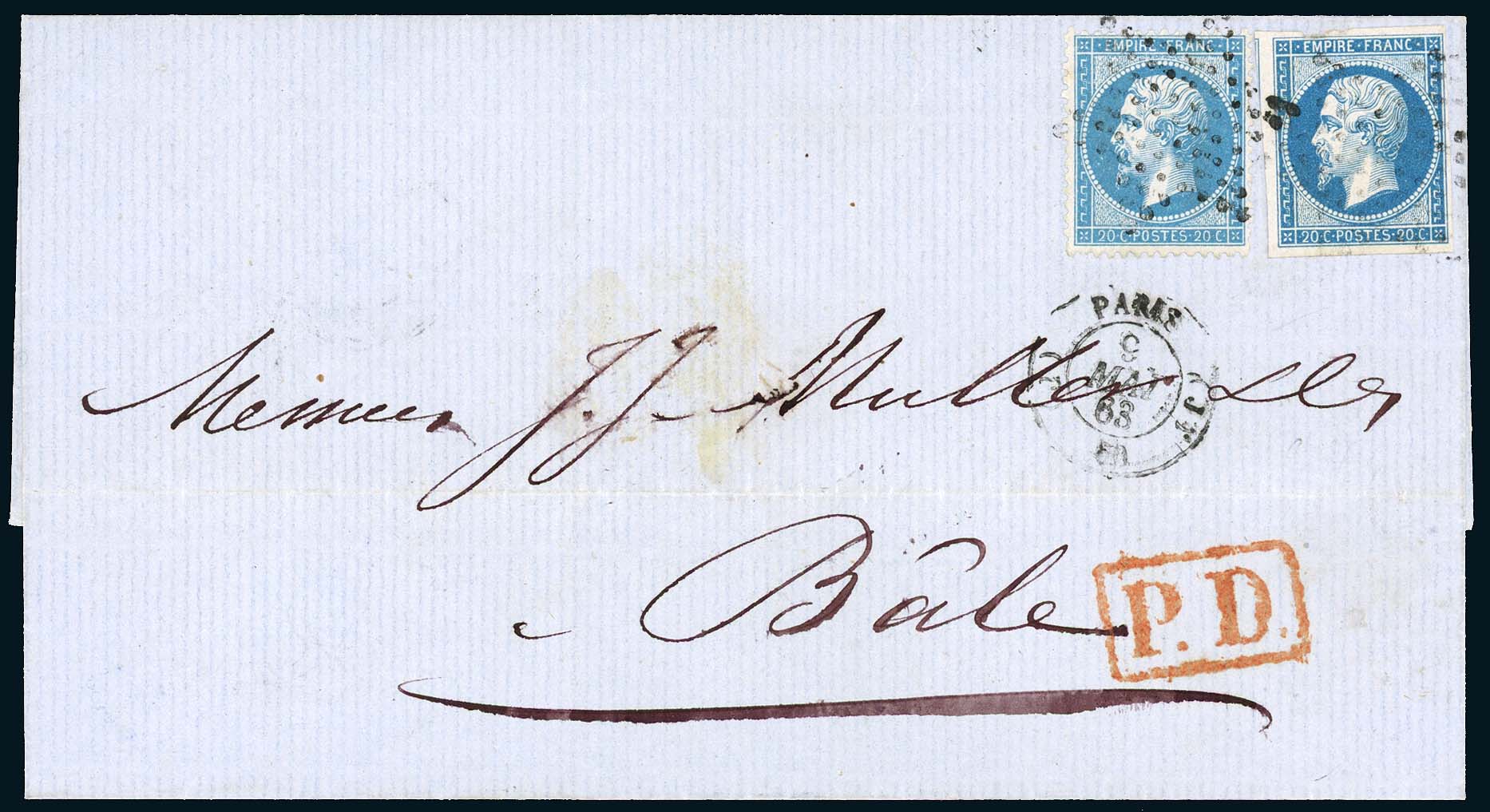 64 | N°3 en paire OB grille, C. BUREAU CENTRAL en noir sur enveloppe au double port port pour Sens 1849 TB | 150 | 300 | 150 | enchérir | |