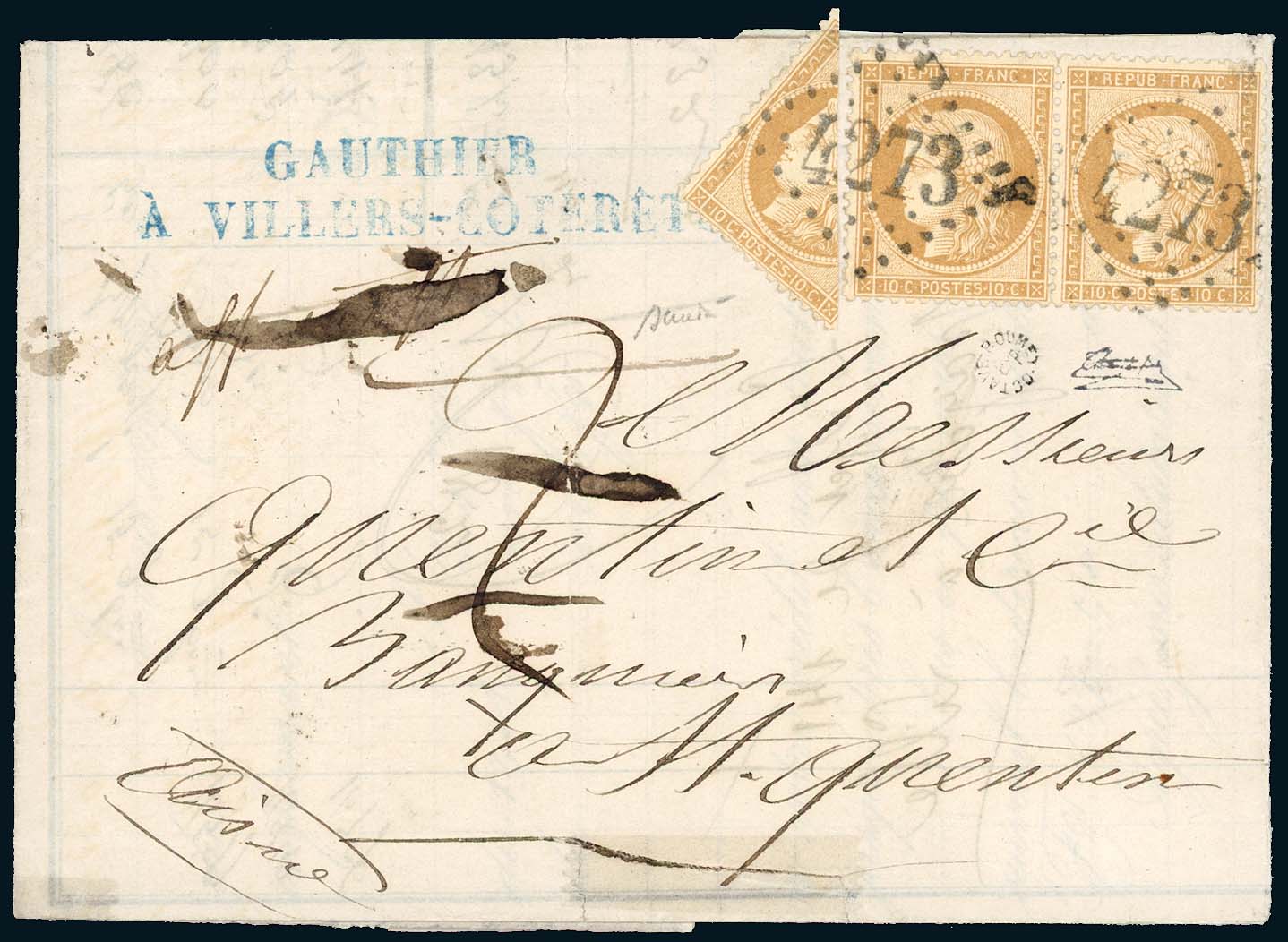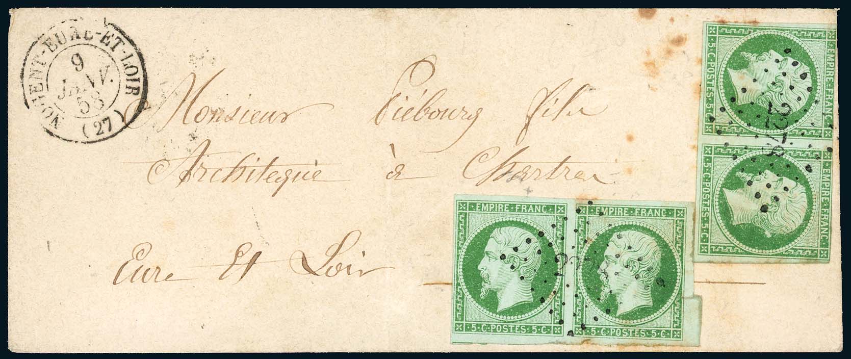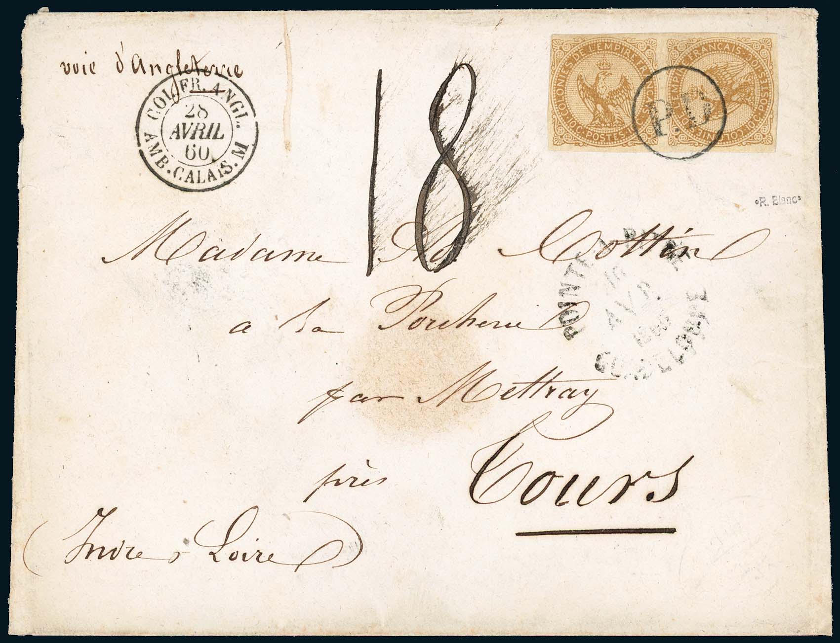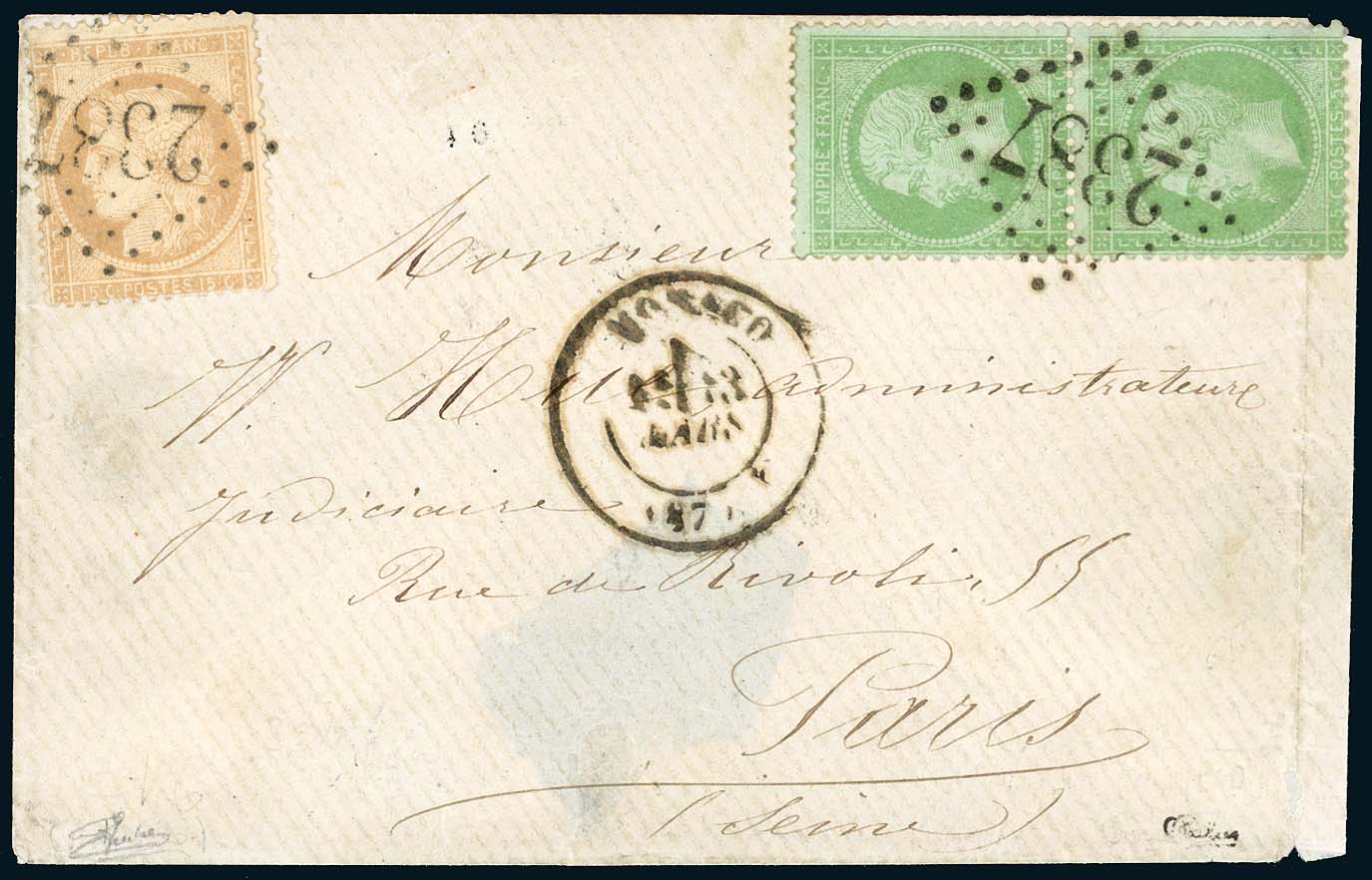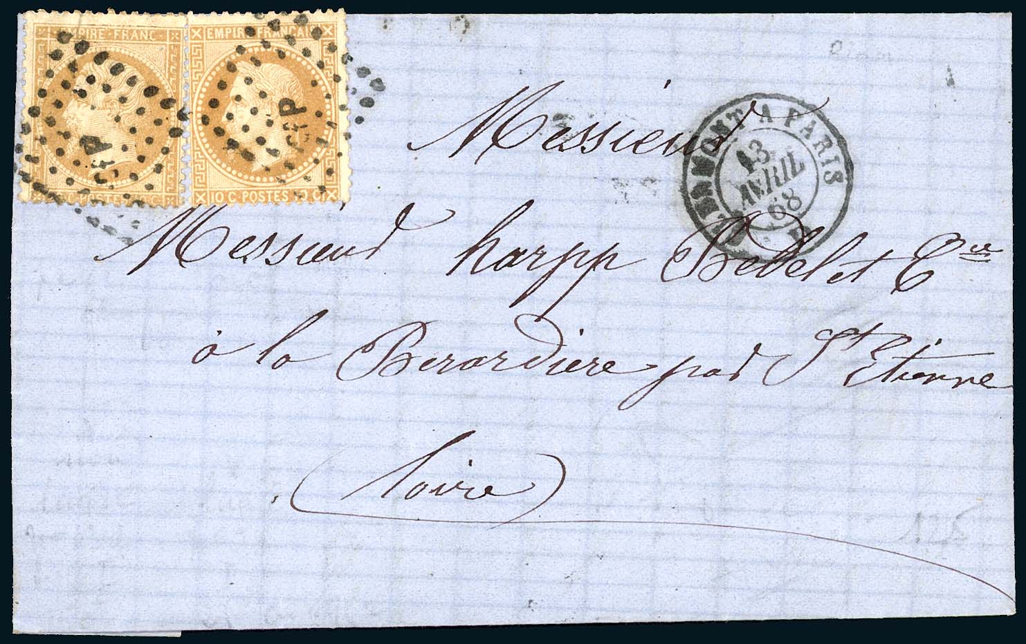 64 | N°3 en paire OB grille, C. BUREAU CENTRAL en noir sur enveloppe au double port port pour Sens 1849 TB | 150 | 300 | 150 | enchérir | |