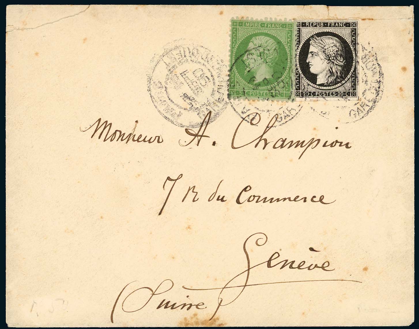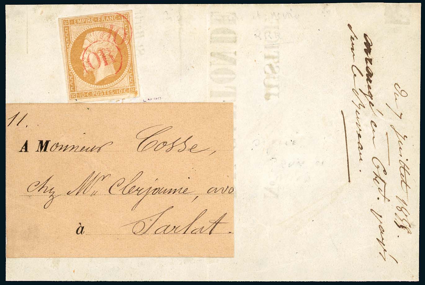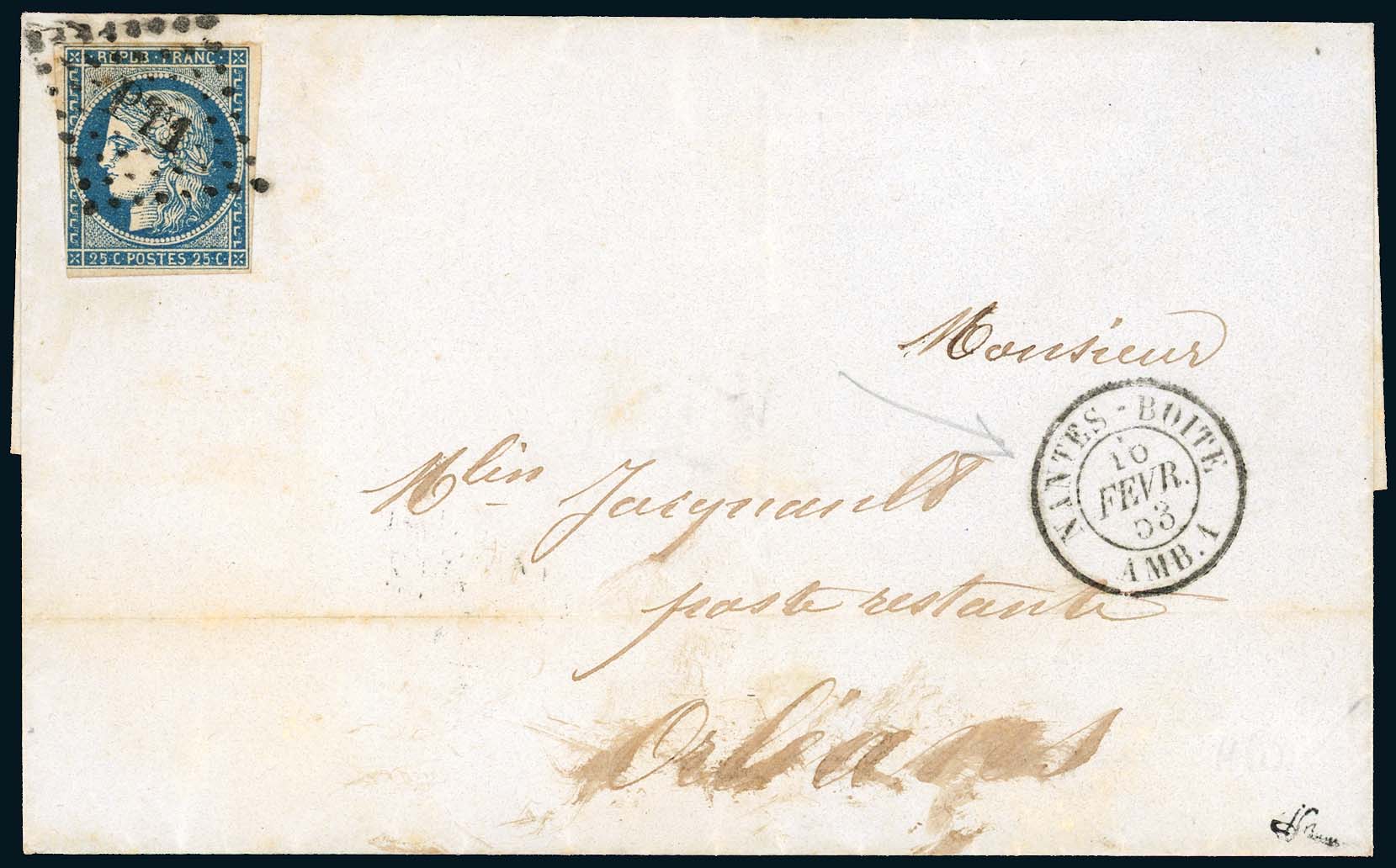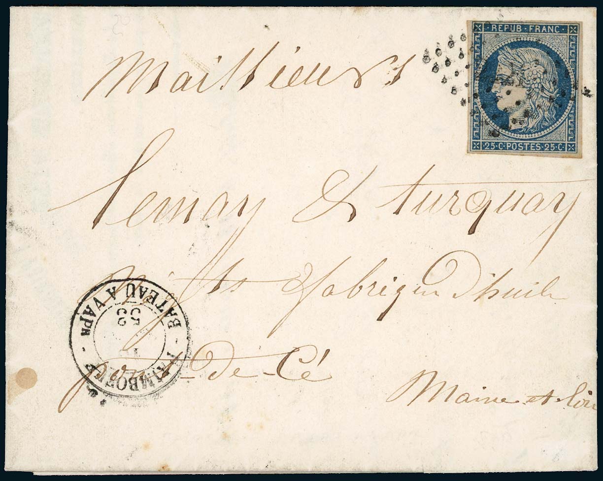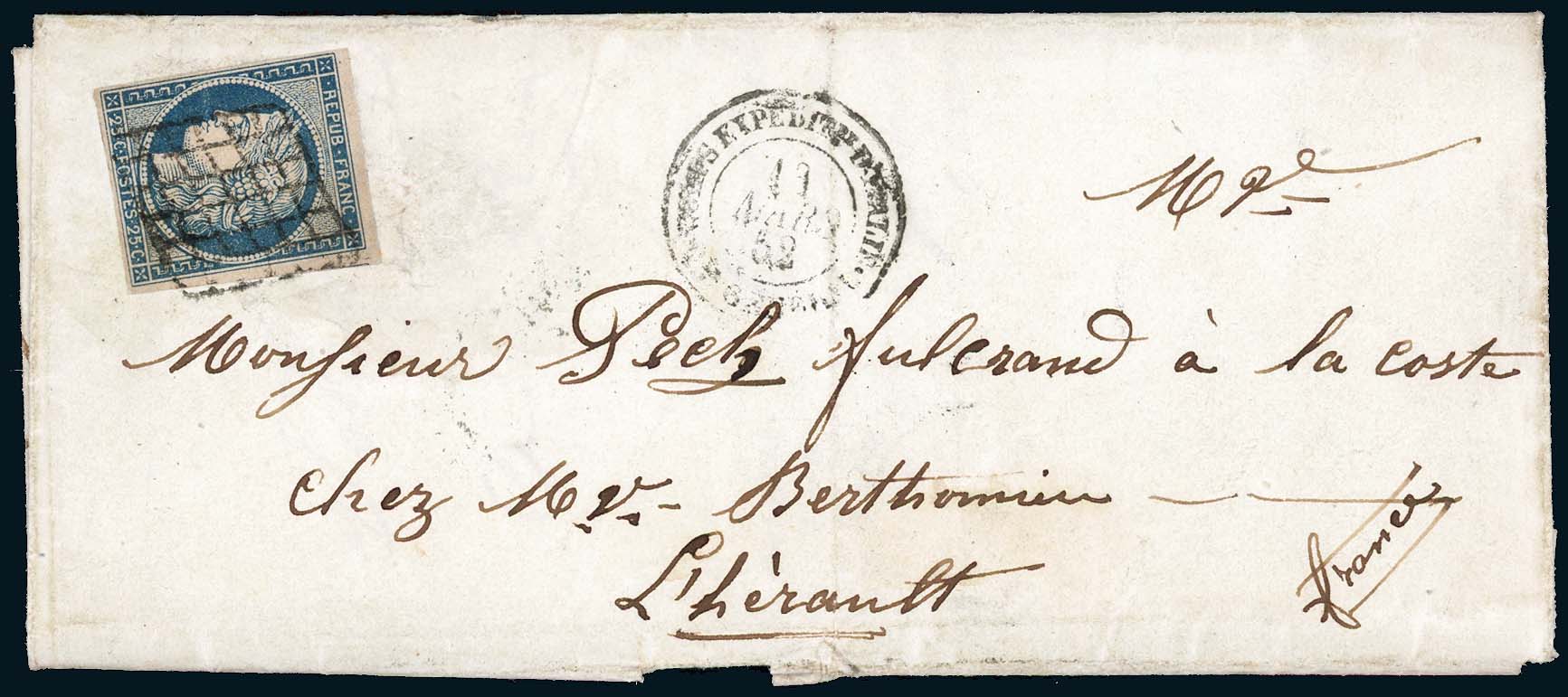 2447 | Importante collection de cursives avec timbres, ensemble de plus de 160 lettres affranchies entre N°1 et N°14, deux plis avec N°6, quelques devants ou fragments, nombreux bons indices B/TB dans l'ensemble, à voir absolument | 5000 | 7000 | 5000 | enchérir | |