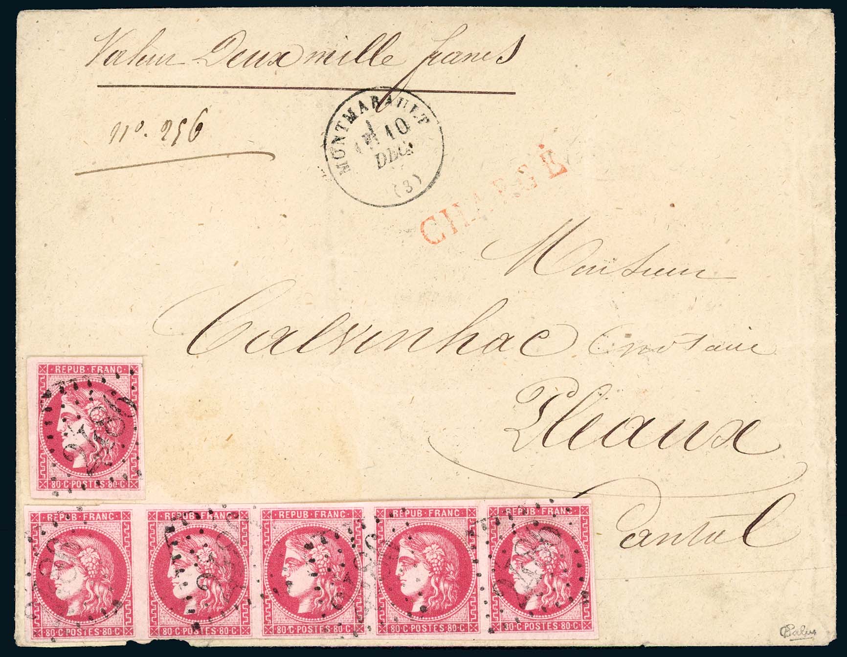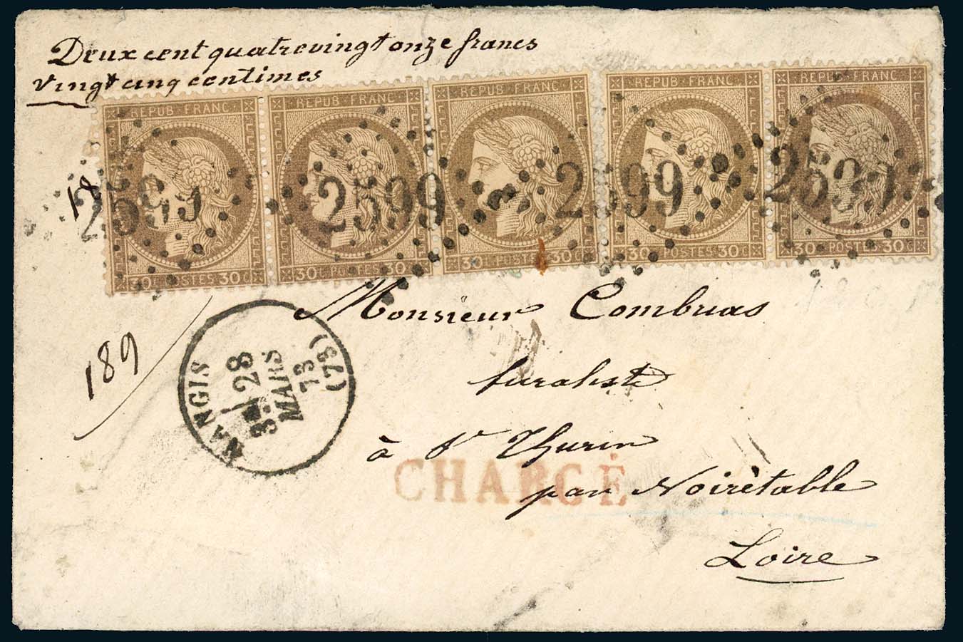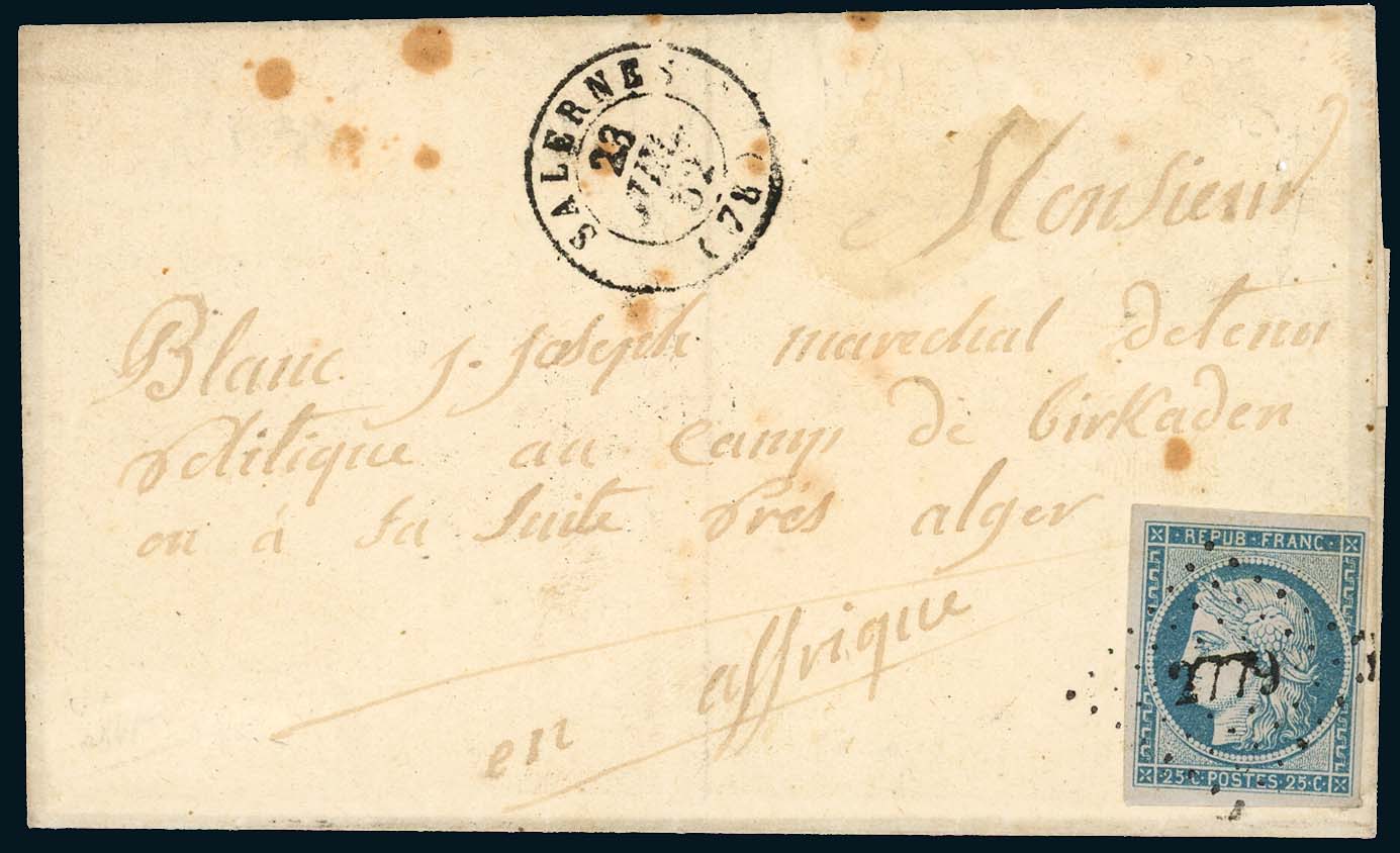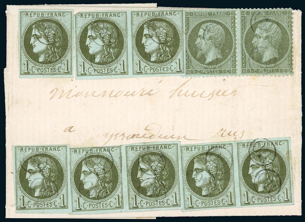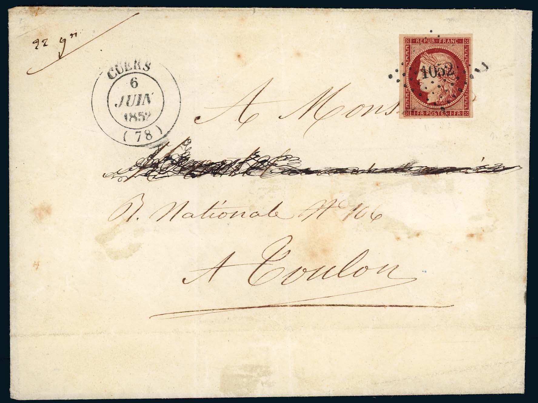 2447 | Importante collection de cursives avec timbres, ensemble de plus de 160 lettres affranchies entre N°1 et N°14, deux plis avec N°6, quelques devants ou fragments, nombreux bons indices B/TB dans l'ensemble, à voir absolument | 5000 | 7000 | 5000 | enchérir | |