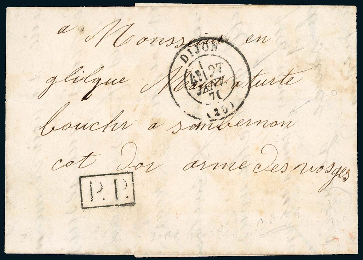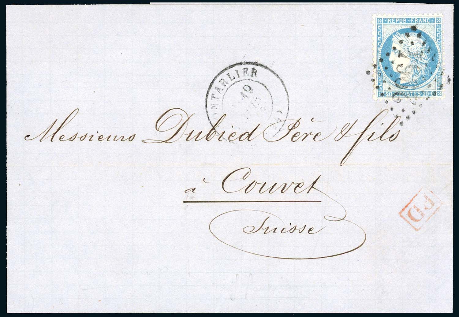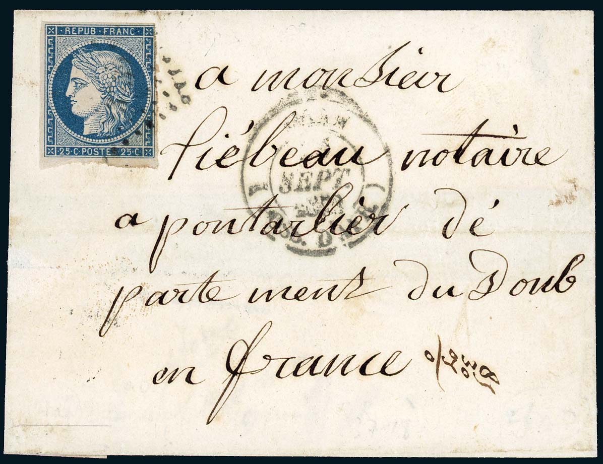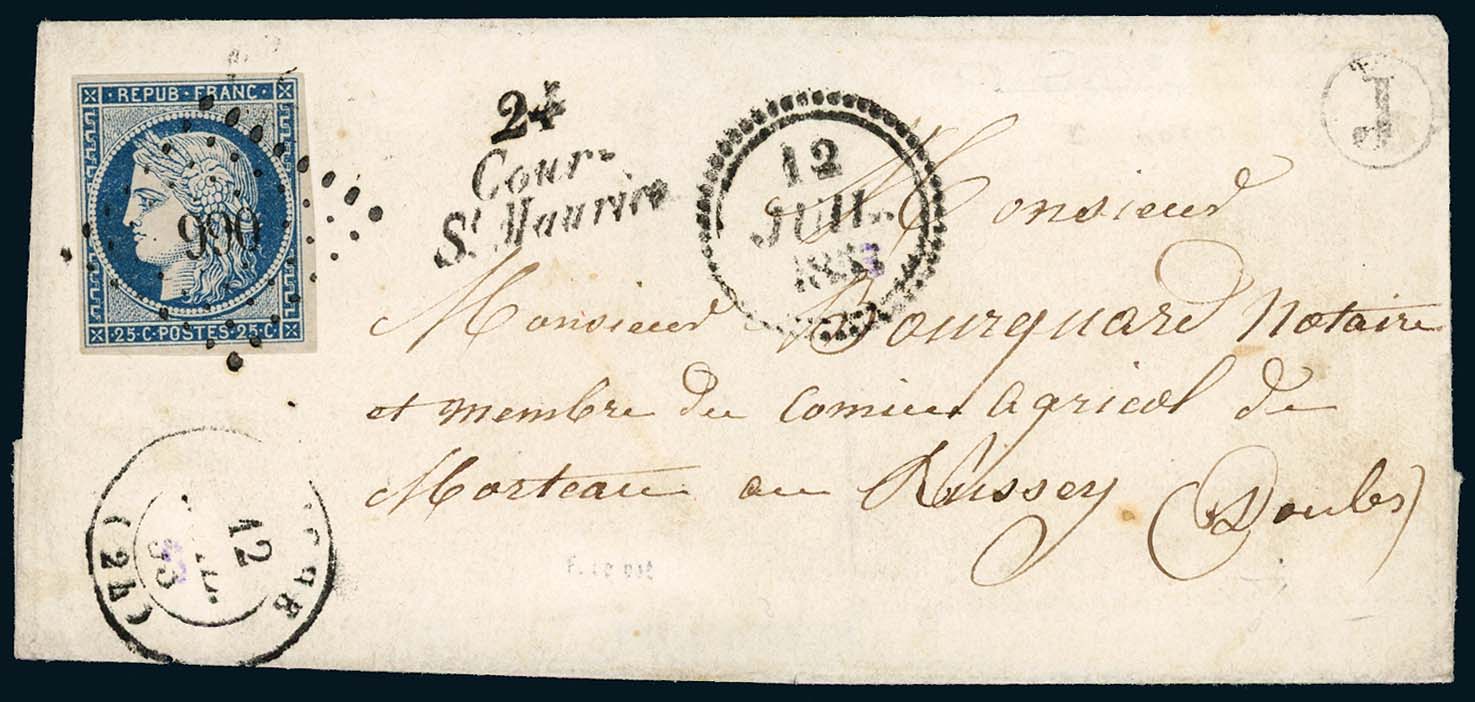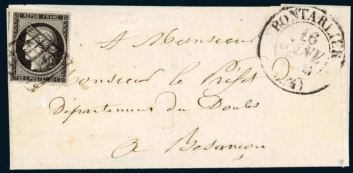 51 | N°3 OB grille, C. PONTARLIER (type 13) sur lettre pour Besançon 16 janvier 1849 TB | 70 | 120 | 70 | enchérir | |