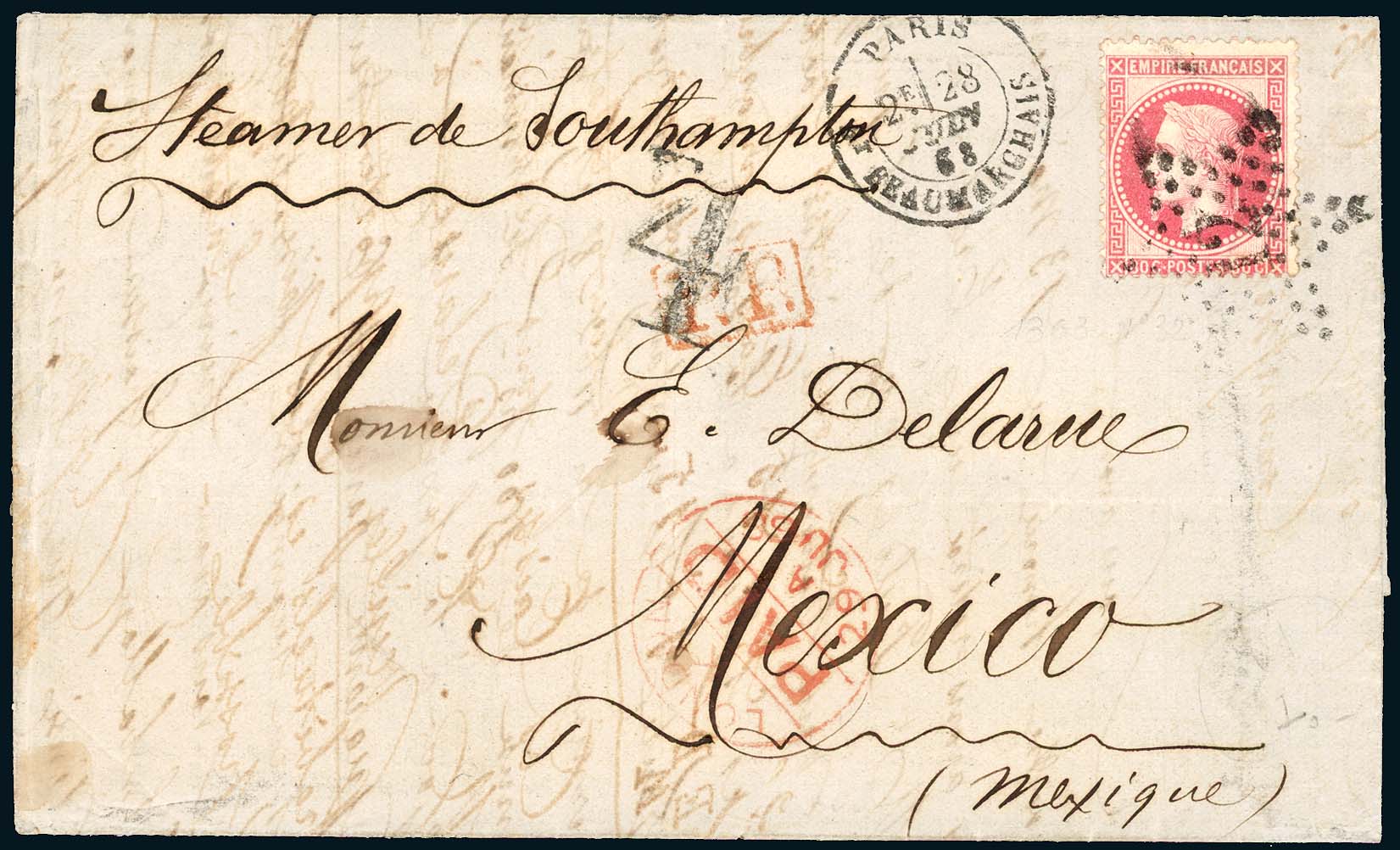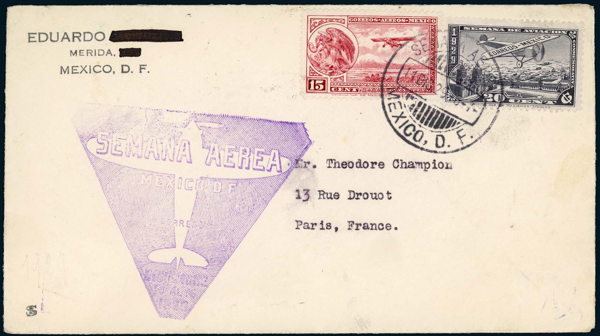 2400 | Poste Aérienne, Mexique, Affranchissement OB C. SEMANA AERA/MEXICO sur enveloppe pour Paris (Champion) avec le cachet commémoratif (Muller 47), rare 11/12/1929 TB | 100 | 200 | 100 | enchérir | |