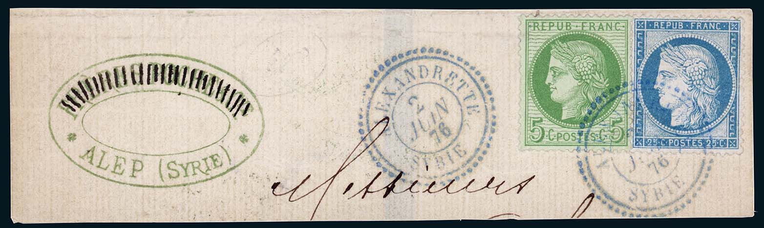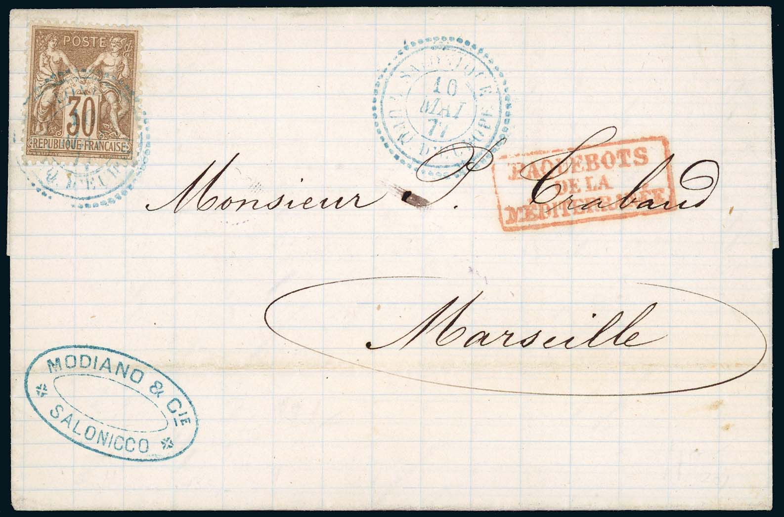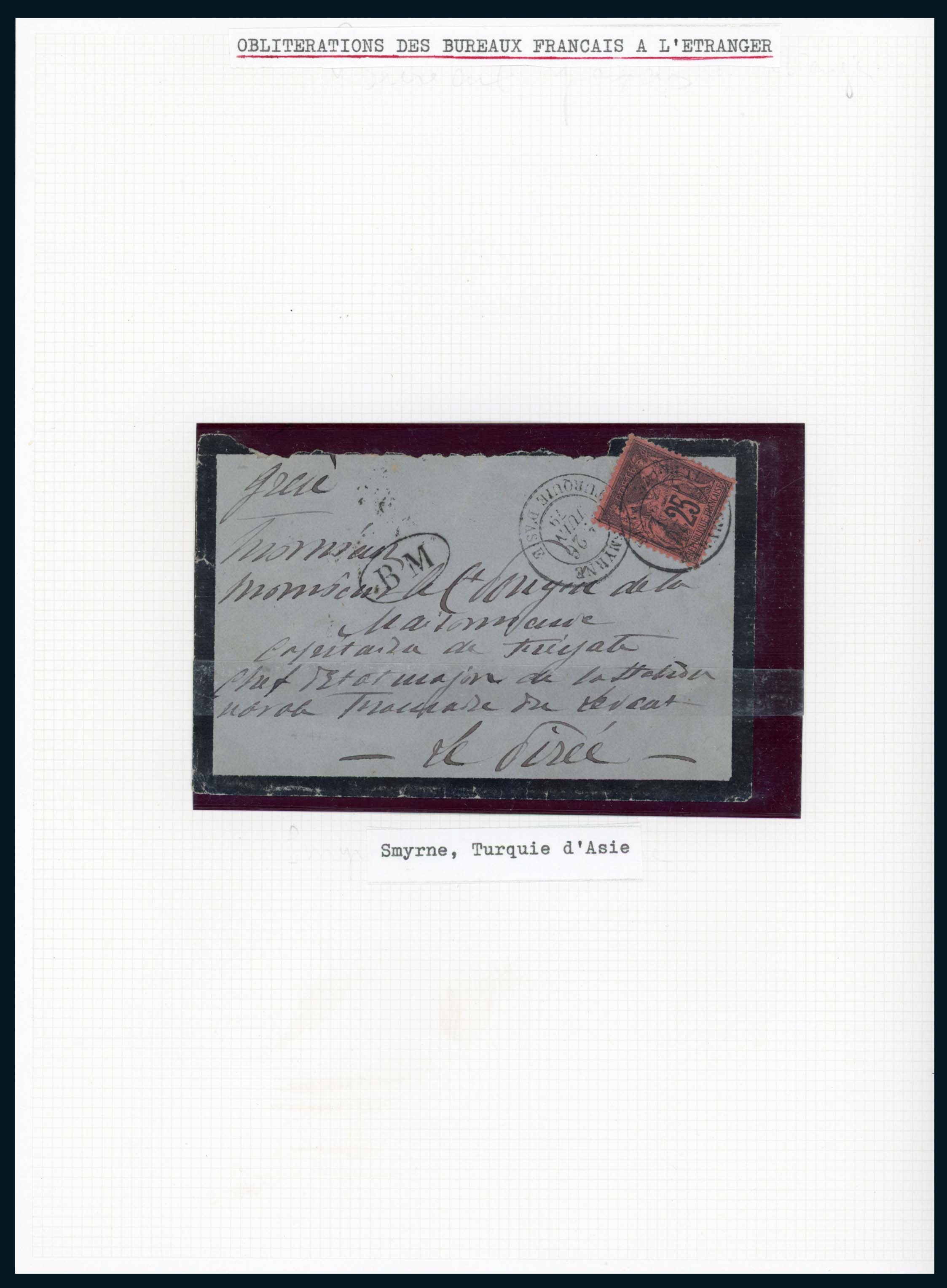 2478 | Type Sage, Ensemble d'oblitérations au Levant (plus quelques divers Afrique du nord, Antilles, Monaco) sur détachés, fragments (dont VOLO) et lettres (dont LATTAQUIE, SMYRNE BM), à étudier Vous pouvez trouver l'ensemble des photos sur la page de la vente |
