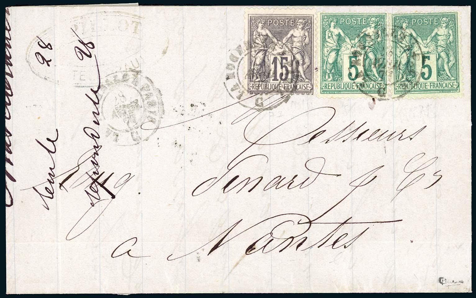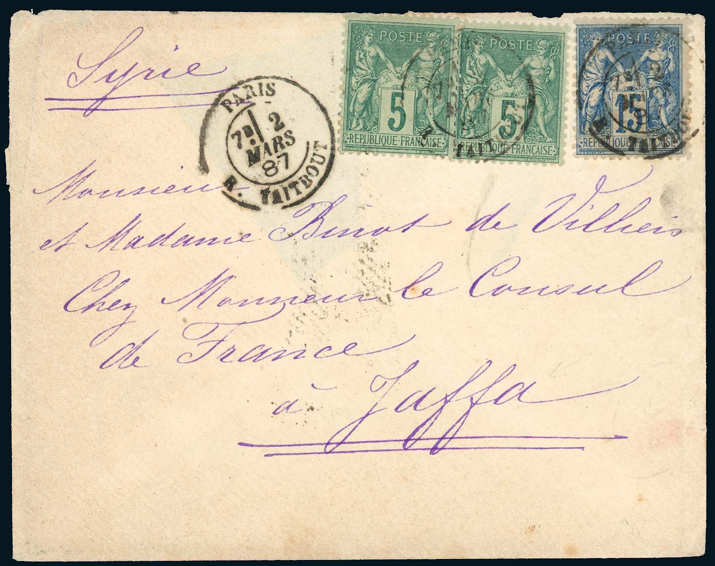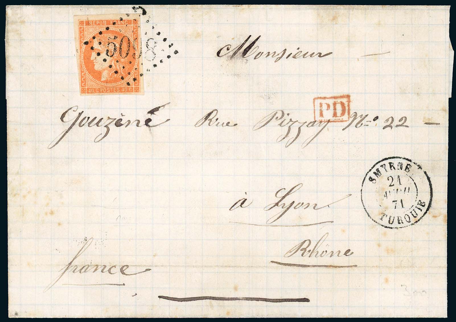 2478 | Type Sage, Ensemble d'oblitérations au Levant (plus quelques divers Afrique du nord, Antilles, Monaco) sur détachés, fragments (dont VOLO) et lettres (dont LATTAQUIE, SMYRNE BM), à étudier Vous pouvez trouver l'ensemble des photos sur la page de la vente |
